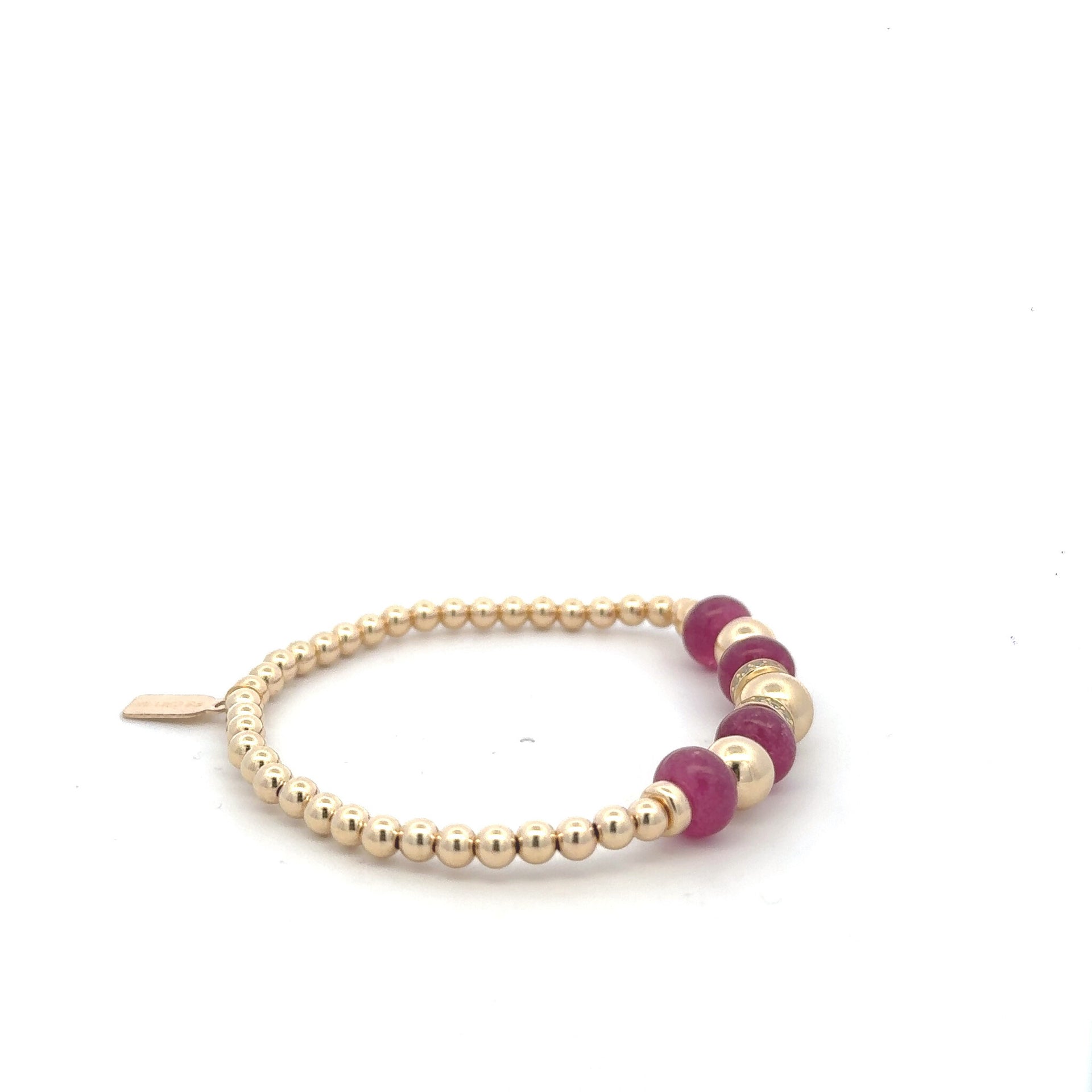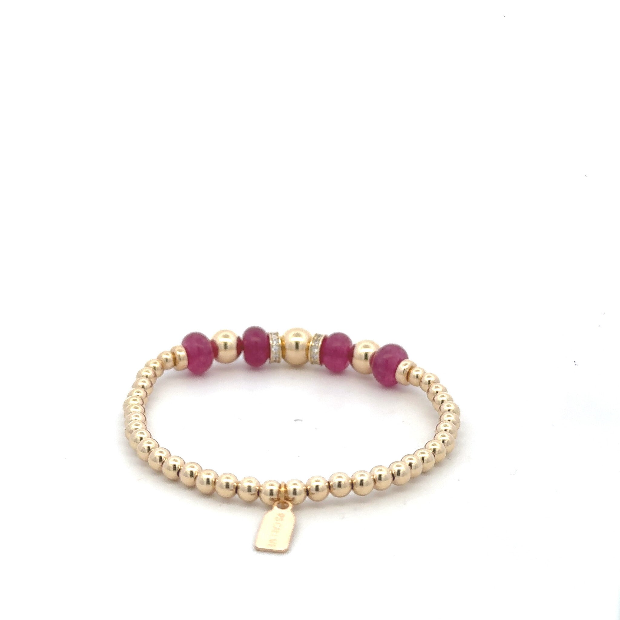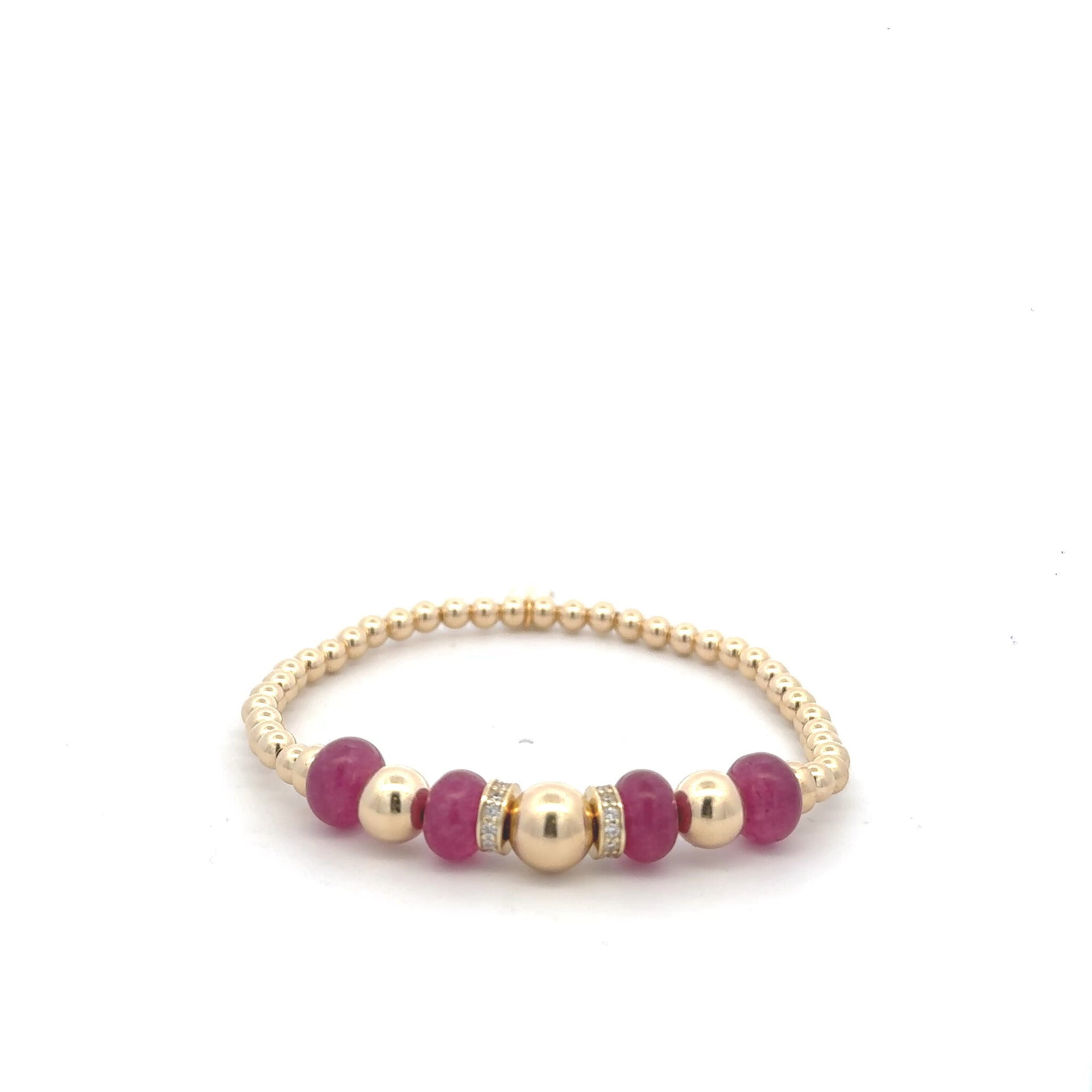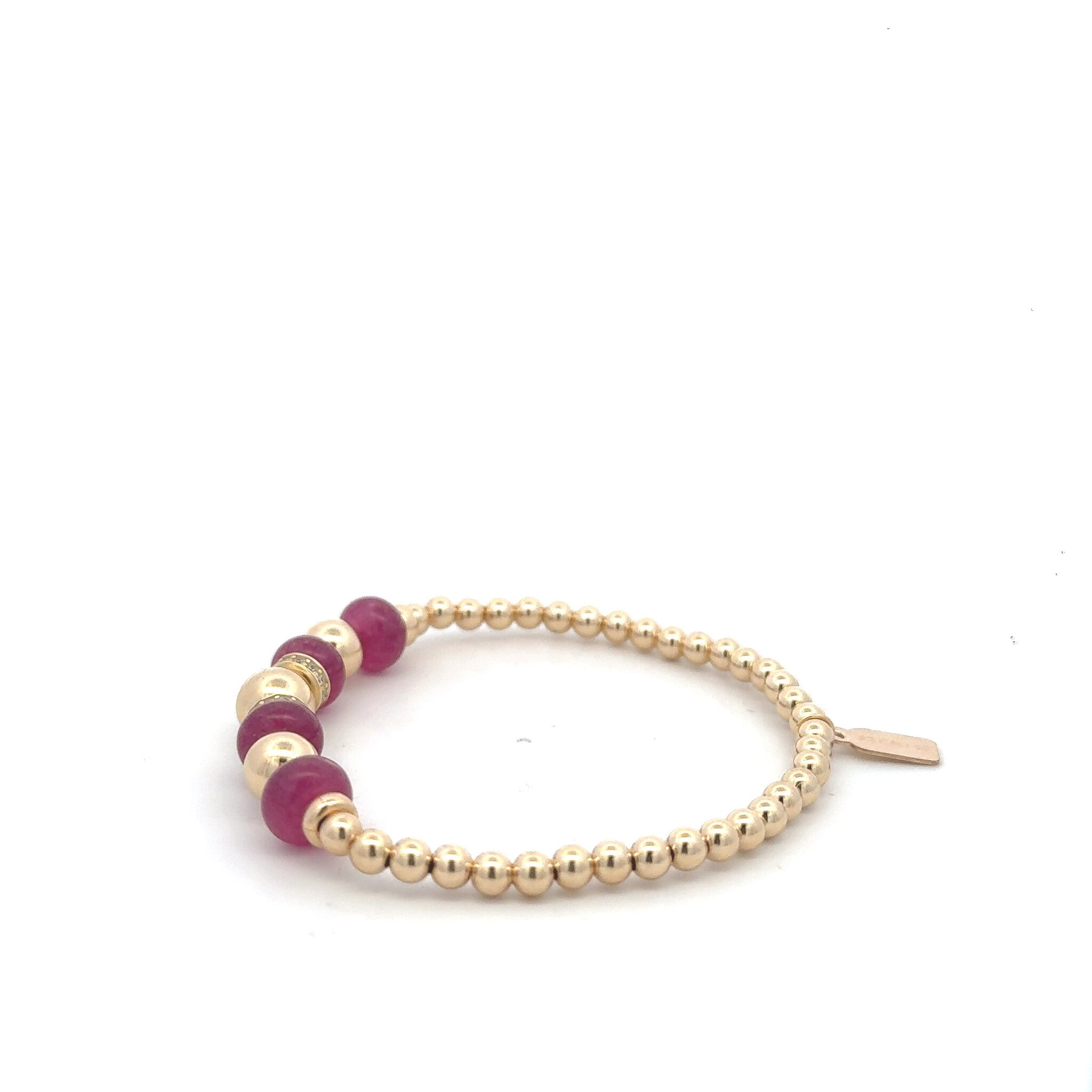 Elastic bracelet with gold colored balls, 2 wheels with rhinestones and a row of colored stones.