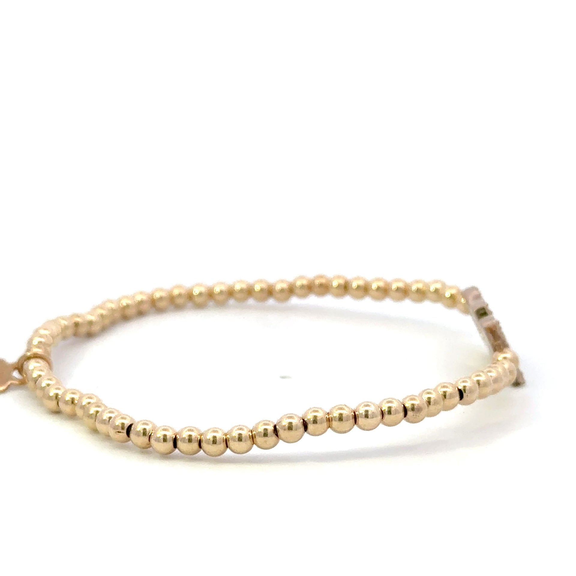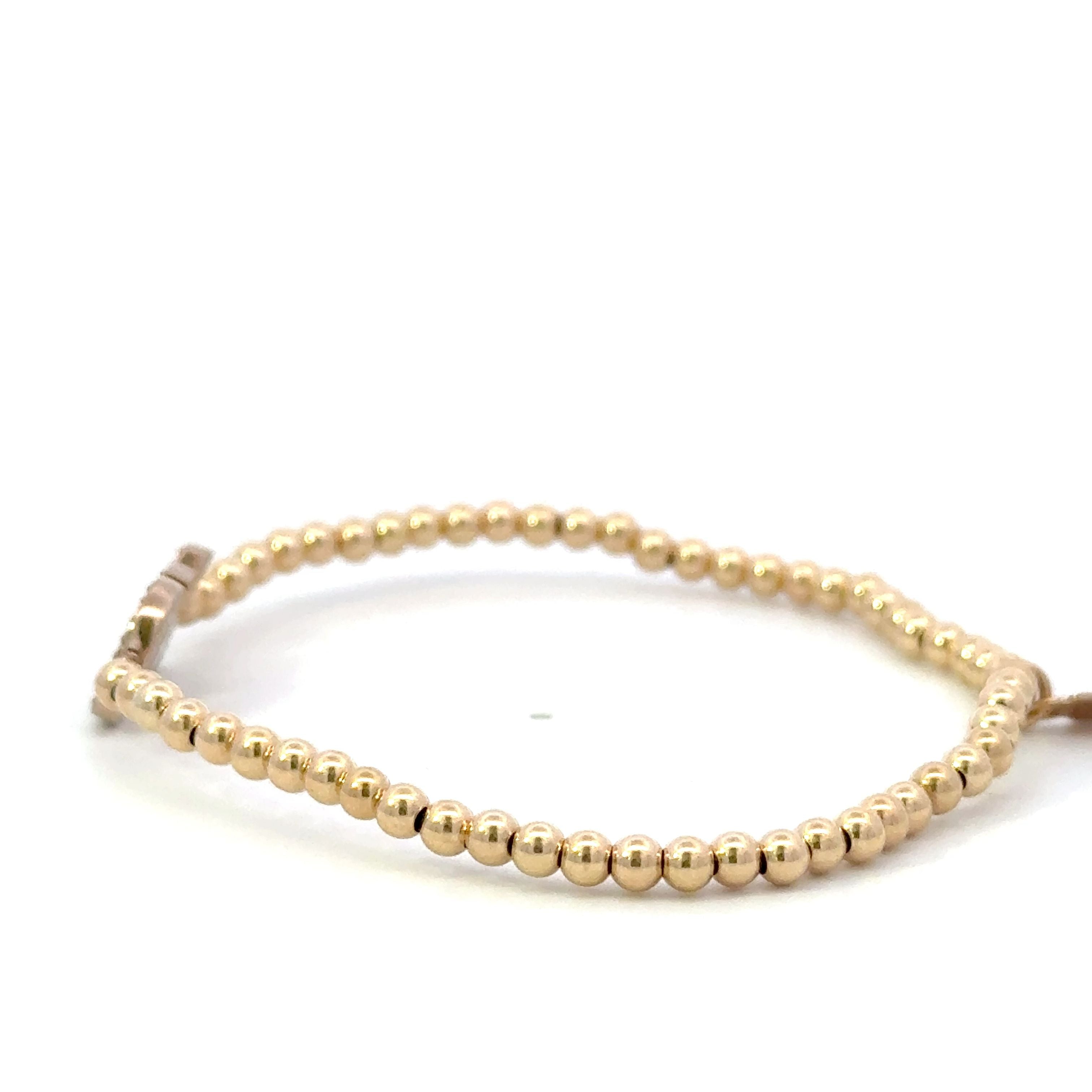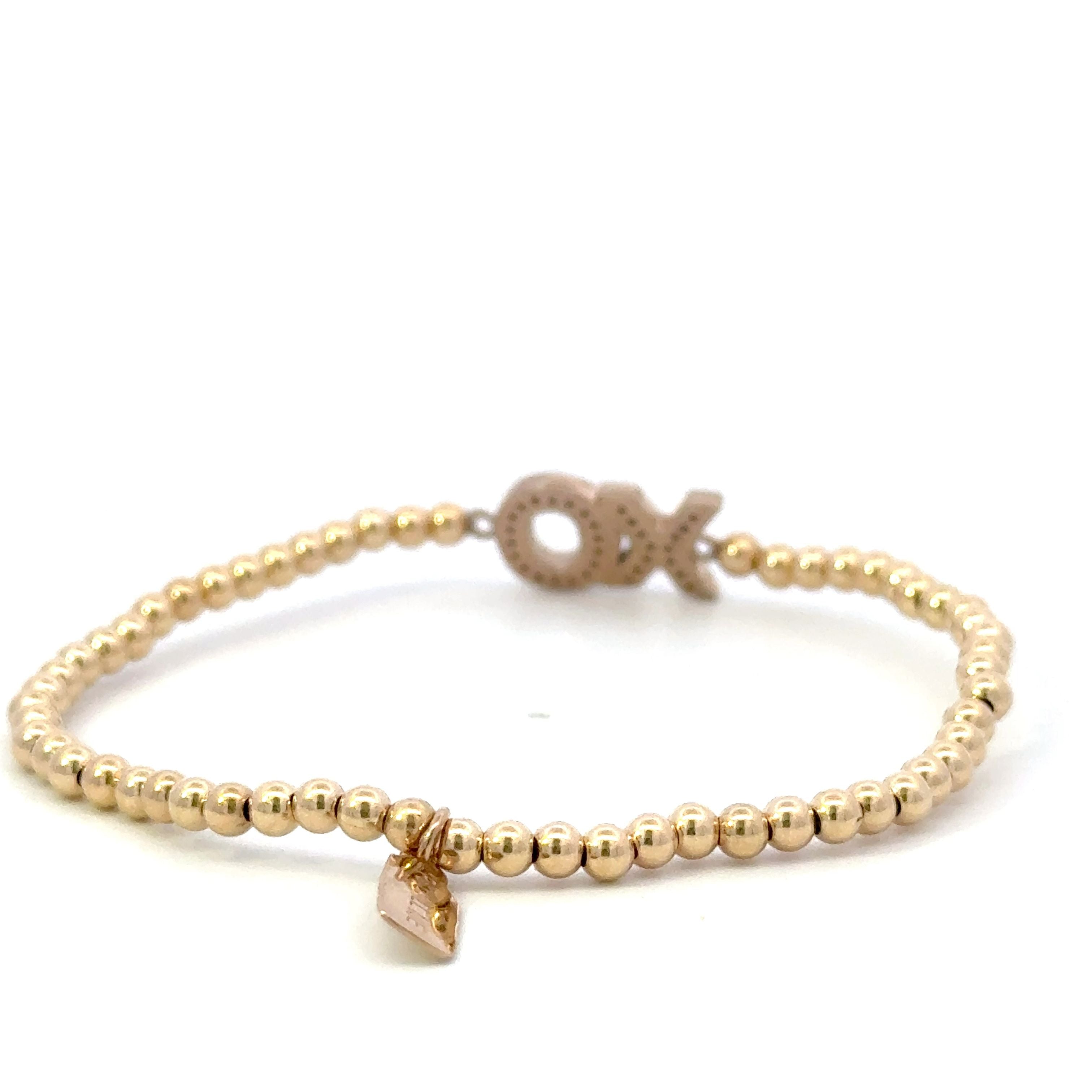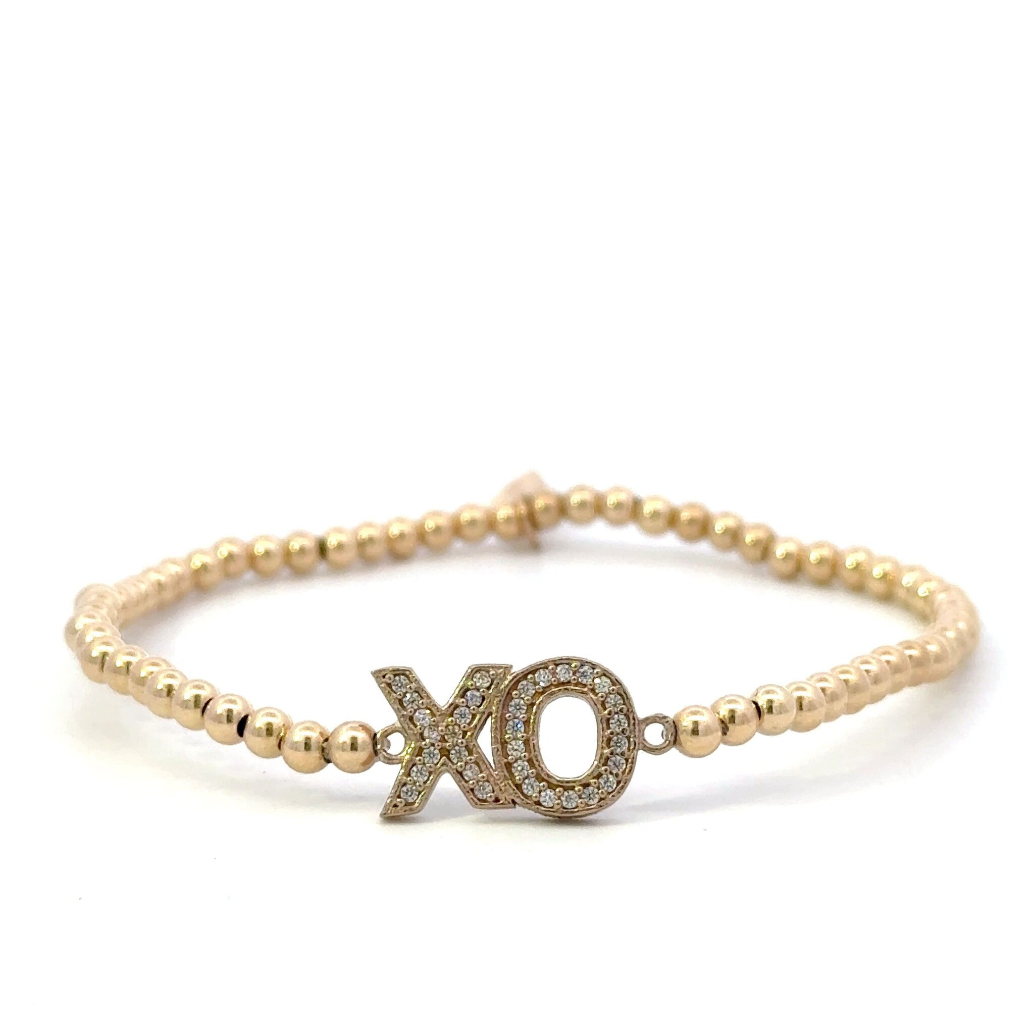 Elastisches Armband mit goldfarbenen Kugeln und einem Charm mit den Buchstaben XO mit Zirkonsteinen