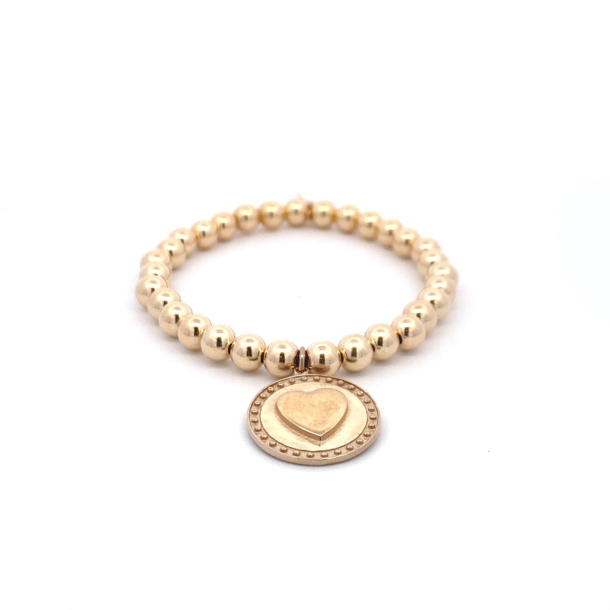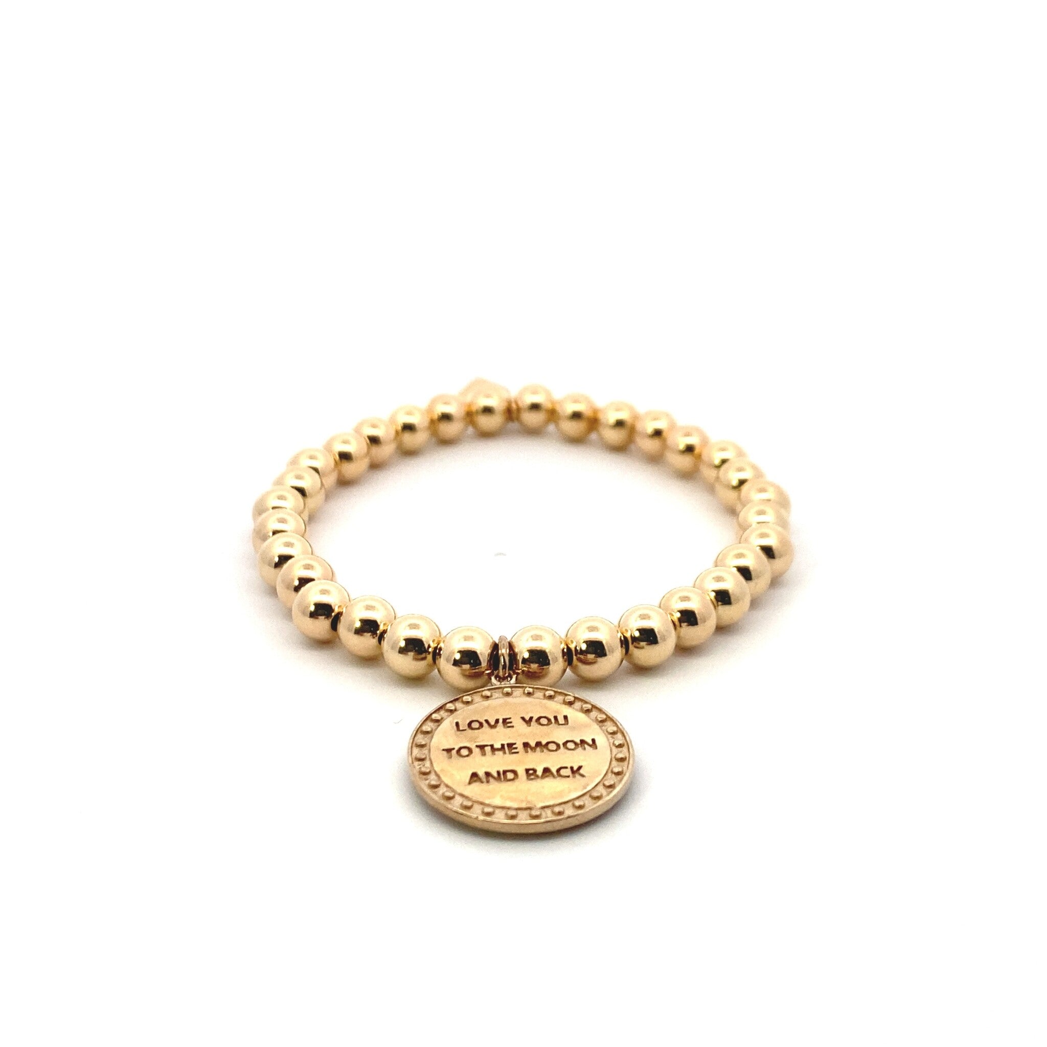 Pulsera elástica con bolitas de color dorado y un gran charm con el texto 'te amo hasta la luna y más allá'.