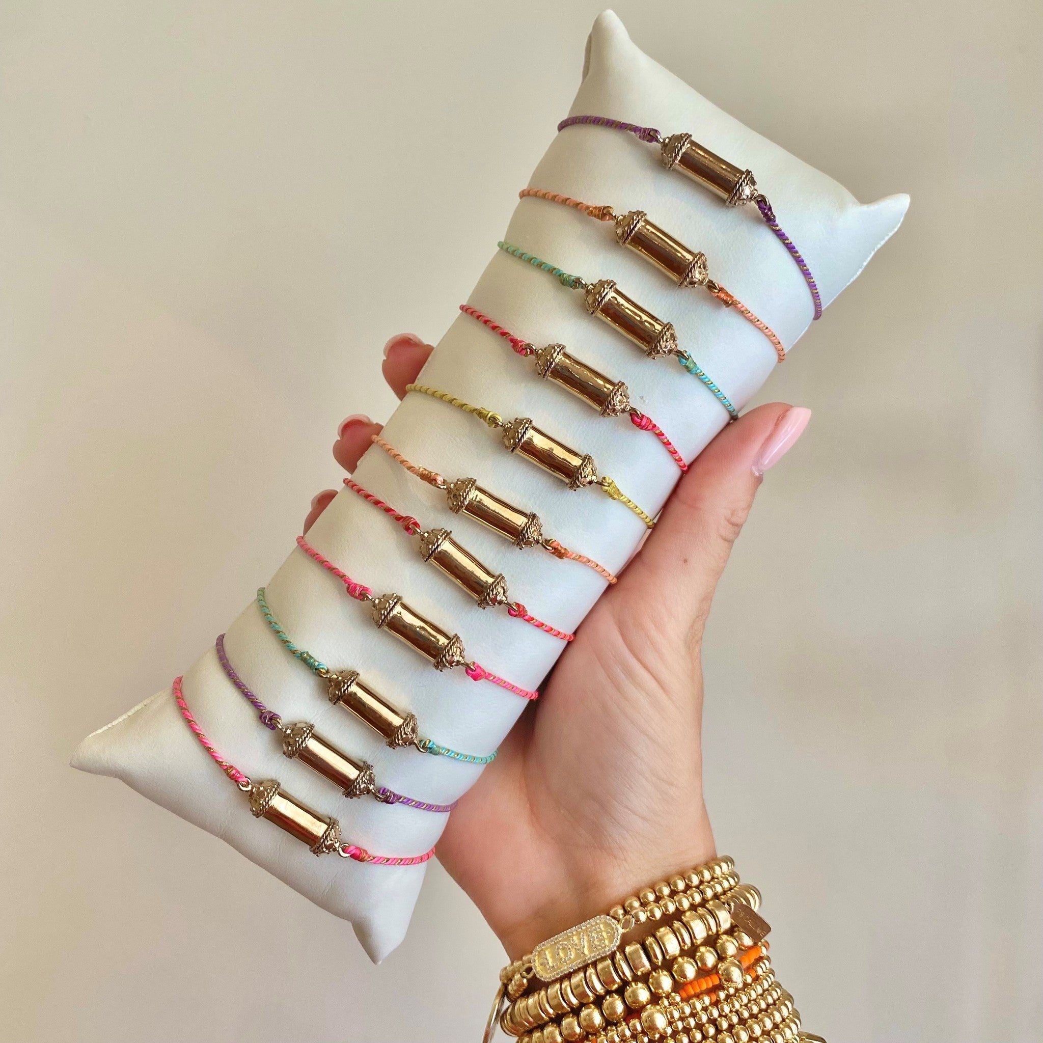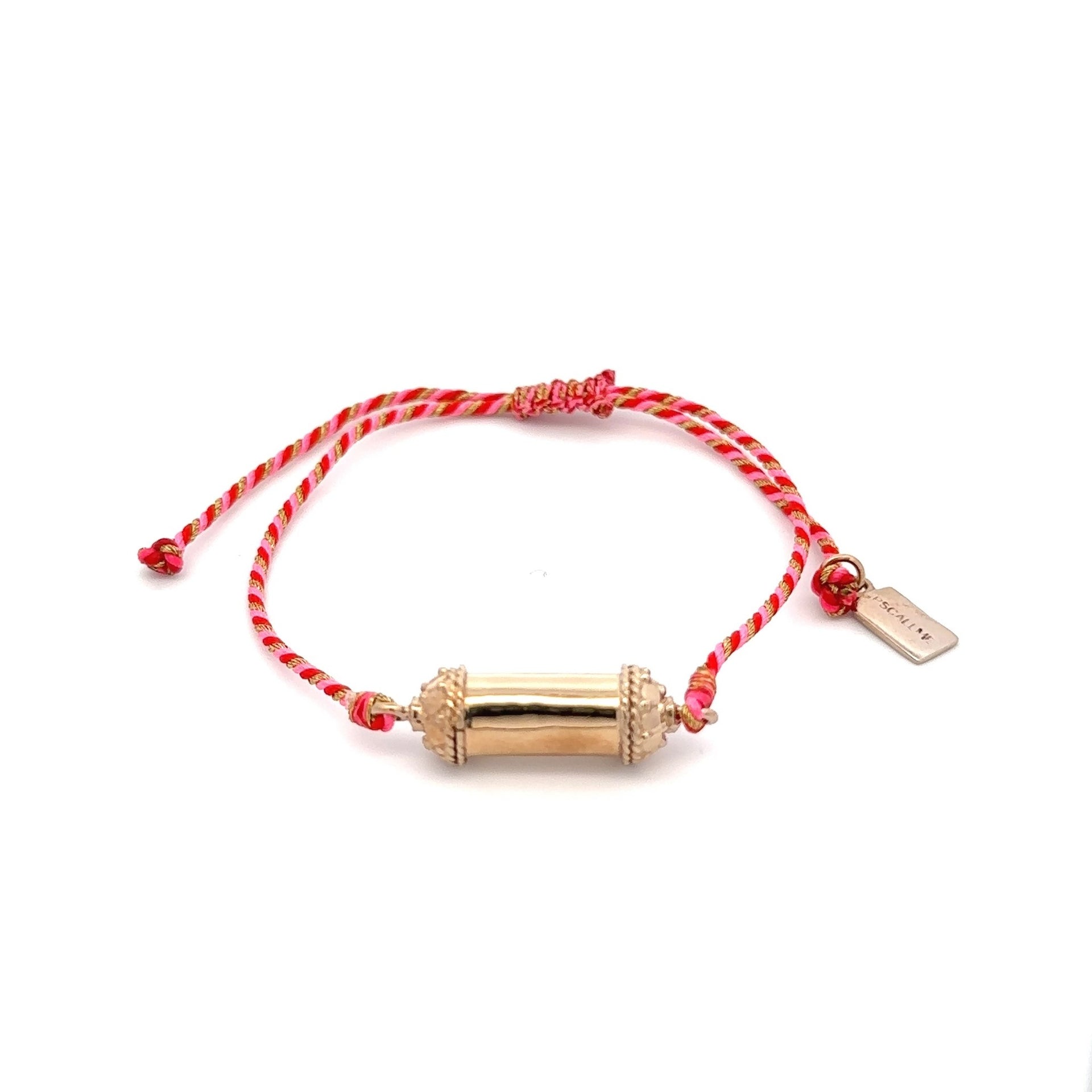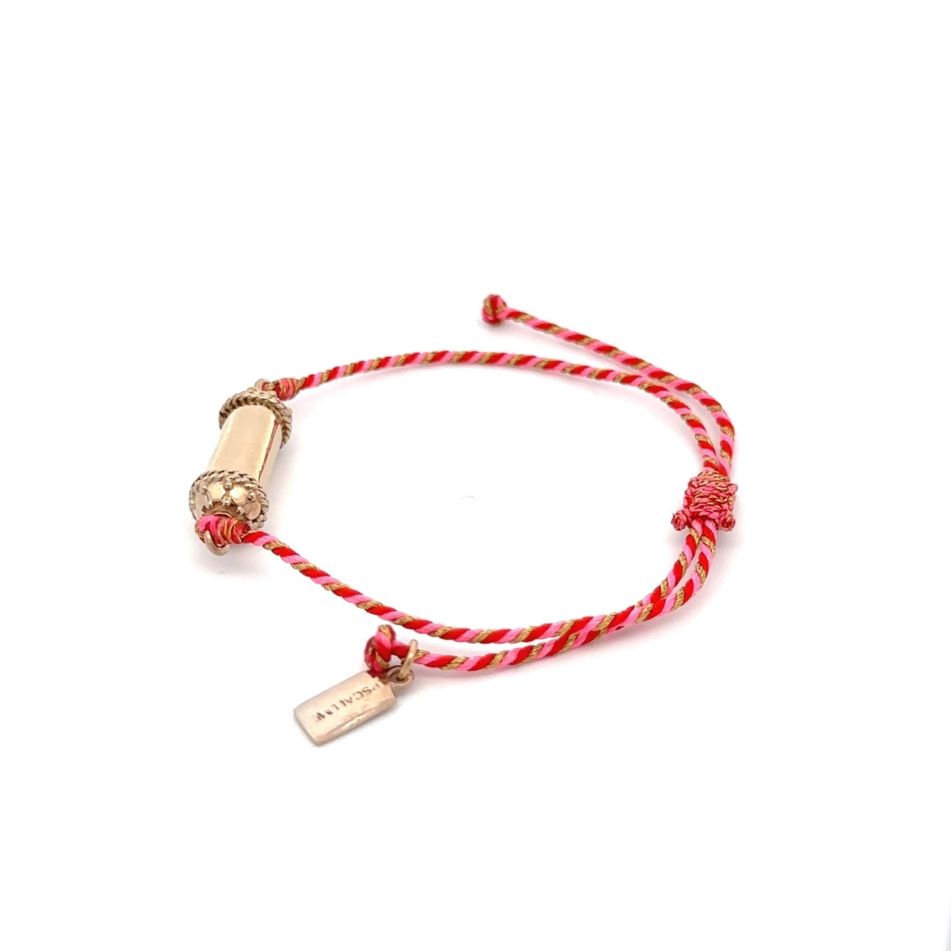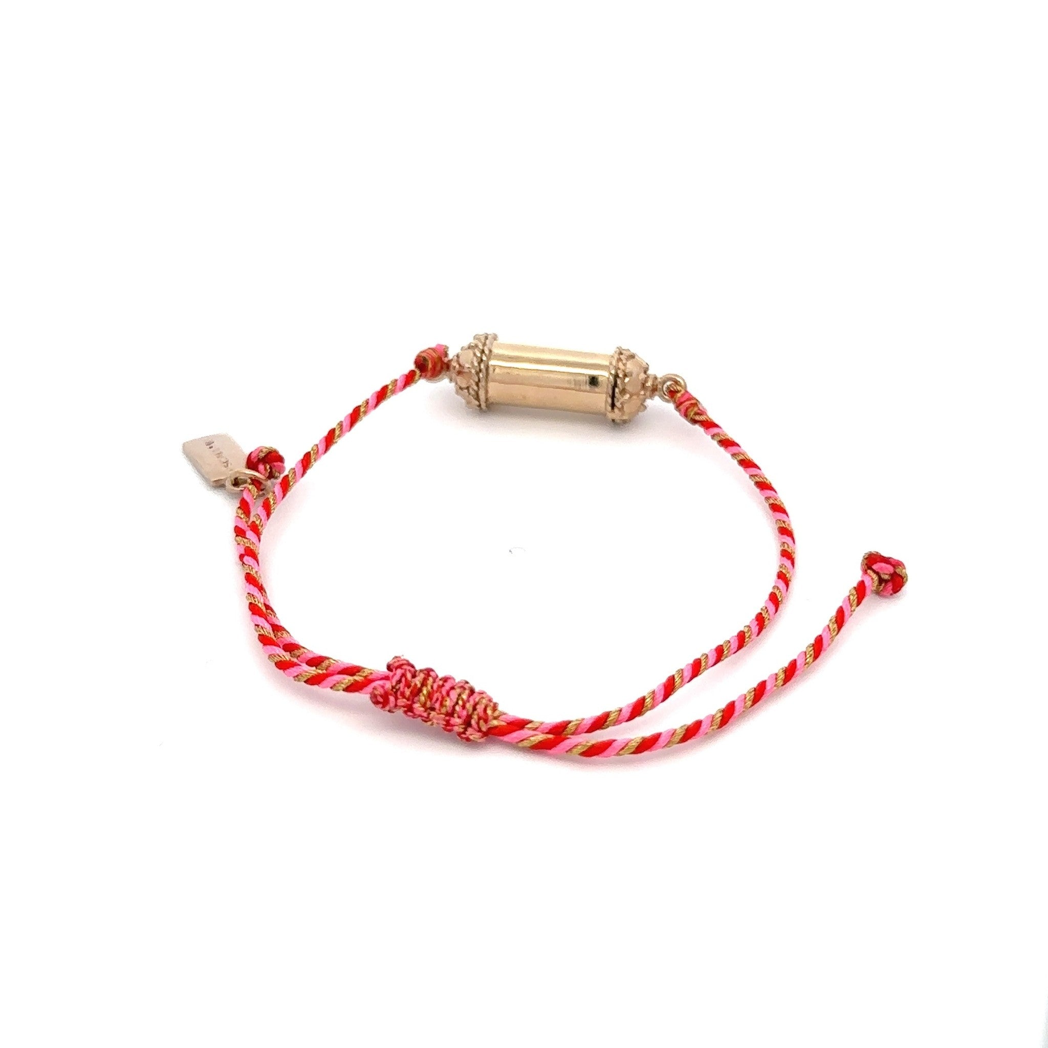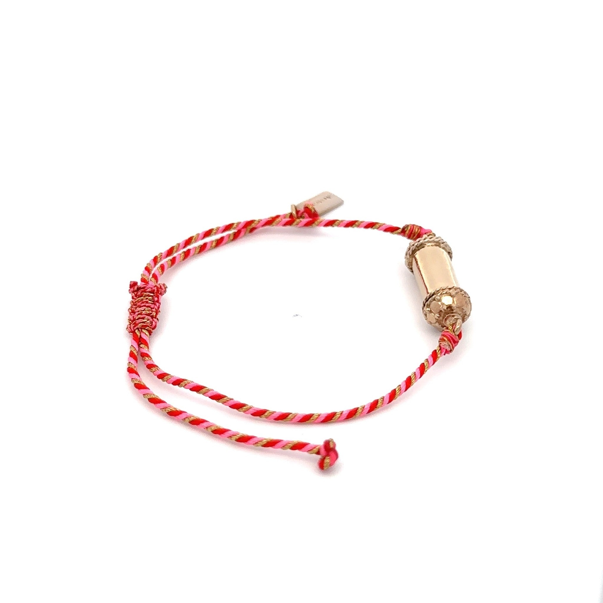Pulsera con cordón de color y amuleto de la suerte de color dorado.