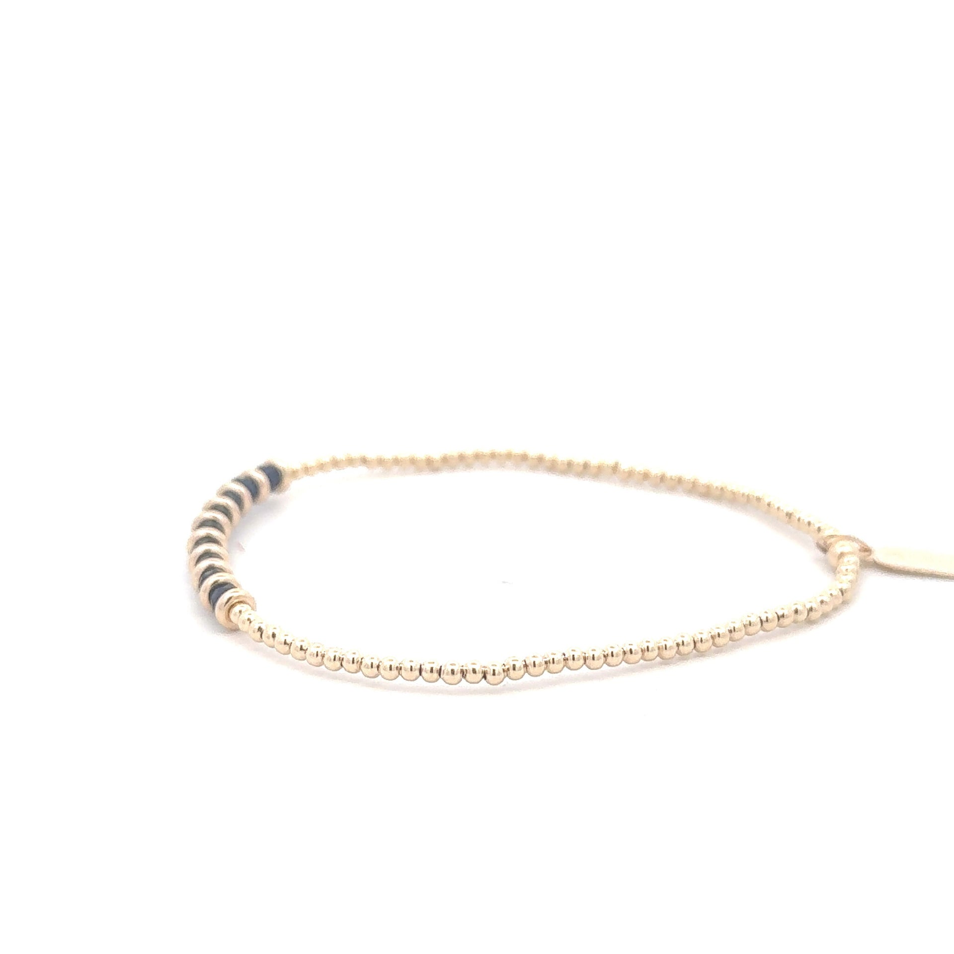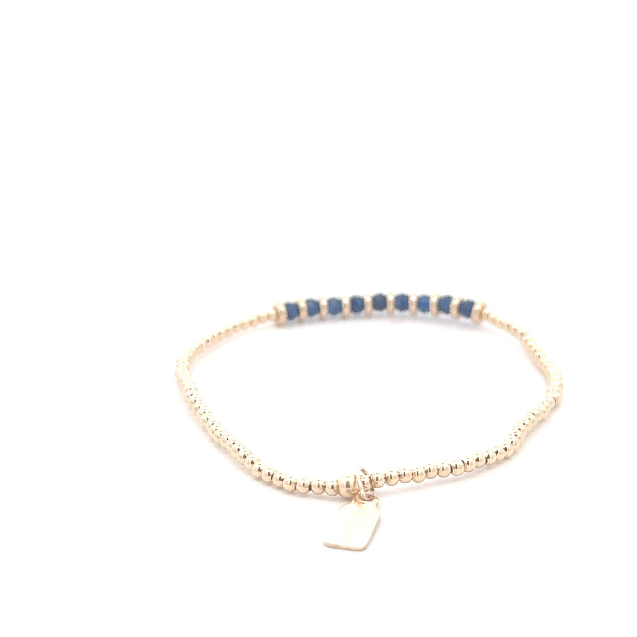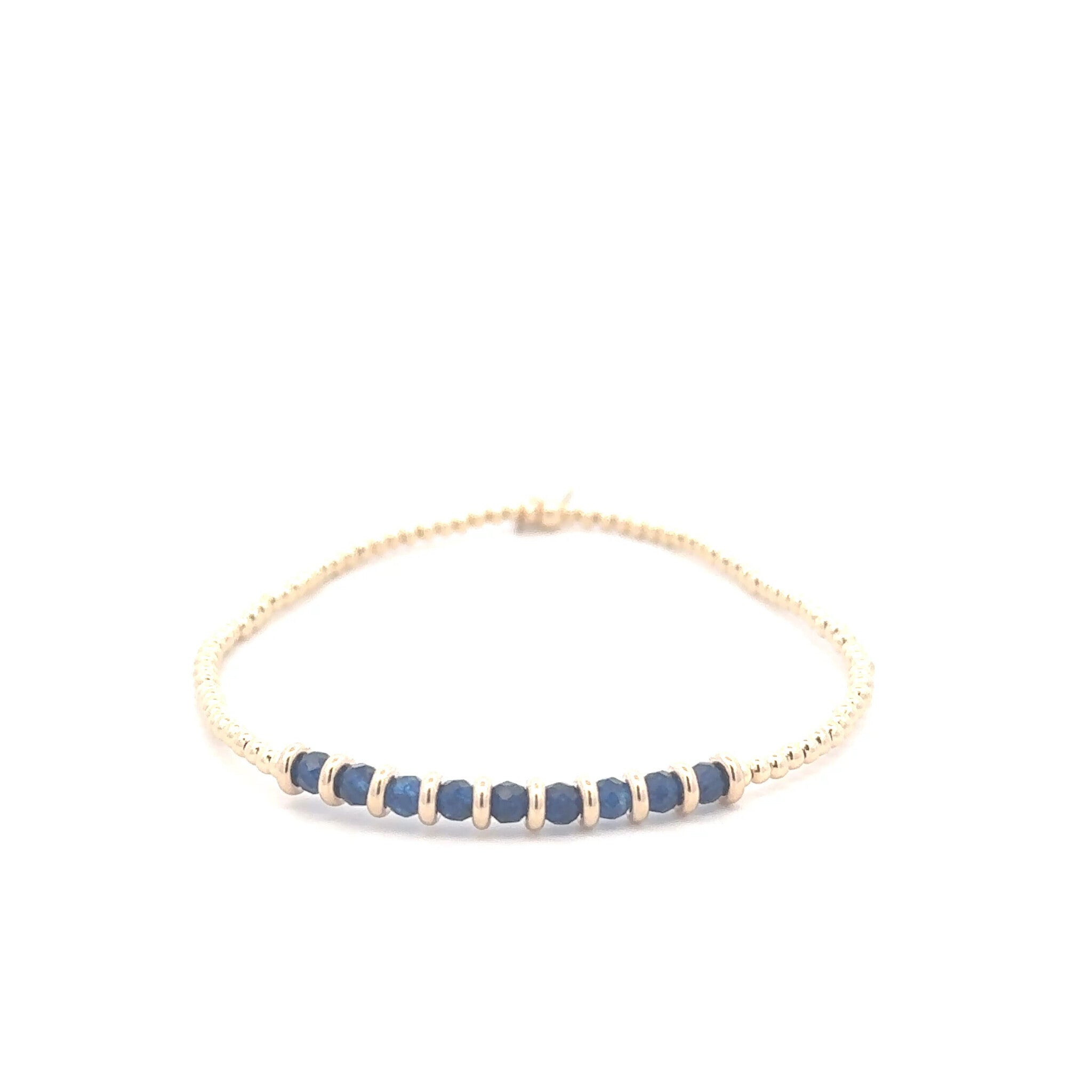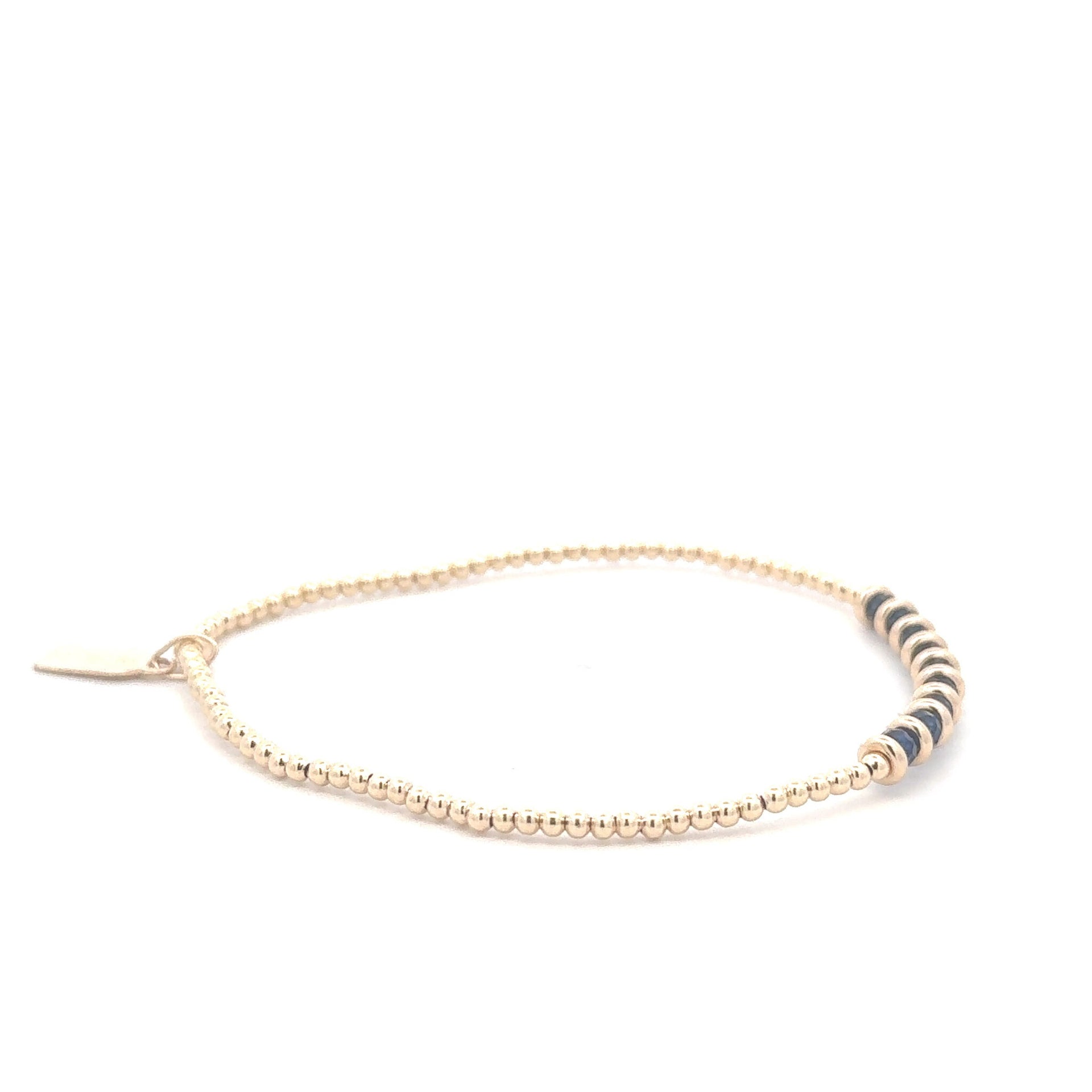 Elastic bracelet with gold-colored beads and a row of colored stones with a mix of wheels.