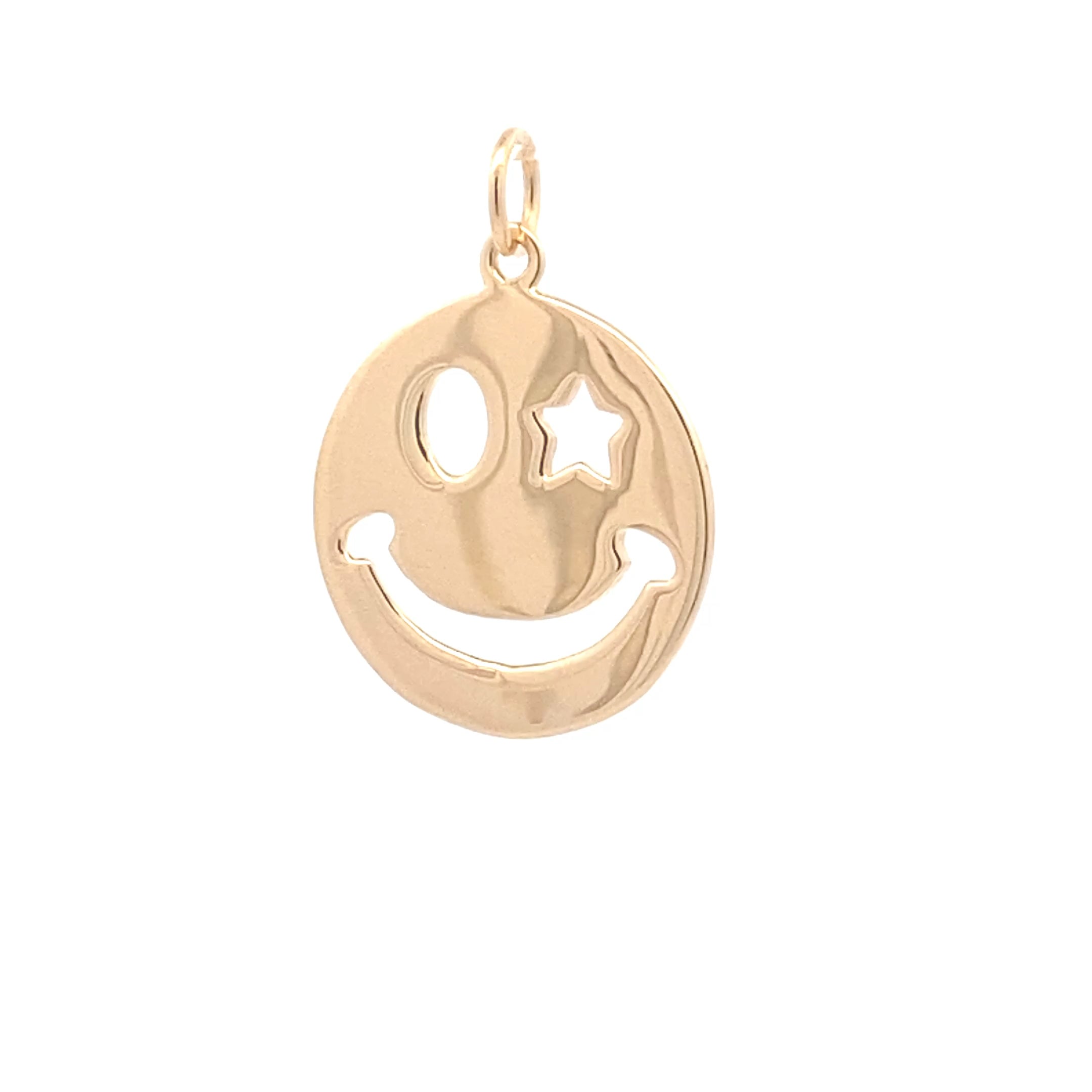 Dije redondo en tono dorado con una cara sonriente tallada en él.