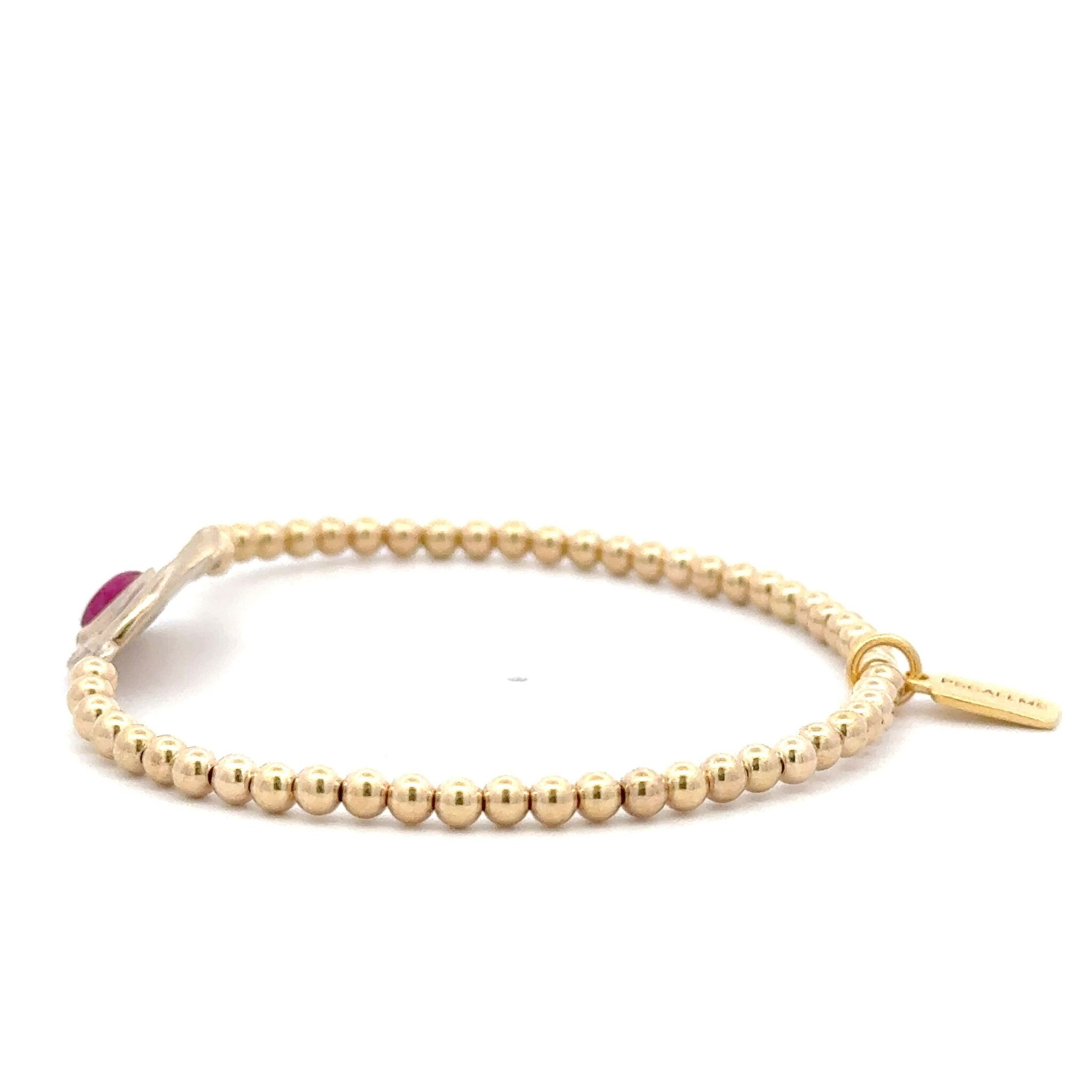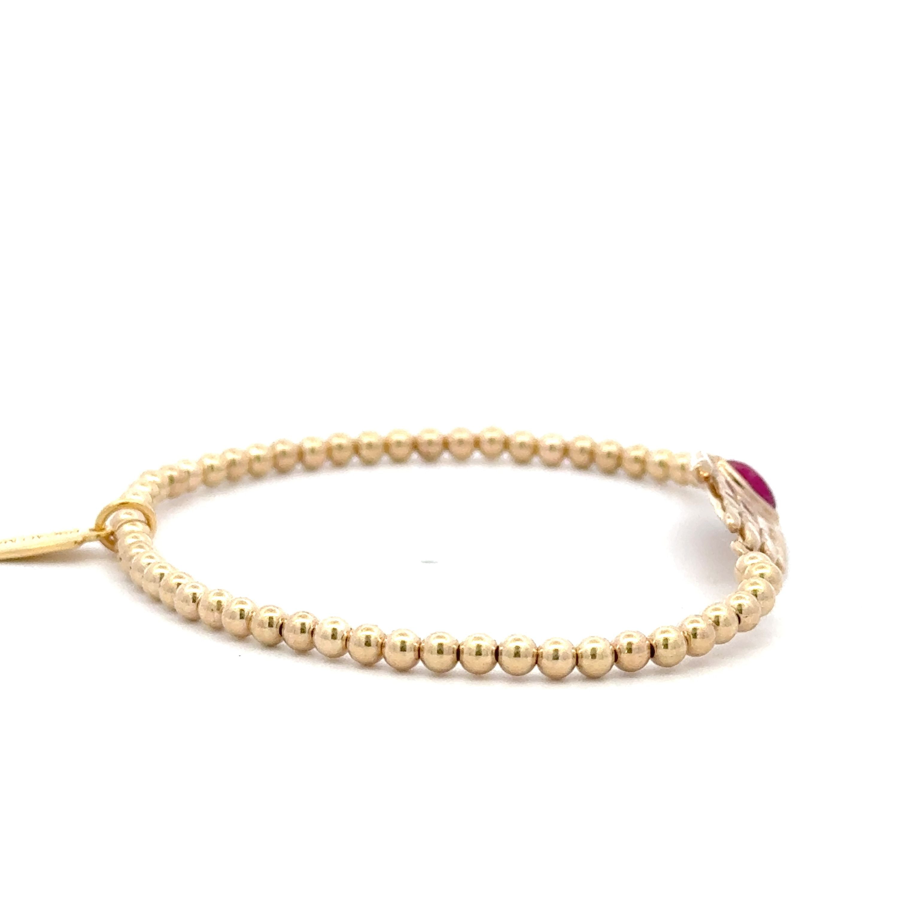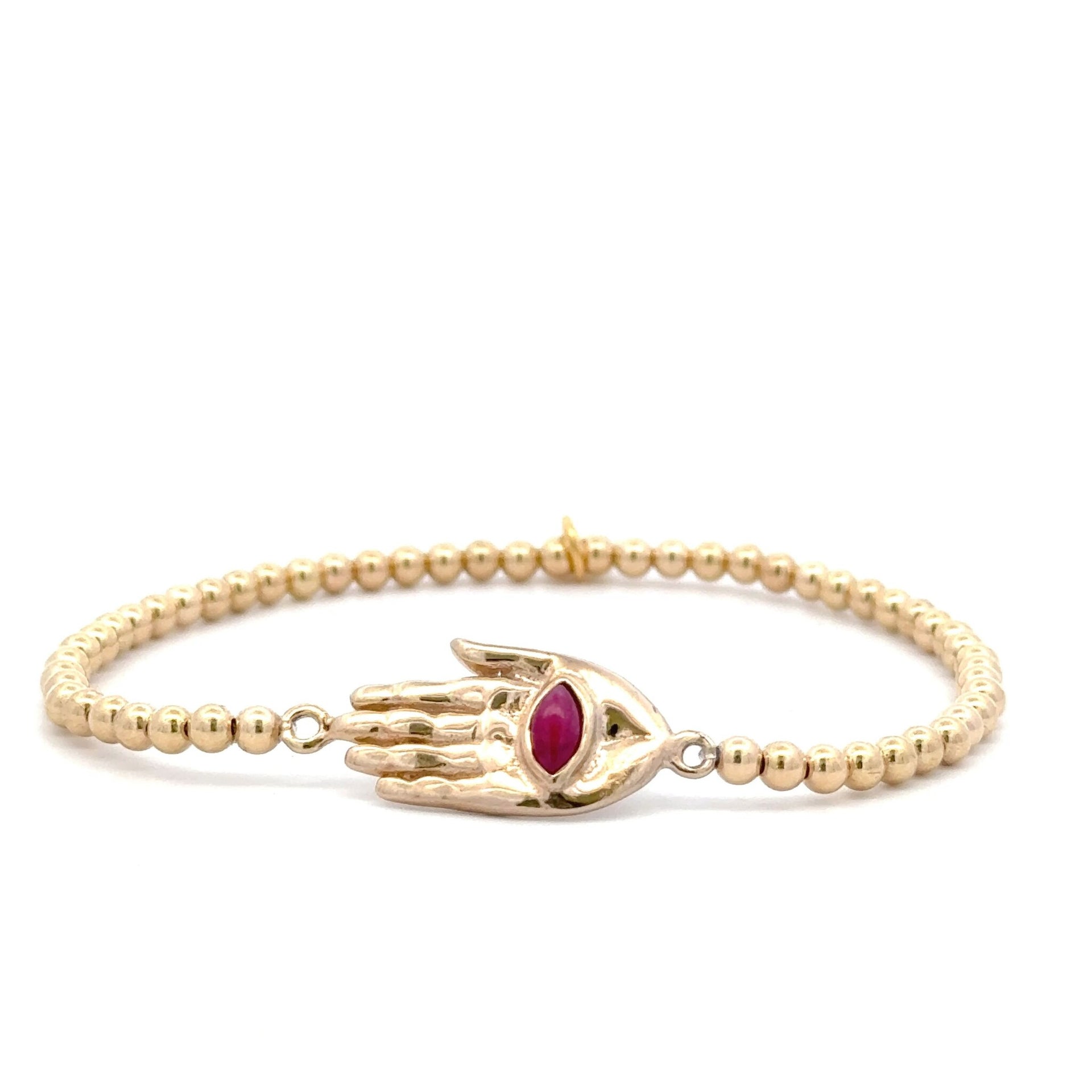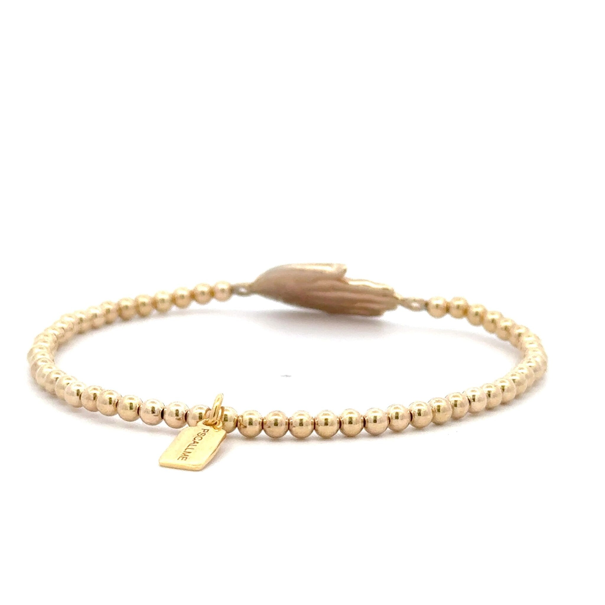 Pulsera elástica con cuentas de color dorado y charm de mano de Hamsa con detalle rosa.