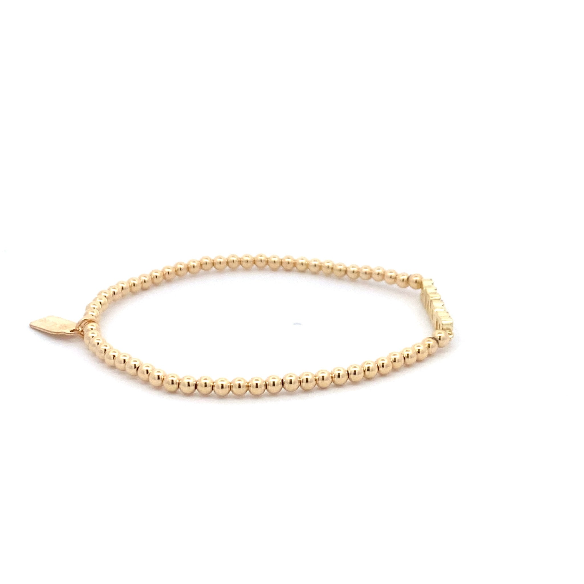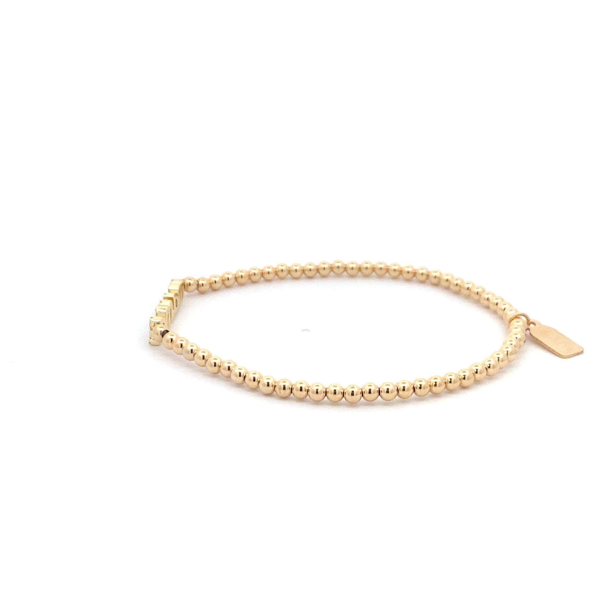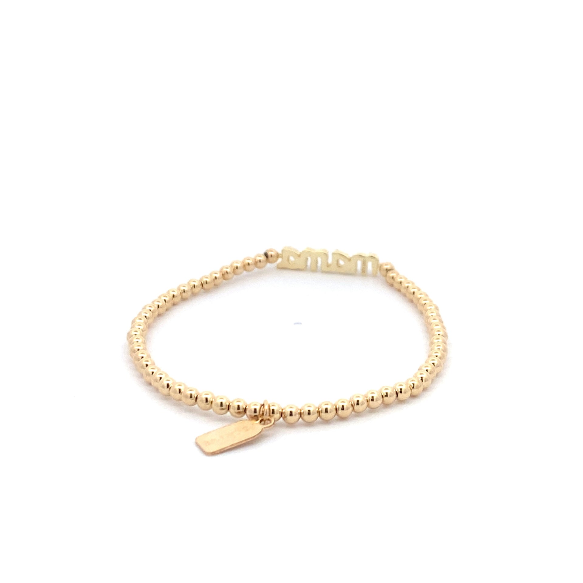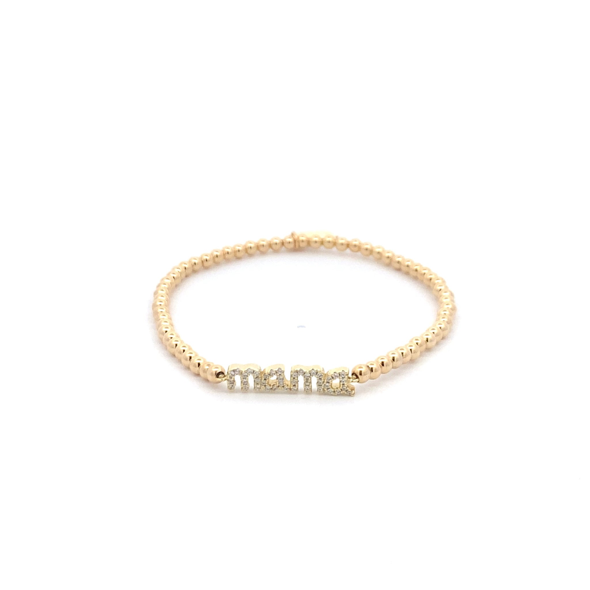 Pulsera elástica con bolitas doradas y texto "mamá" en pedrería.