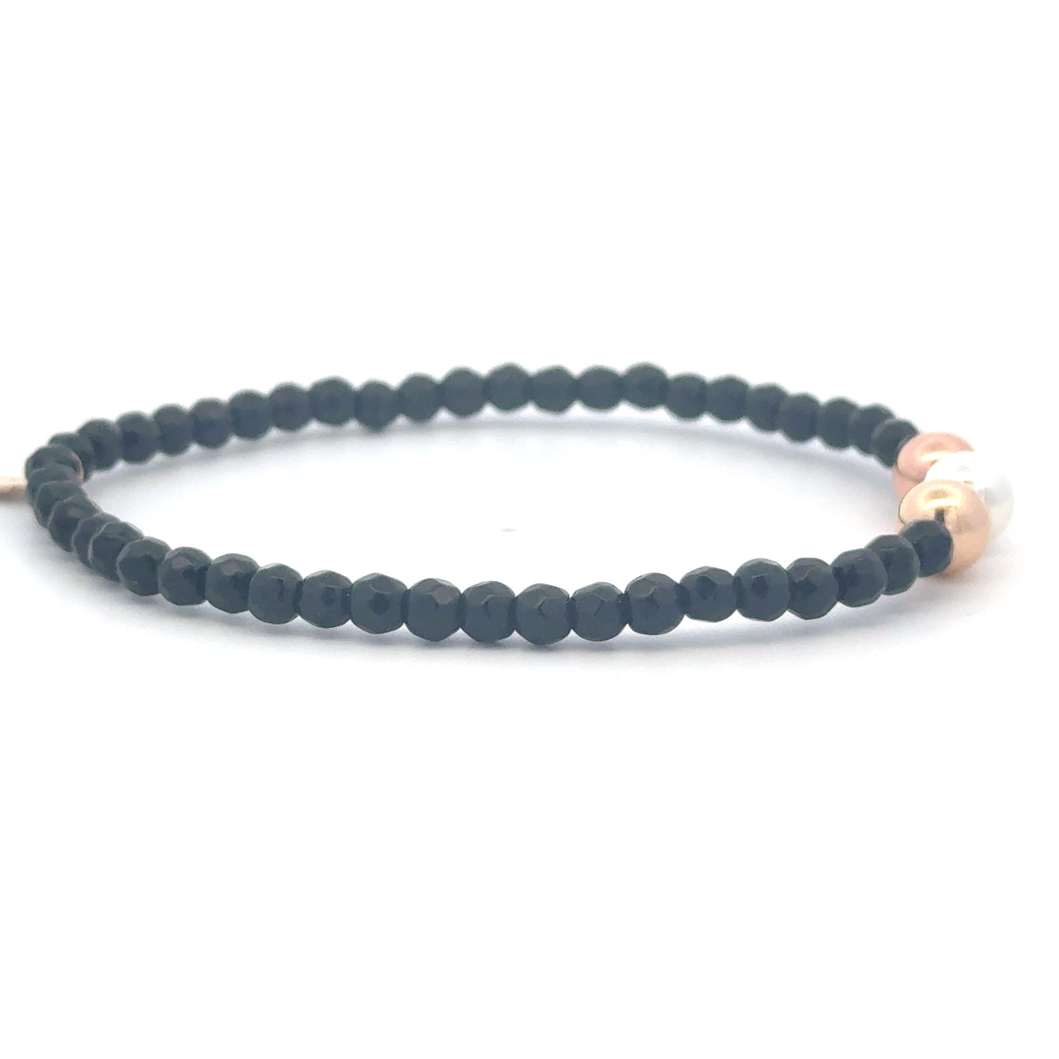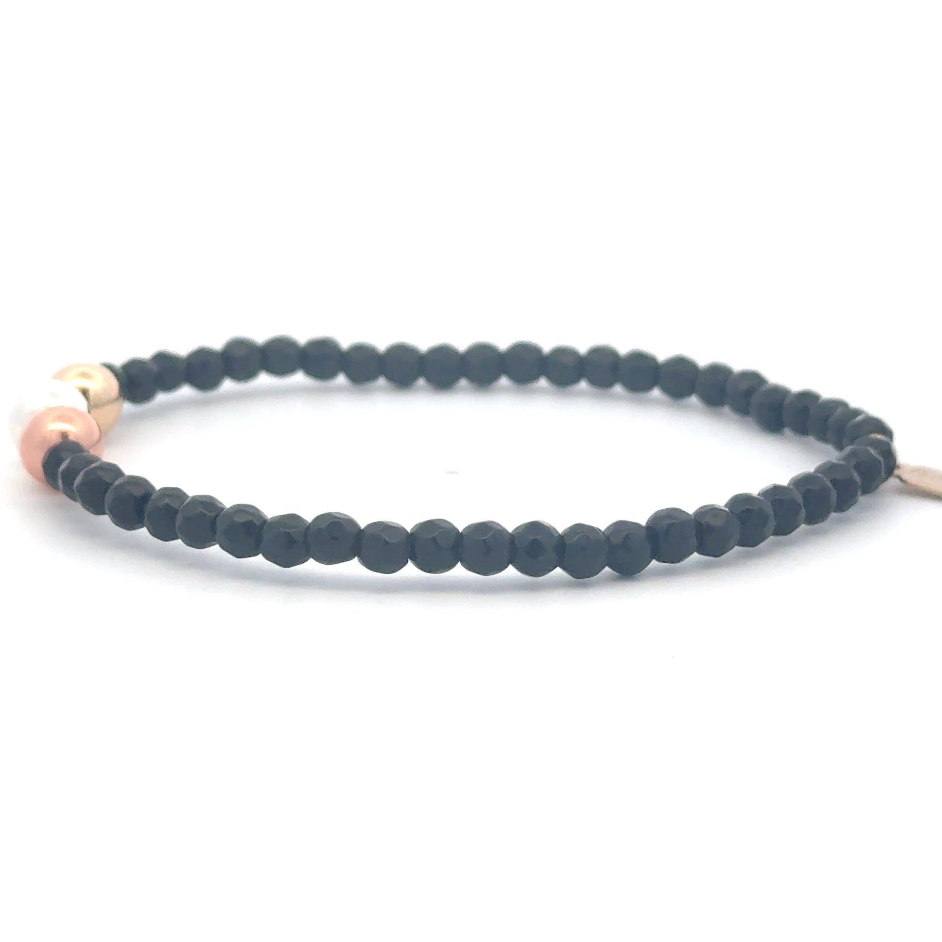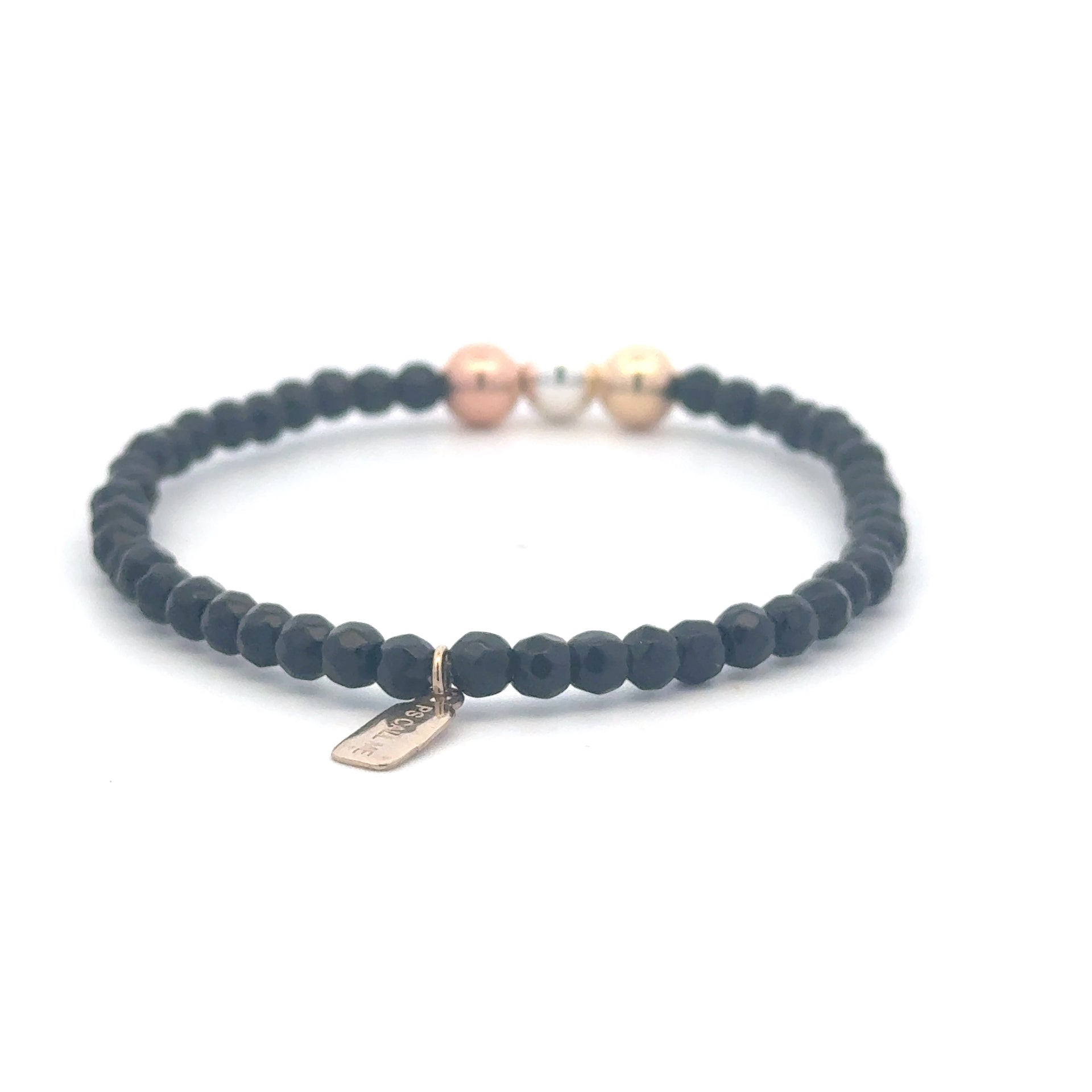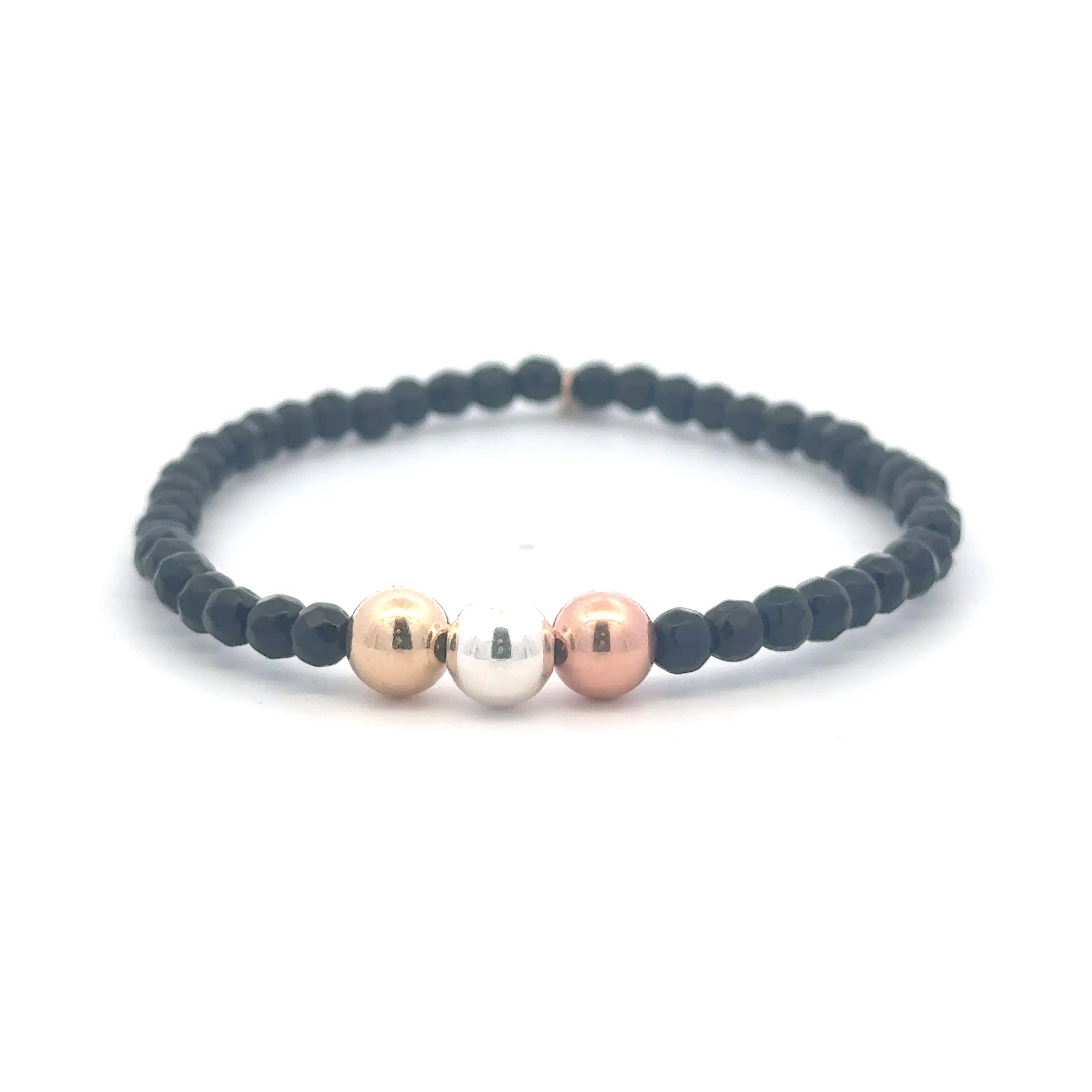 Pulsera elástica con piedras negras y 1 bola de oro, 1 de oro rosa y 1 de plata.