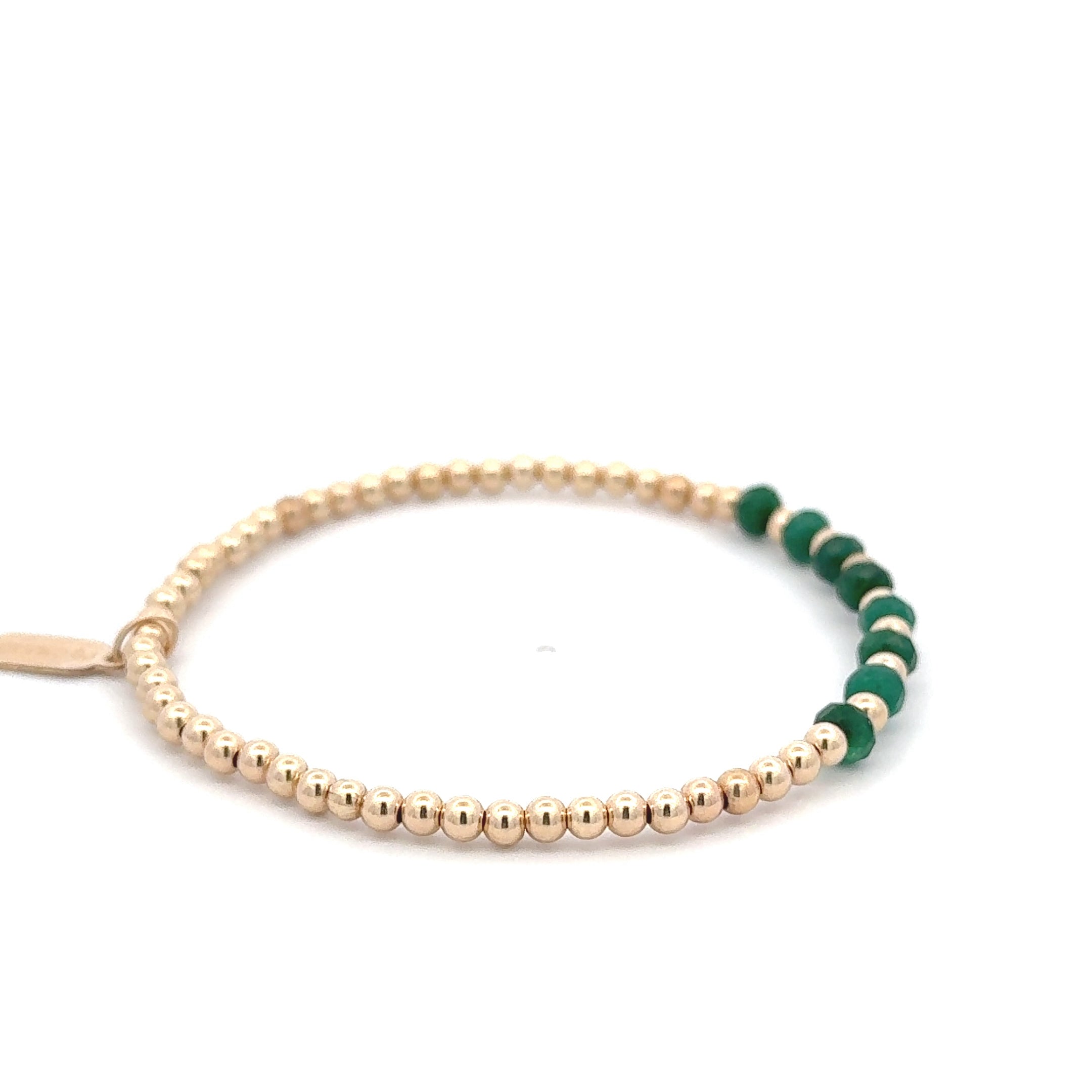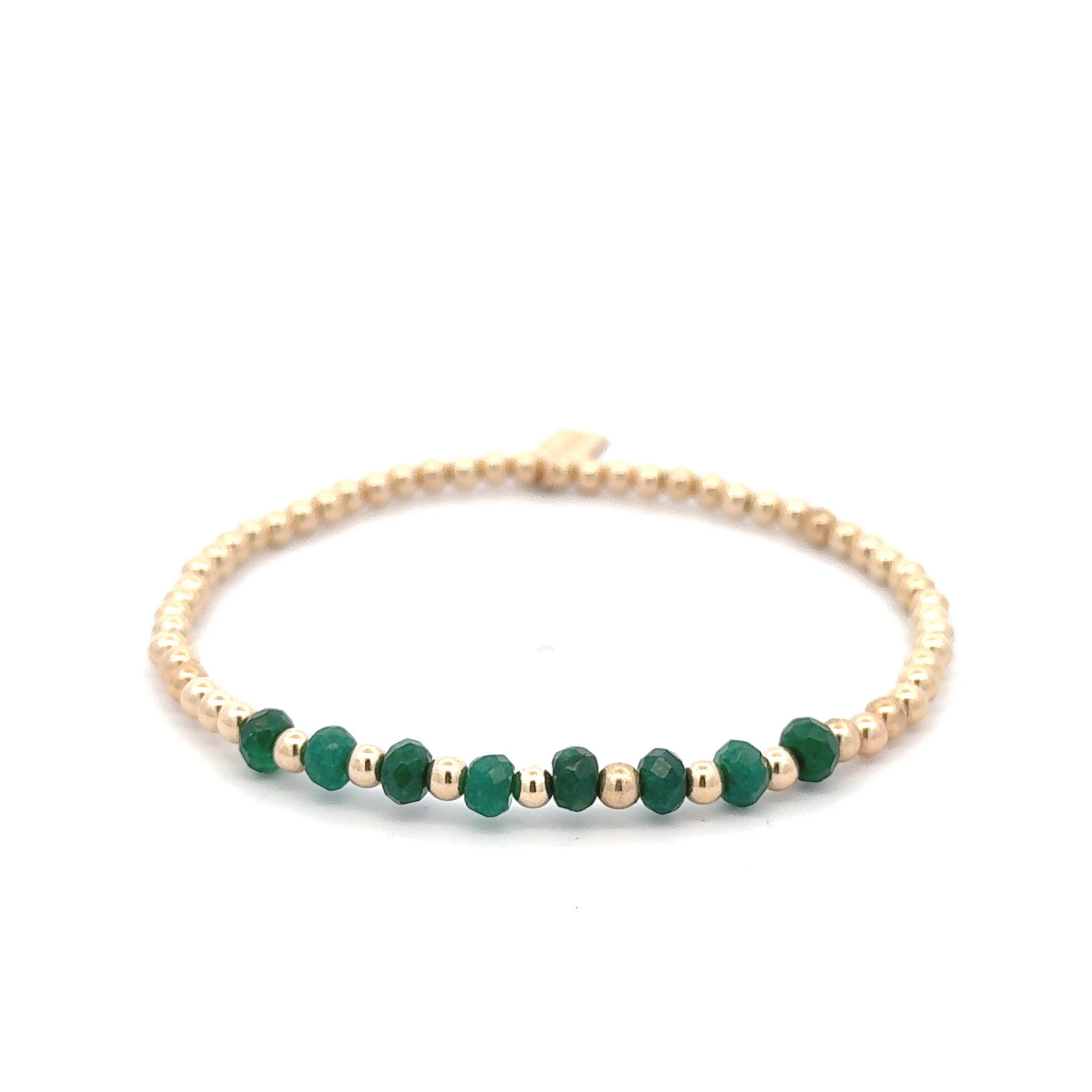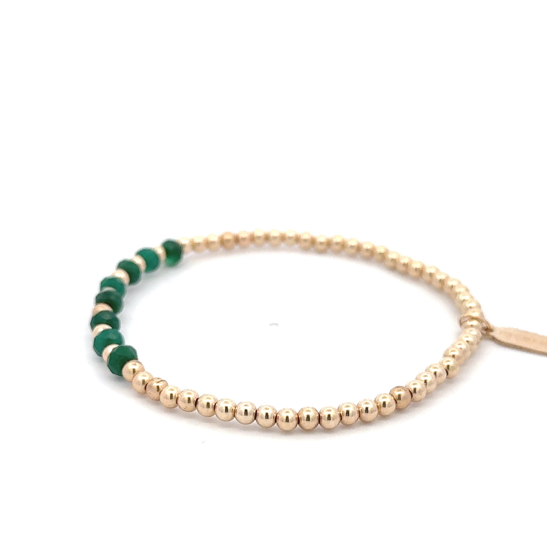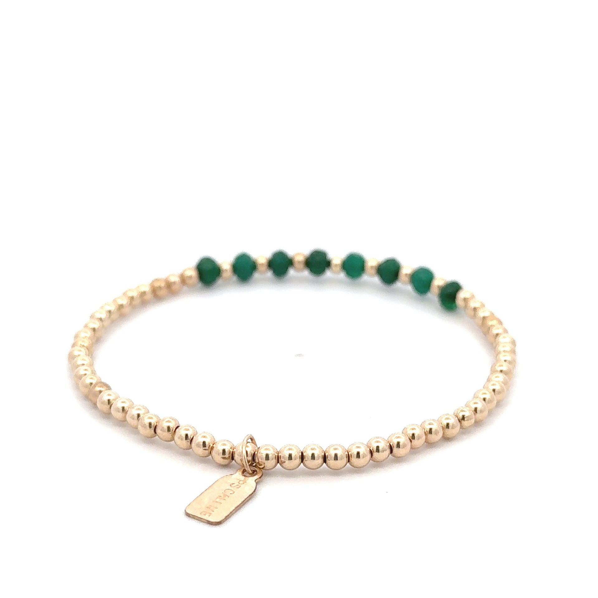 Pulsera elástica con bolitas de color dorado y hilera de piedras de colores.