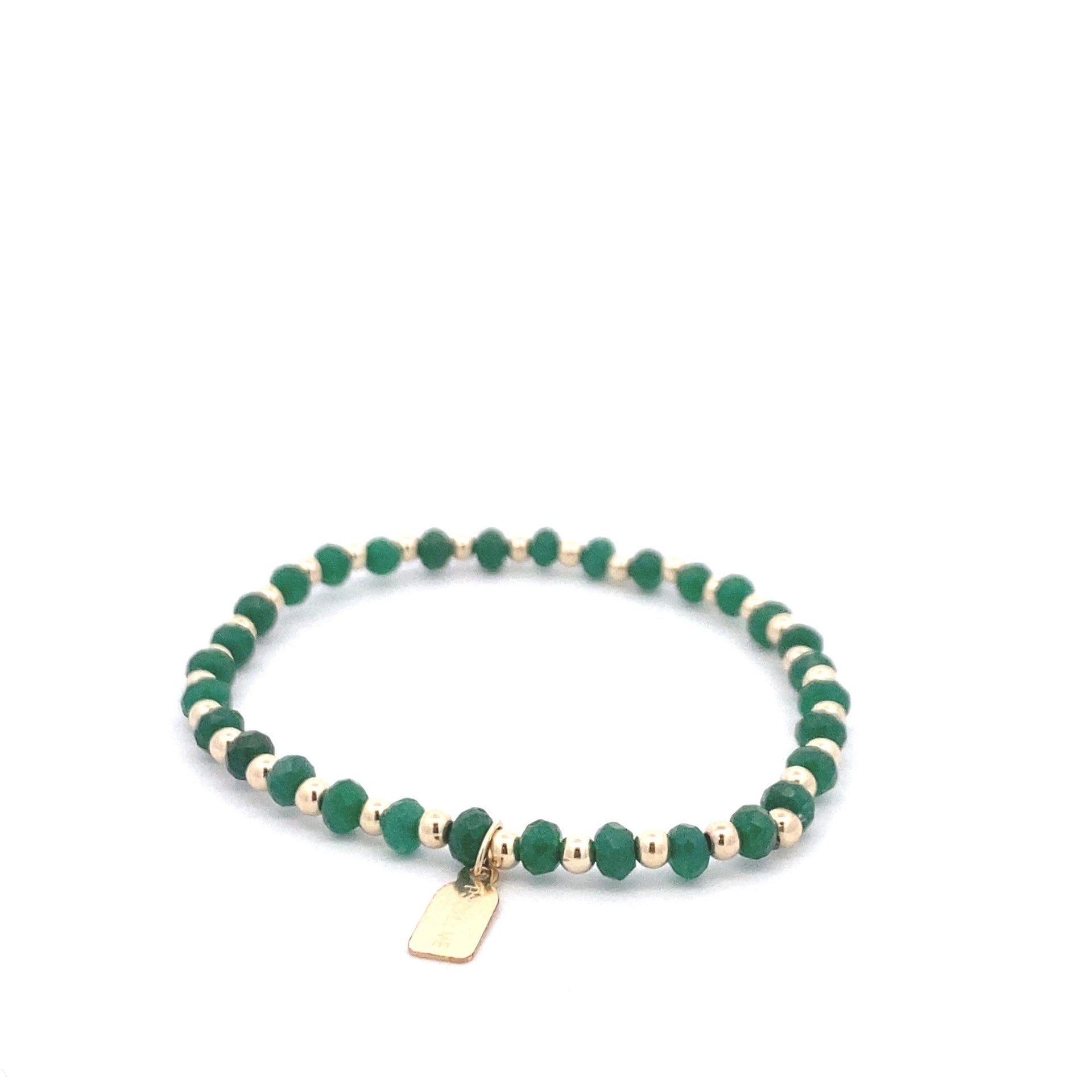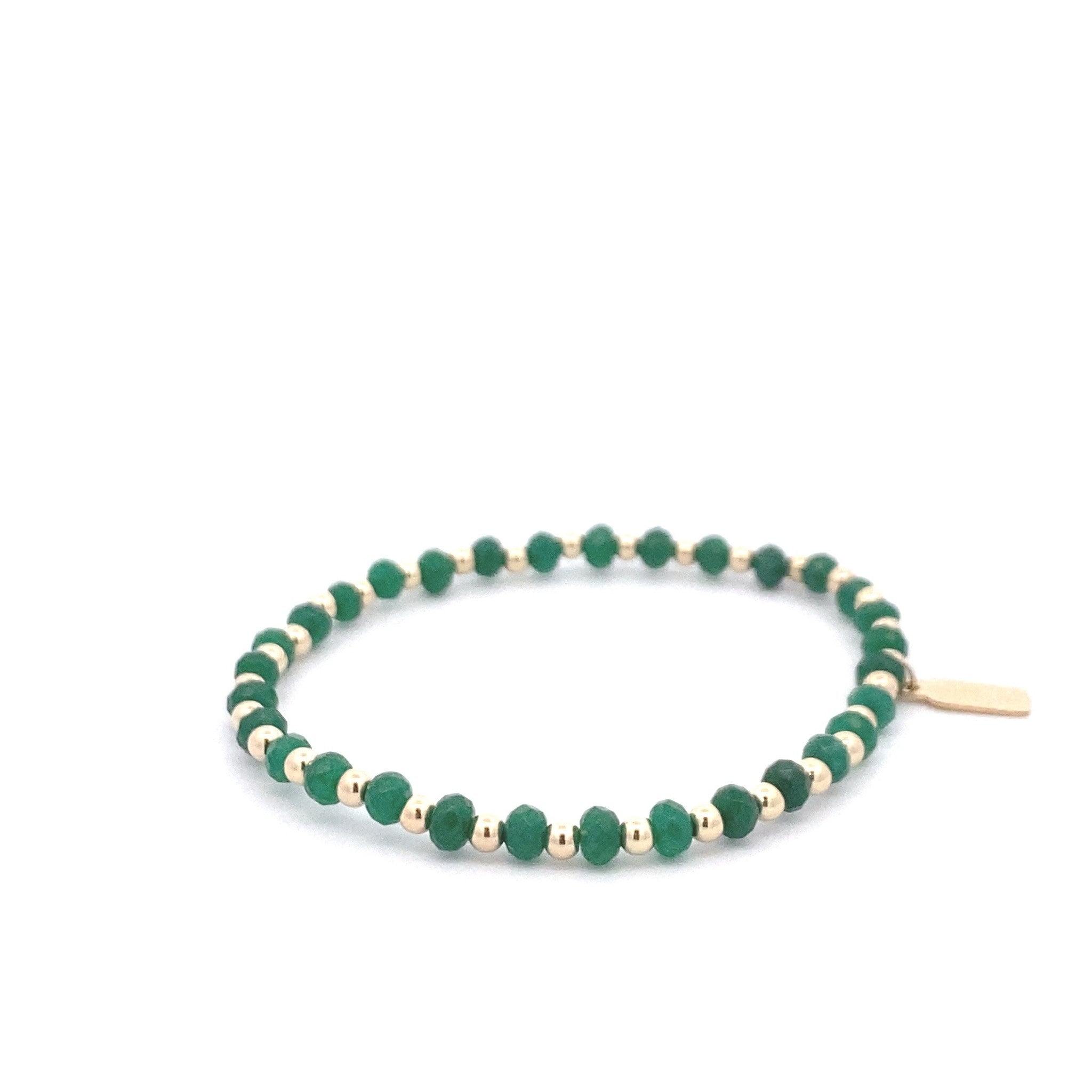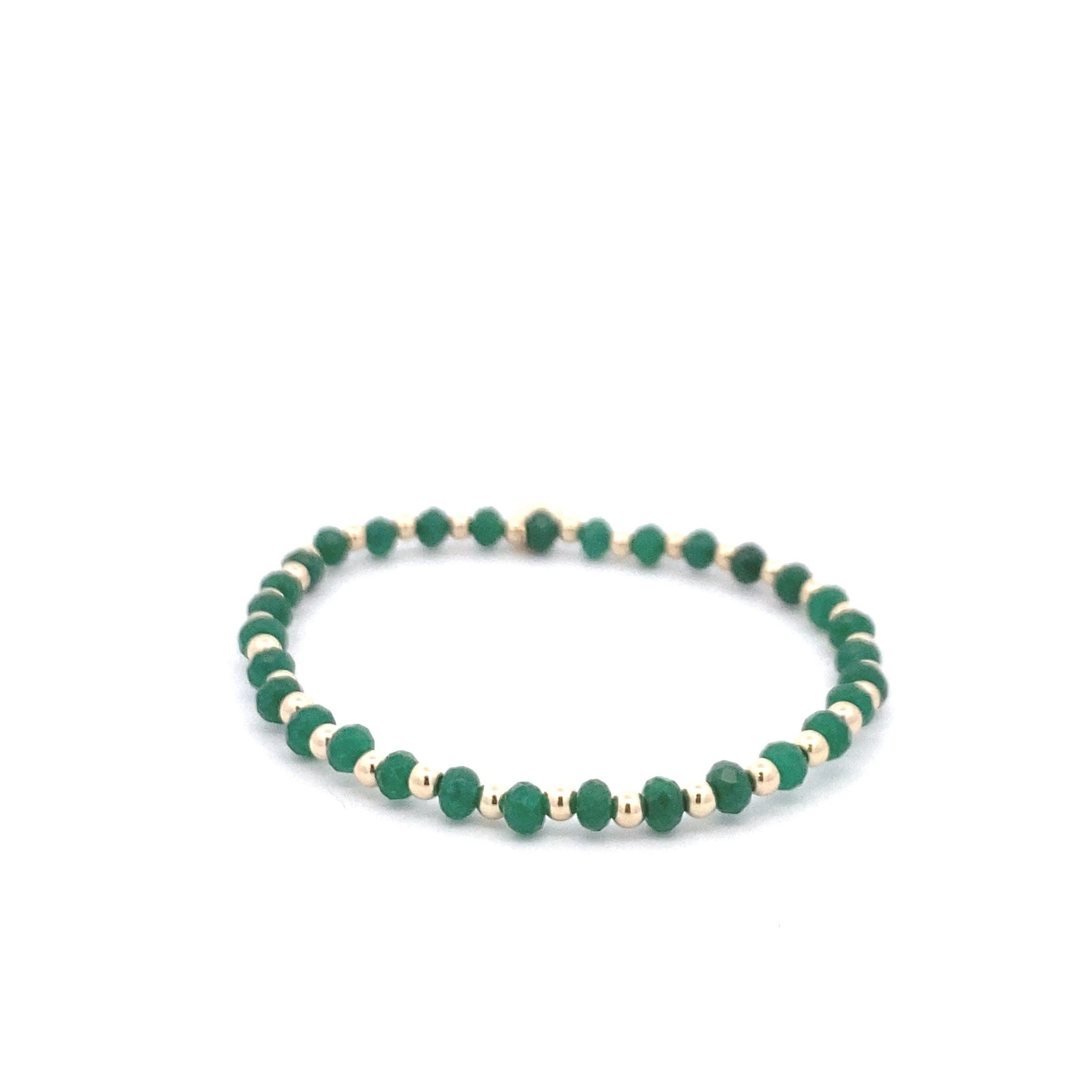 Pulsera elástica con bolitas de color dorado y piedras verdes.