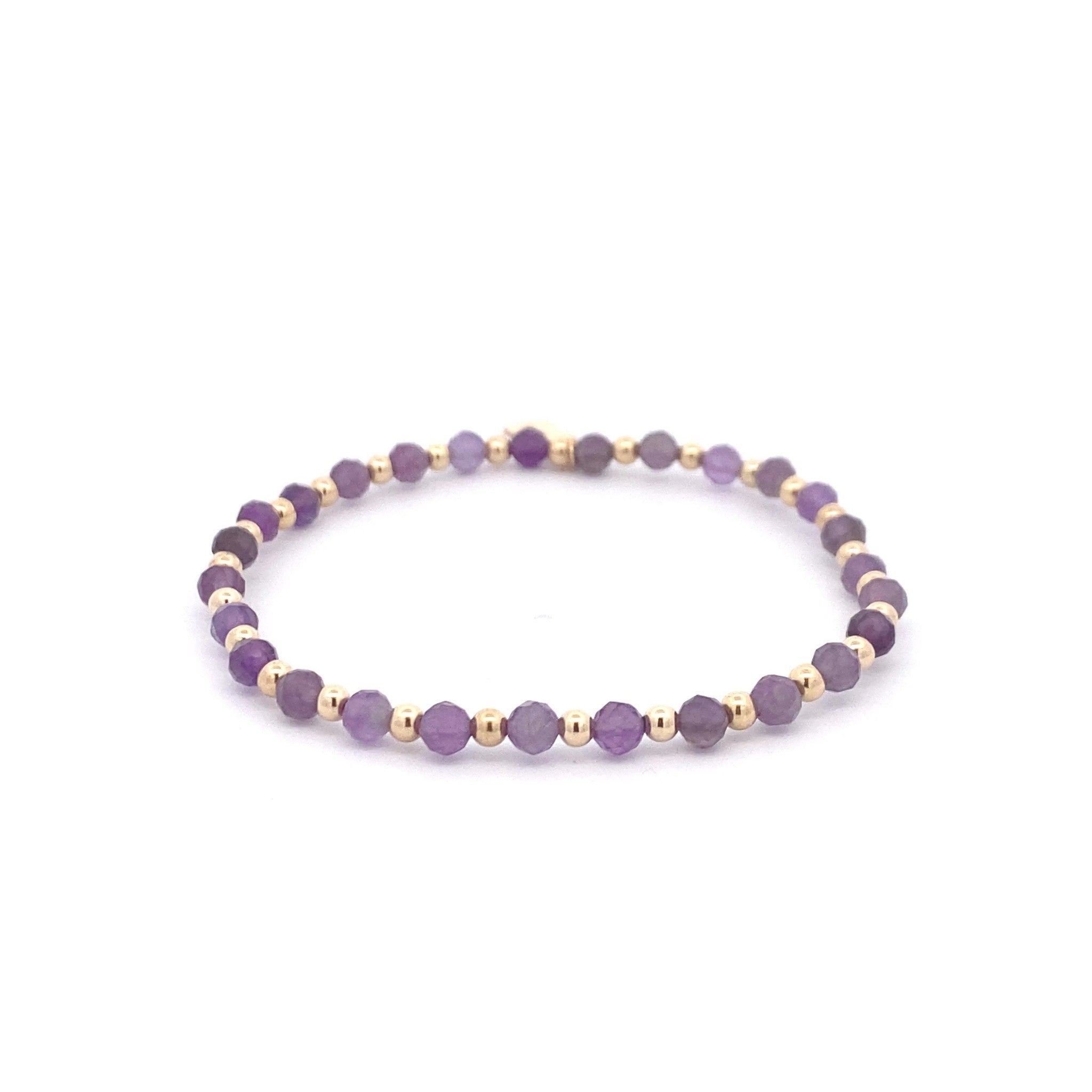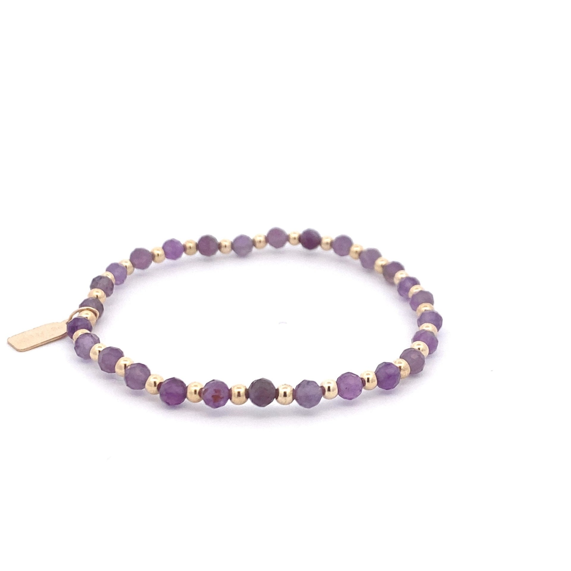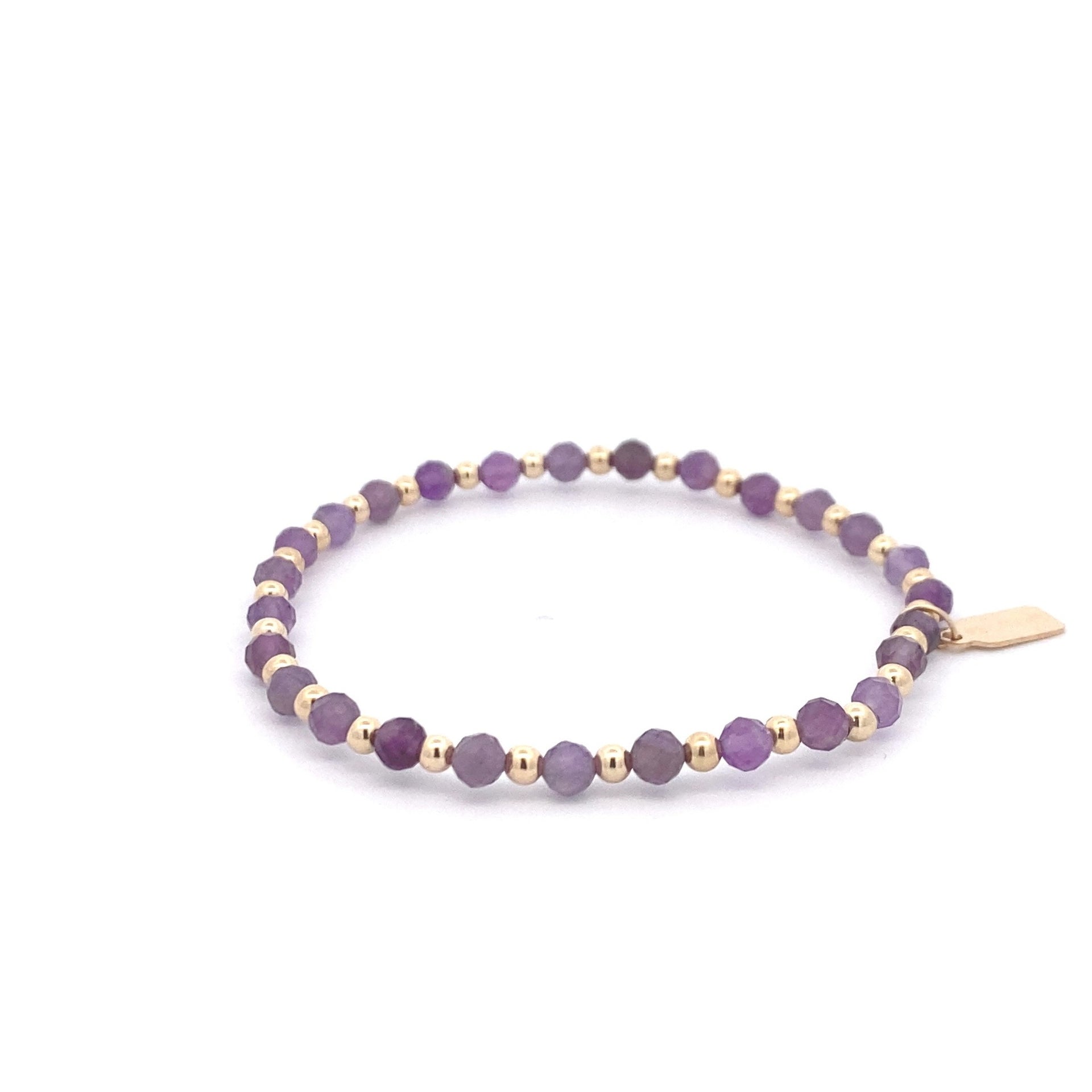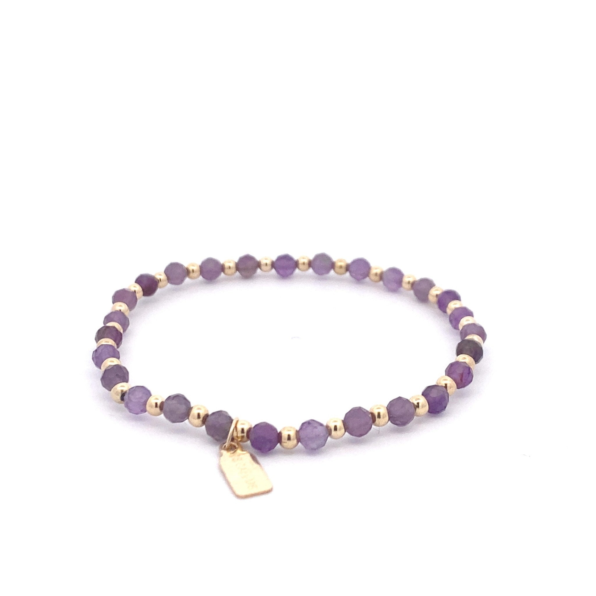 Pulsera elástica con bolitas de color dorado y piedras moradas.