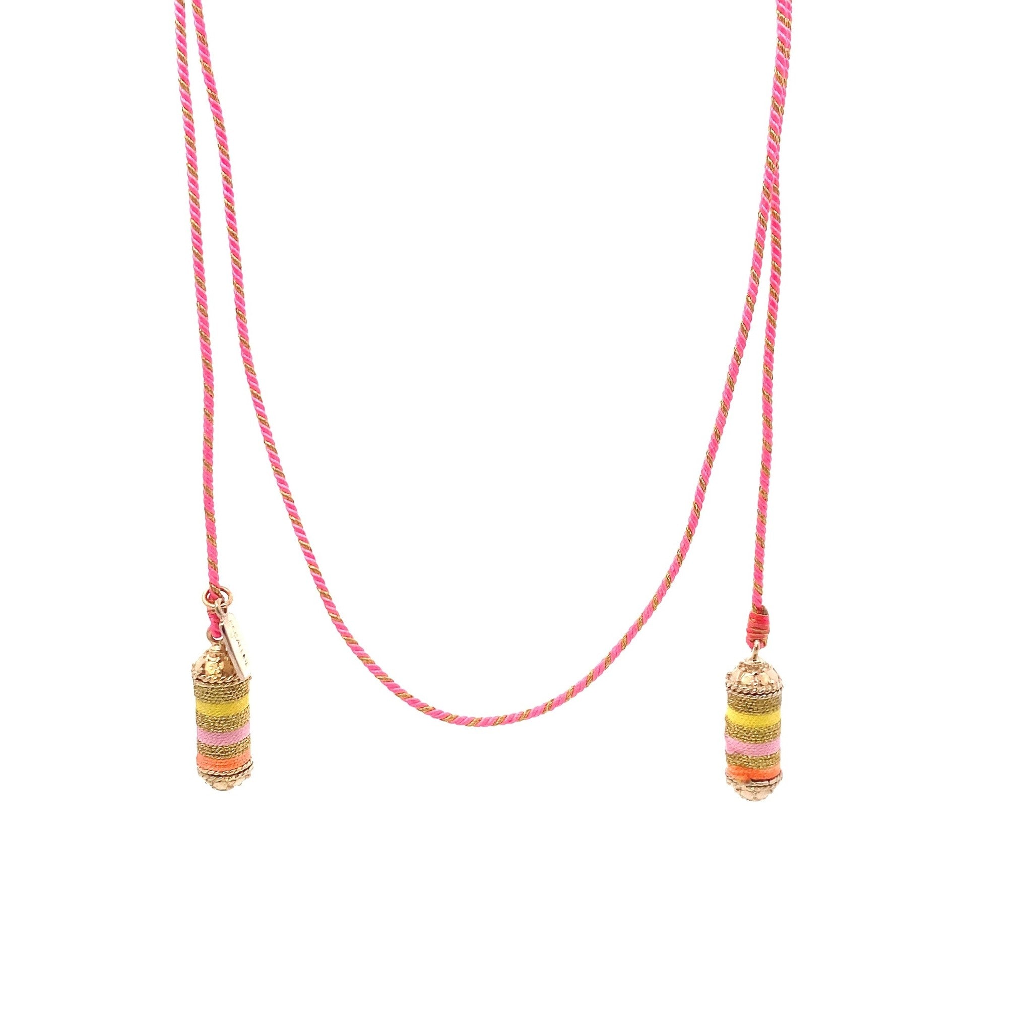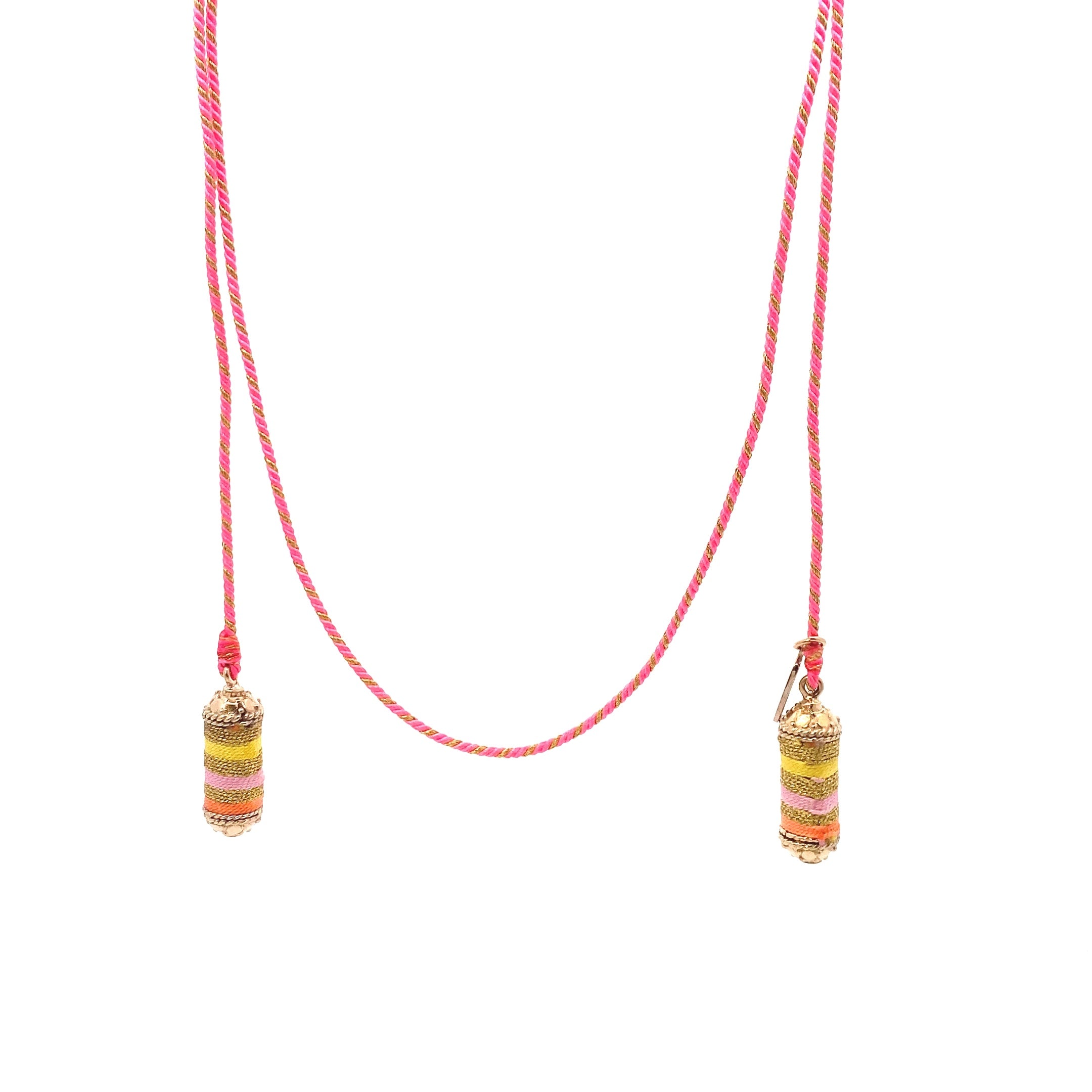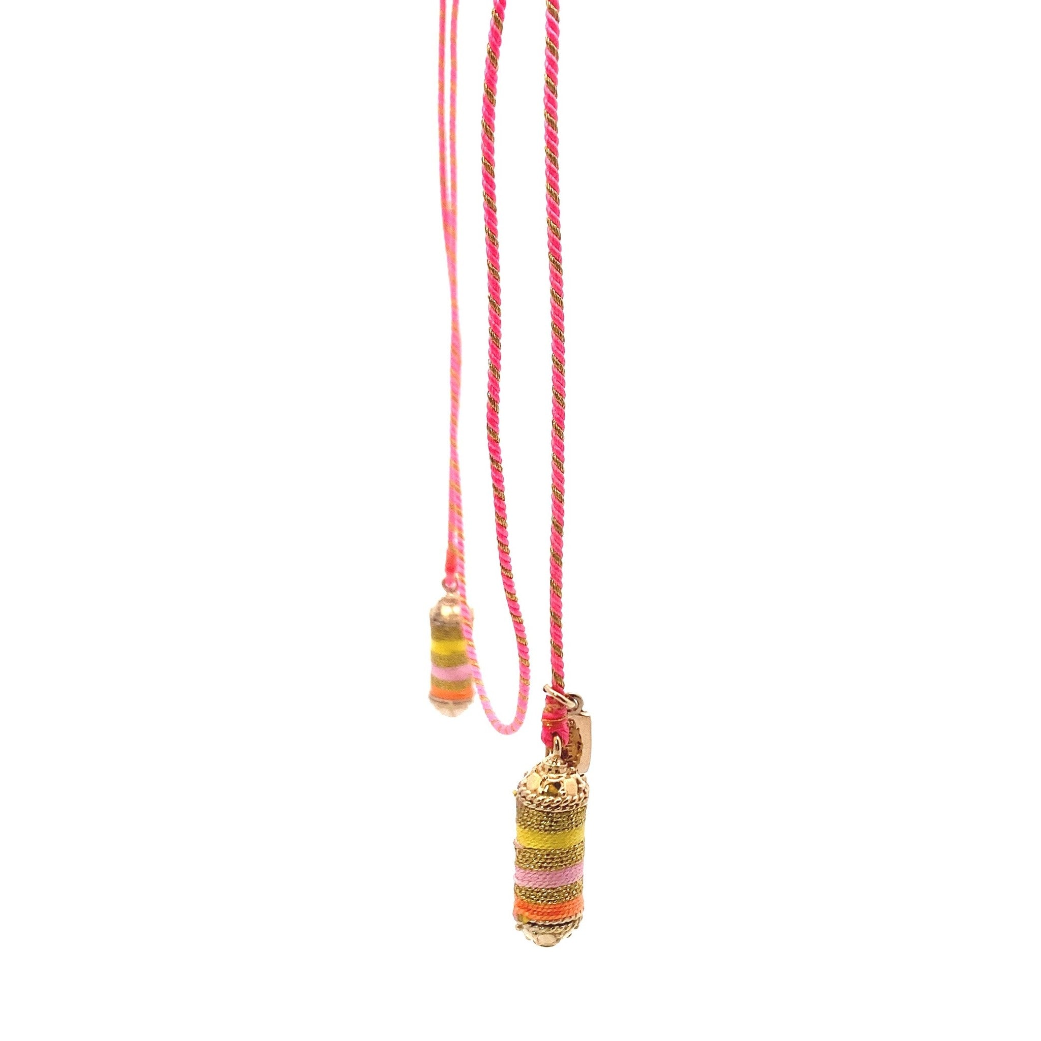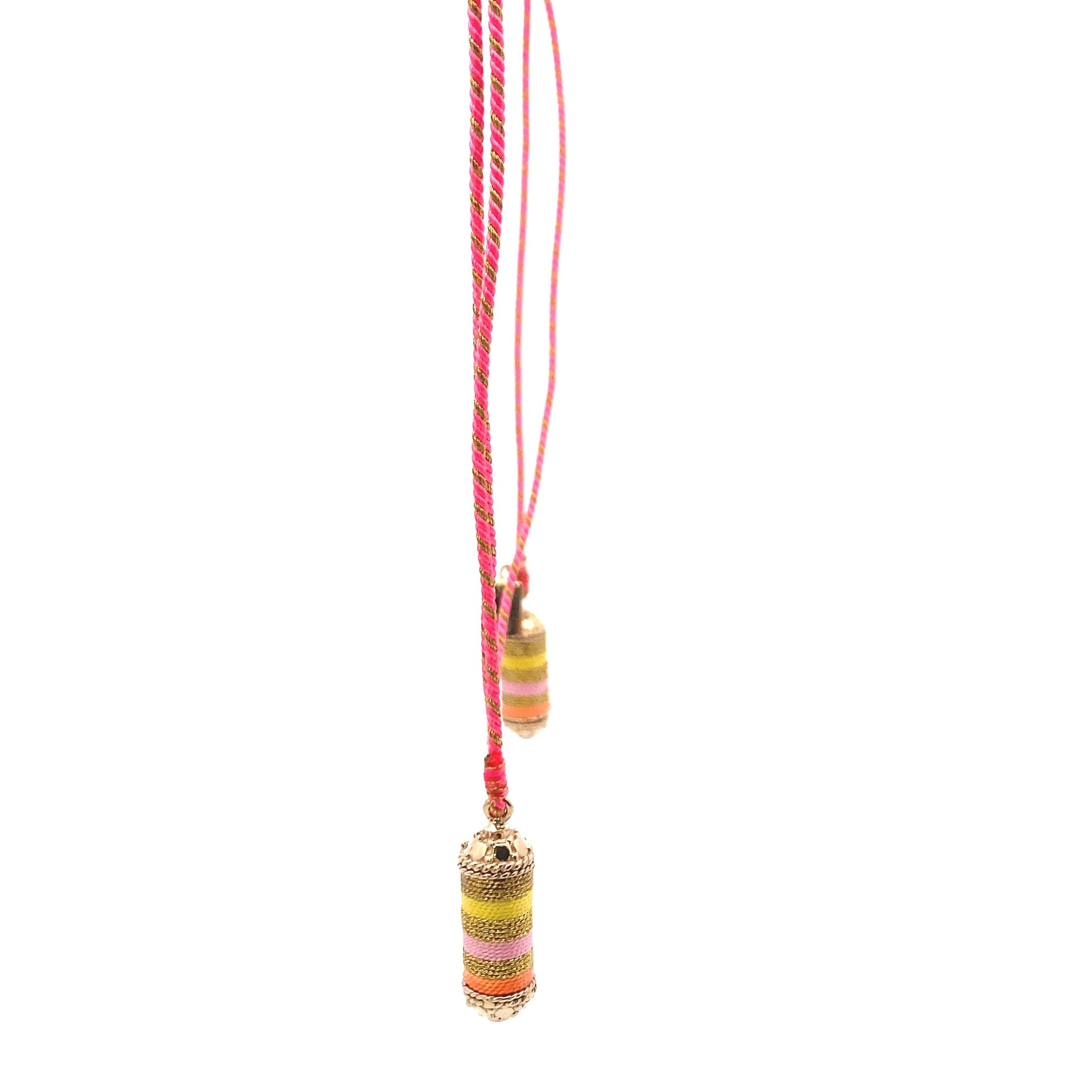 Collar con cordón de color y amuletos de la suerte de color dorado con cordón de color alrededor de los amuletos.