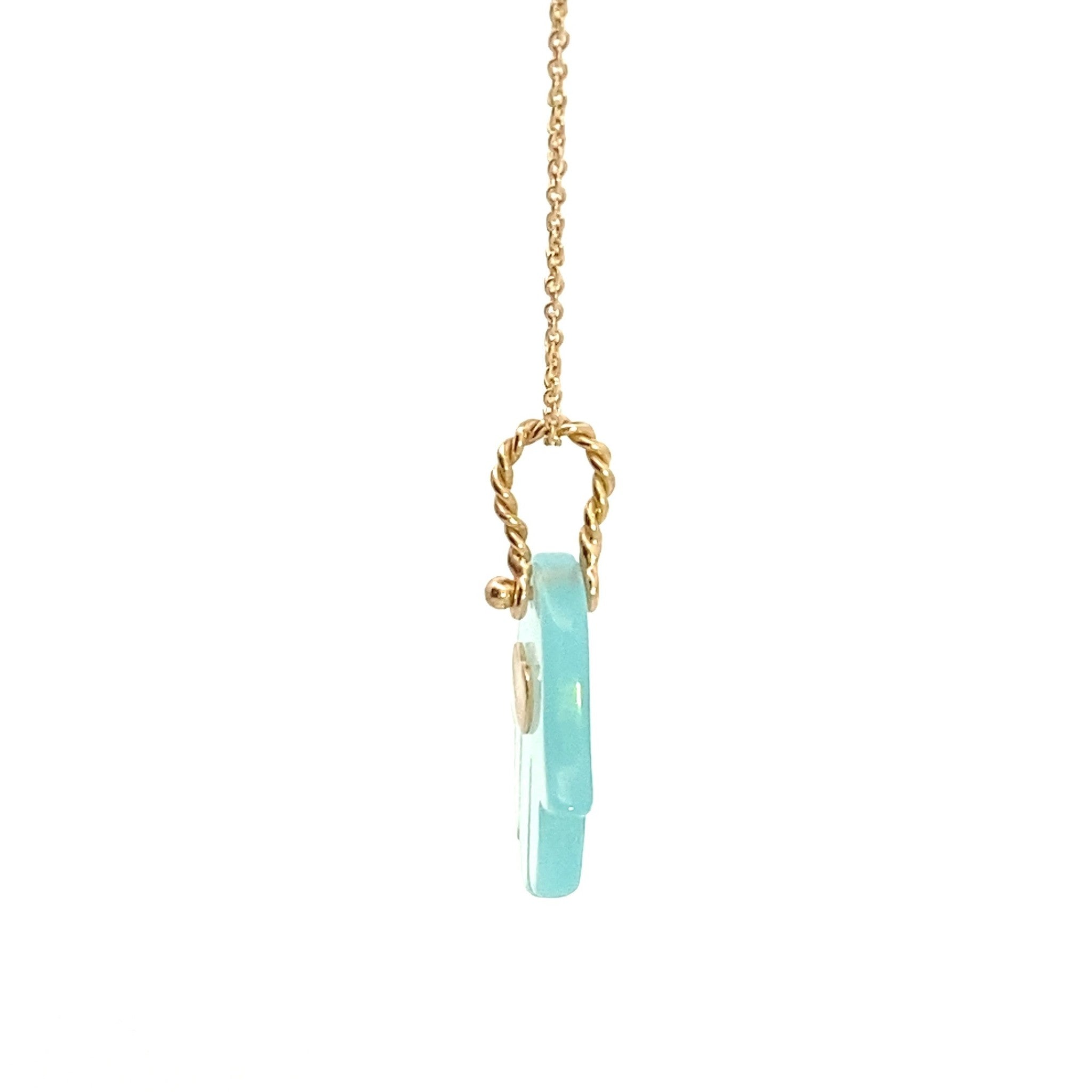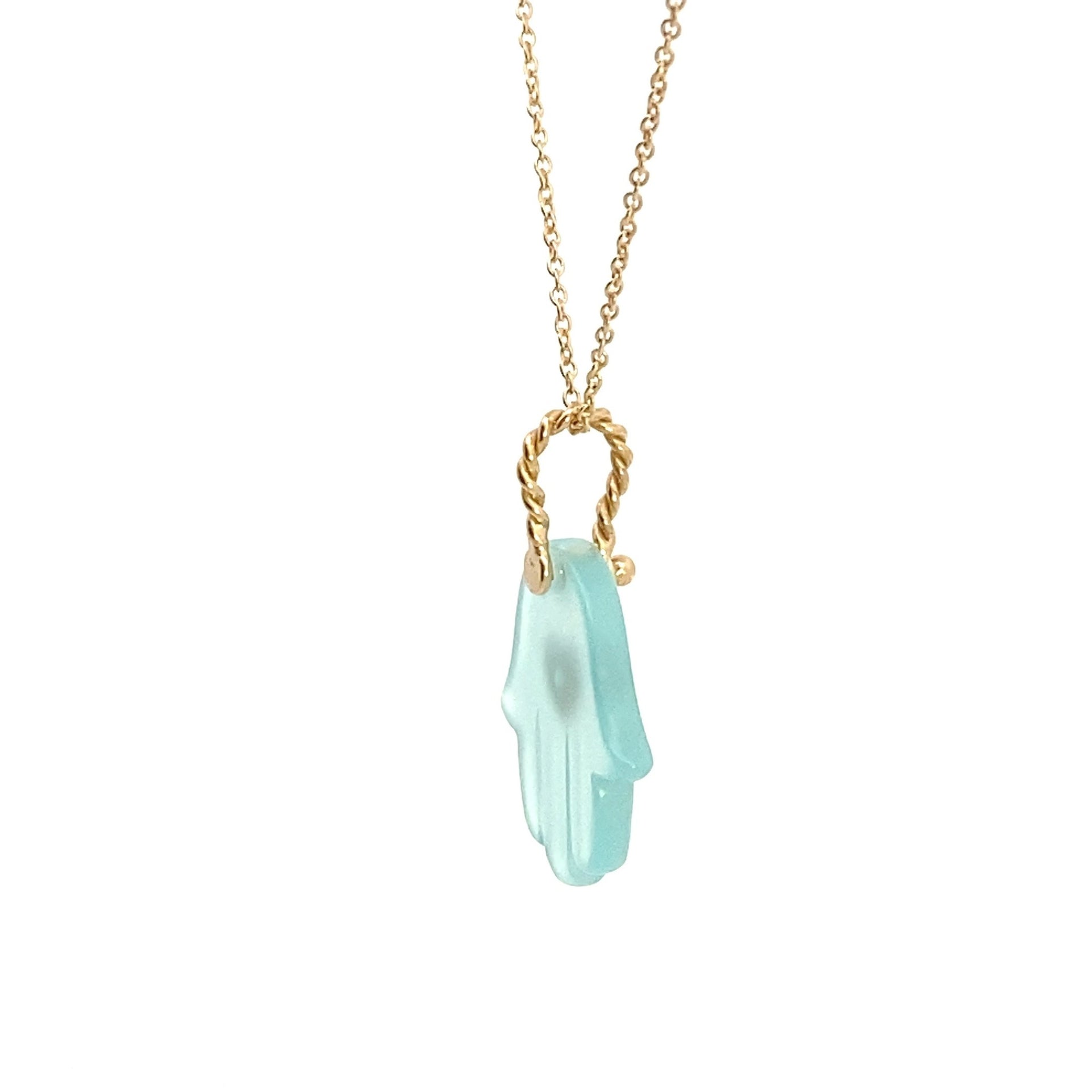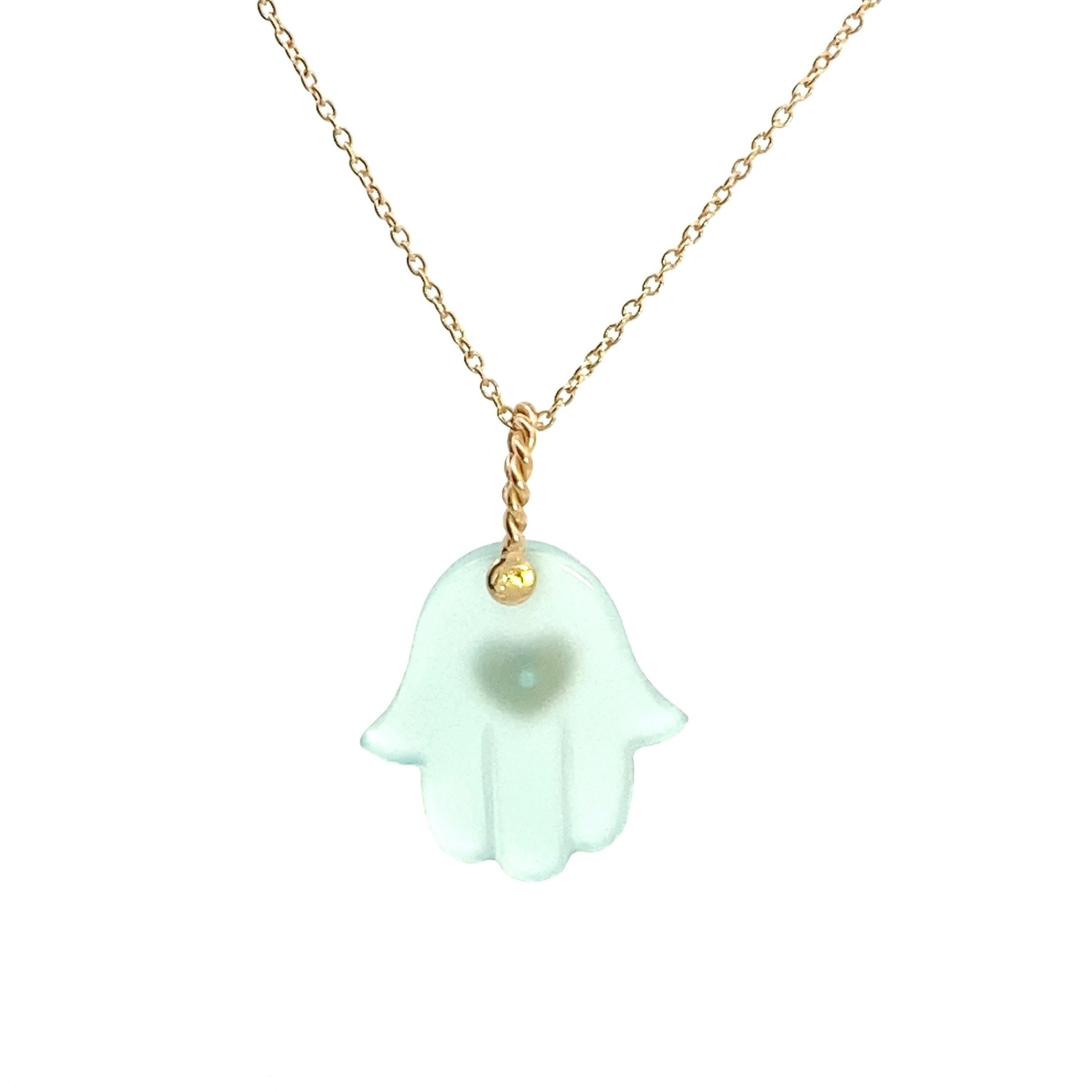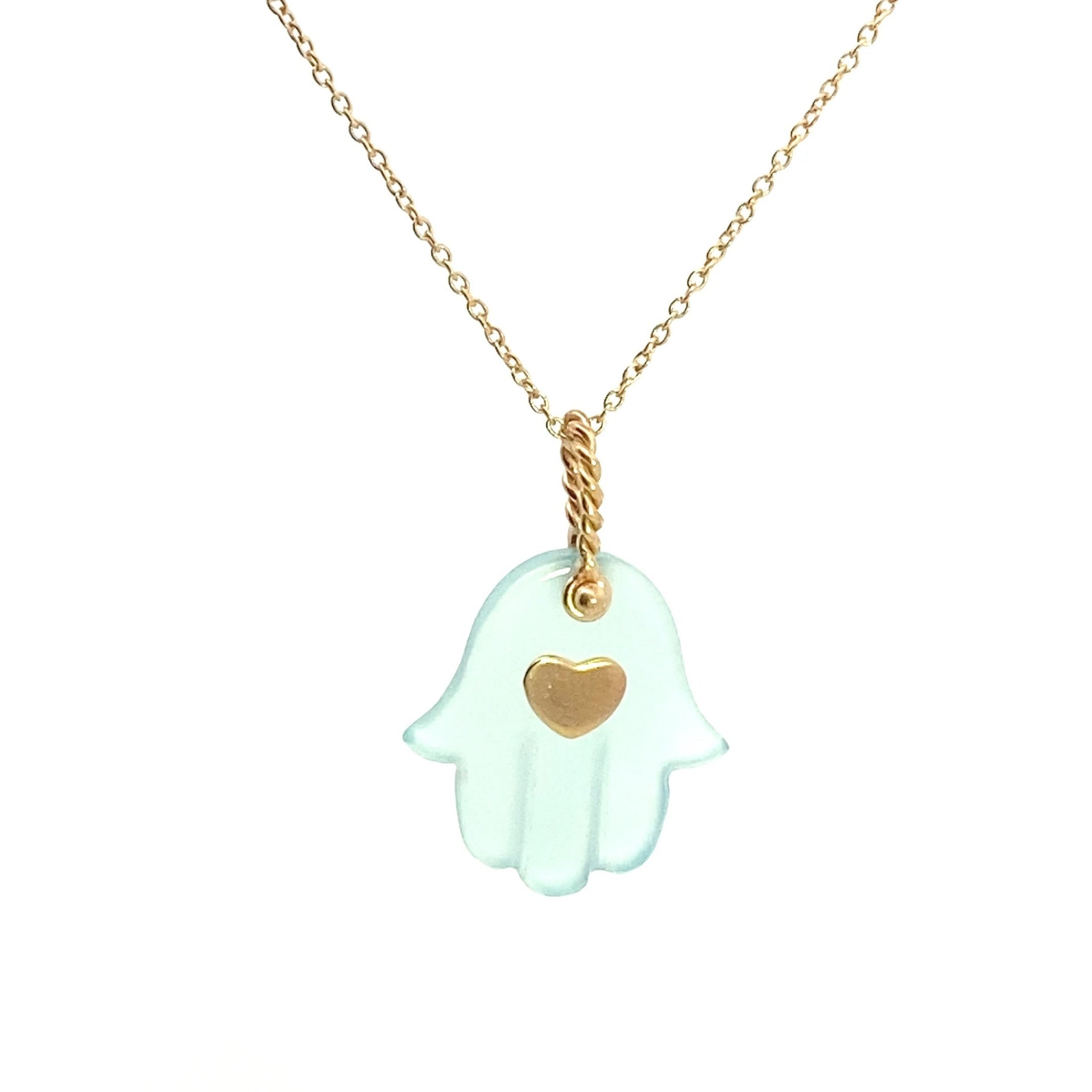 Collar en tono dorado con un charm de color en forma de mano de hamsa con un corazón en tono dorado en la parte superior.