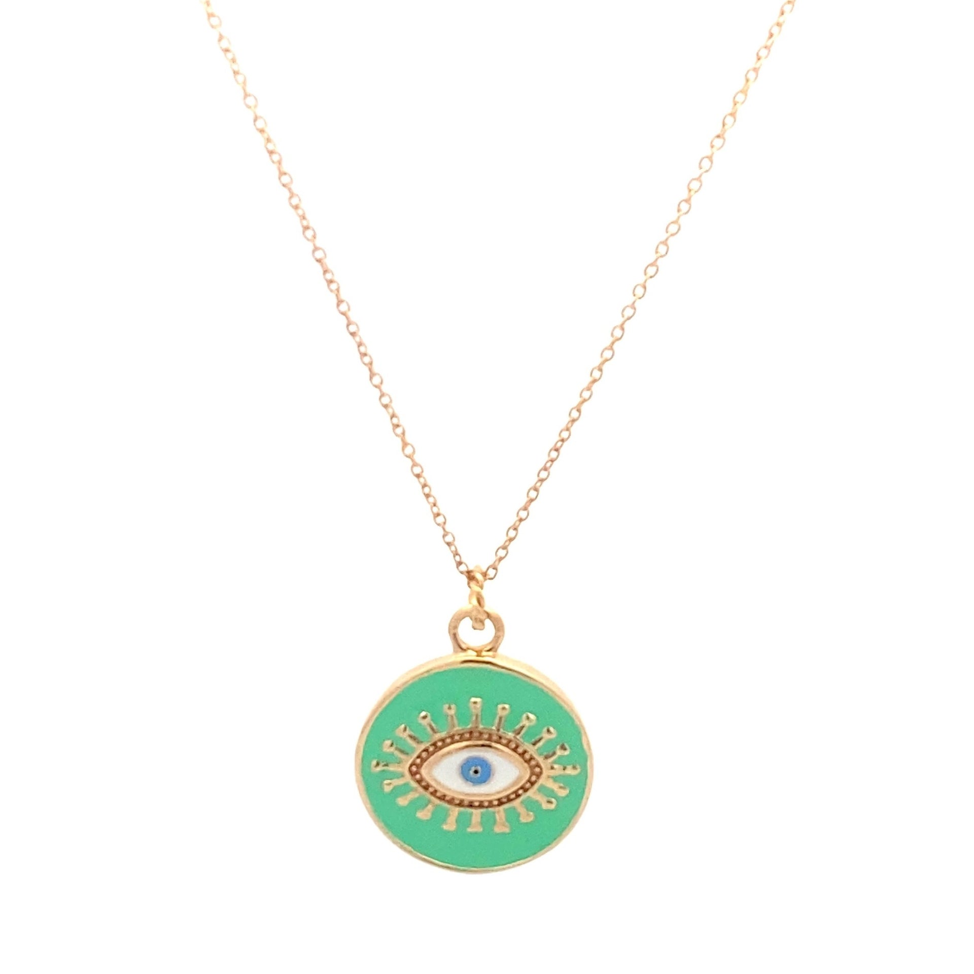 Collar en tono dorado con un dije redondo de color verde mar con un ojo representado en él.