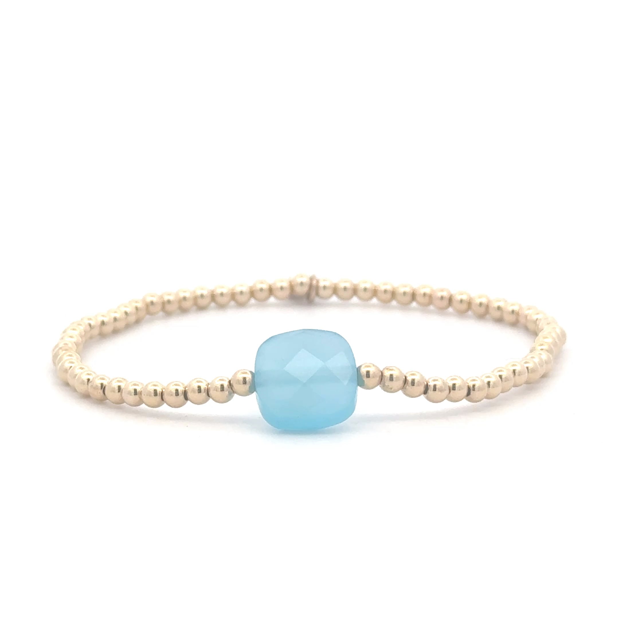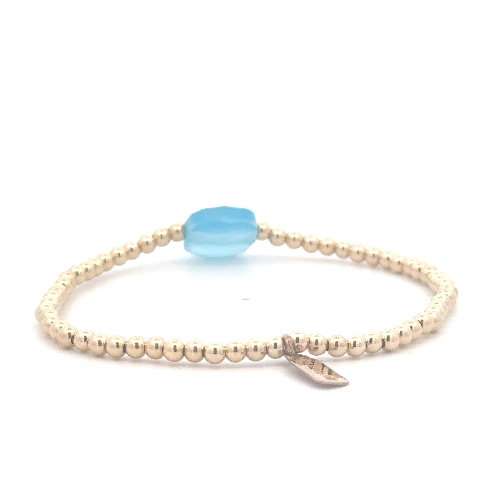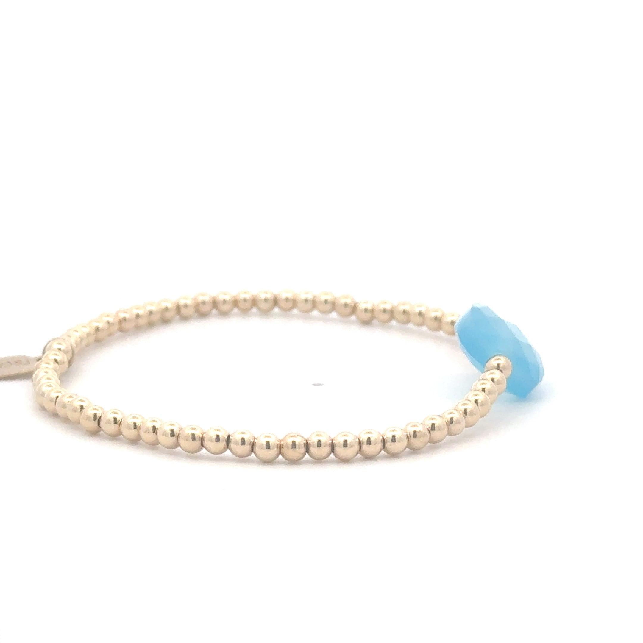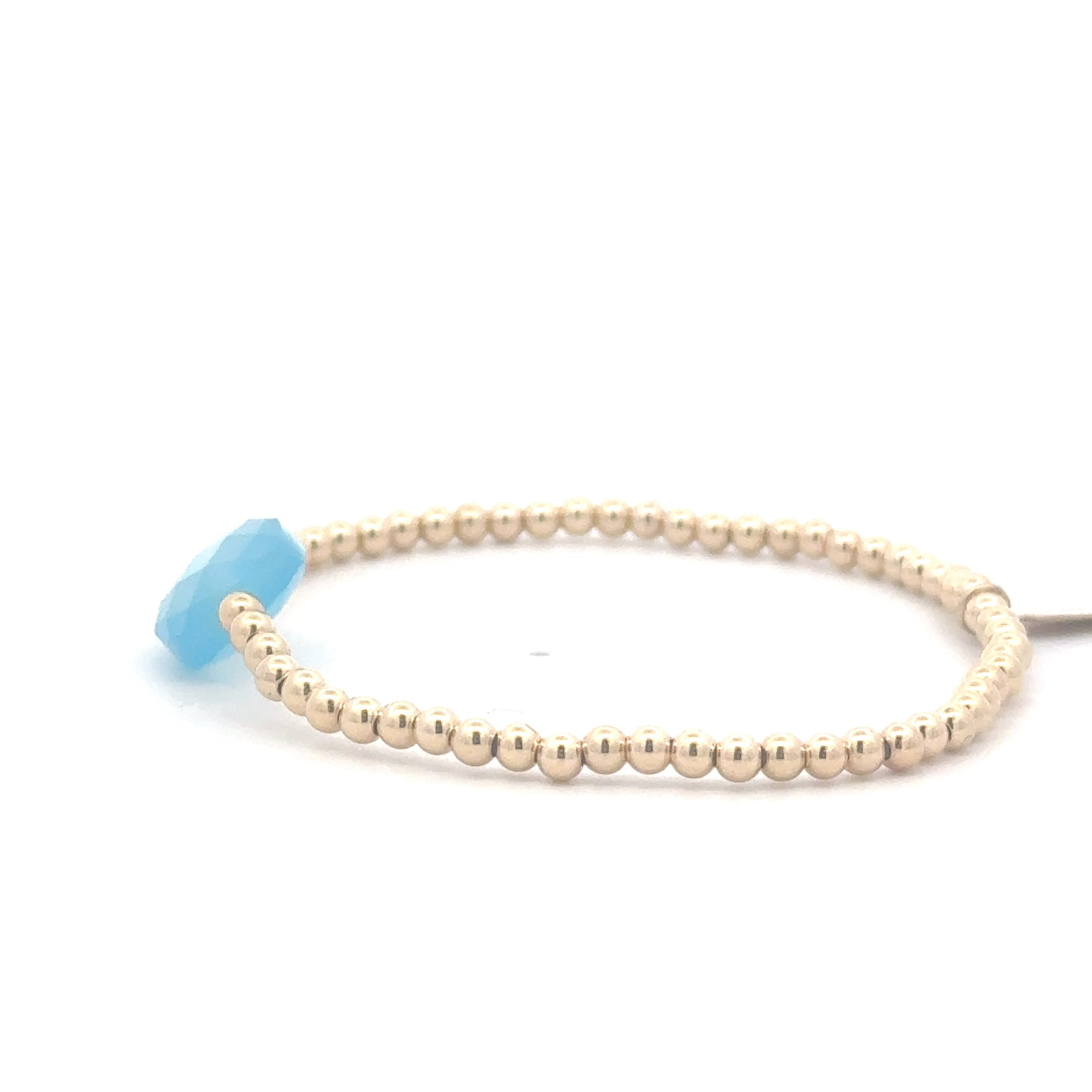 Pulsera elástica con bolitas de color dorado y una piedra de color.