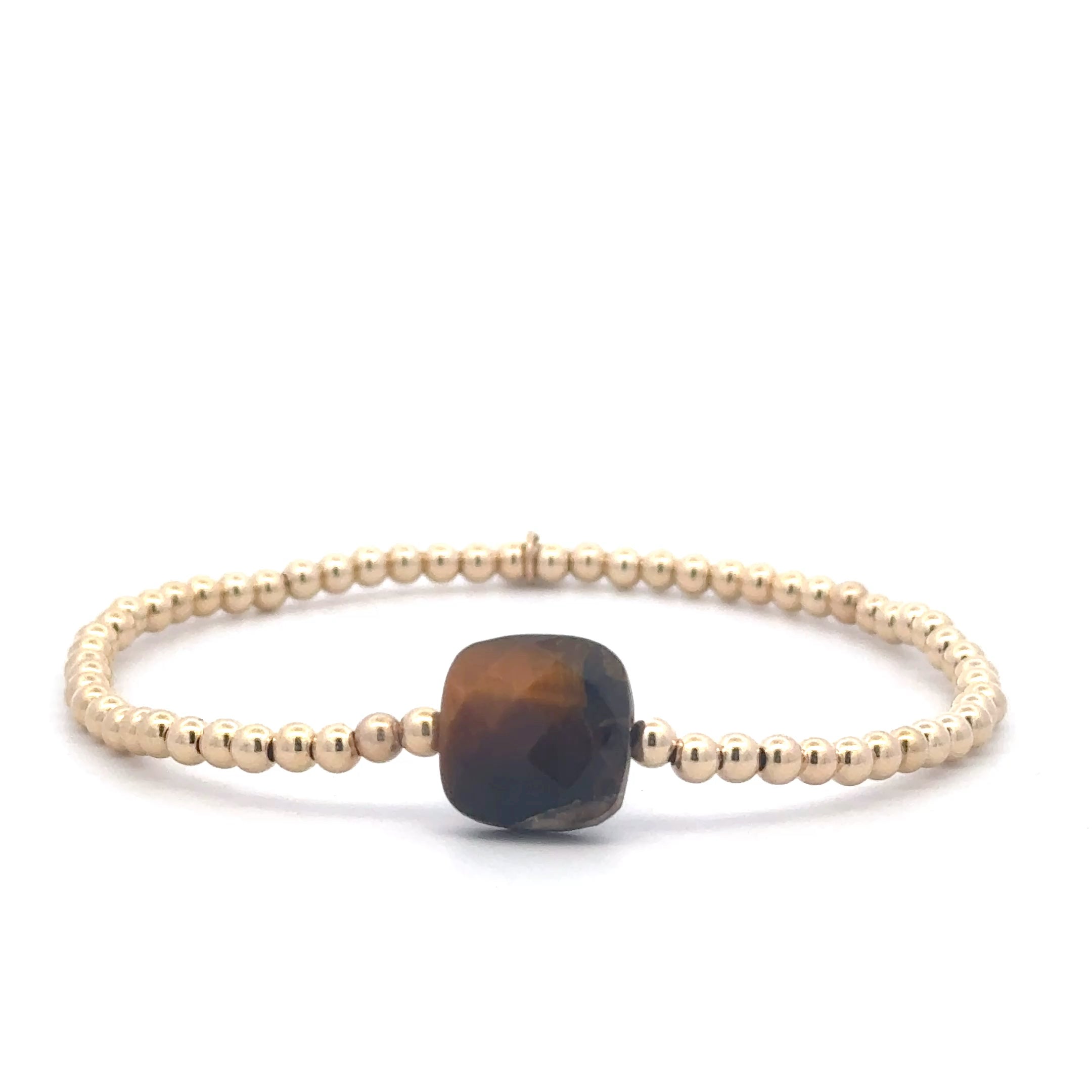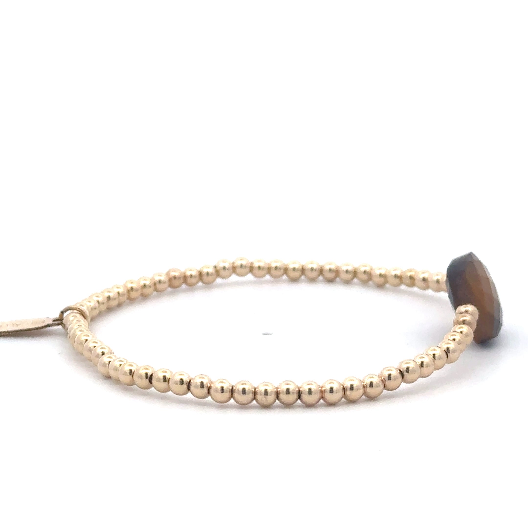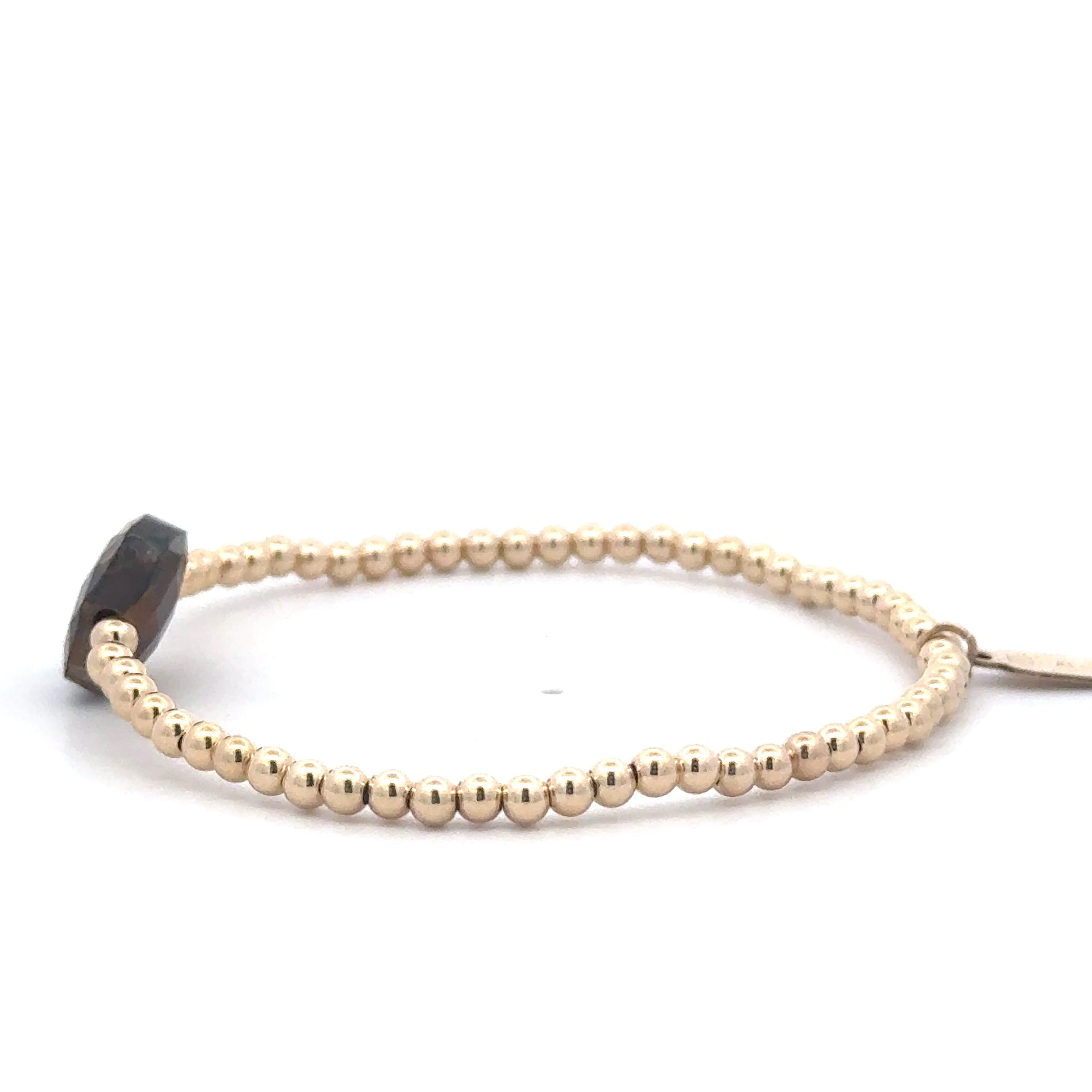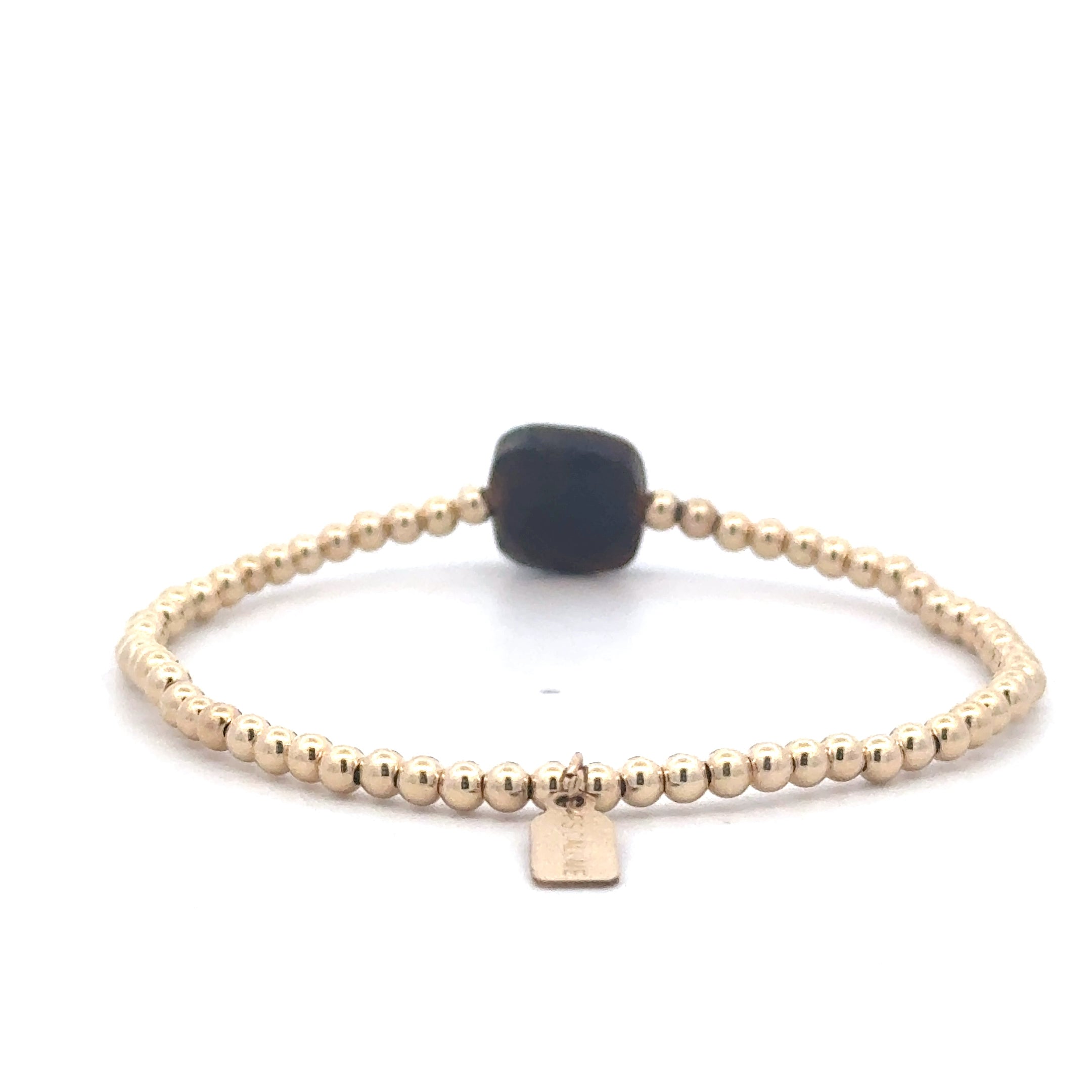 Pulsera elástica con bolitas de color dorado y una piedra de color.