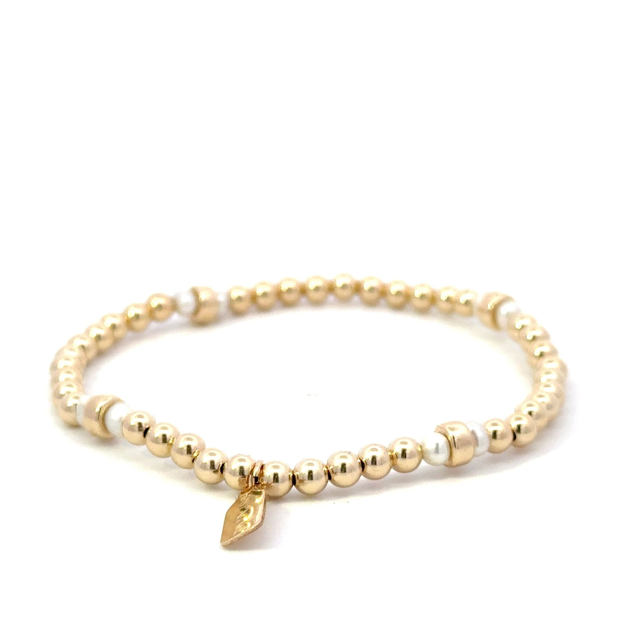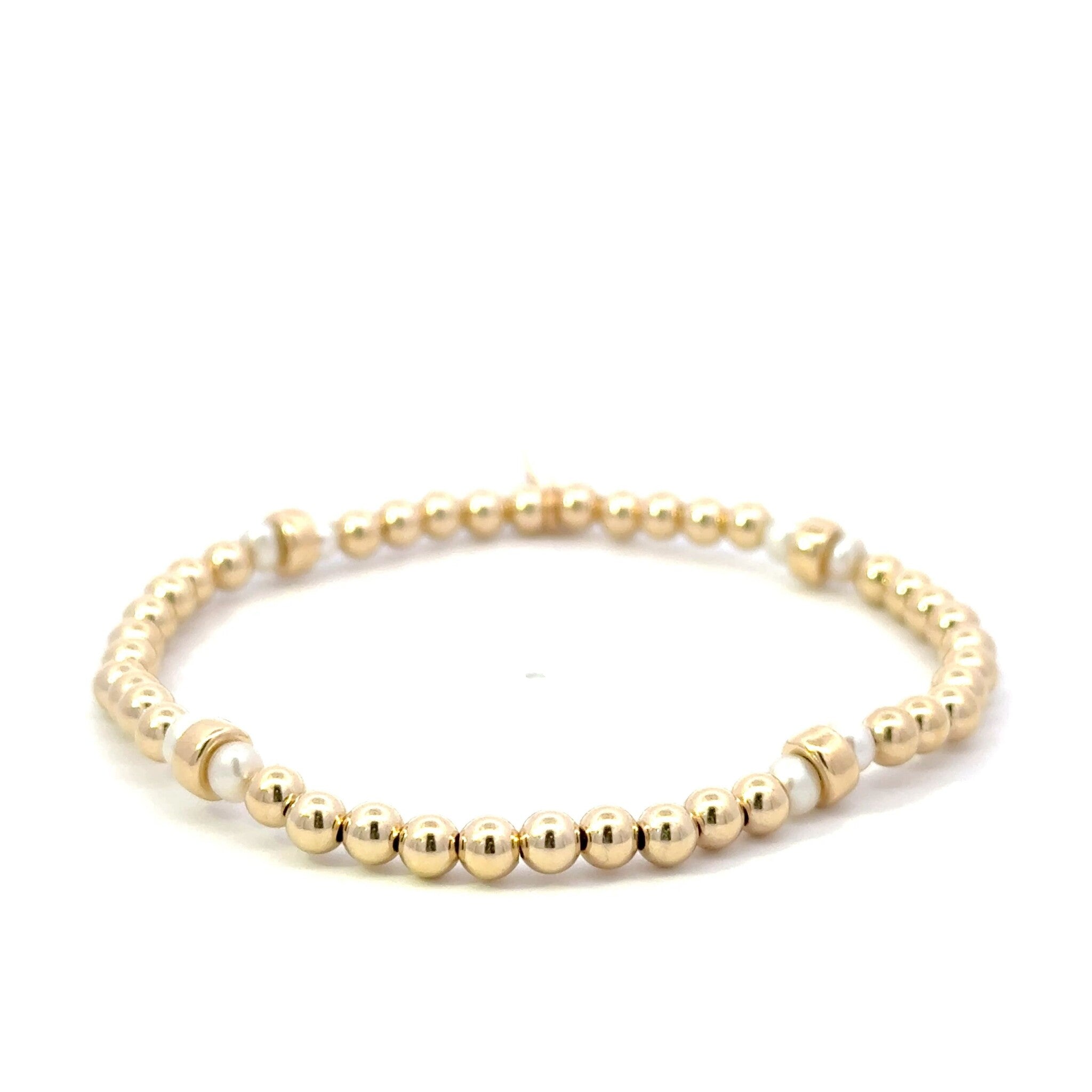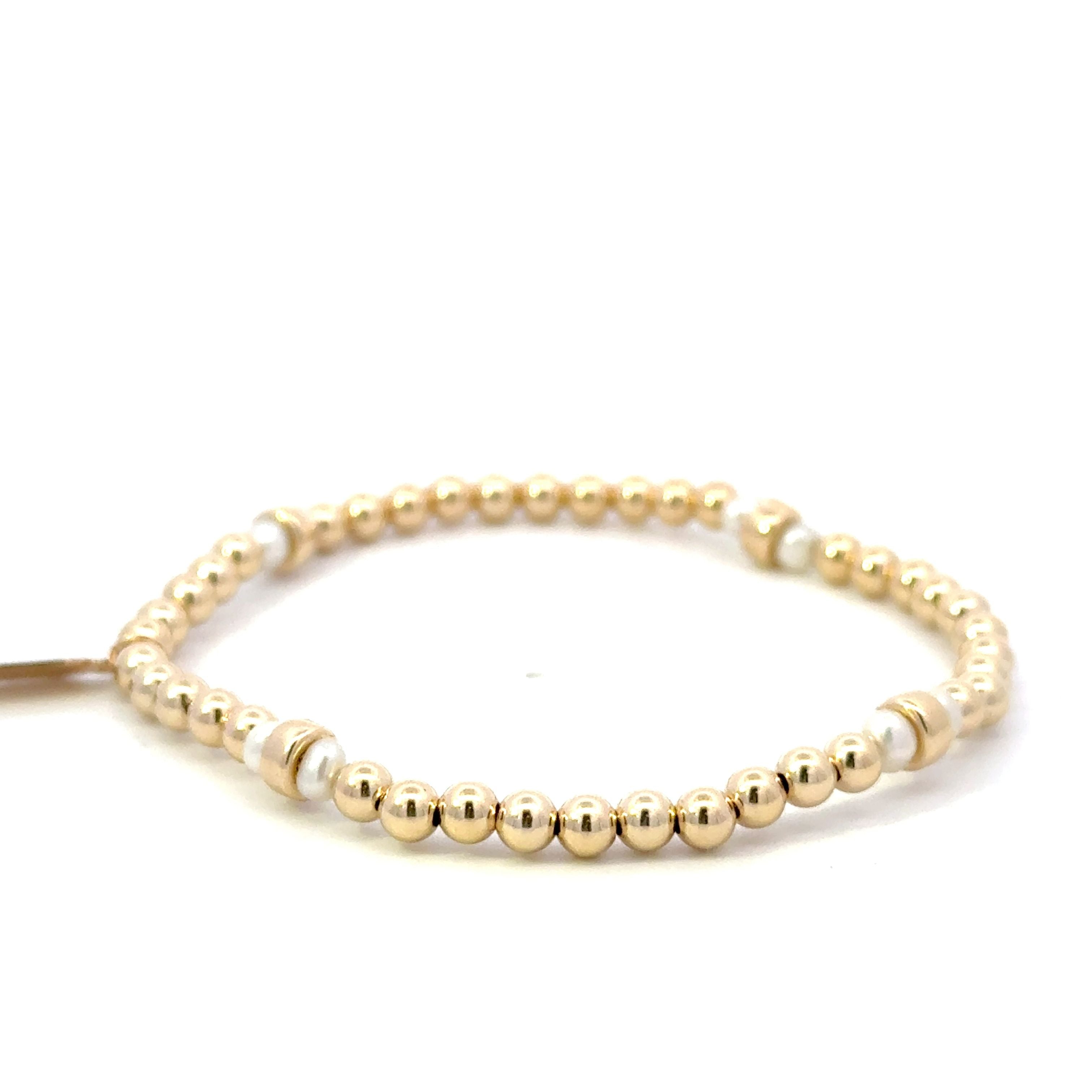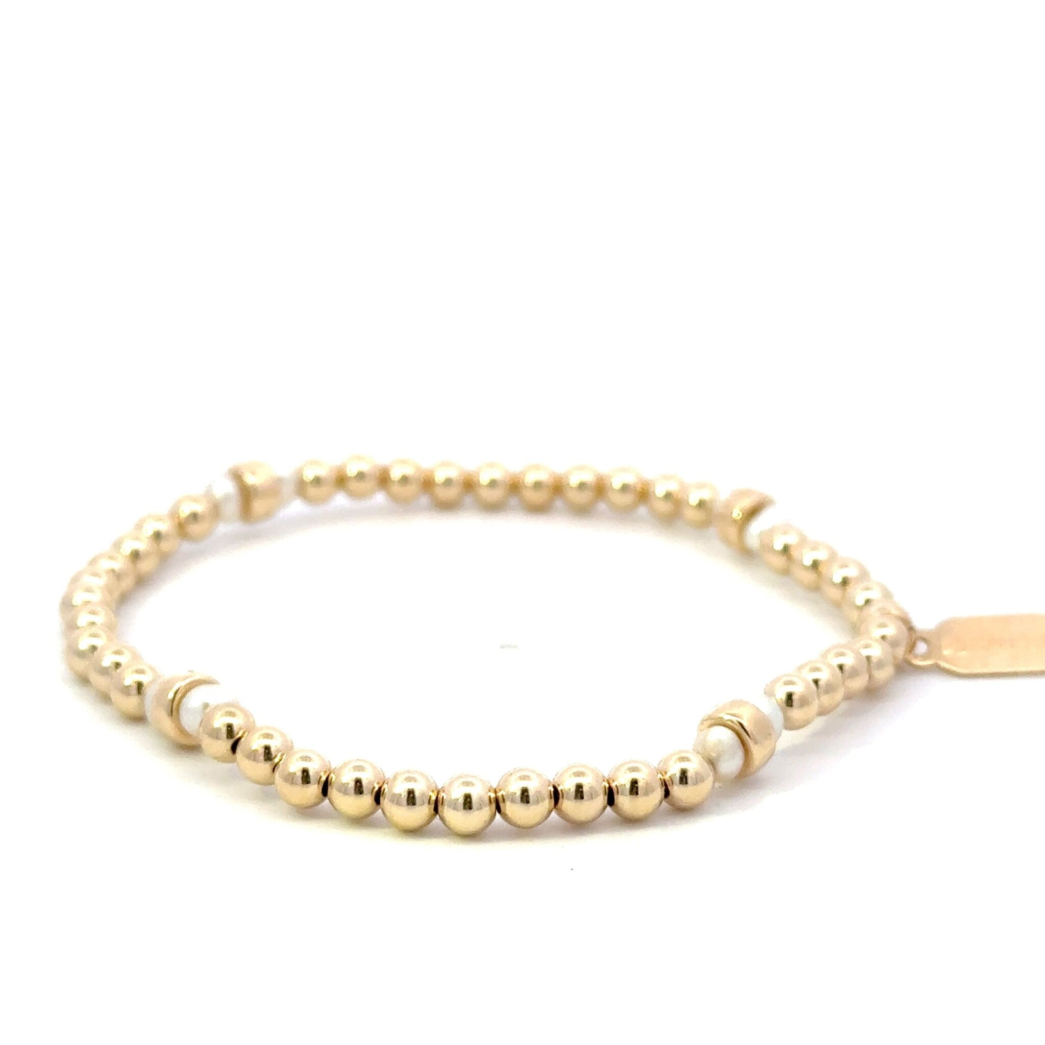 Pulsera elástica con cuentas de color dorado, cuatro espaciadores en forma de disco y una perla al lado de cada uno.