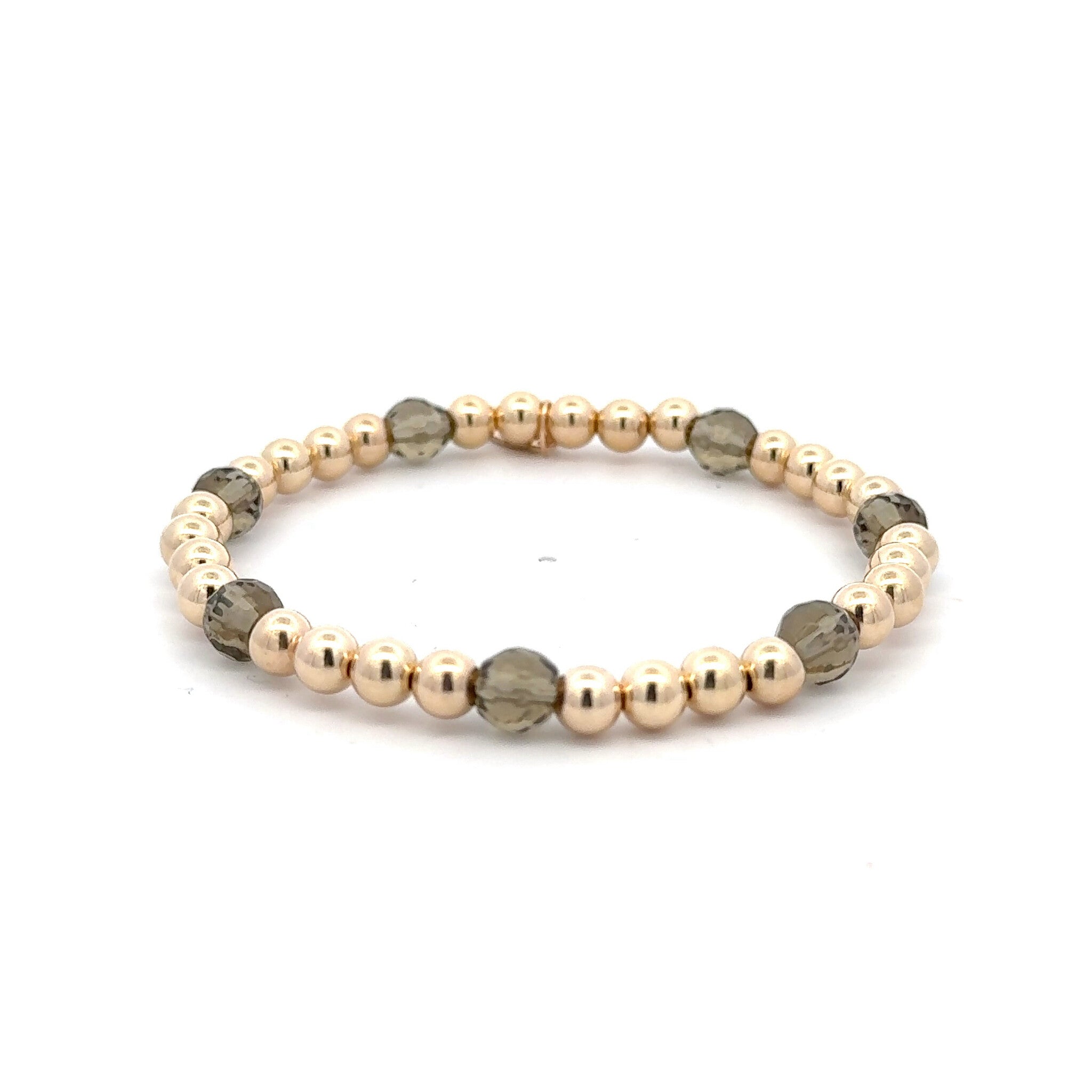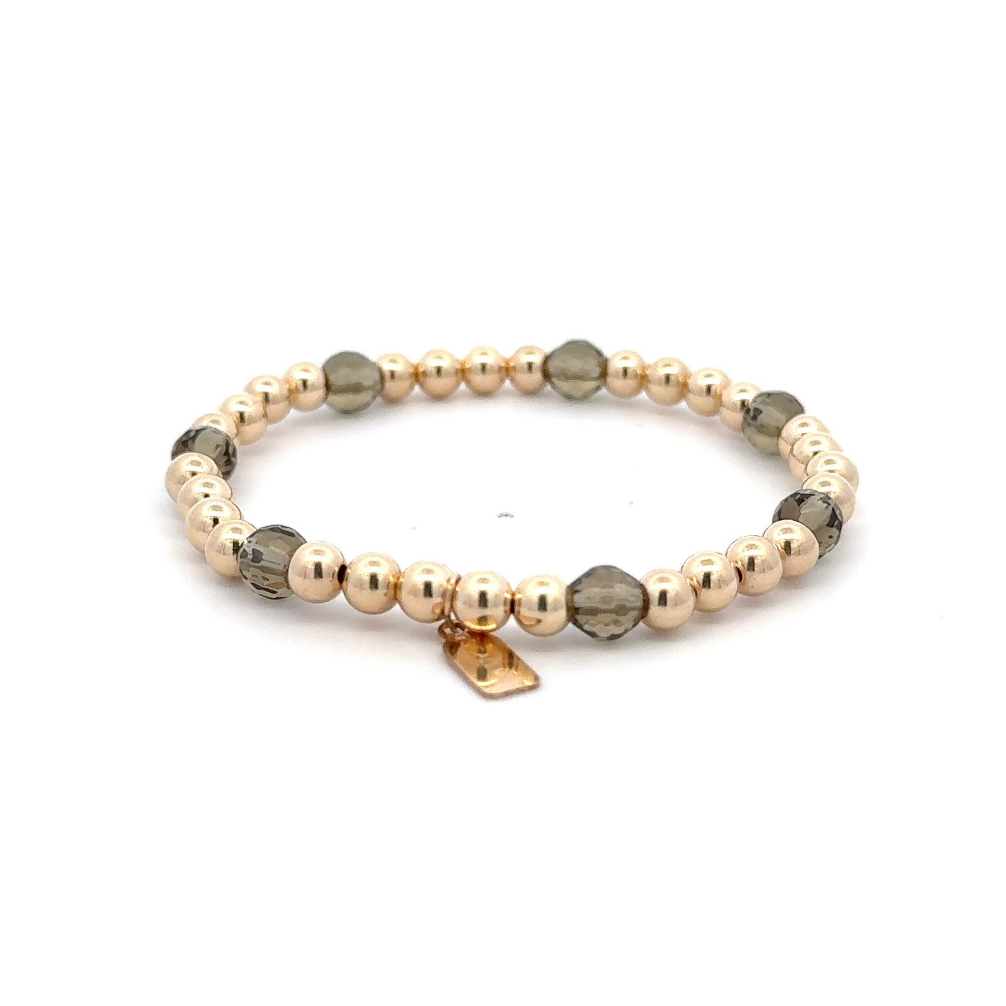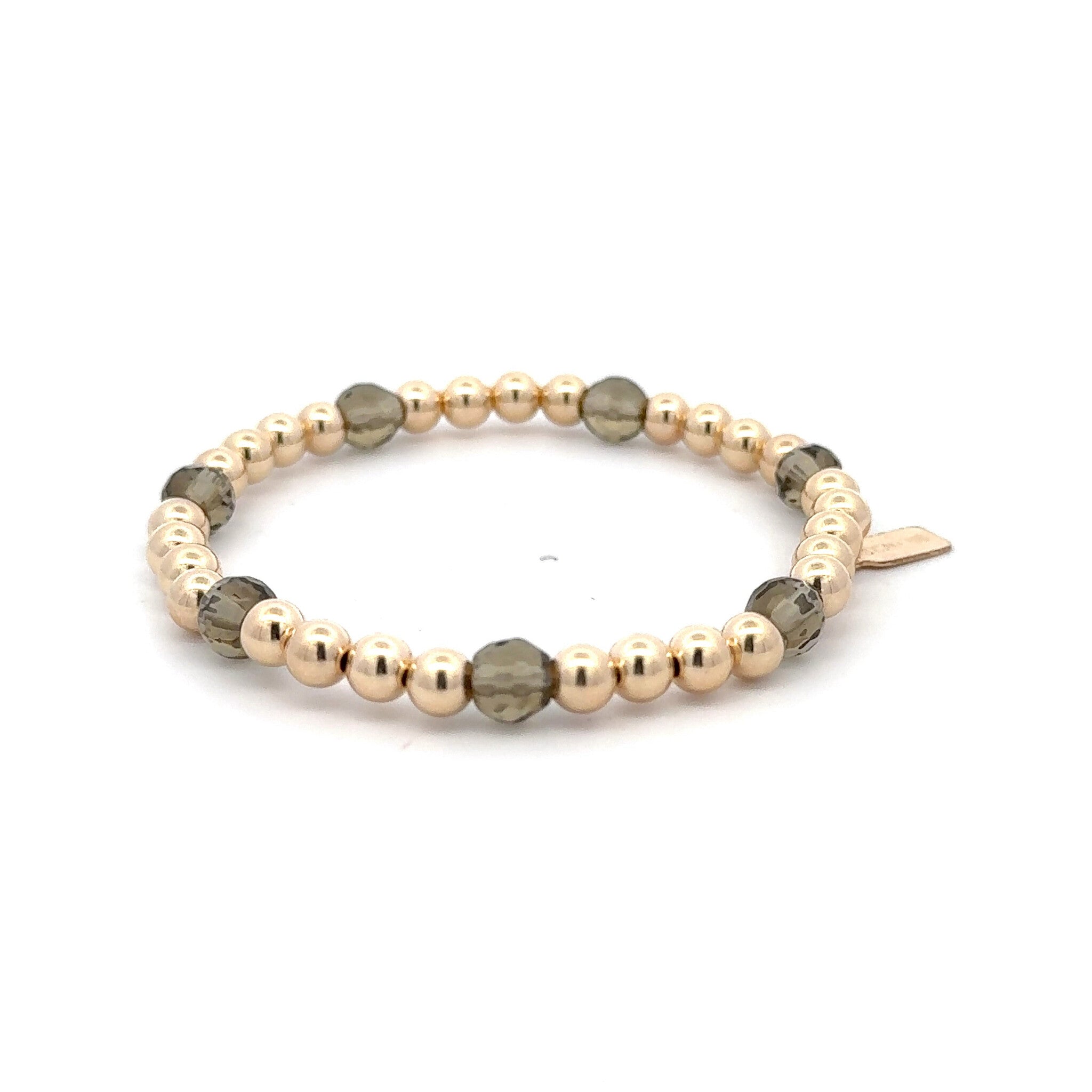 Bracelet élastique avec boules dorées et 7 pierres colorées.