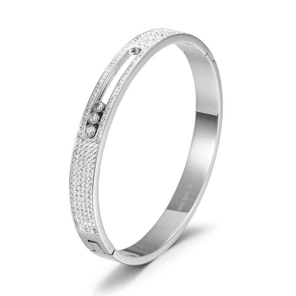 Silver colored bangle with zirconia stones and 3 small stones that give a playful effect by sliding back and forth. This bracelet can be opened with a click system on the side.