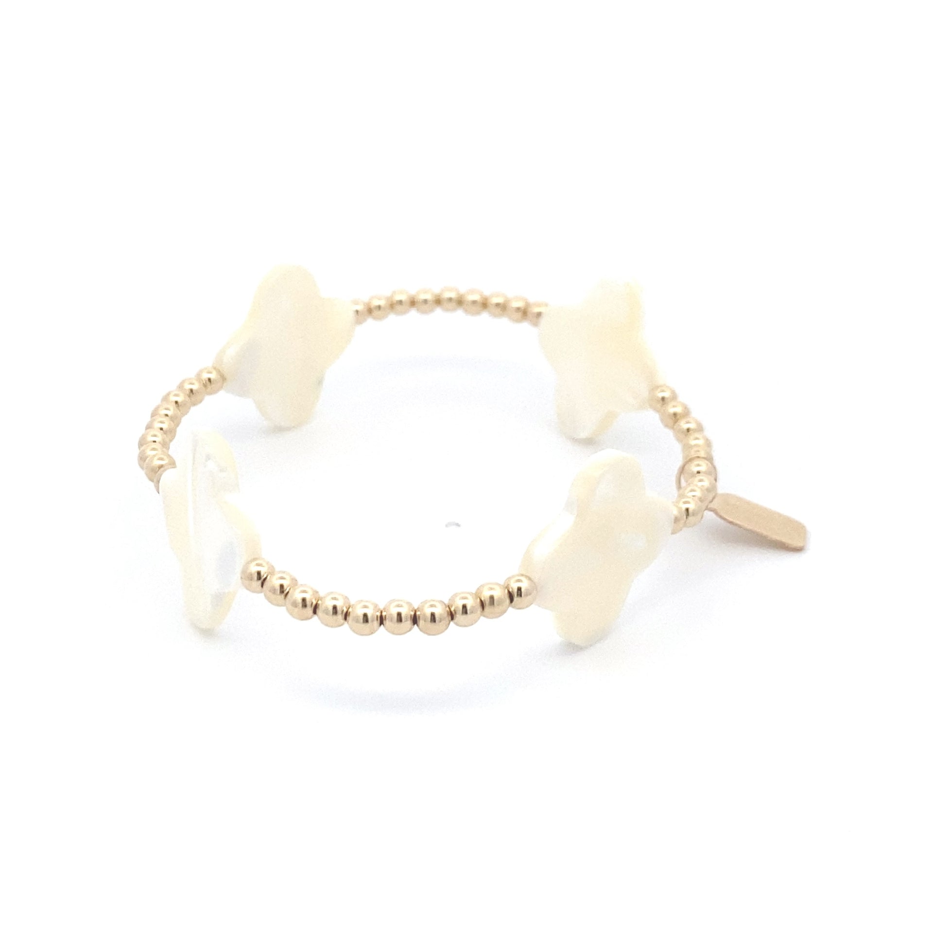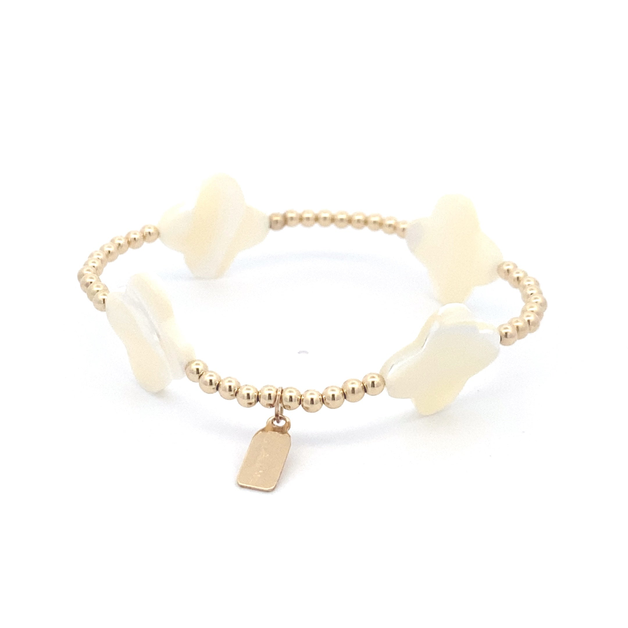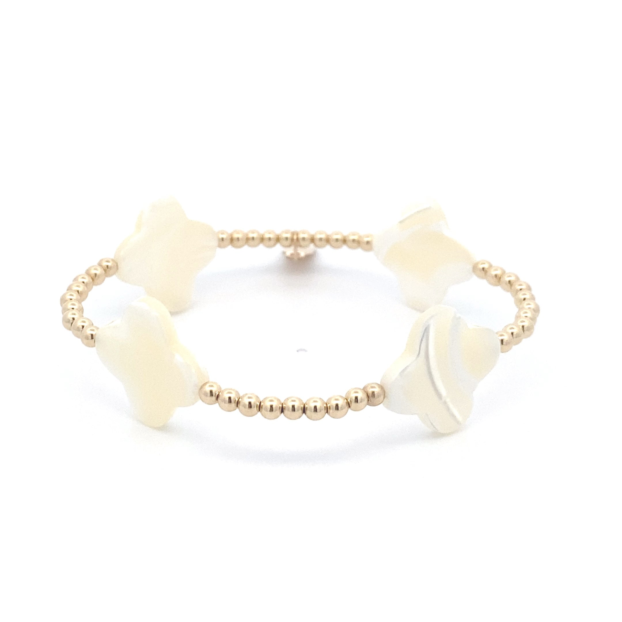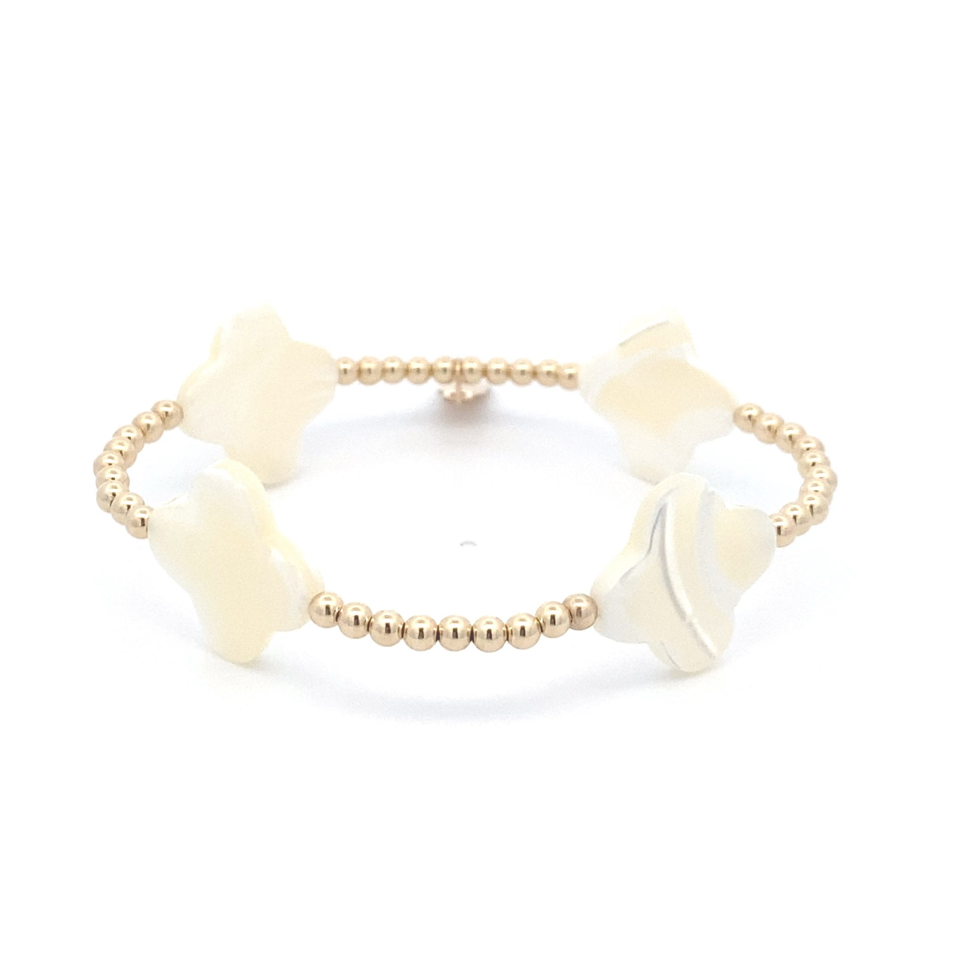 Bracelet élastique avec perles dorées et quatre trèfles blancs.