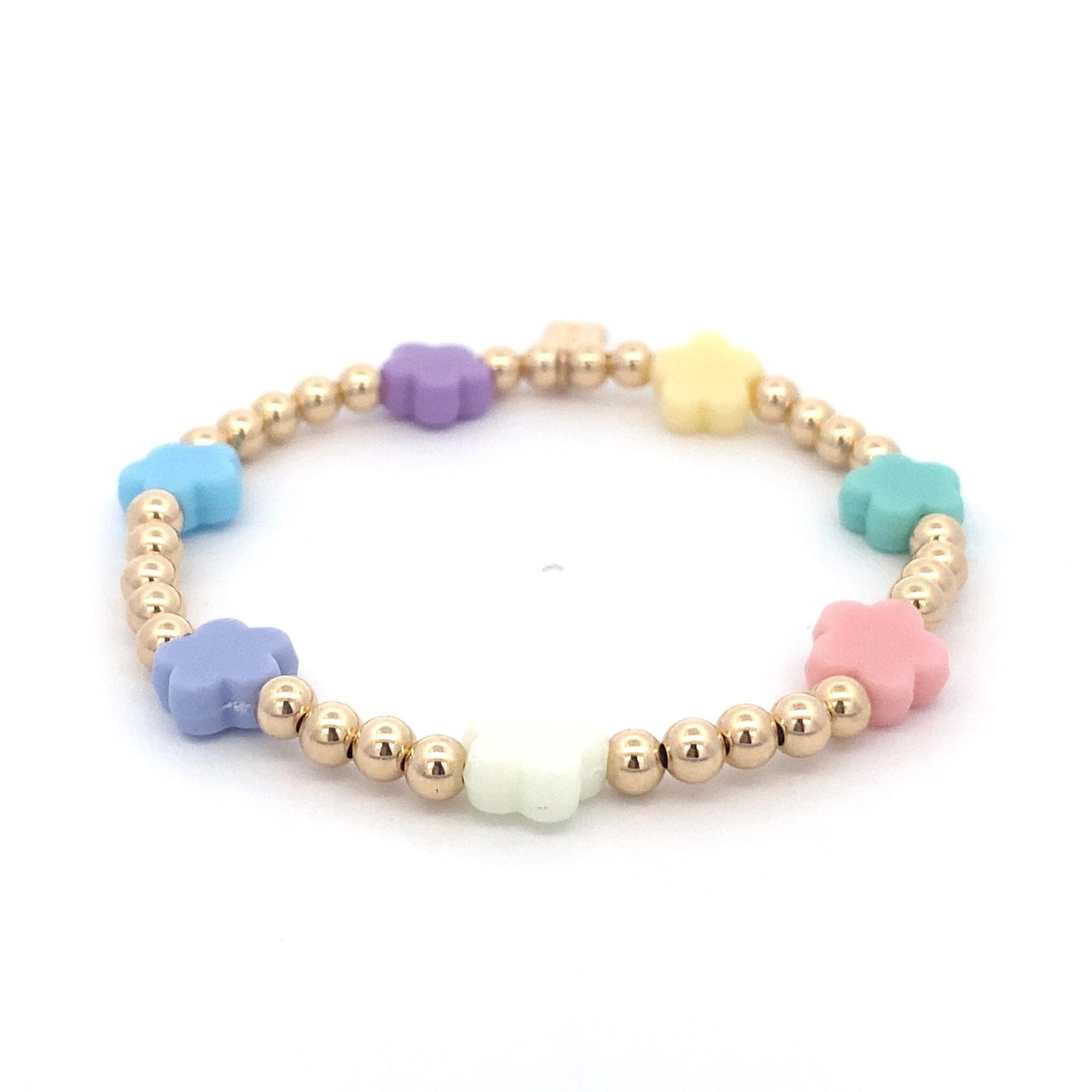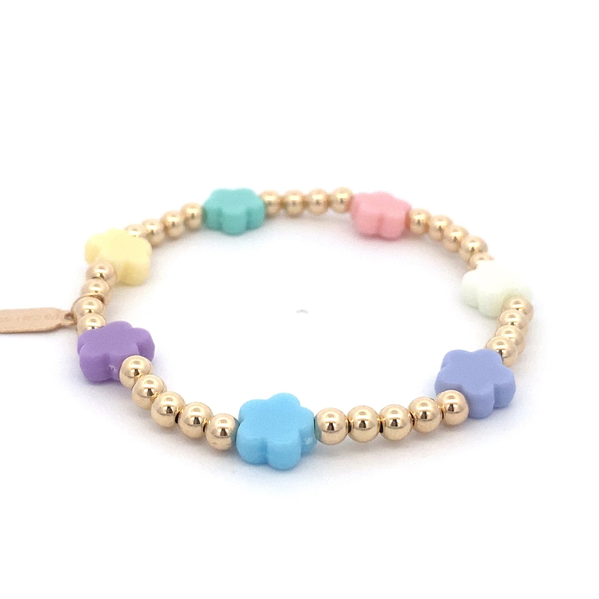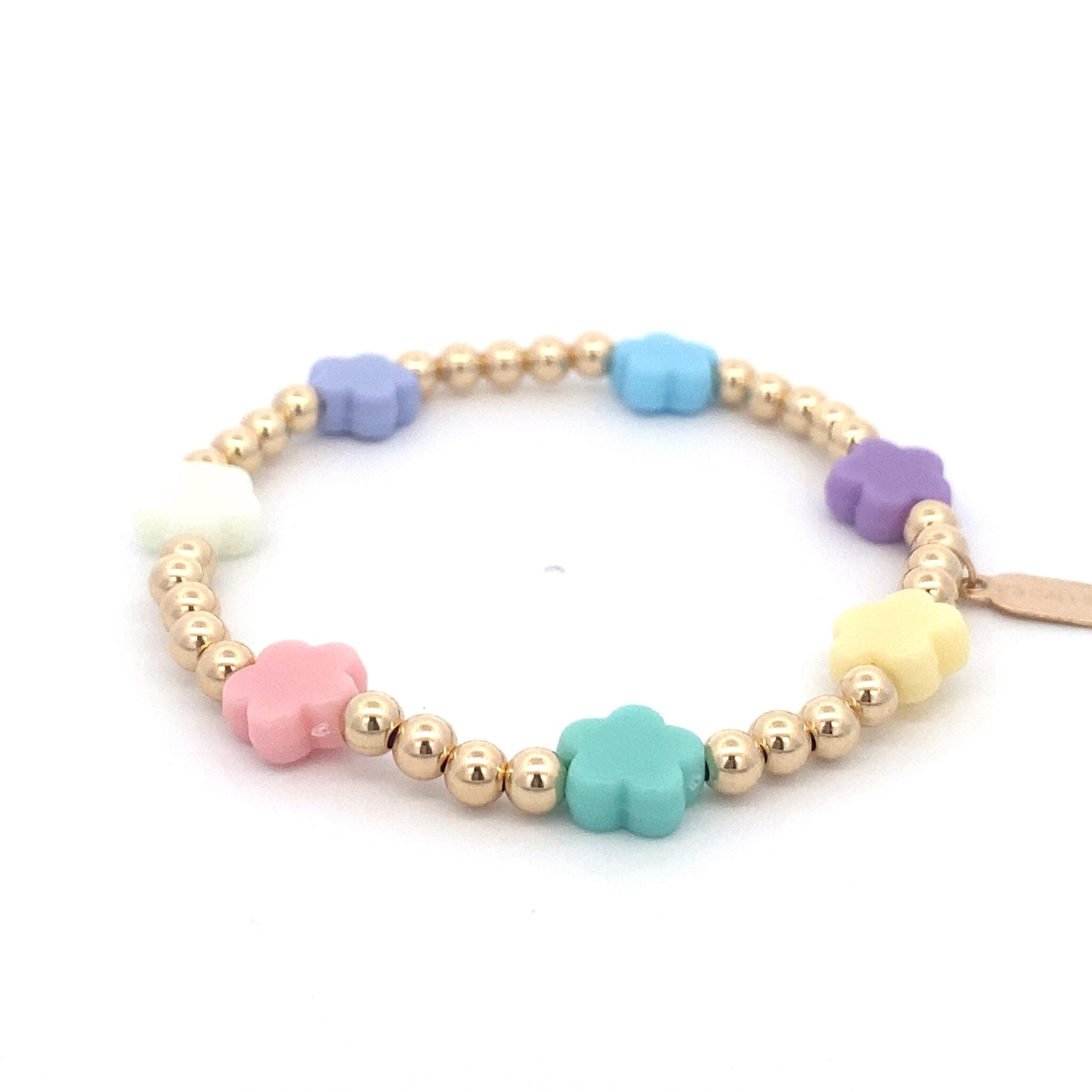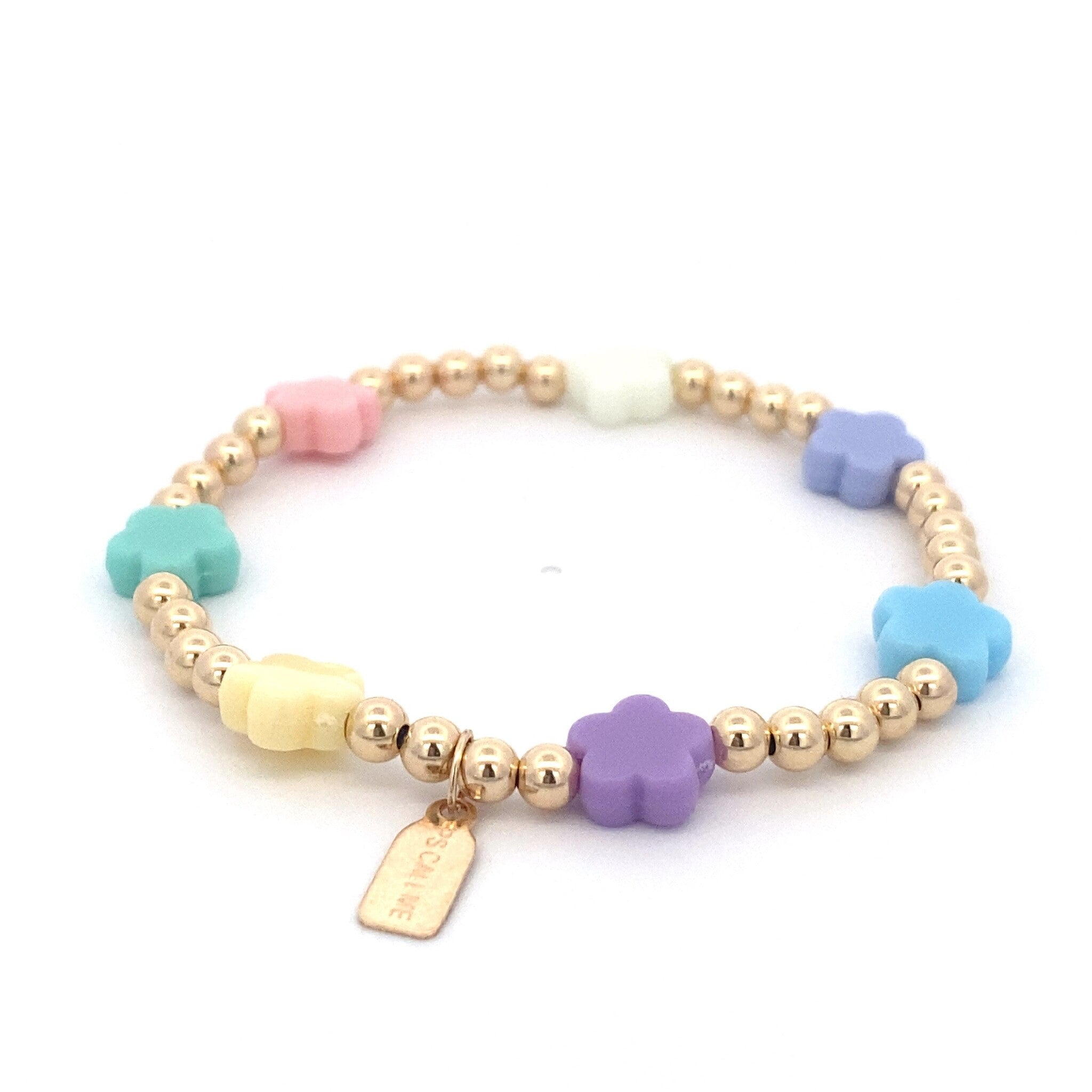 Bracelet élastique avec boules dorées et 7 breloques fleurs colorées.