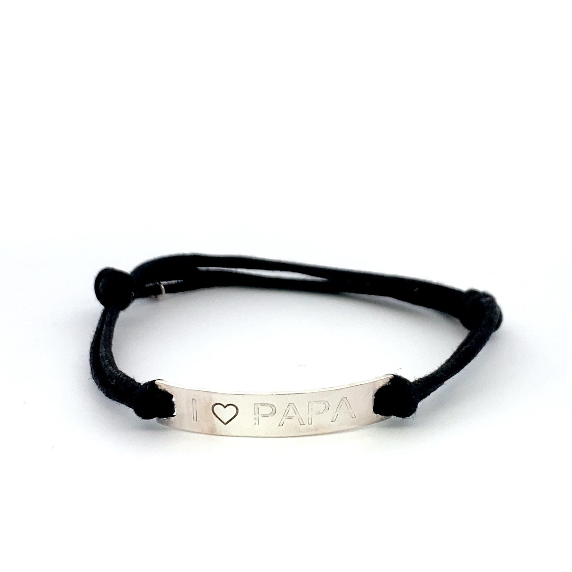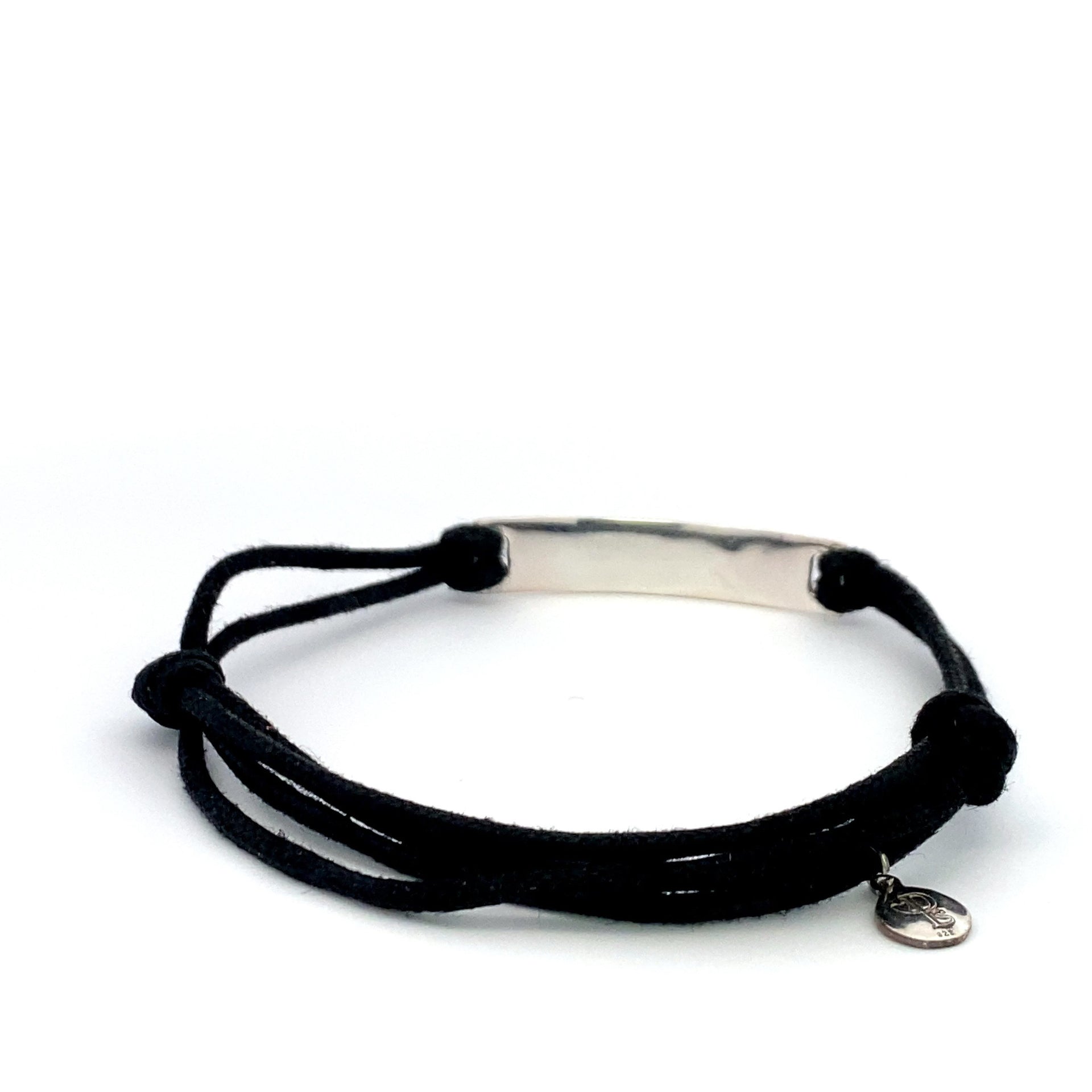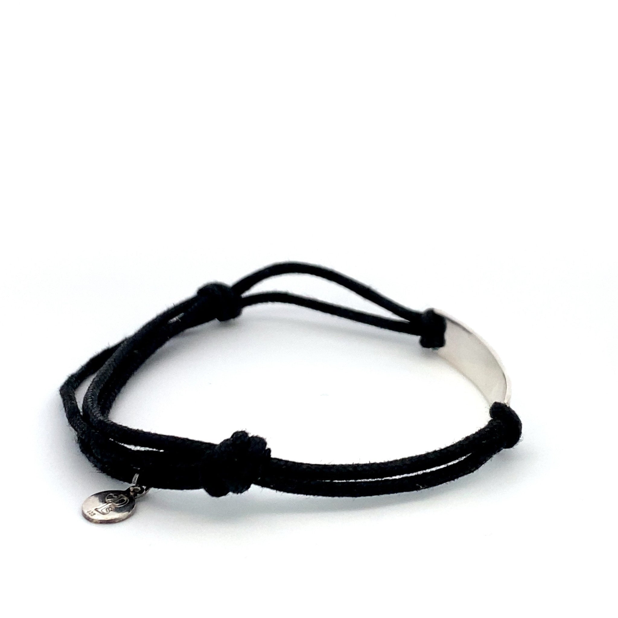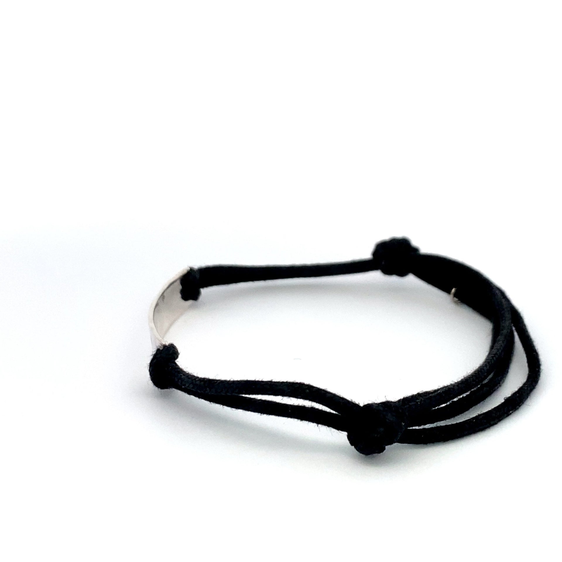 Bracelet ajustable en cordon de satin avec breloque argentée et texte.