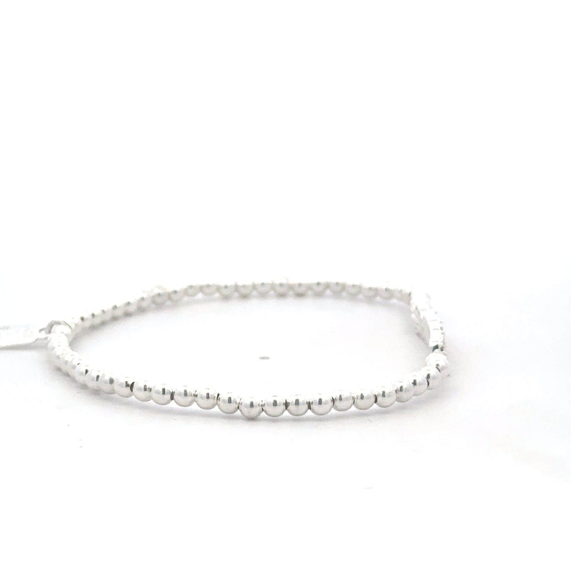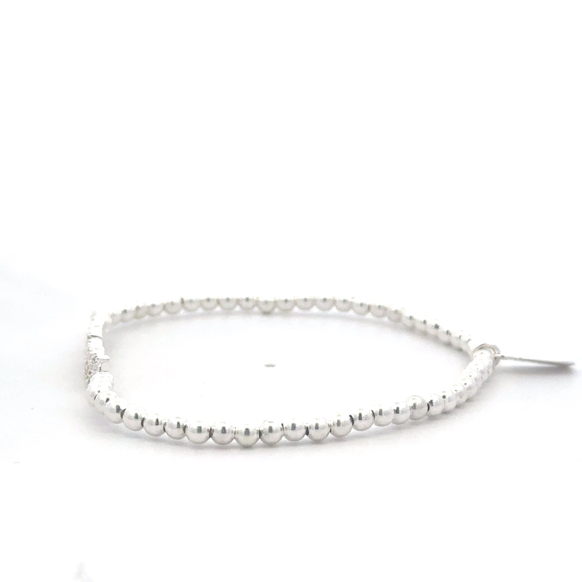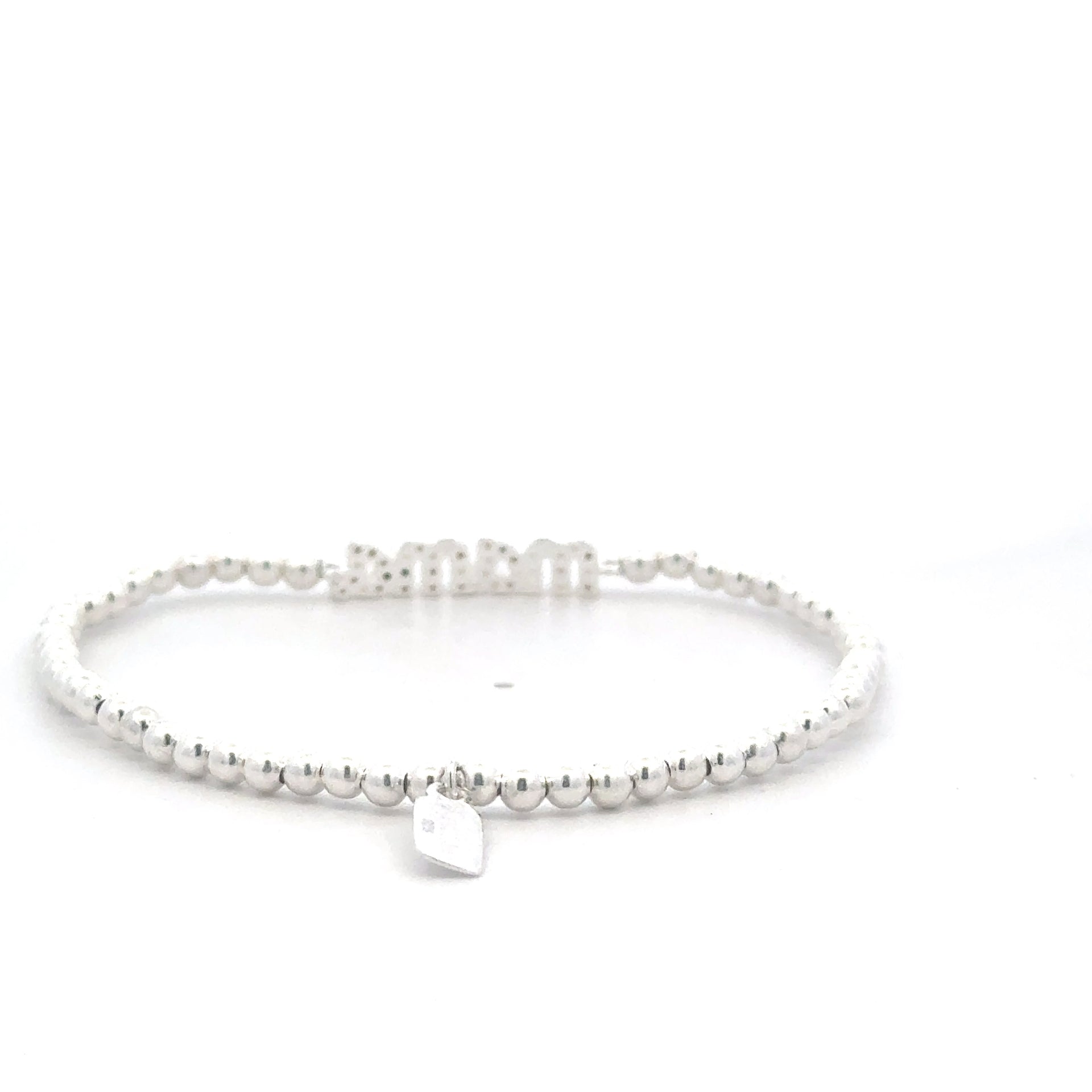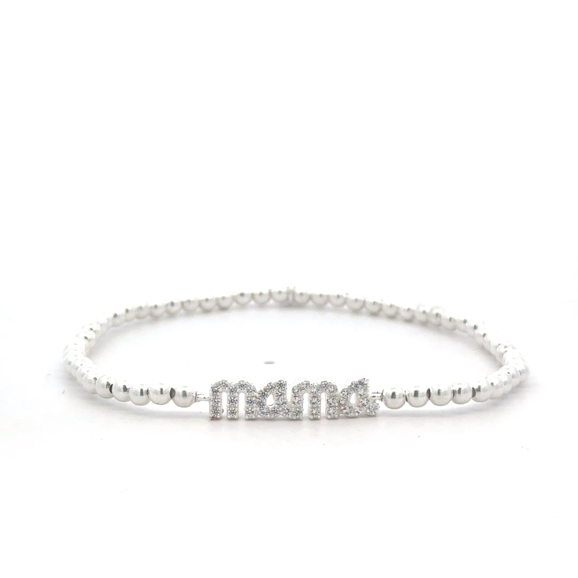 Bracelet élastique avec boules en argent et inscription « maman » en strass.
