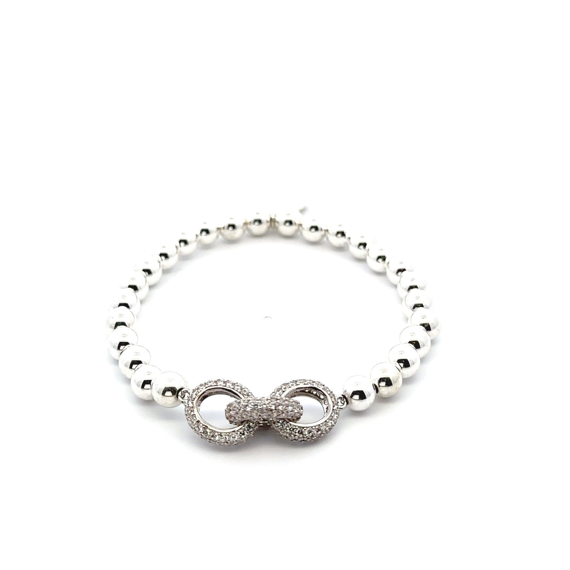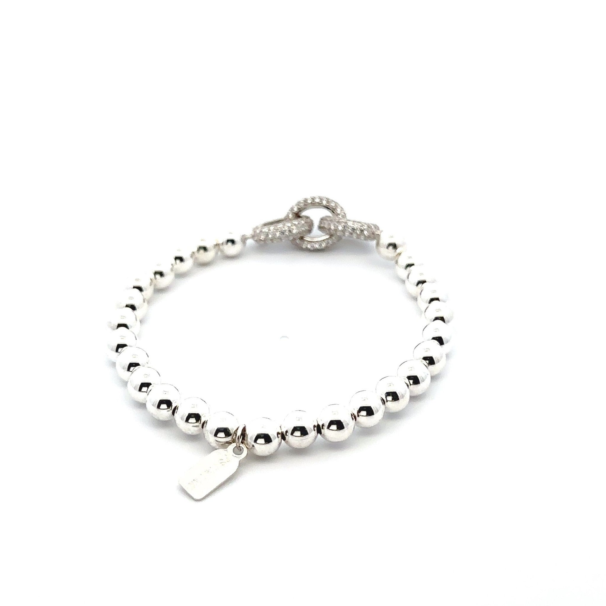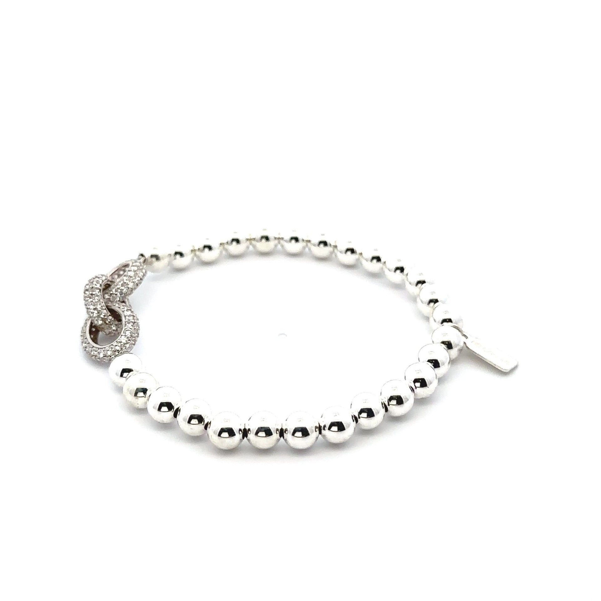 Bracelet élastique avec boules en argent et breloque en forme de maillon ornée de strass.