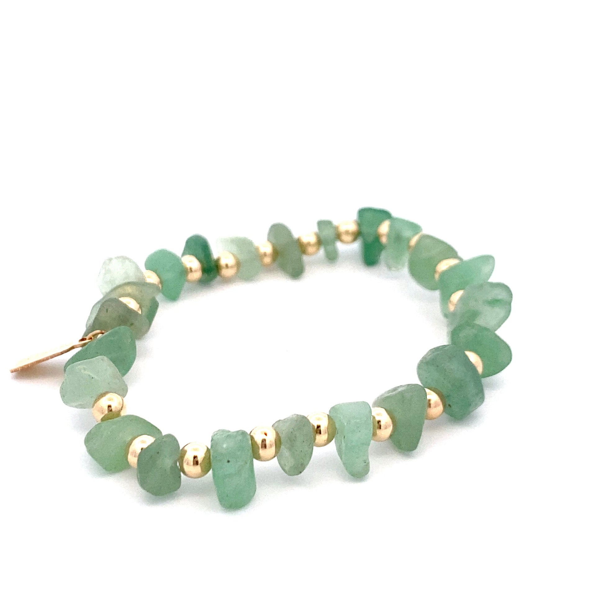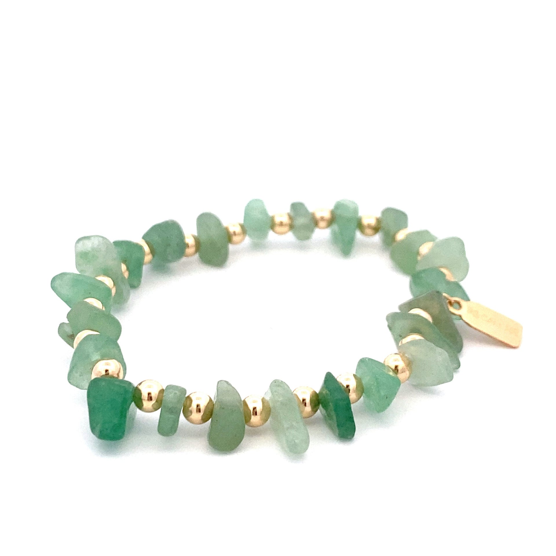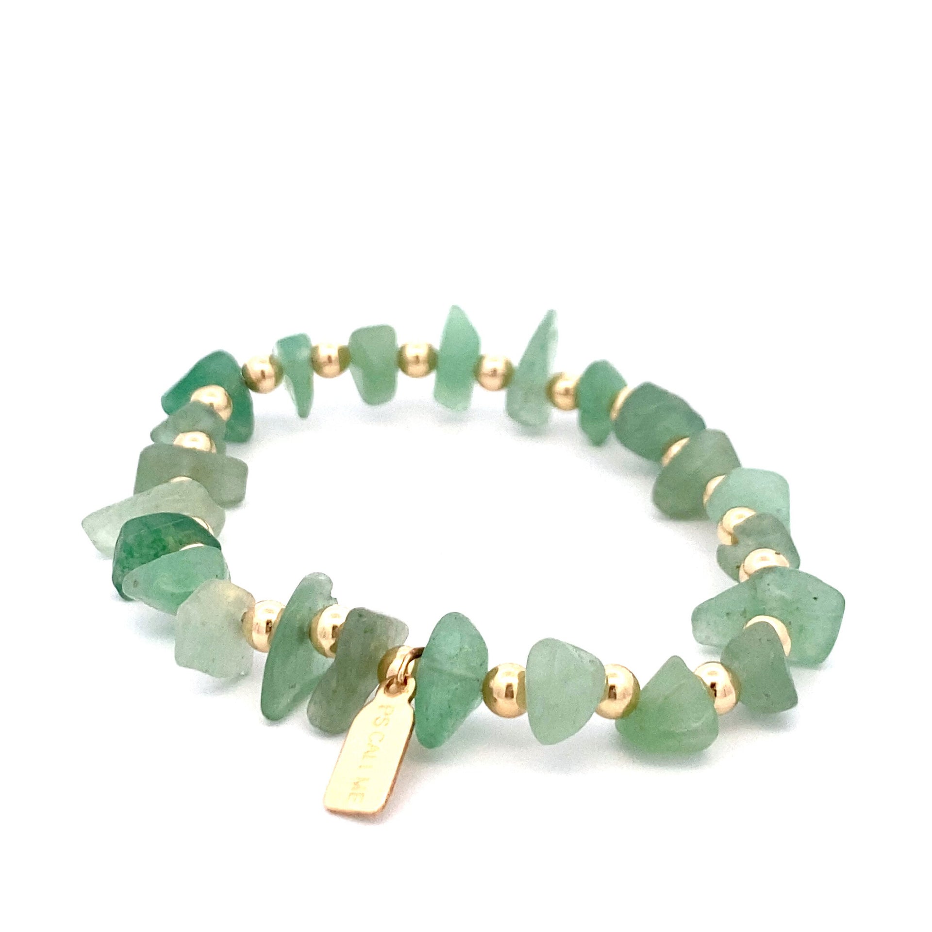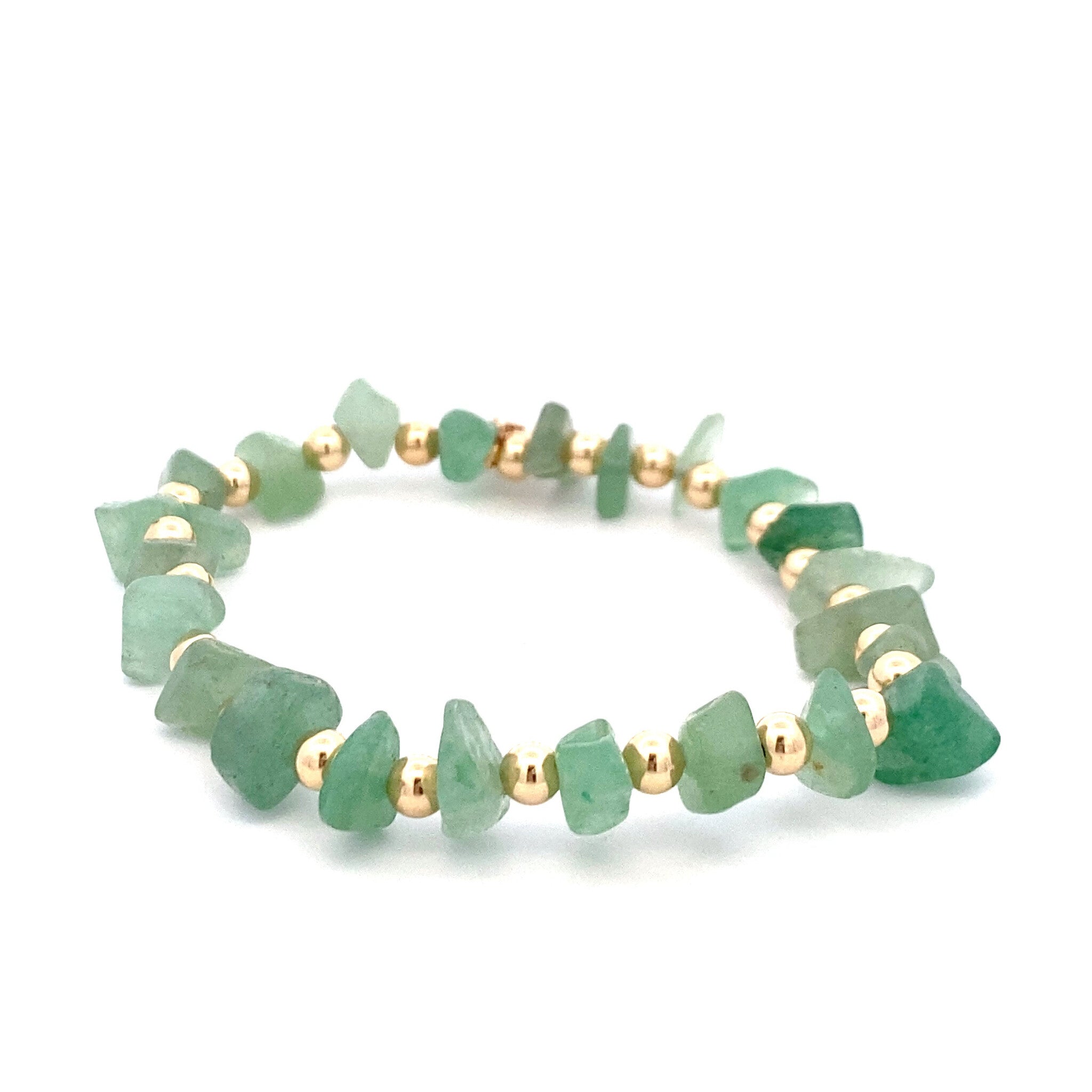 Bracelet élastique avec boules dorées et pierres vertes colorées.