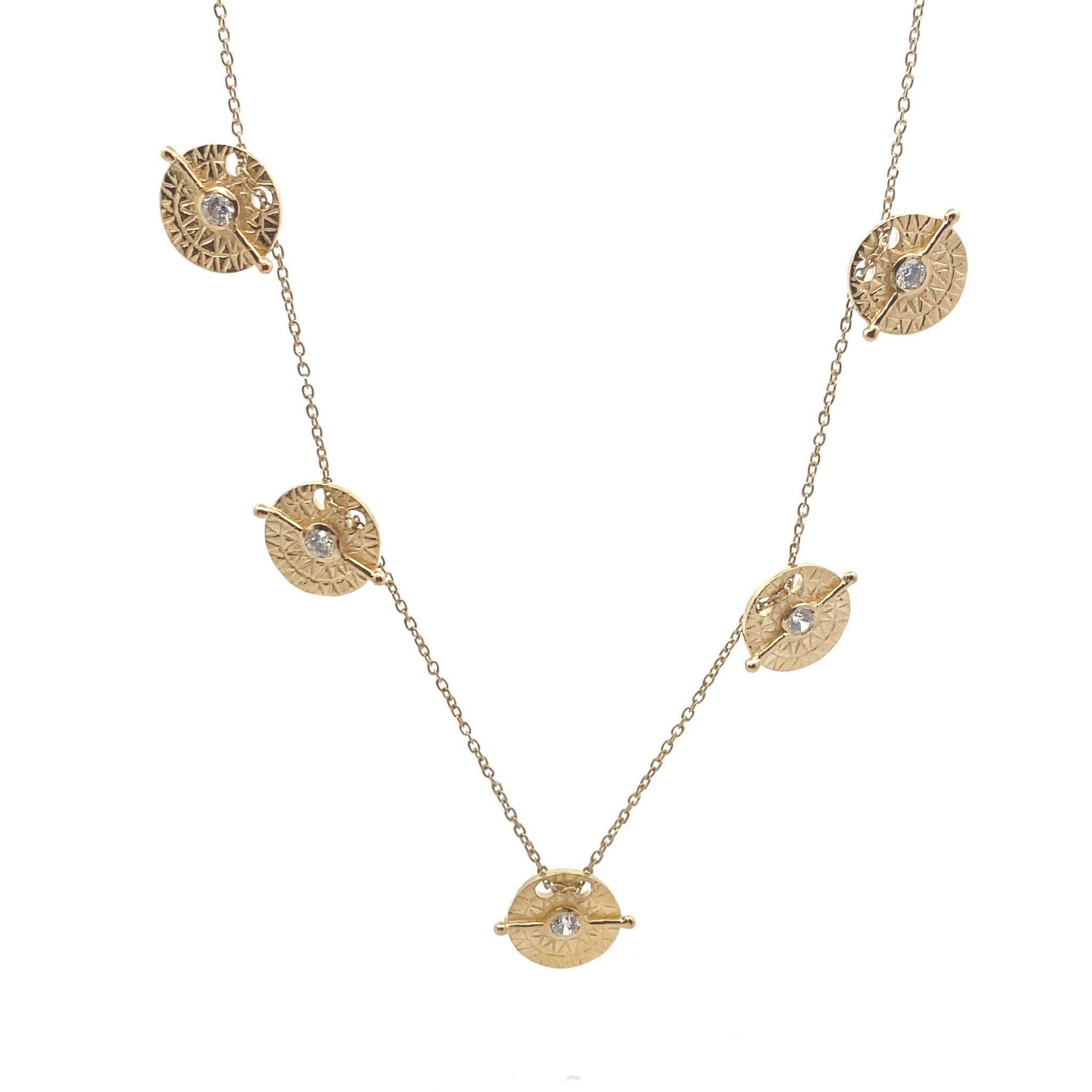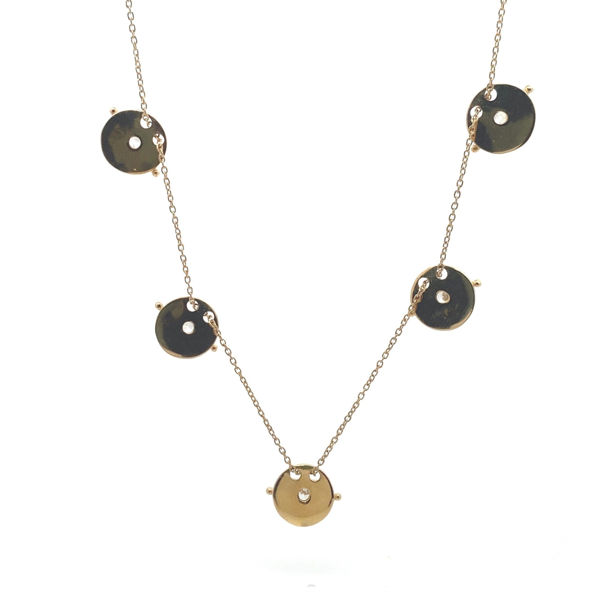 Collier doré composé de 5 tours et d'une pierre colorée. Longueur : 42 cm (ajustable à 47 cm). Couleur : zircone blanche. Matériau des breloques : plaqué or.