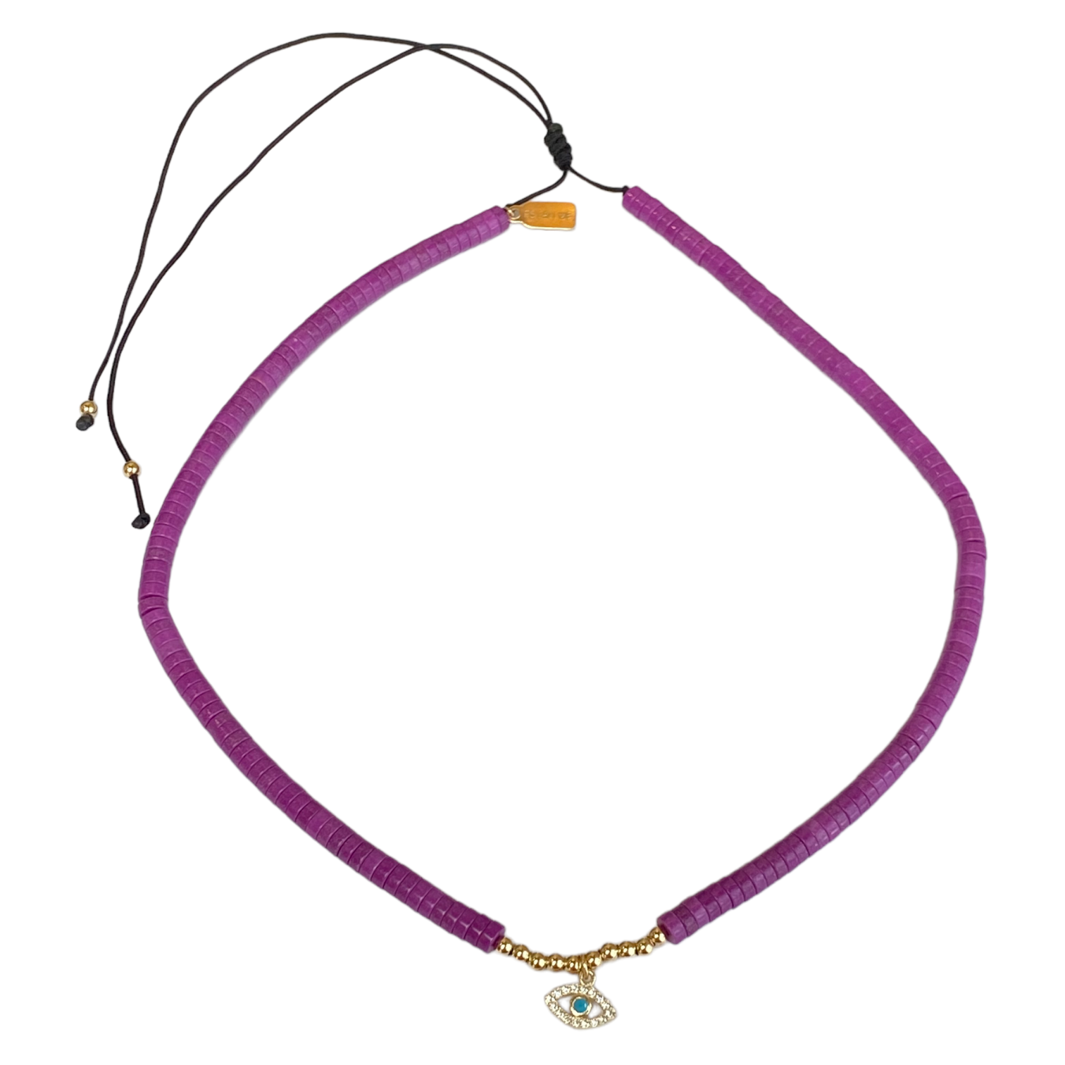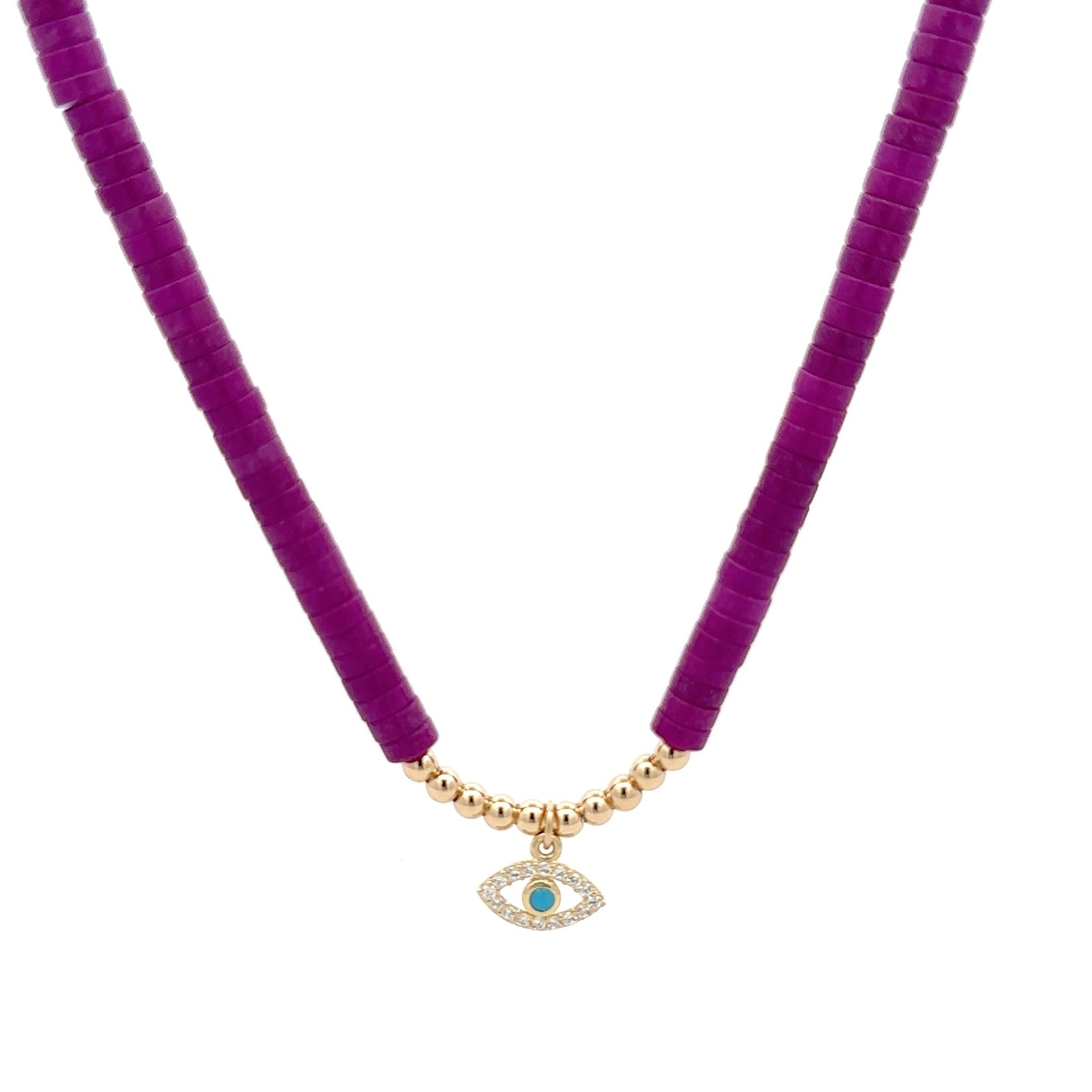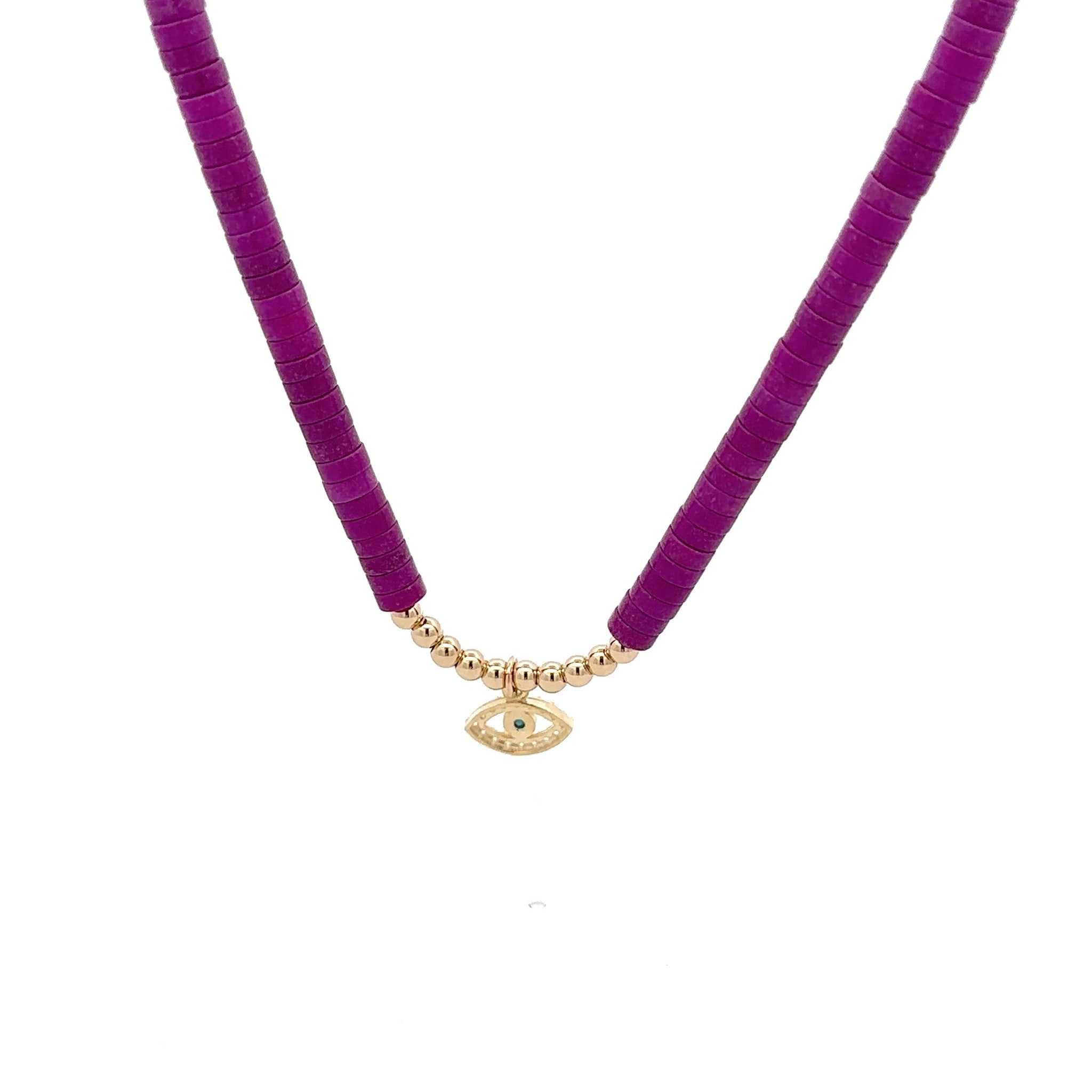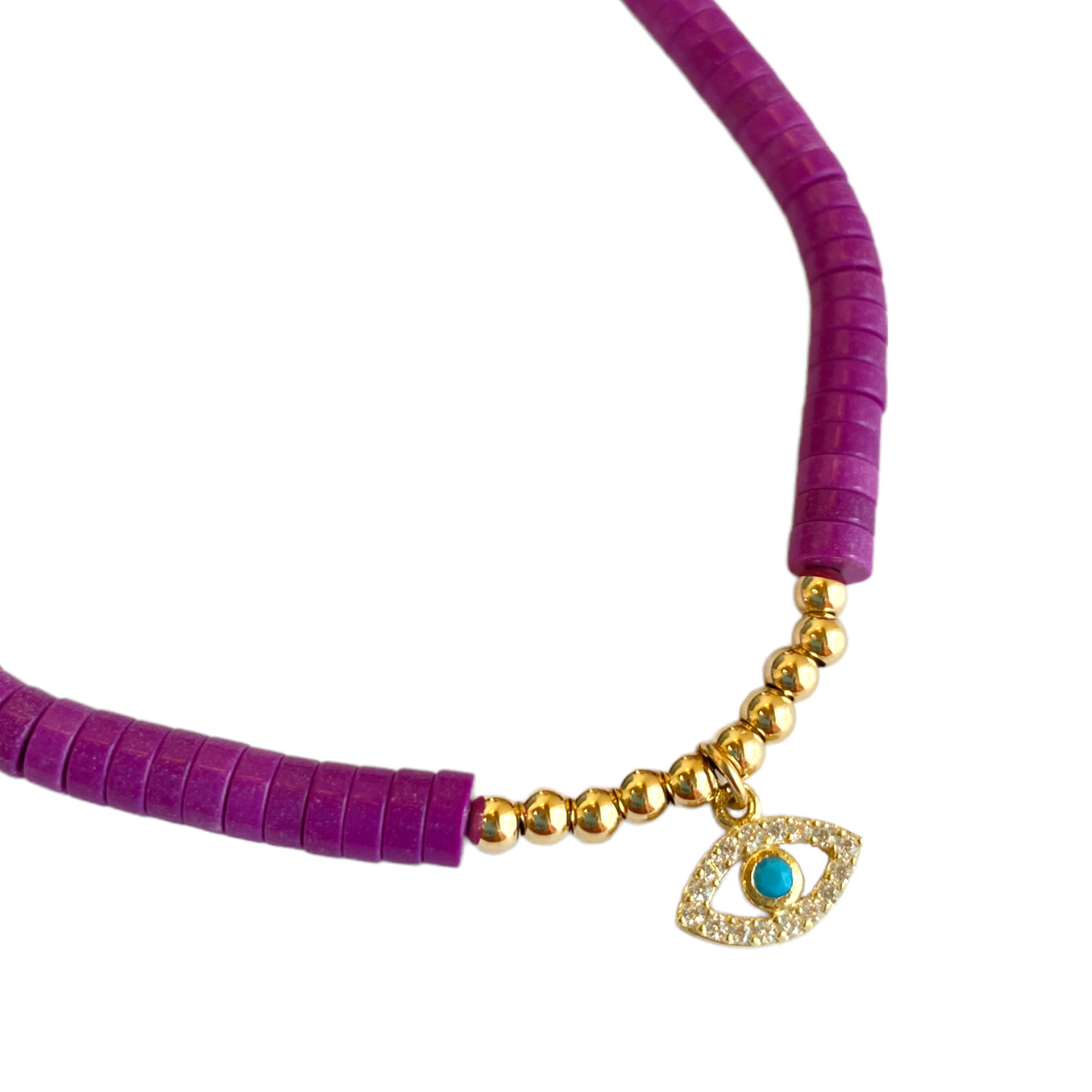 Collier avec pierres colorées, boules dorées et une petite breloque en forme d'œil porte-bonheur.