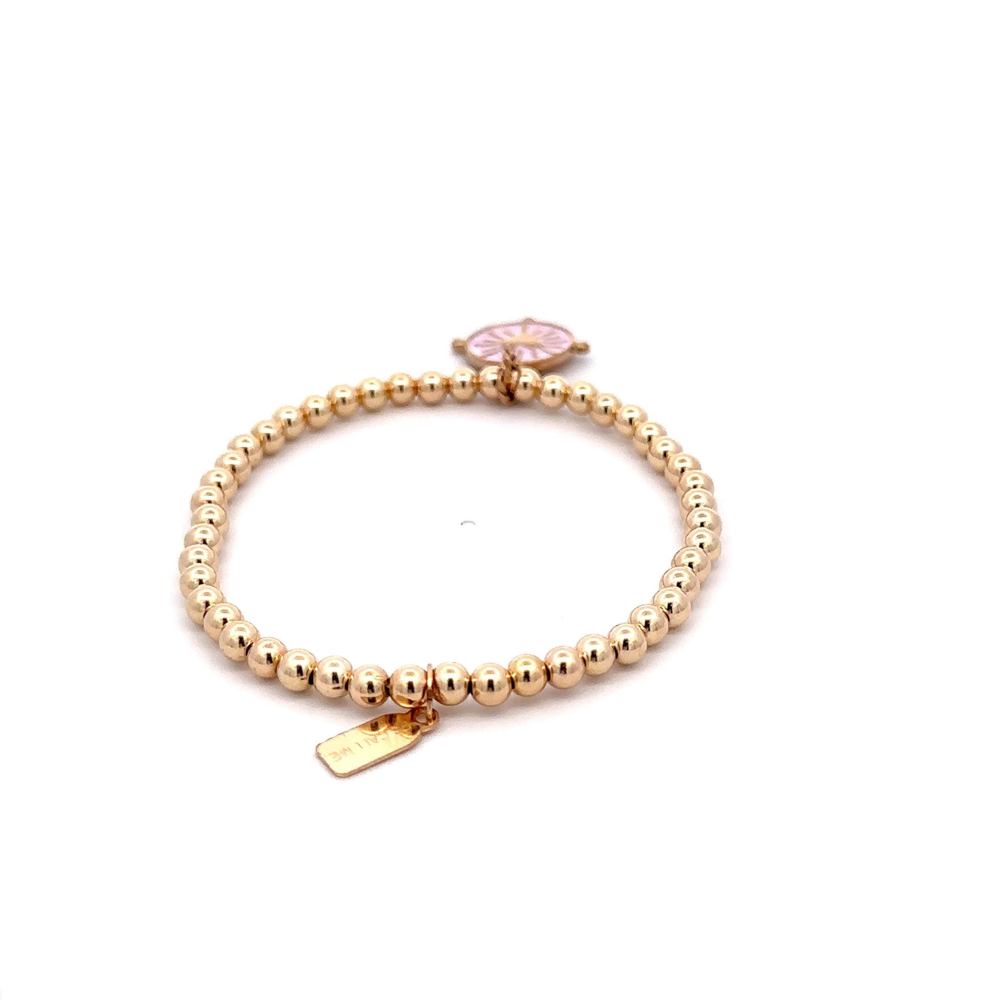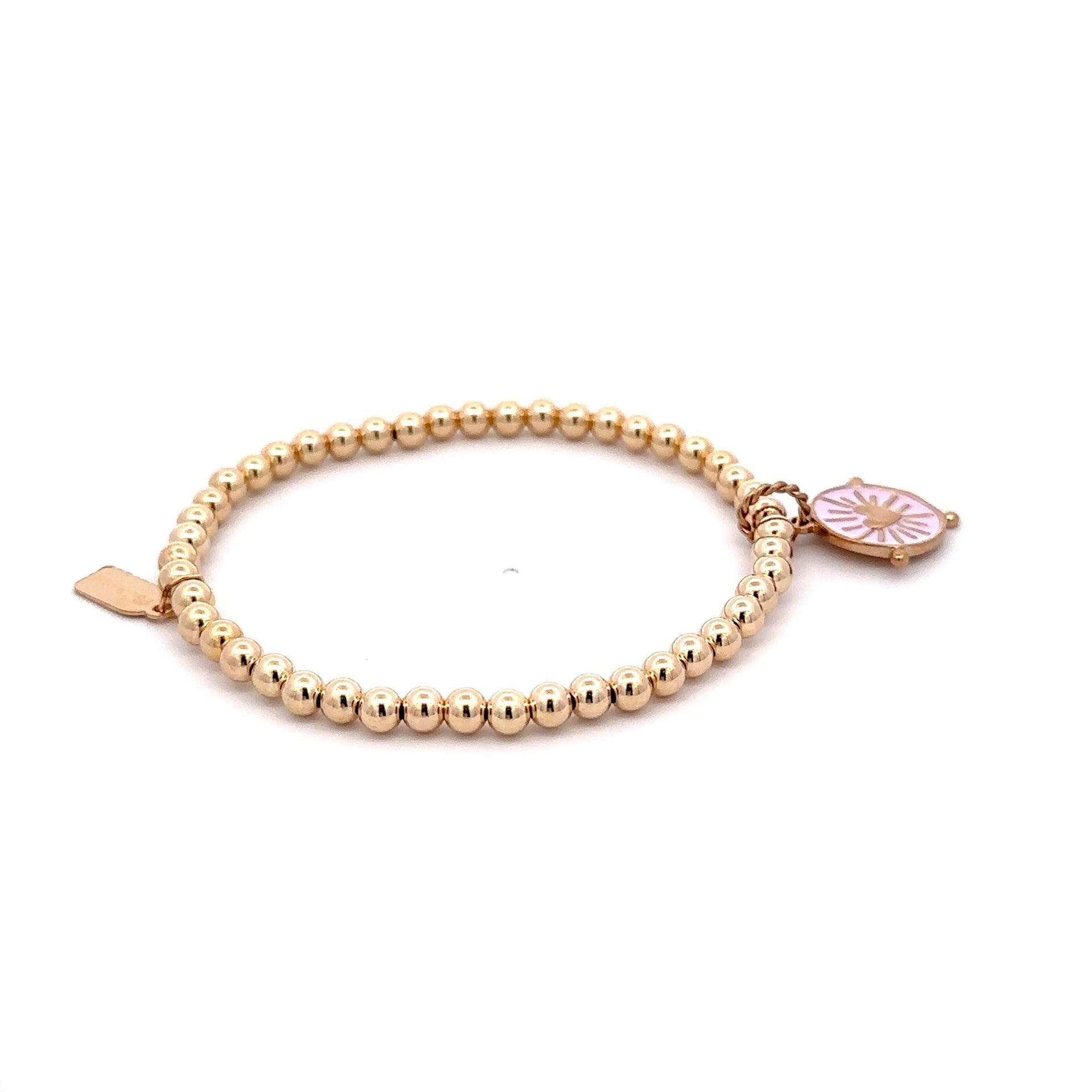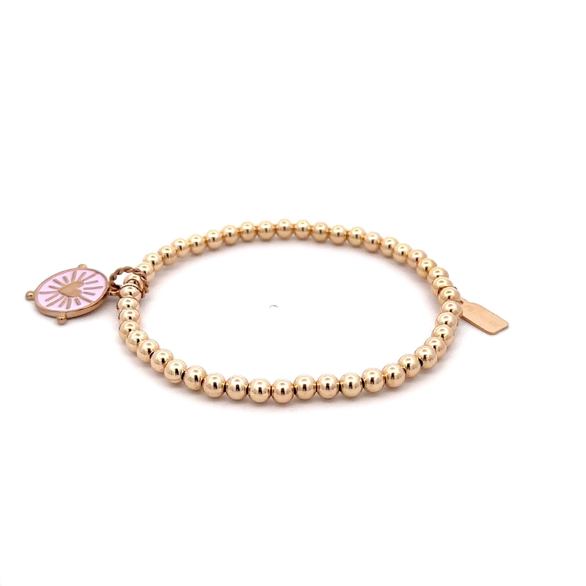 Bracelet élastique avec boules dorées et pendentif rond coloré en forme de cœur.