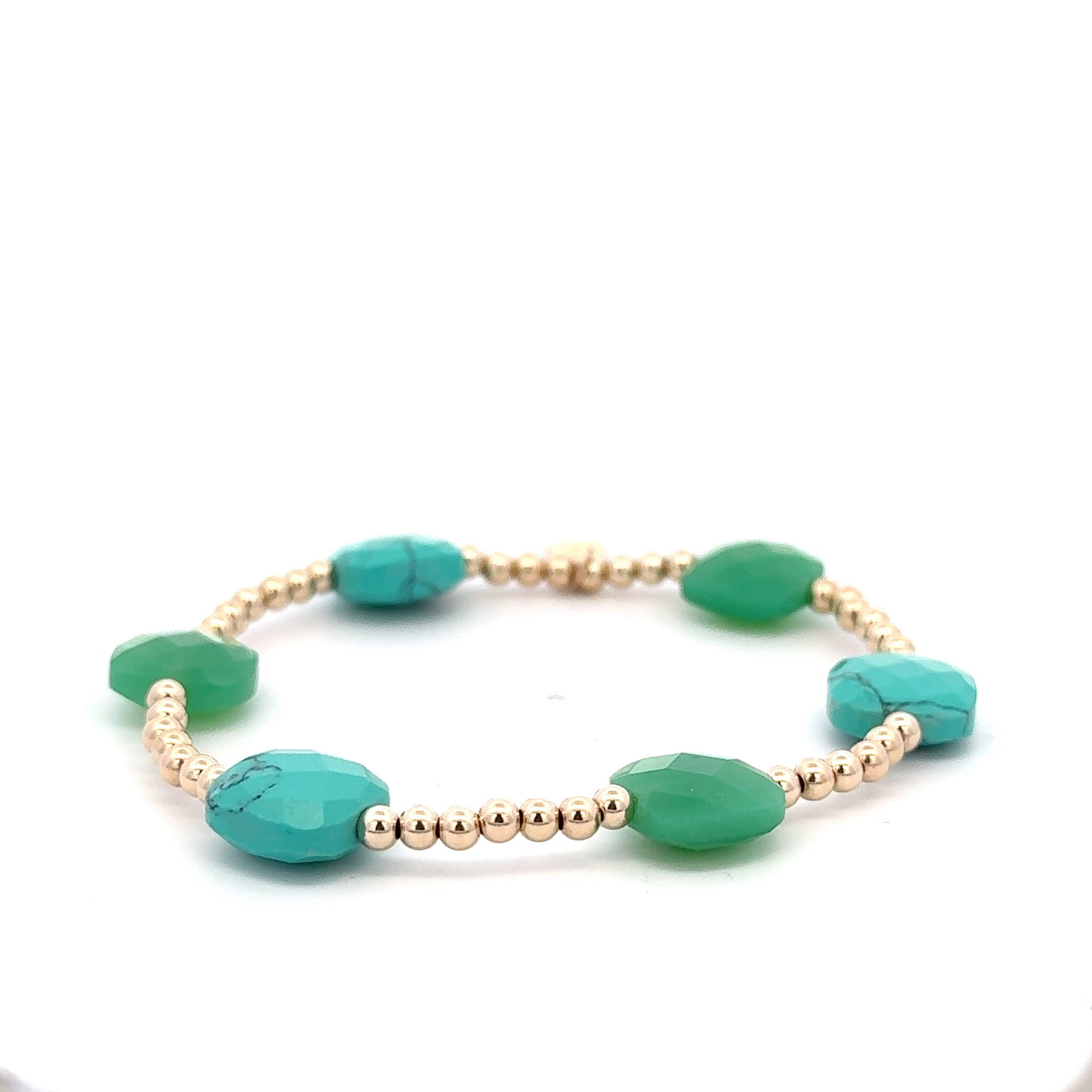 Bracelet élastique avec boules dorées et 6 pierres carrées colorées.