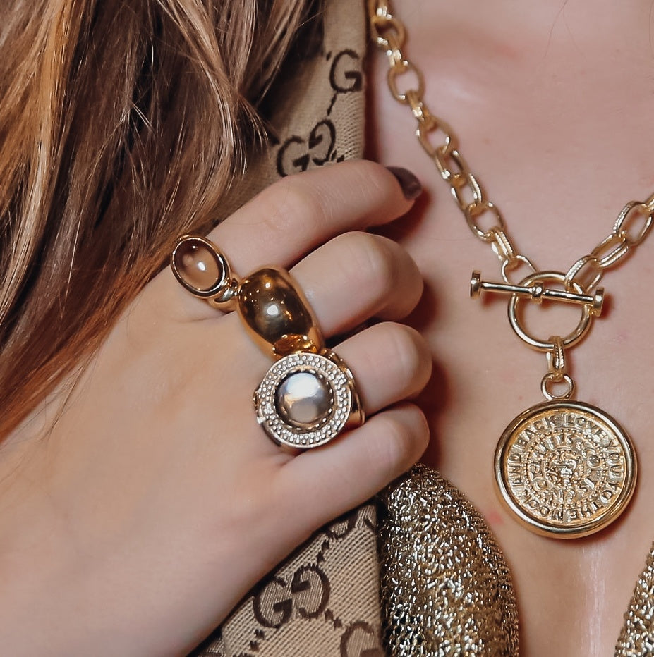 Bague dorée avec pierre colorée.