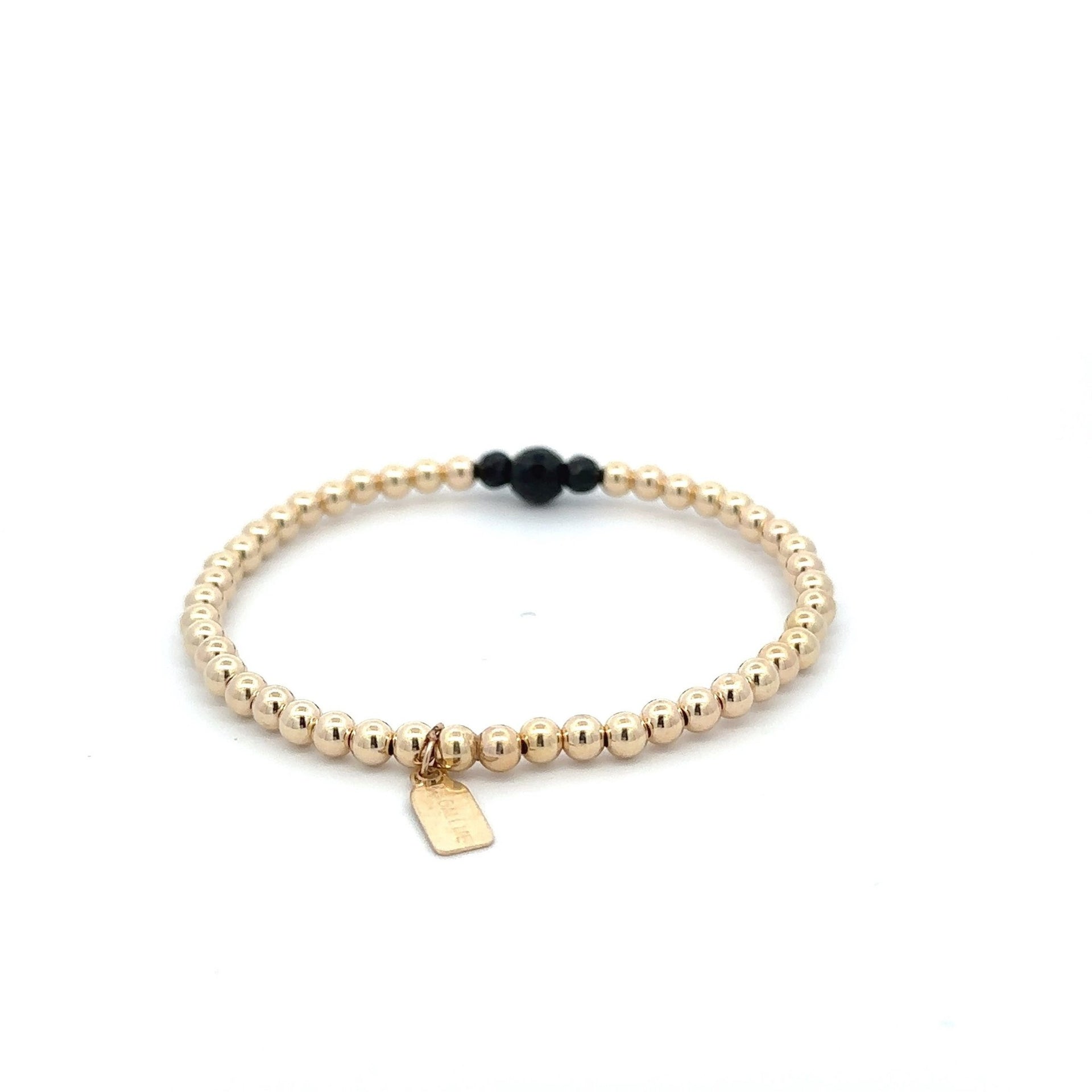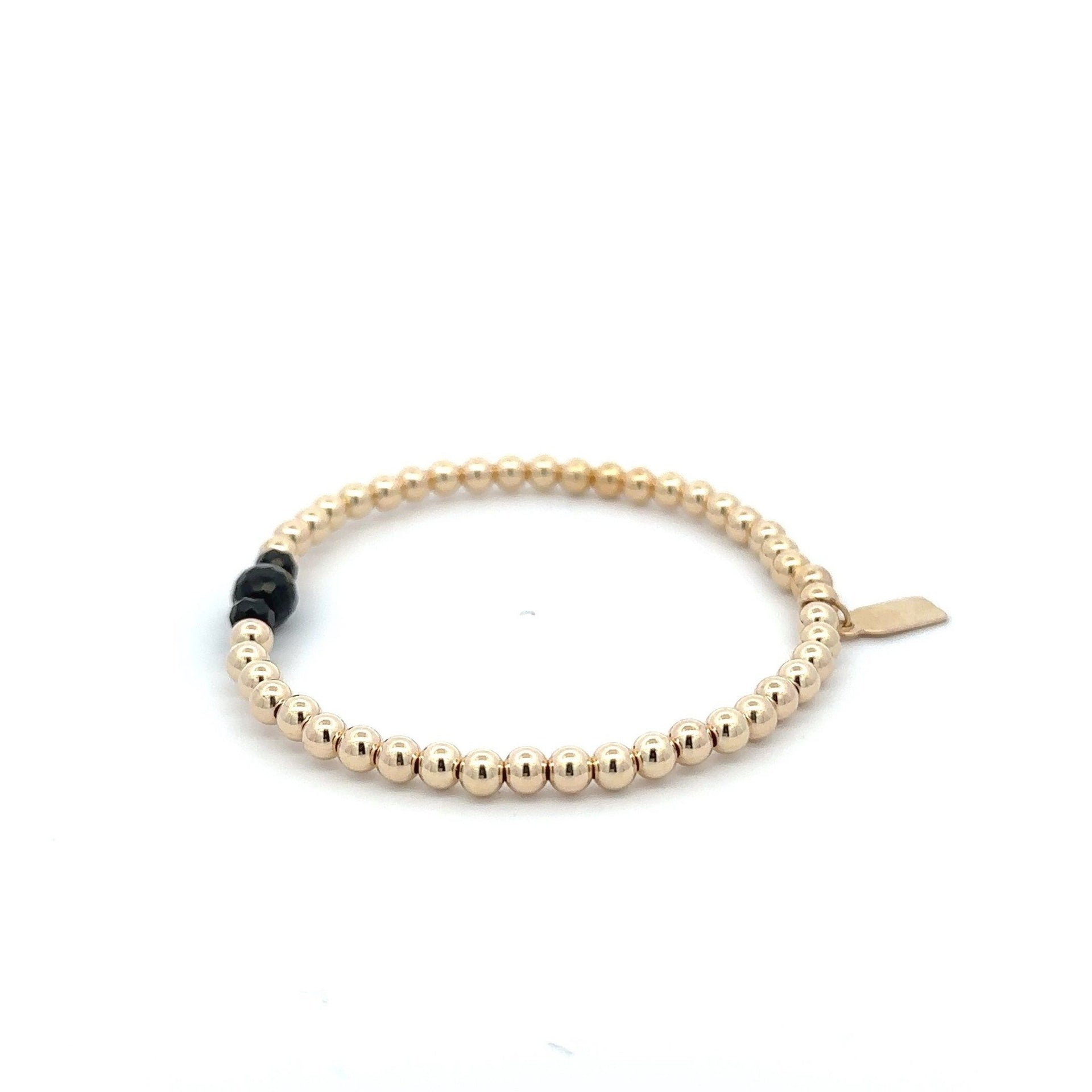 Bracelet élastique avec boules dorées et trois pierres noires.