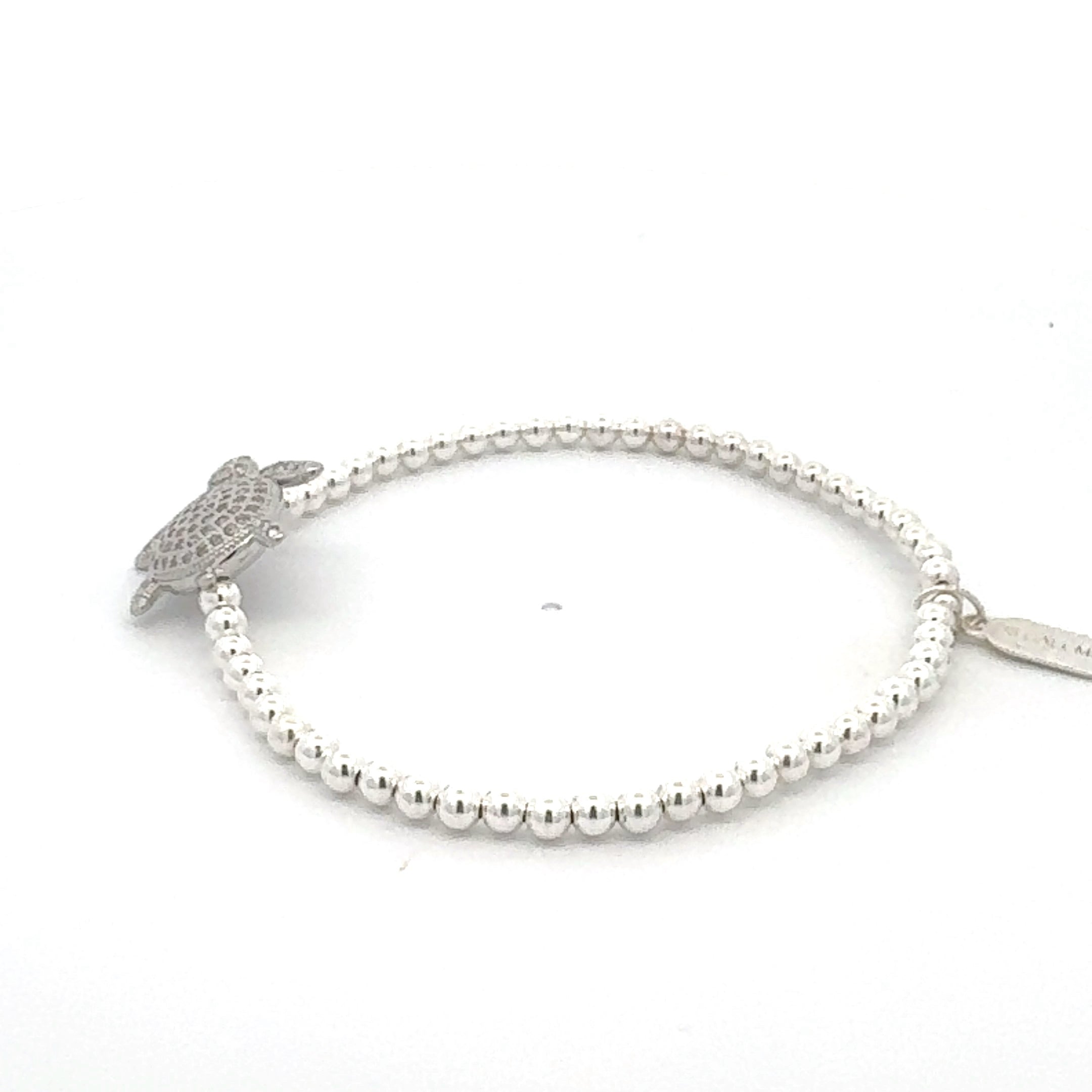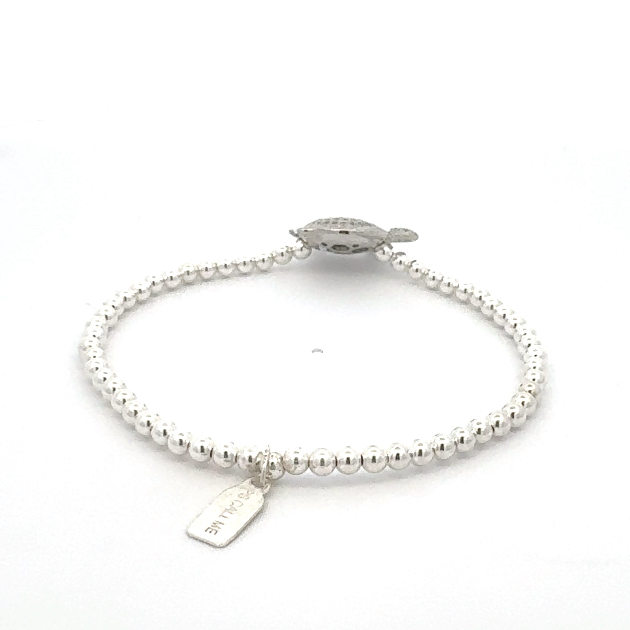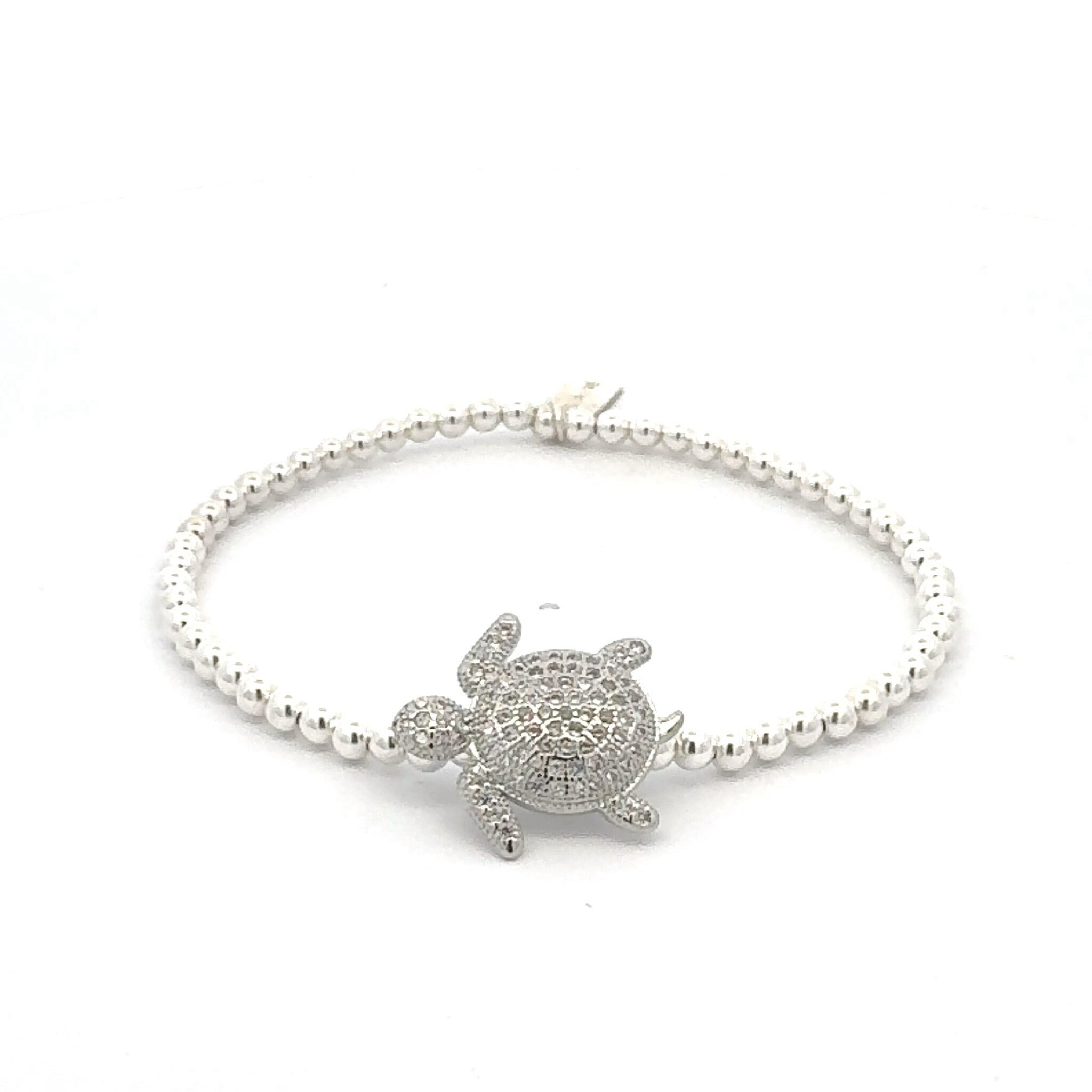 Bracelet élastique avec boules en argent et tortue sertie de zircones.