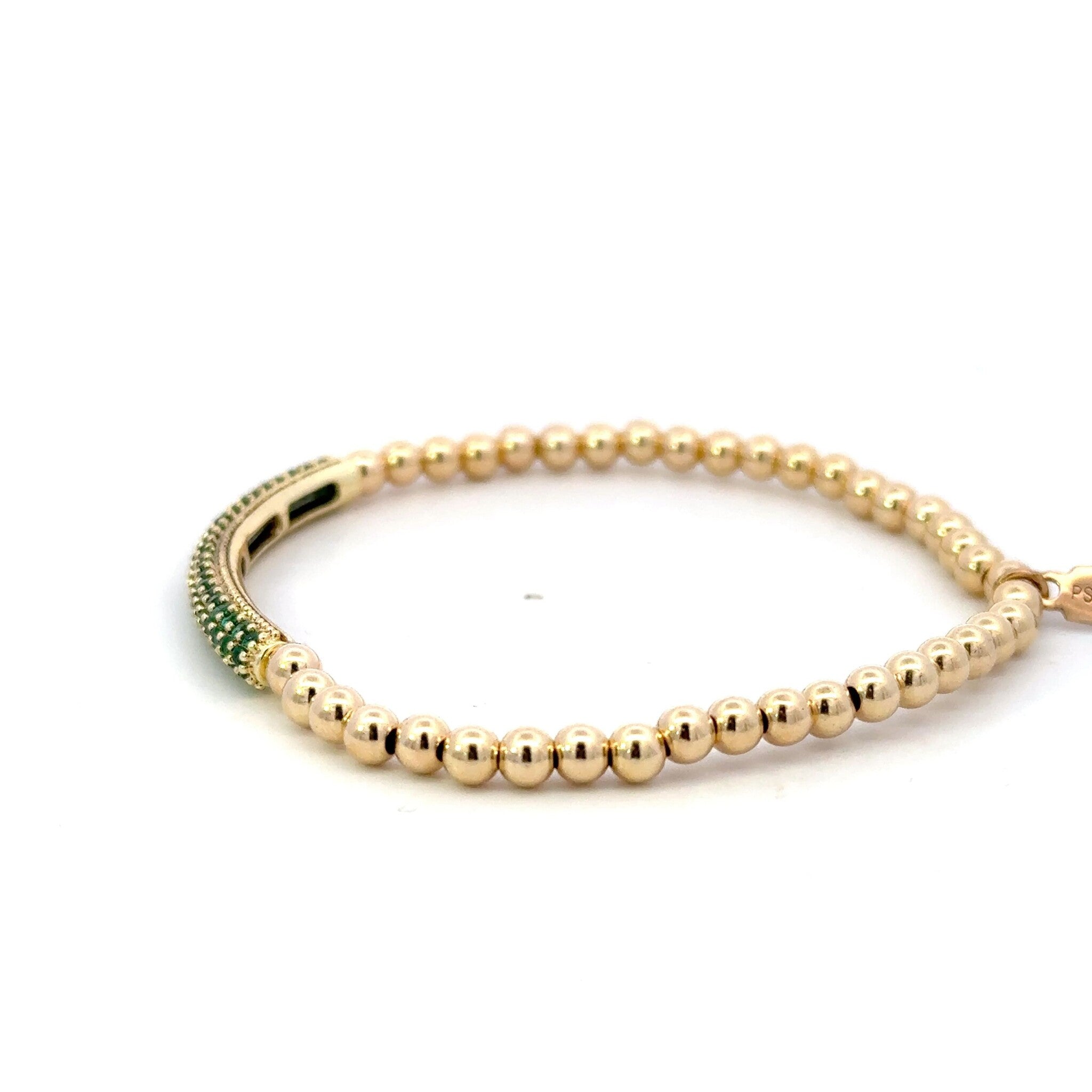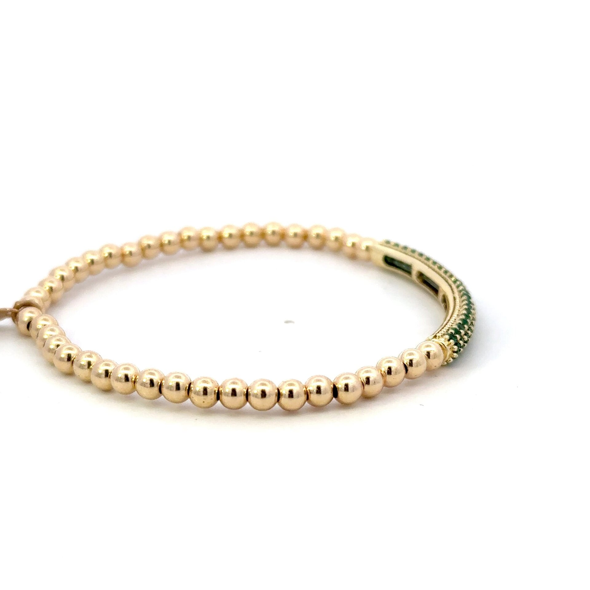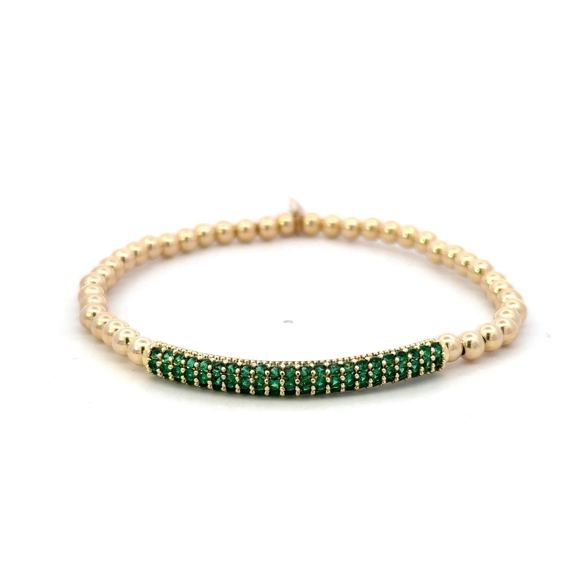 Elastic bracelet with gold colored balls and a green rhinestone bar.