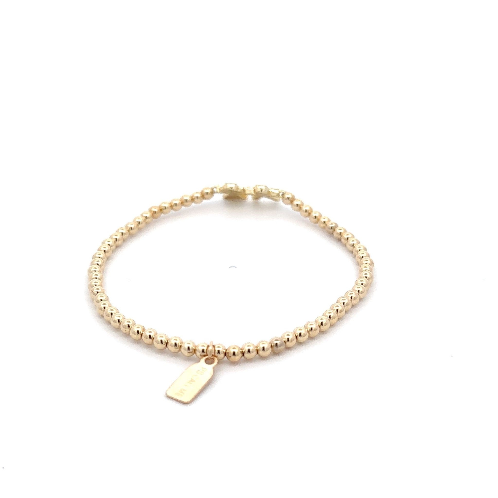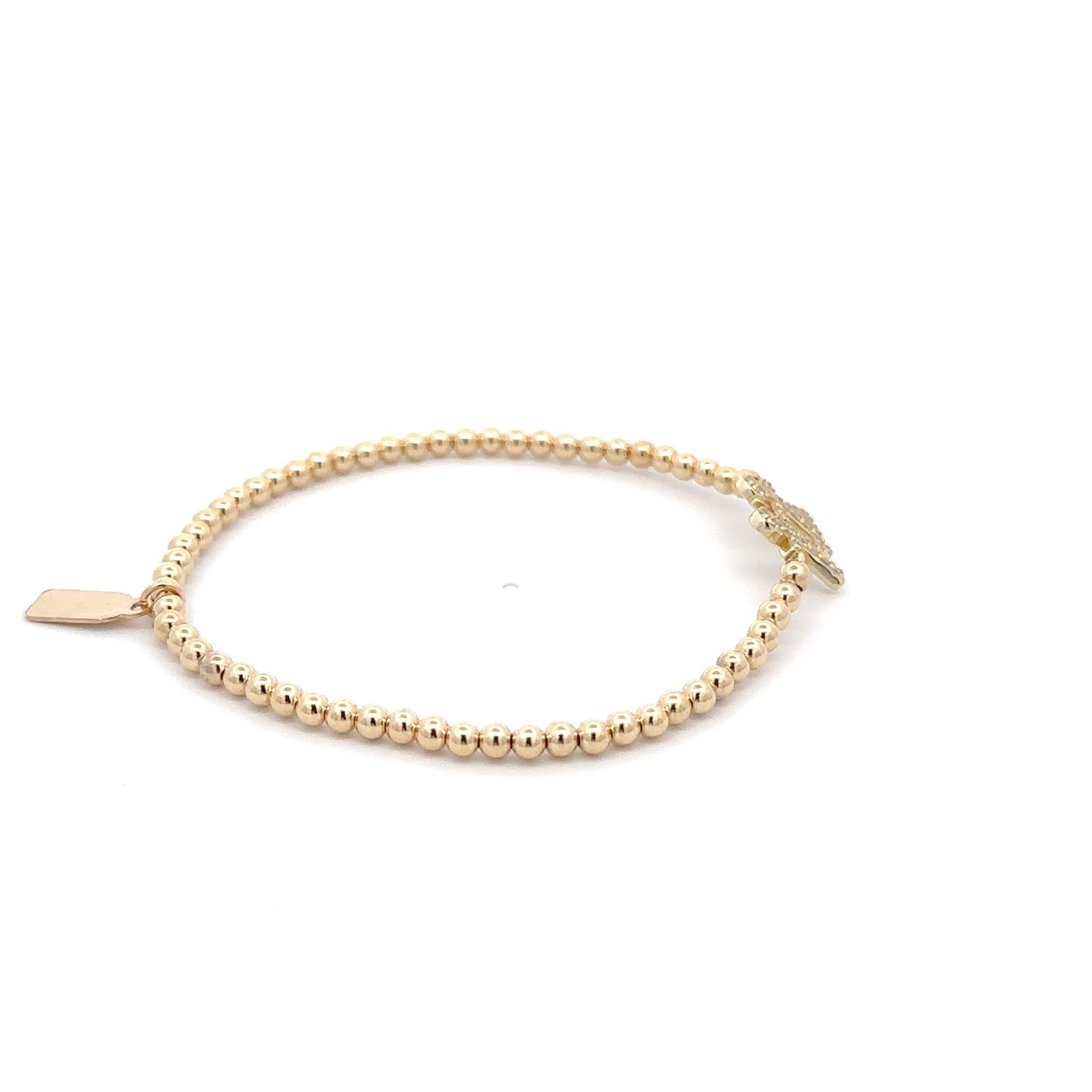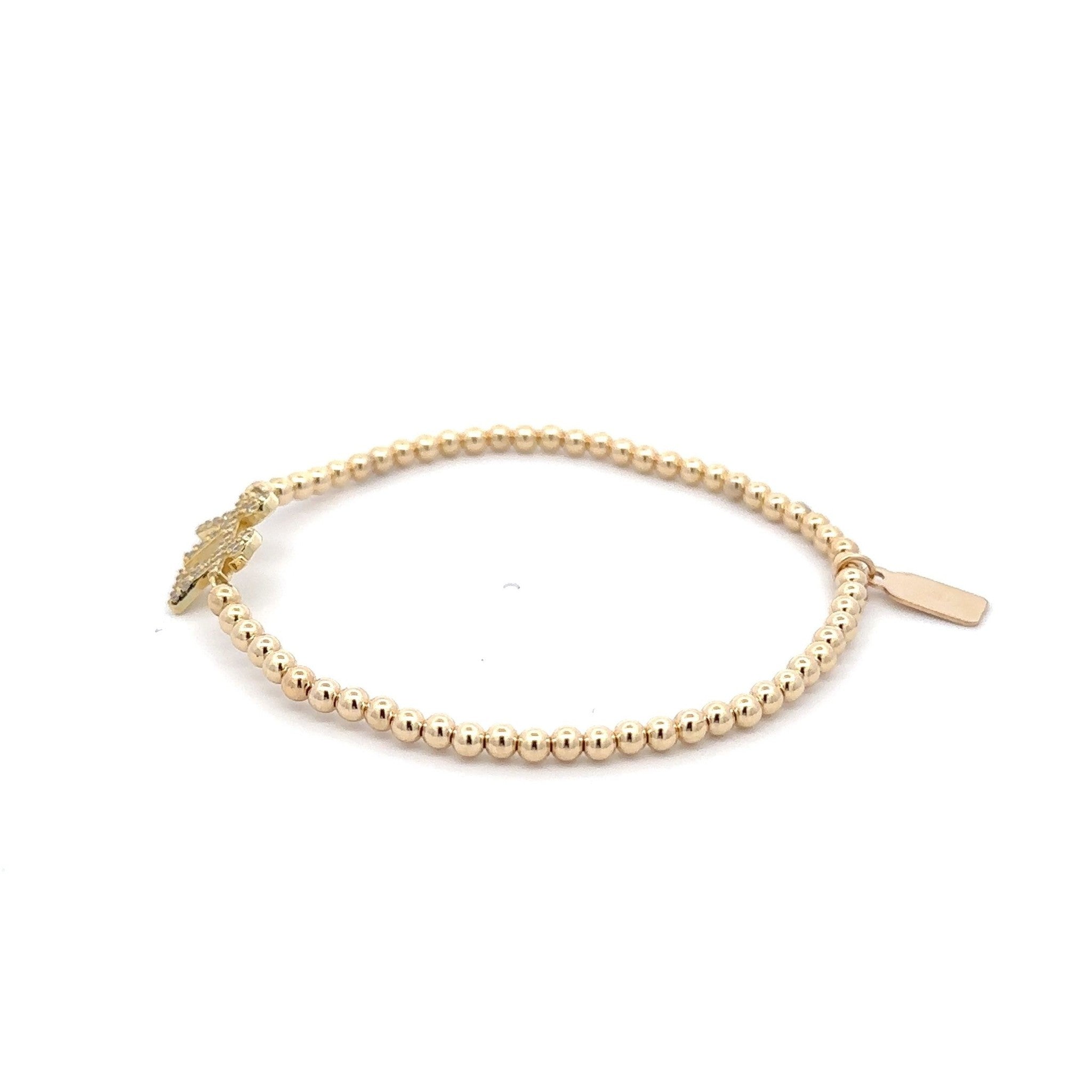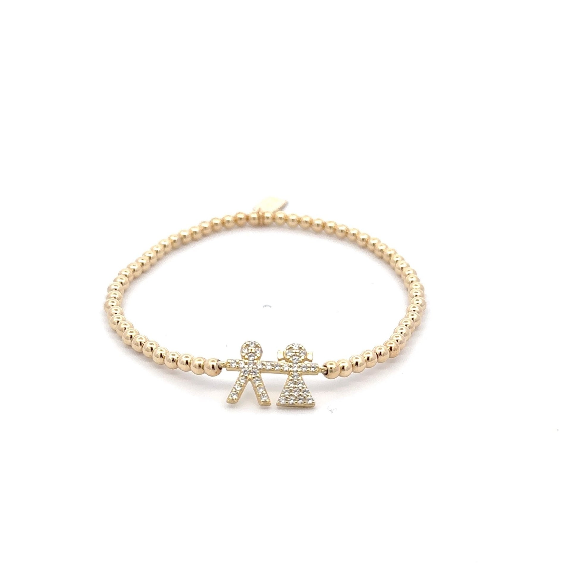 Bracciale elastico con palline color oro raffiguranti un bambino e una bambina.