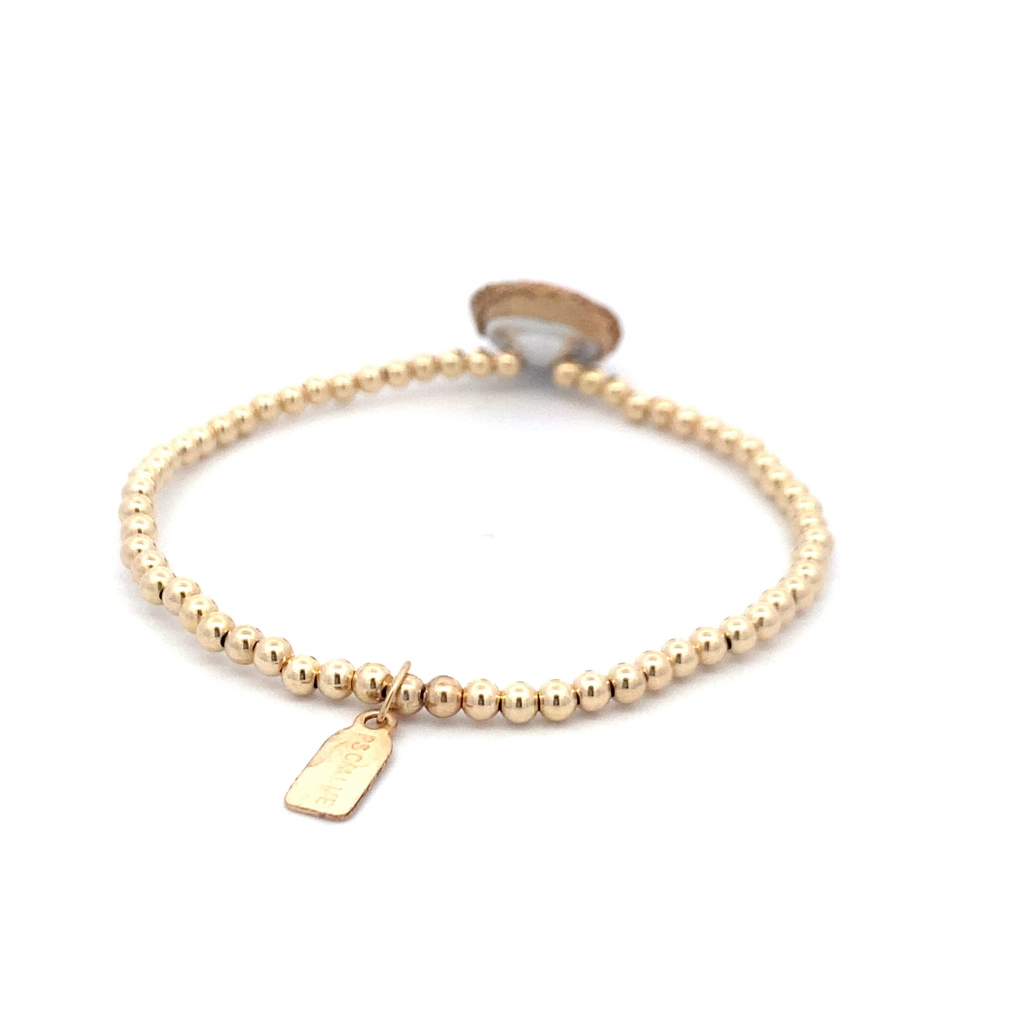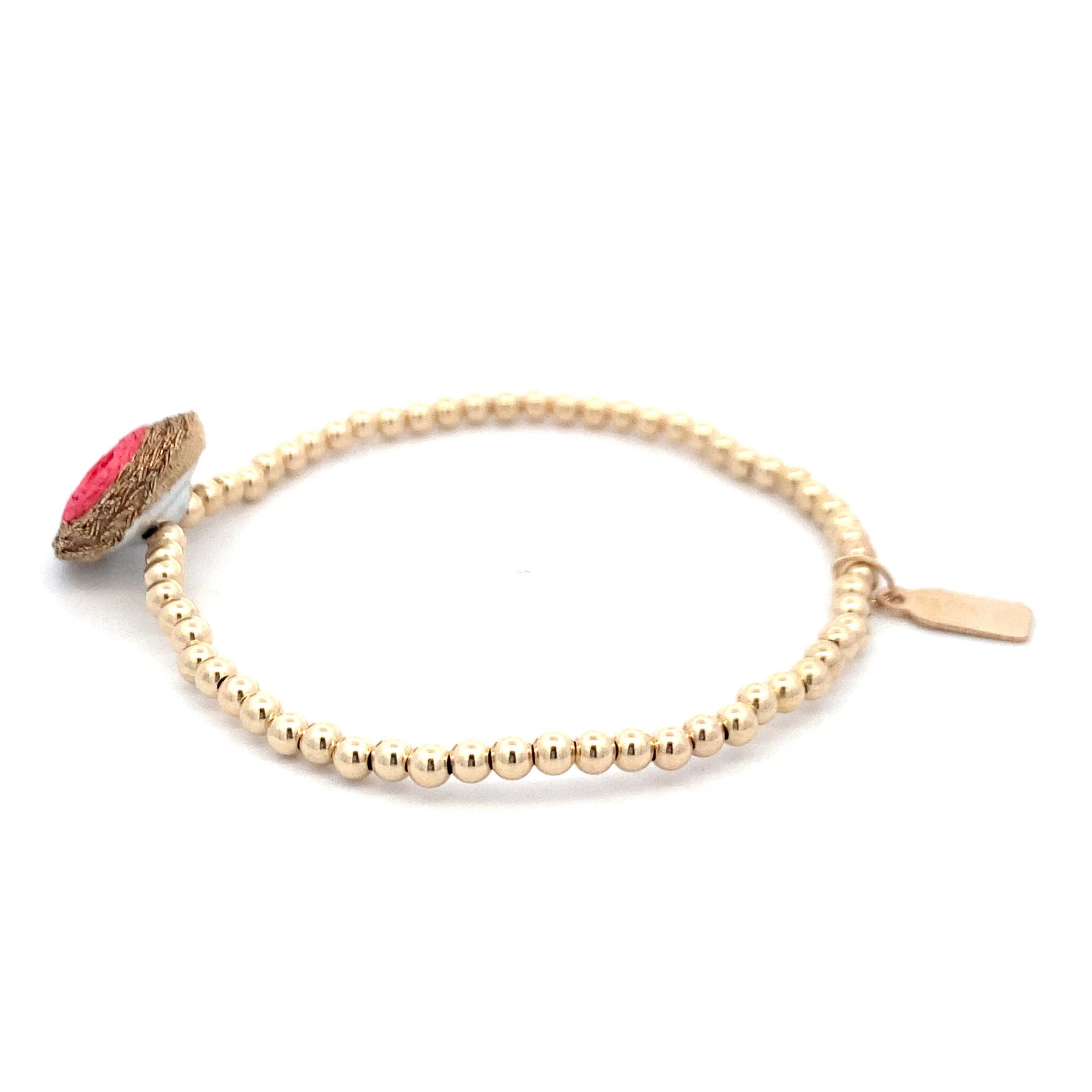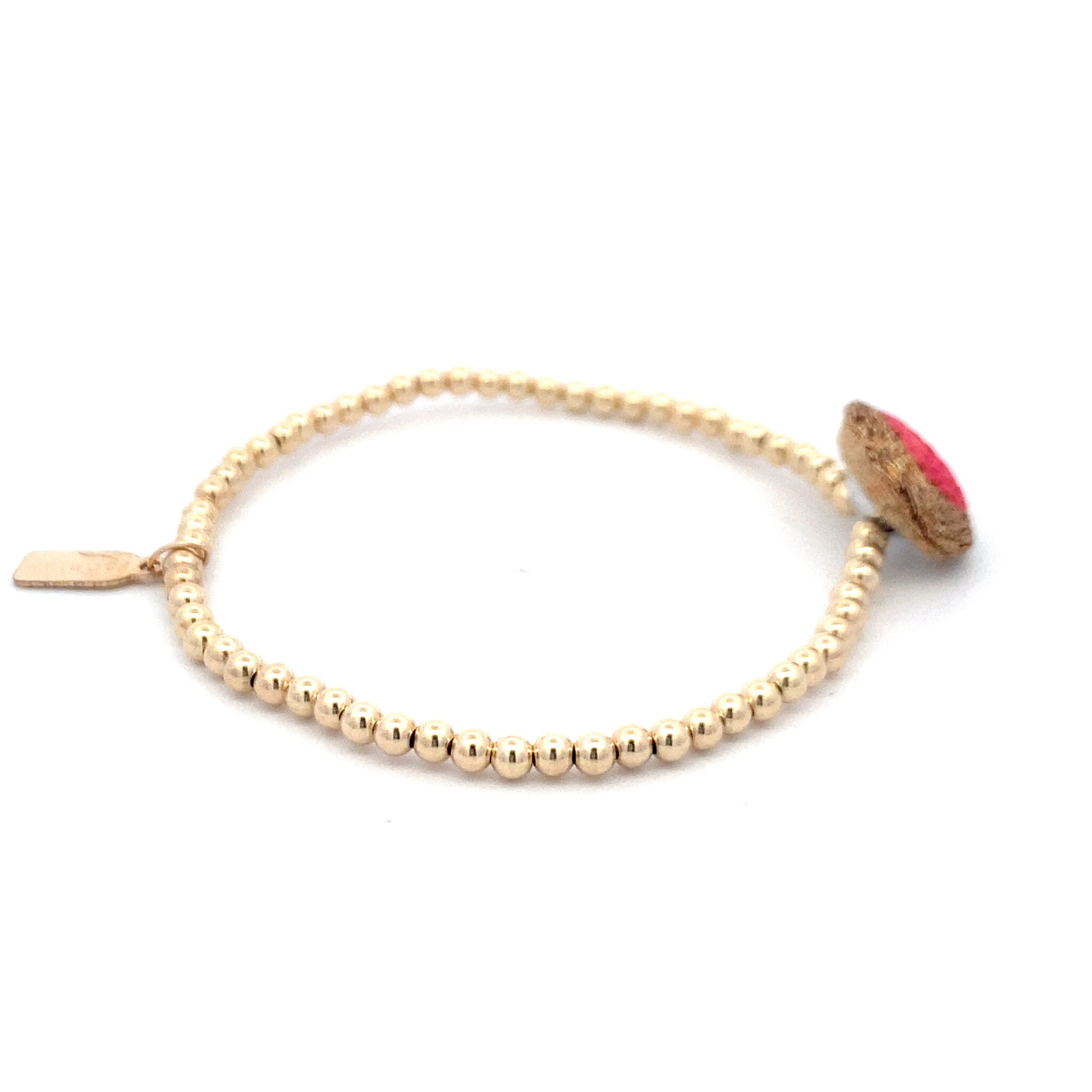 Bracciale elastico con palline color oro e bottone color salmone/arancione chiaro con un piccolo specchio al centro.