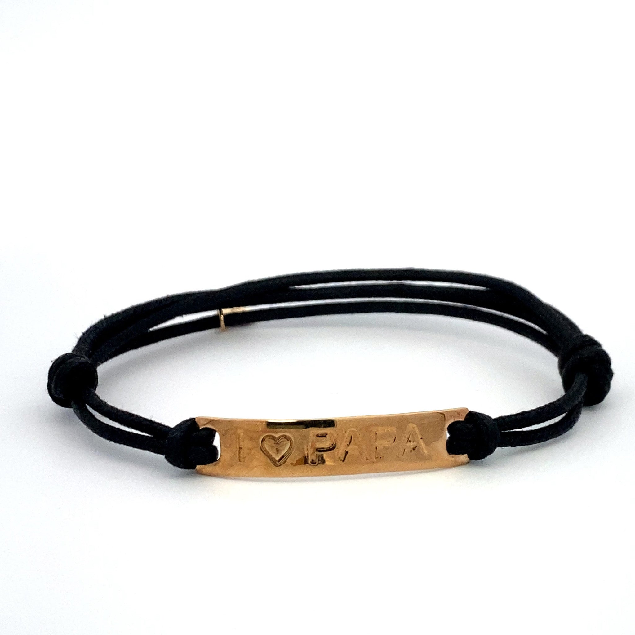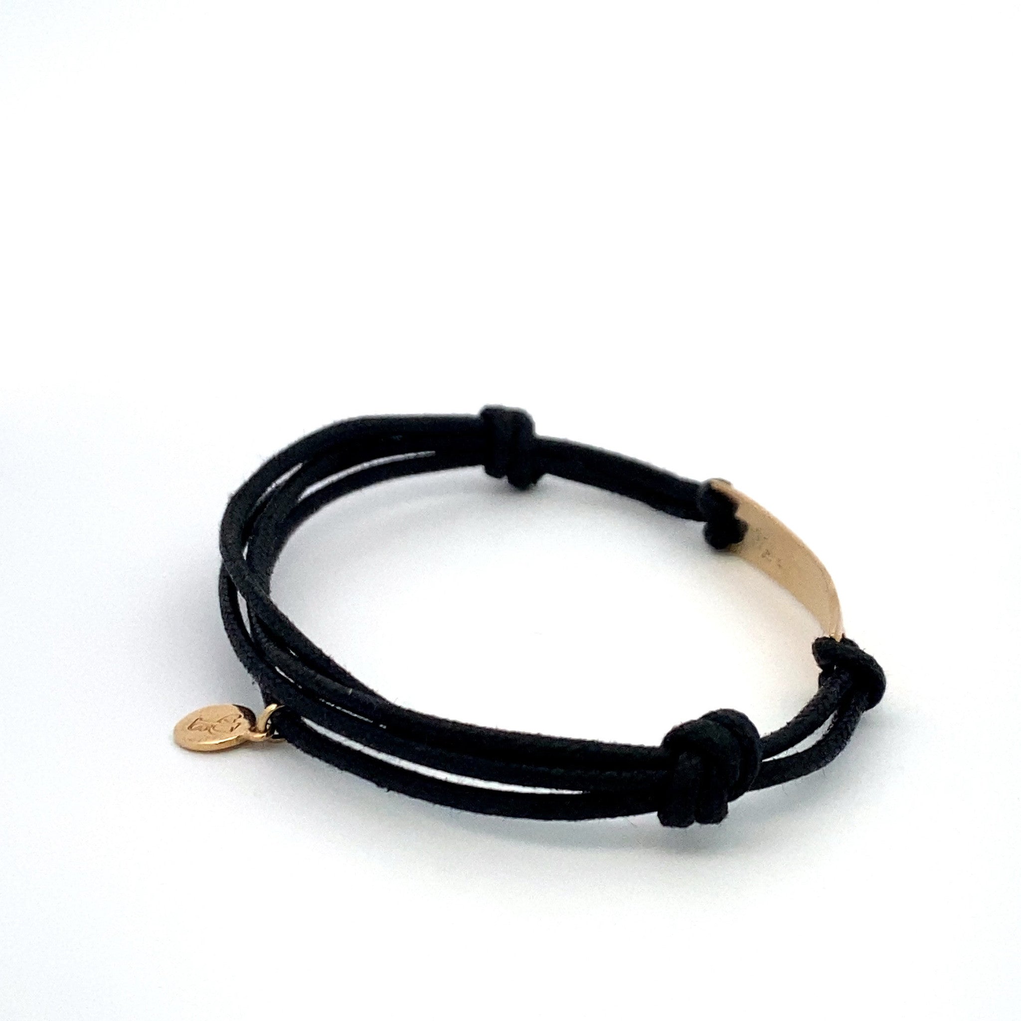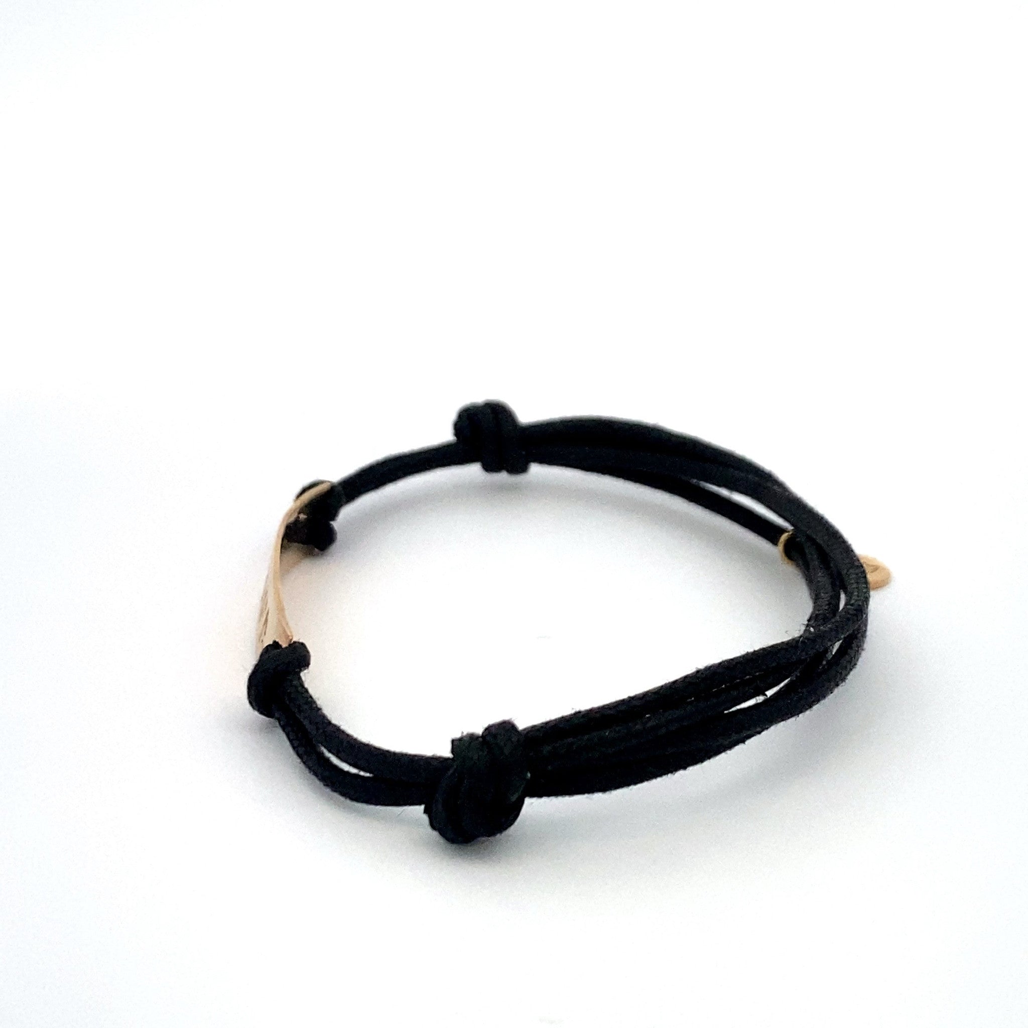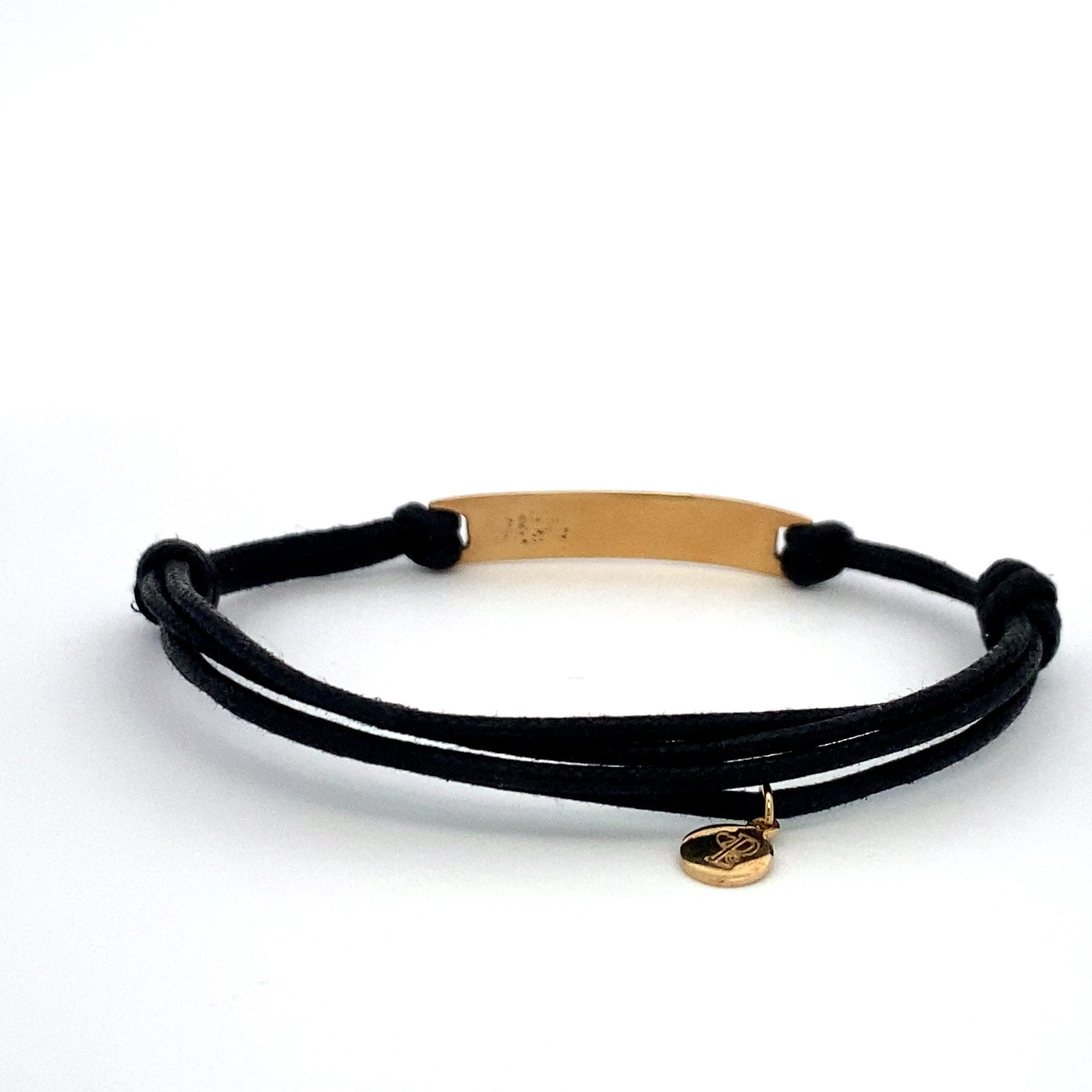 Bracciale regolabile in cordino di raso con ciondolo dorato con testo.