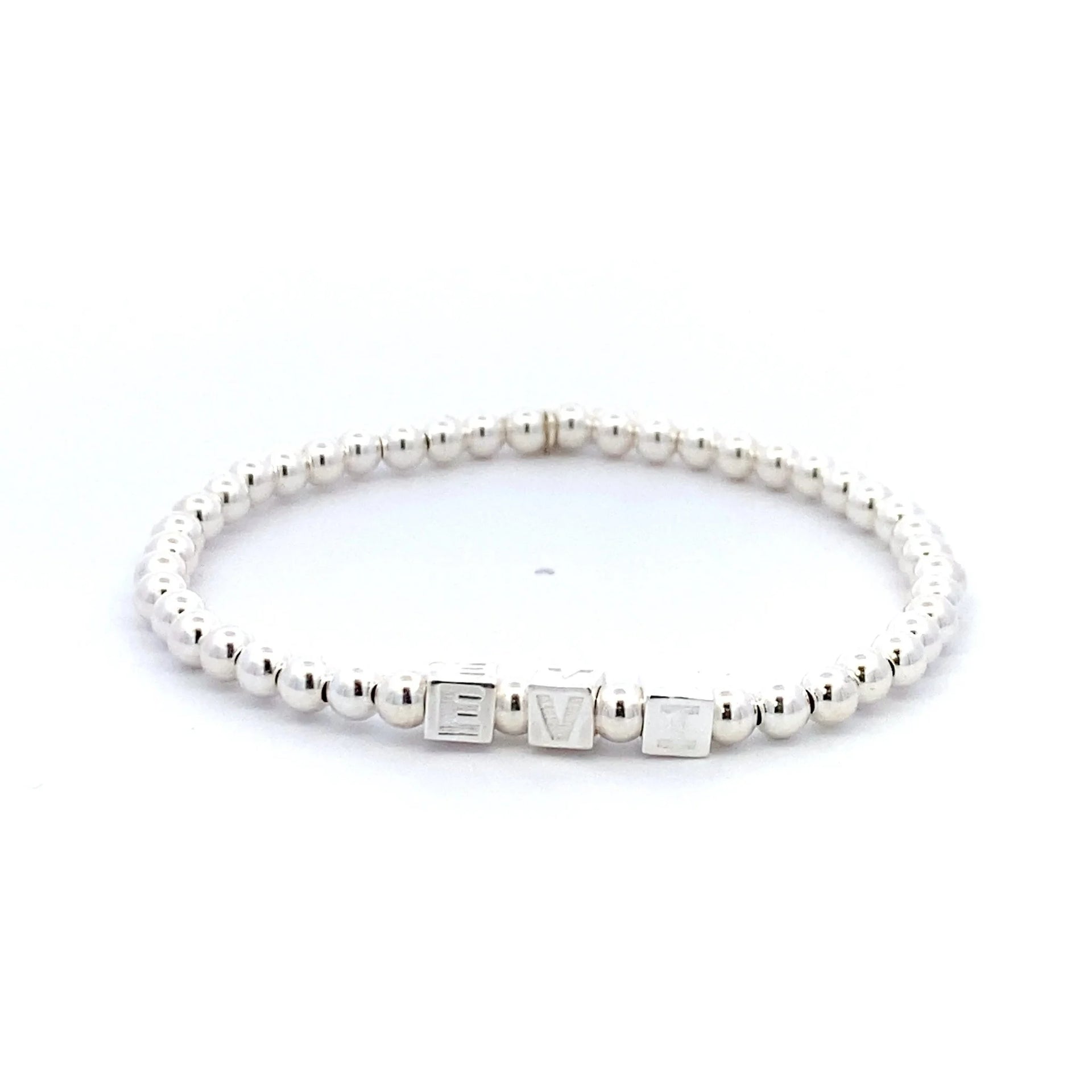 Bracciale elastico con palline d'argento e iniziali in stampatello.