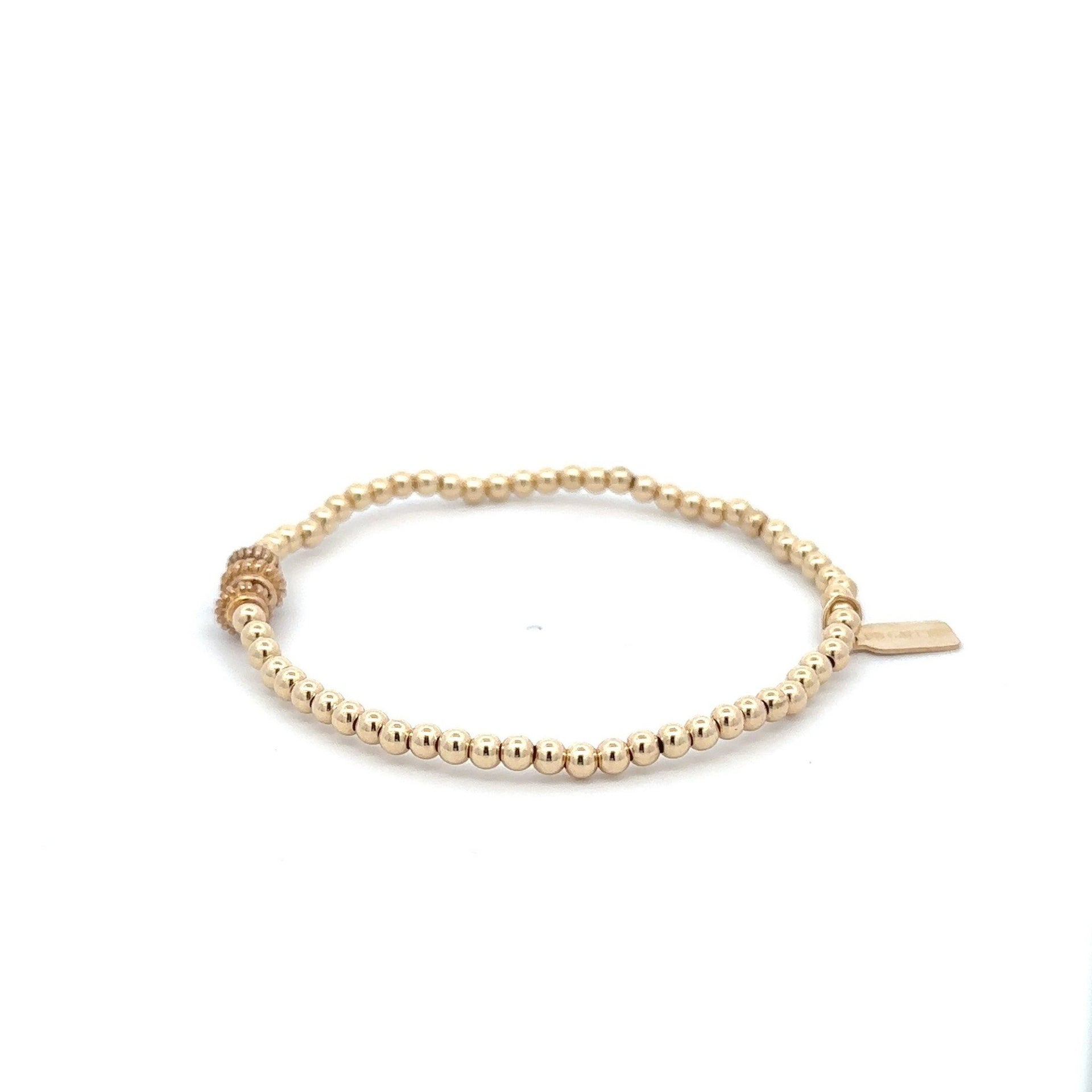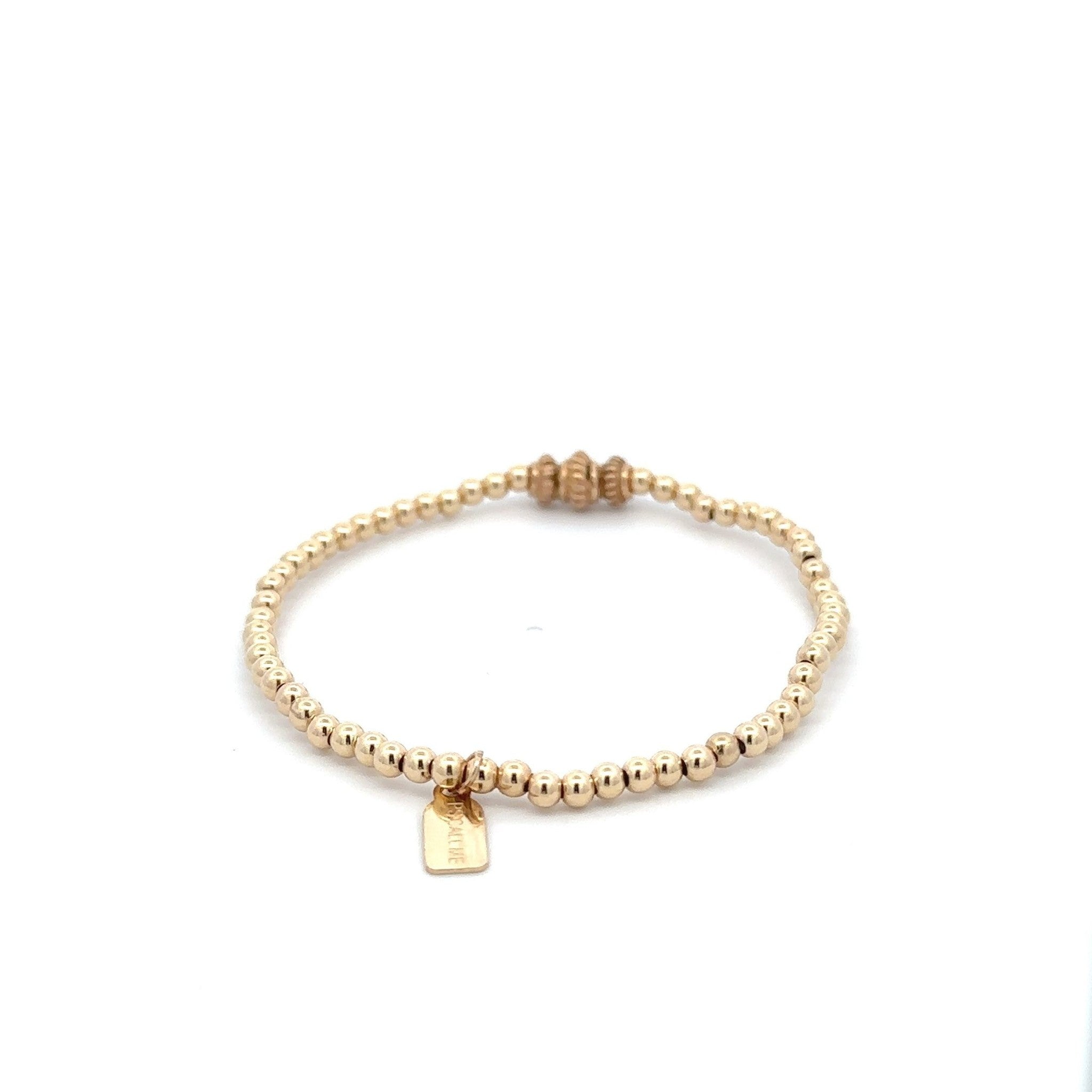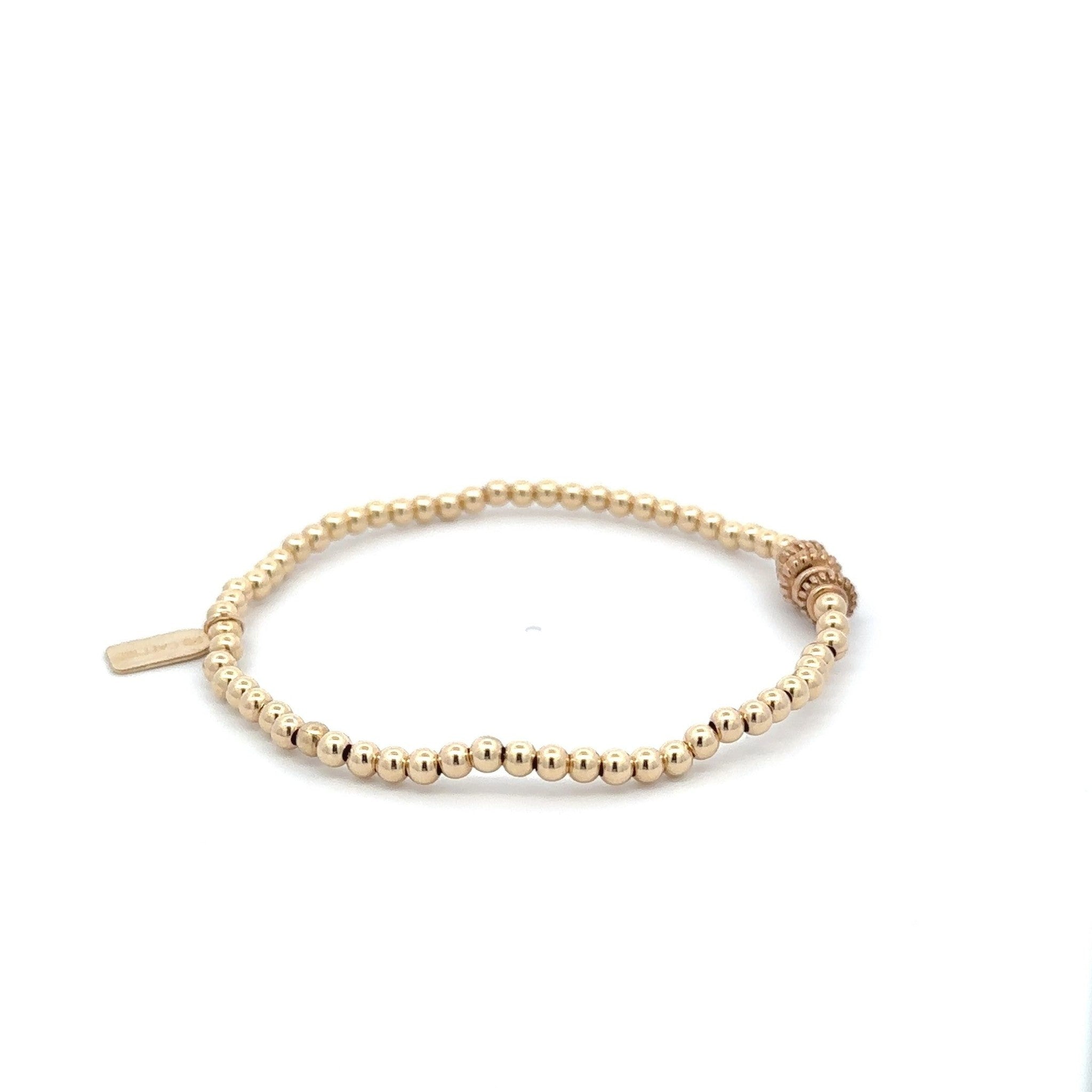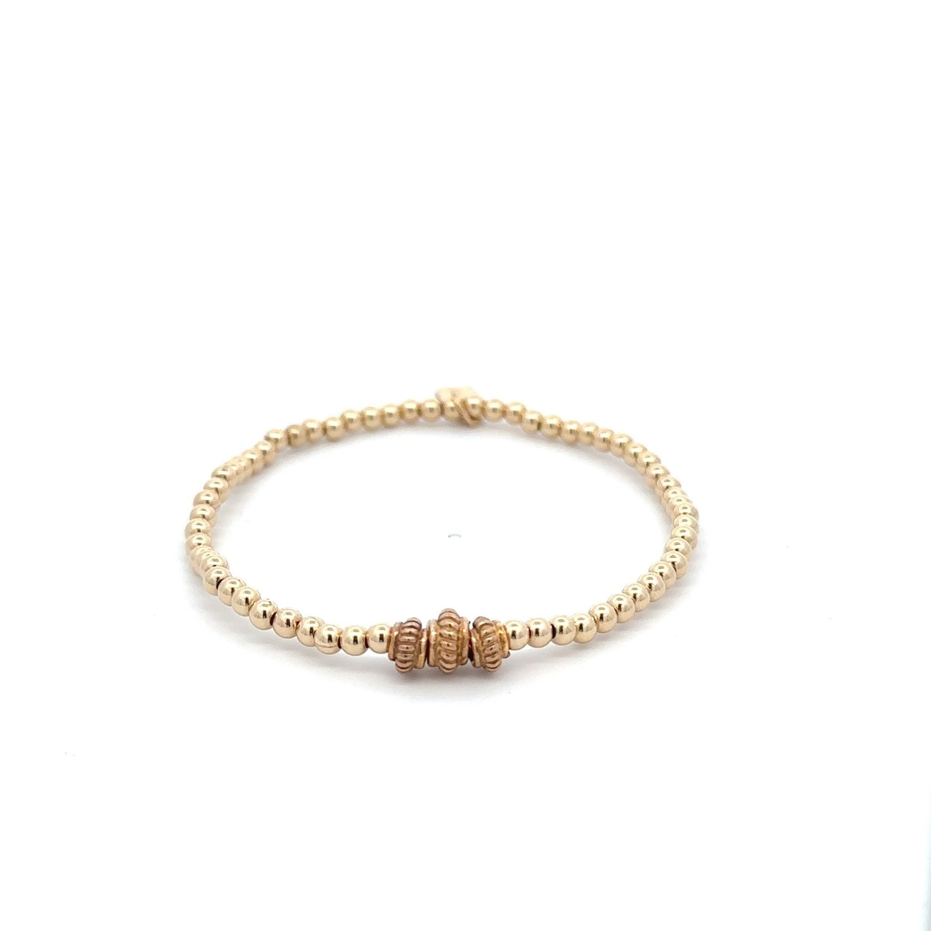 Bracciale elastico con palline color oro e tre ruote.
