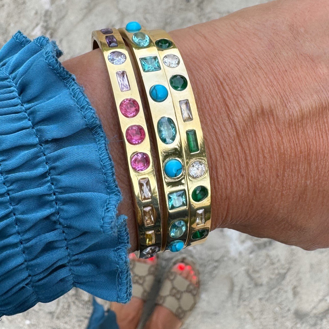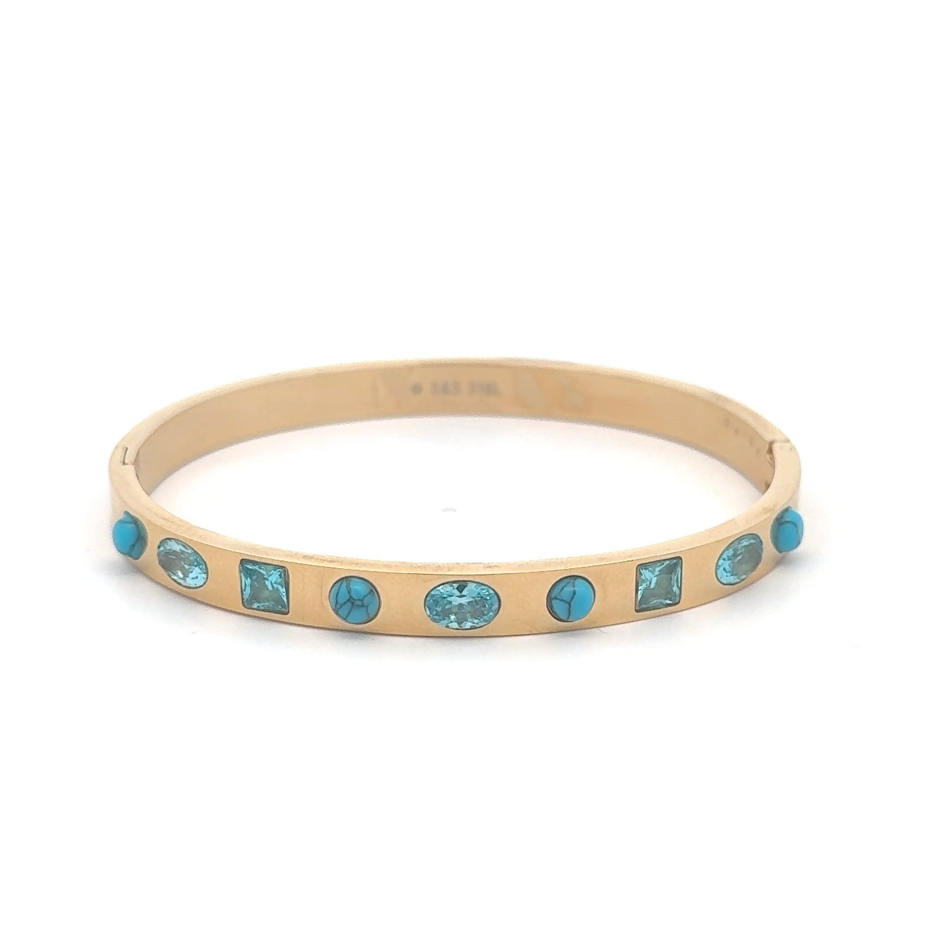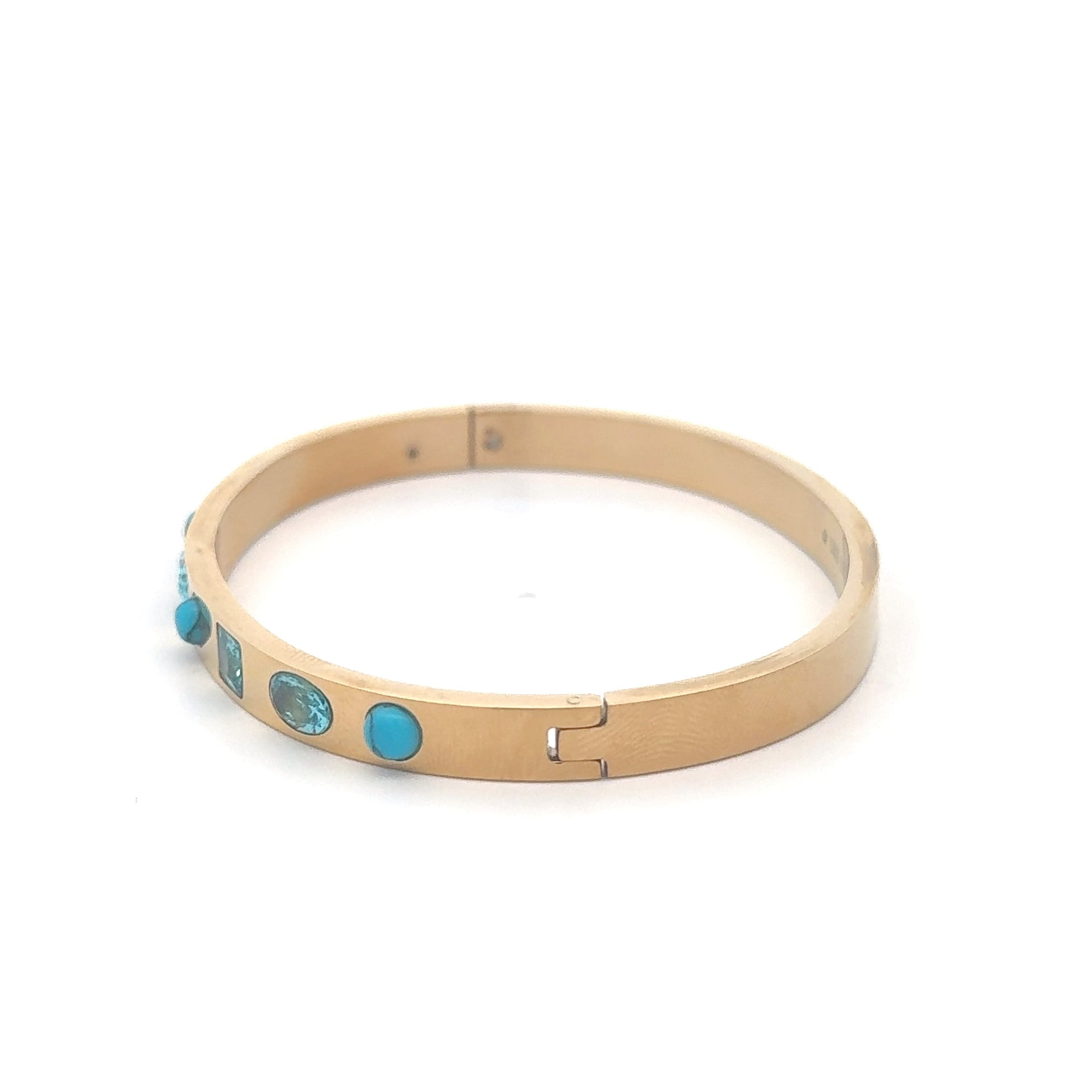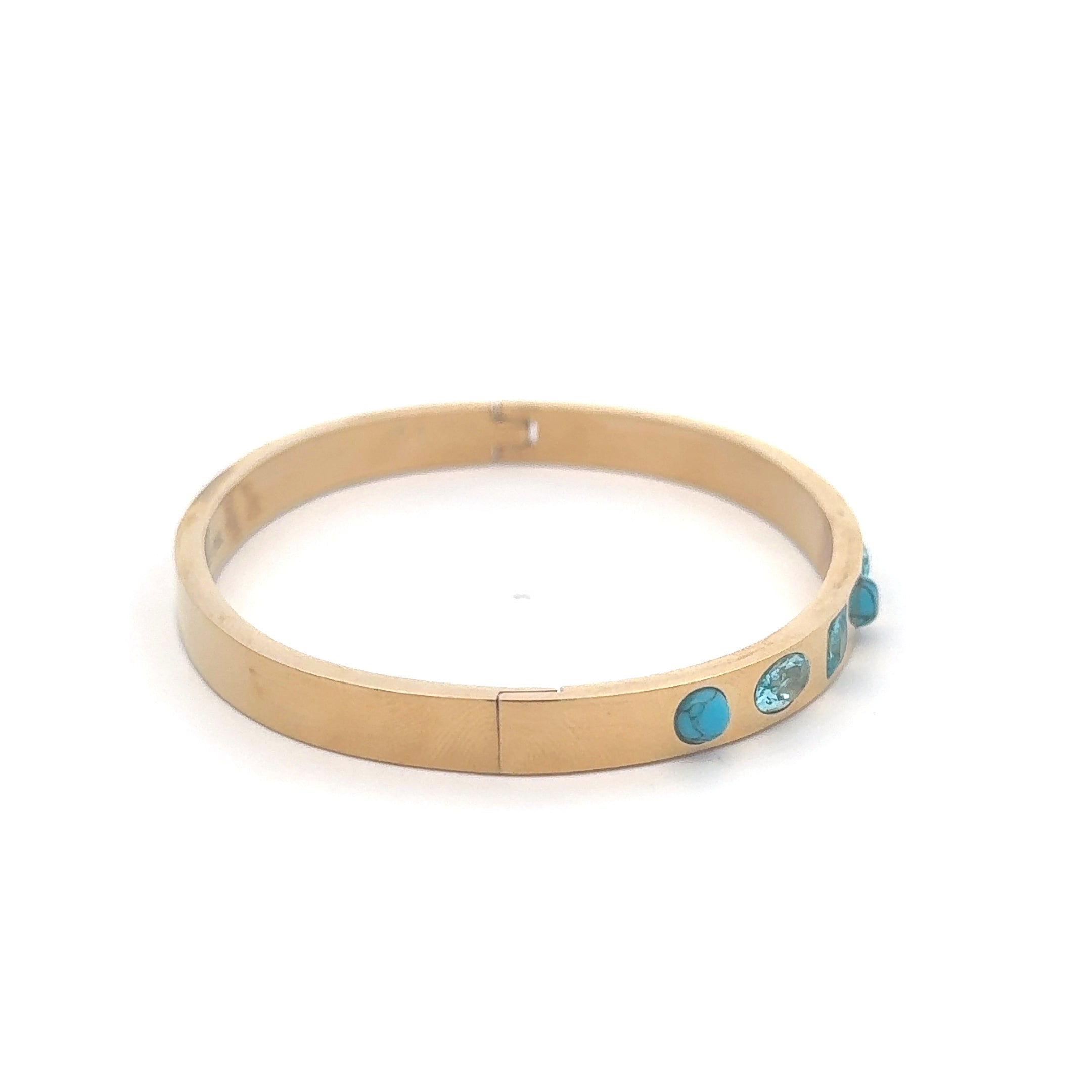 Gold colored bangle with colored stones in the color turquoise. The bangle can be opened with a click system on the side.
