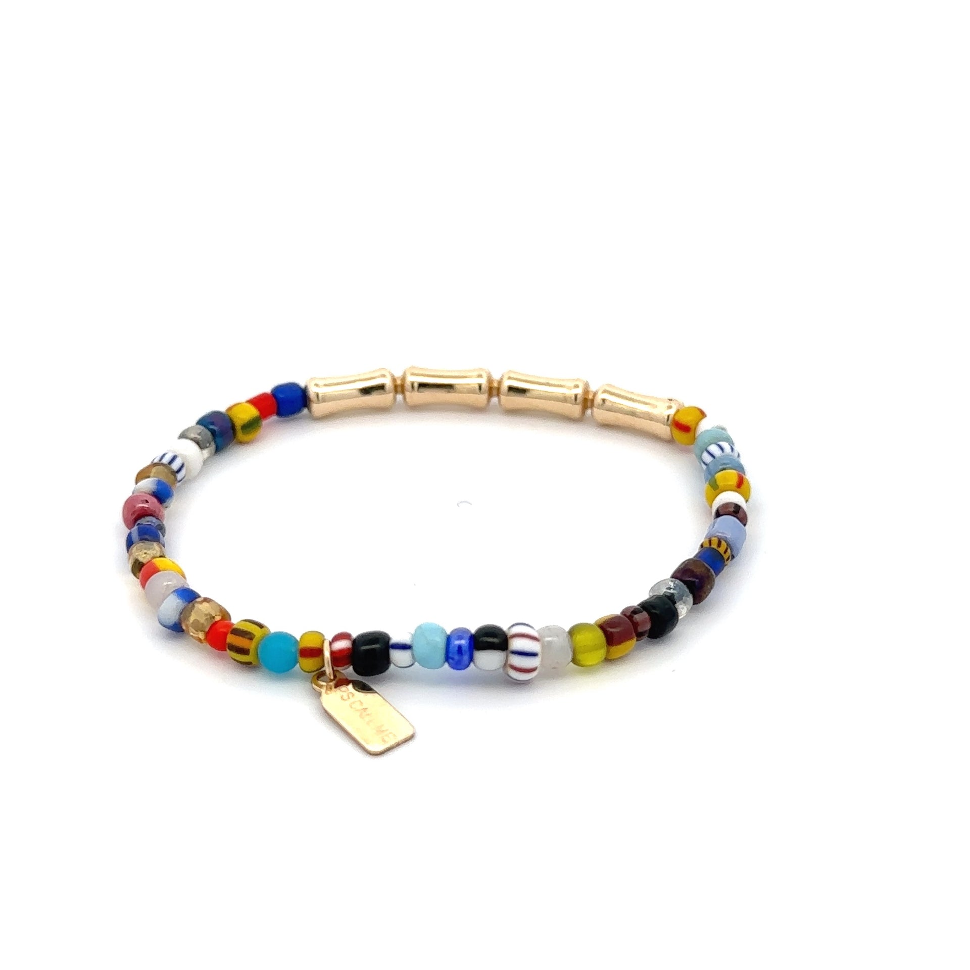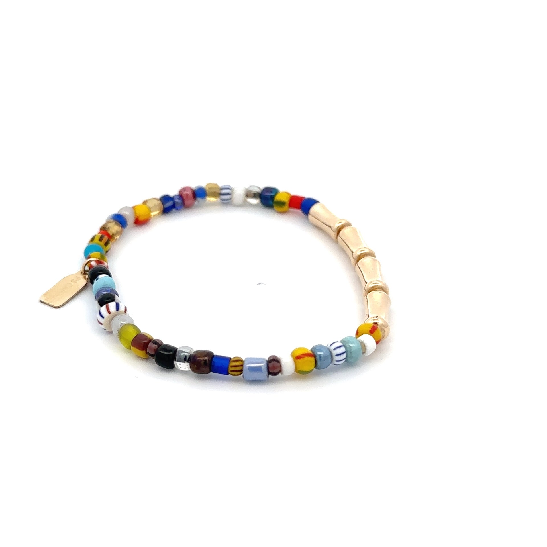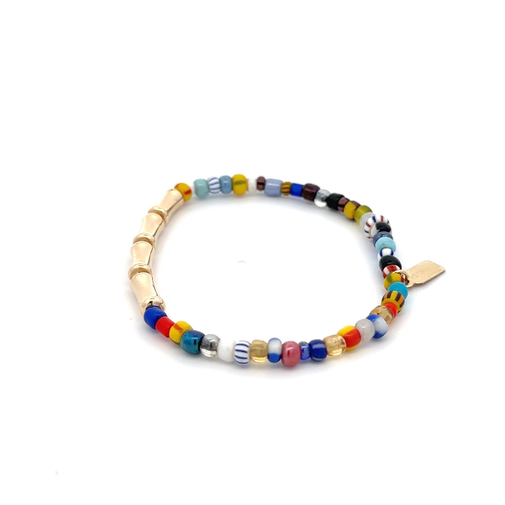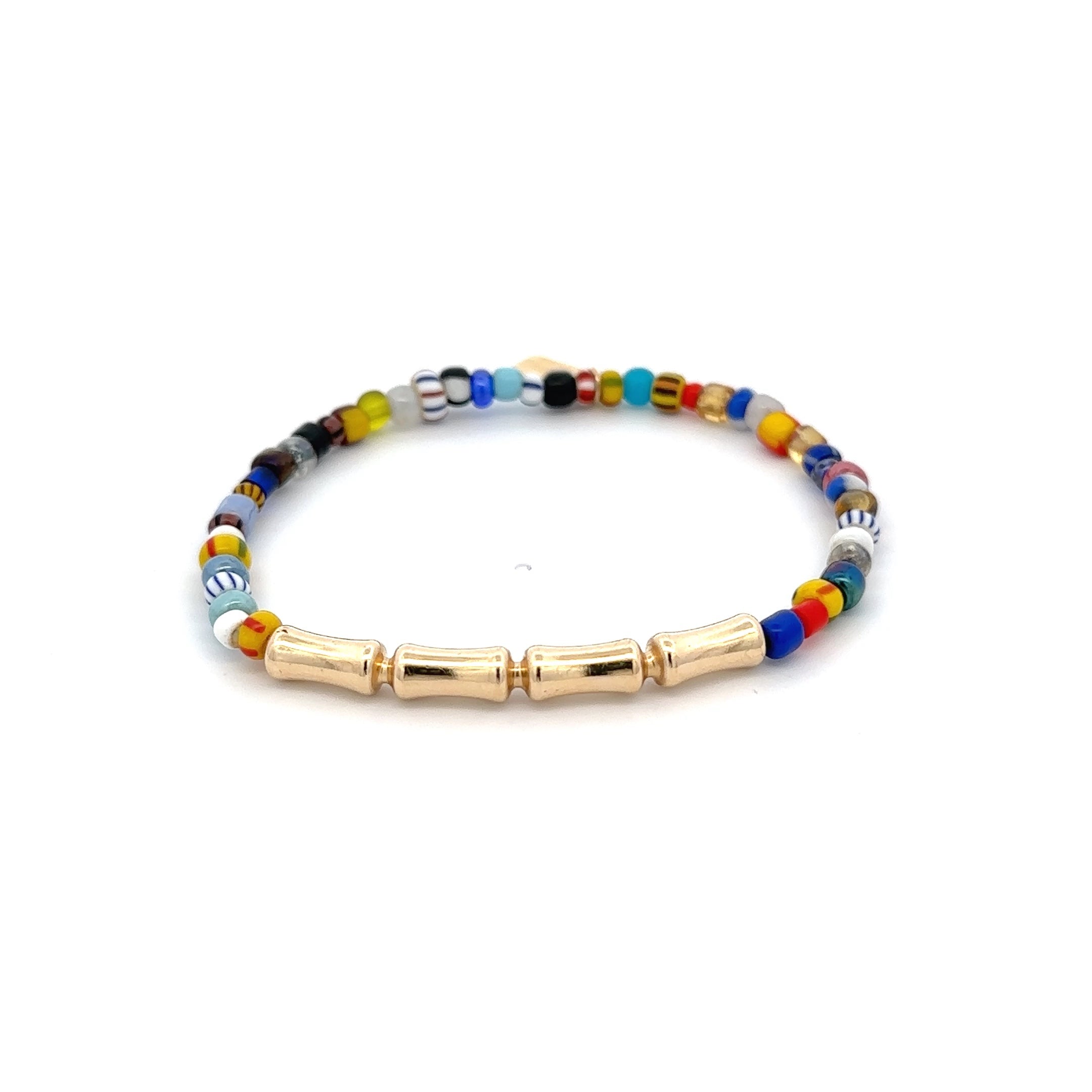 Elastische armband met gekleurde balletjes en een goudkleurige bedel in de vorm van bamboe
