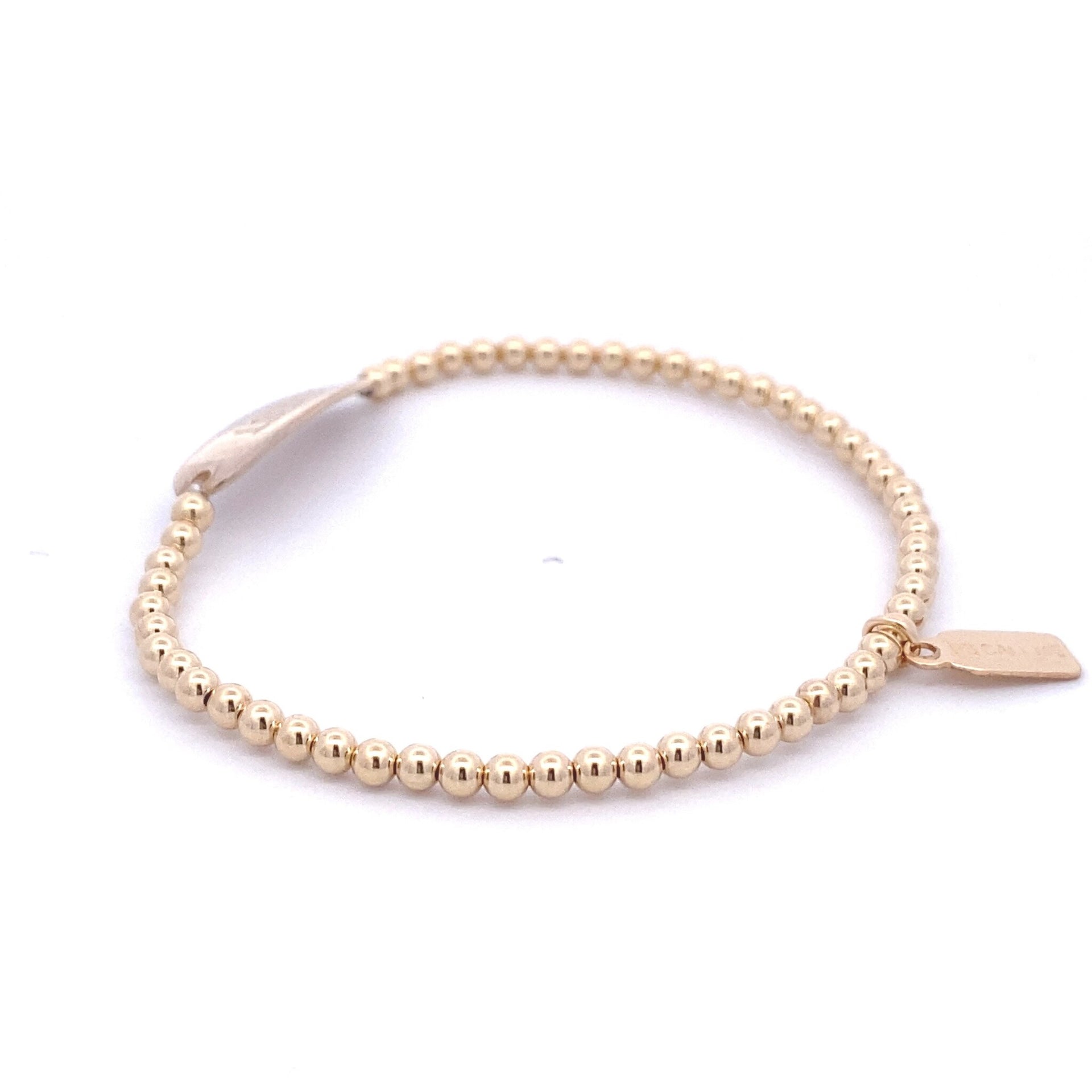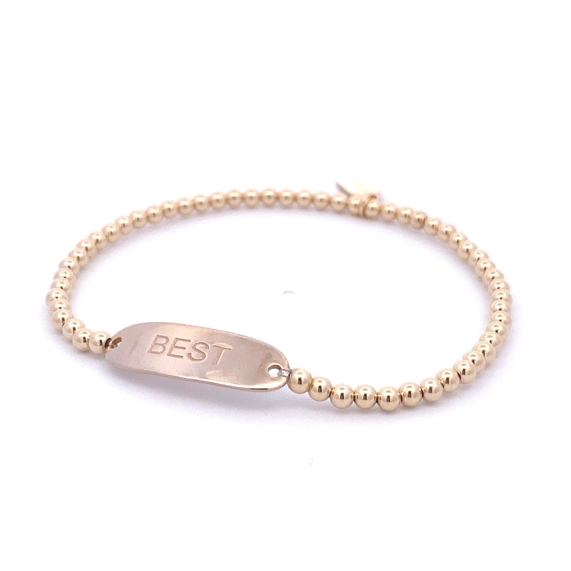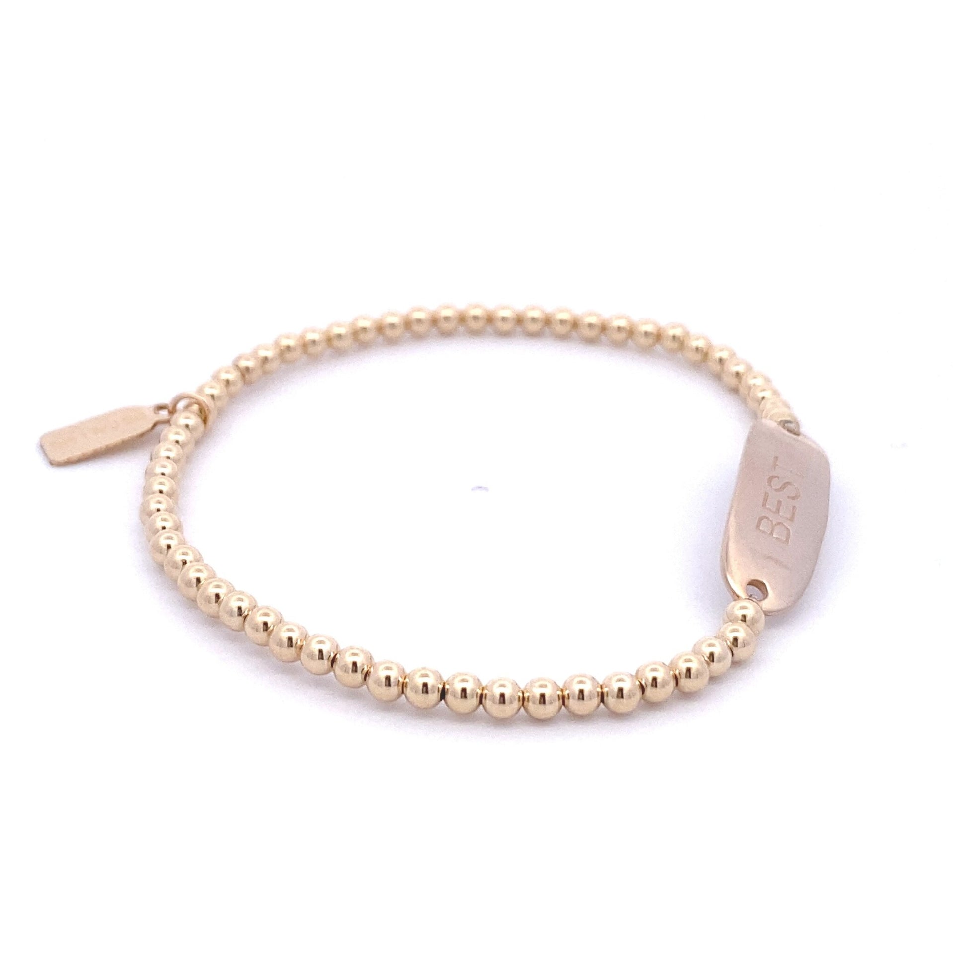 Elastische armband met goudkleurige bolletjes en een goudkleurig staafje met de tekst 'beste' erop.