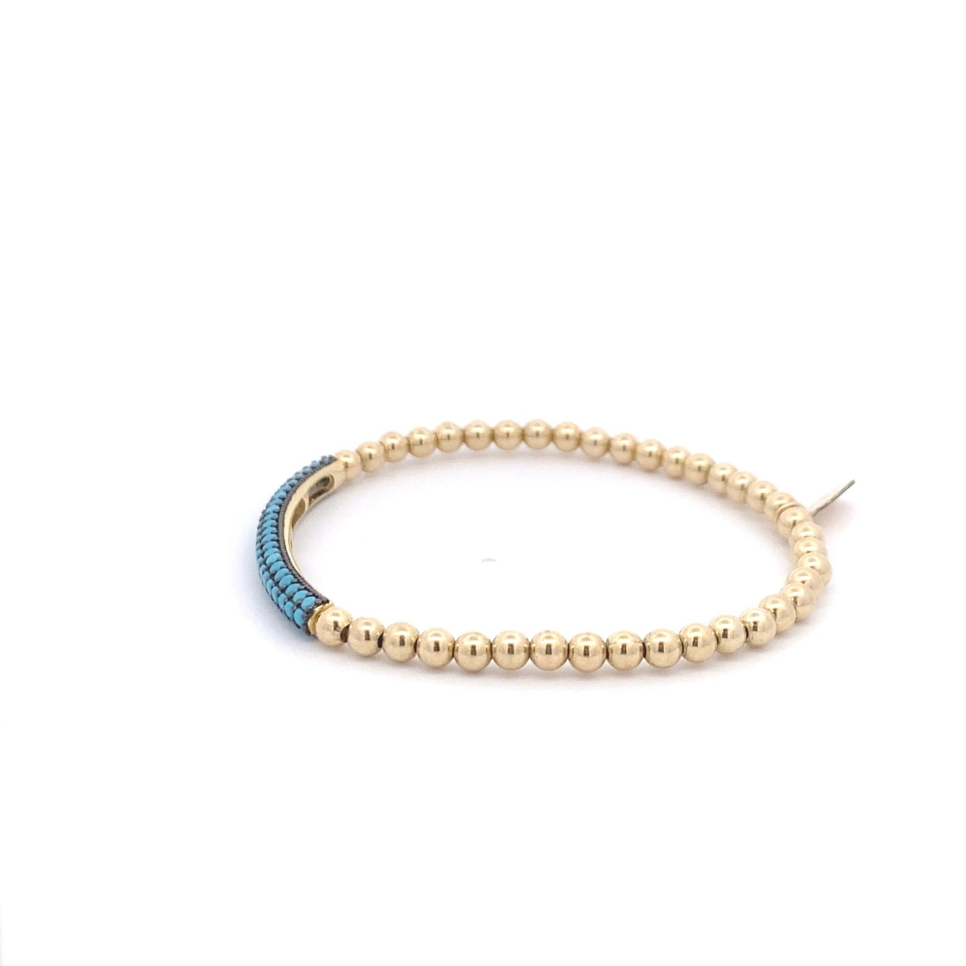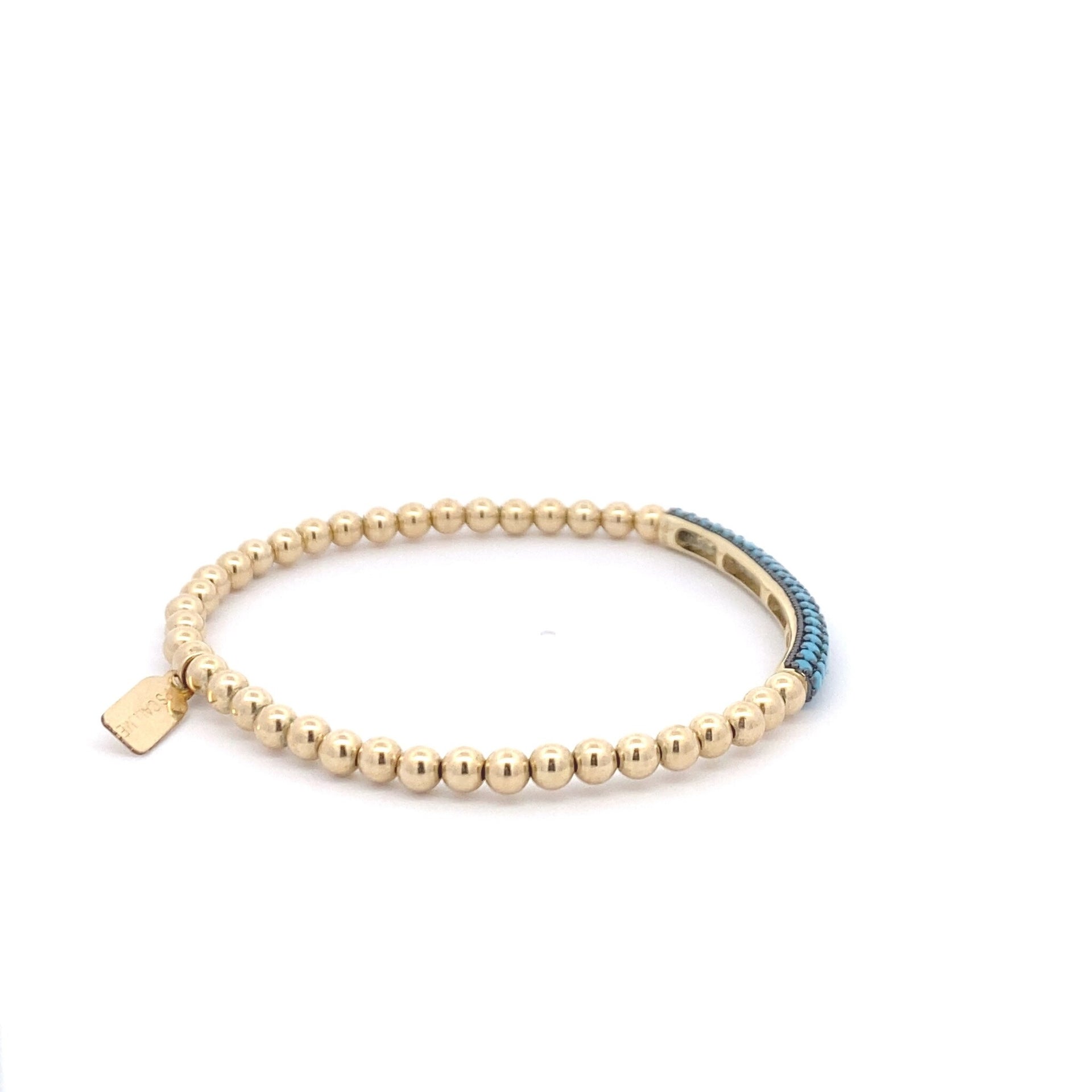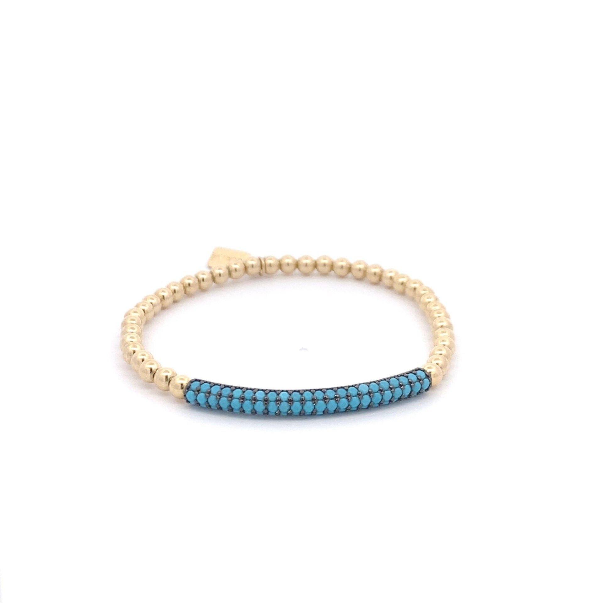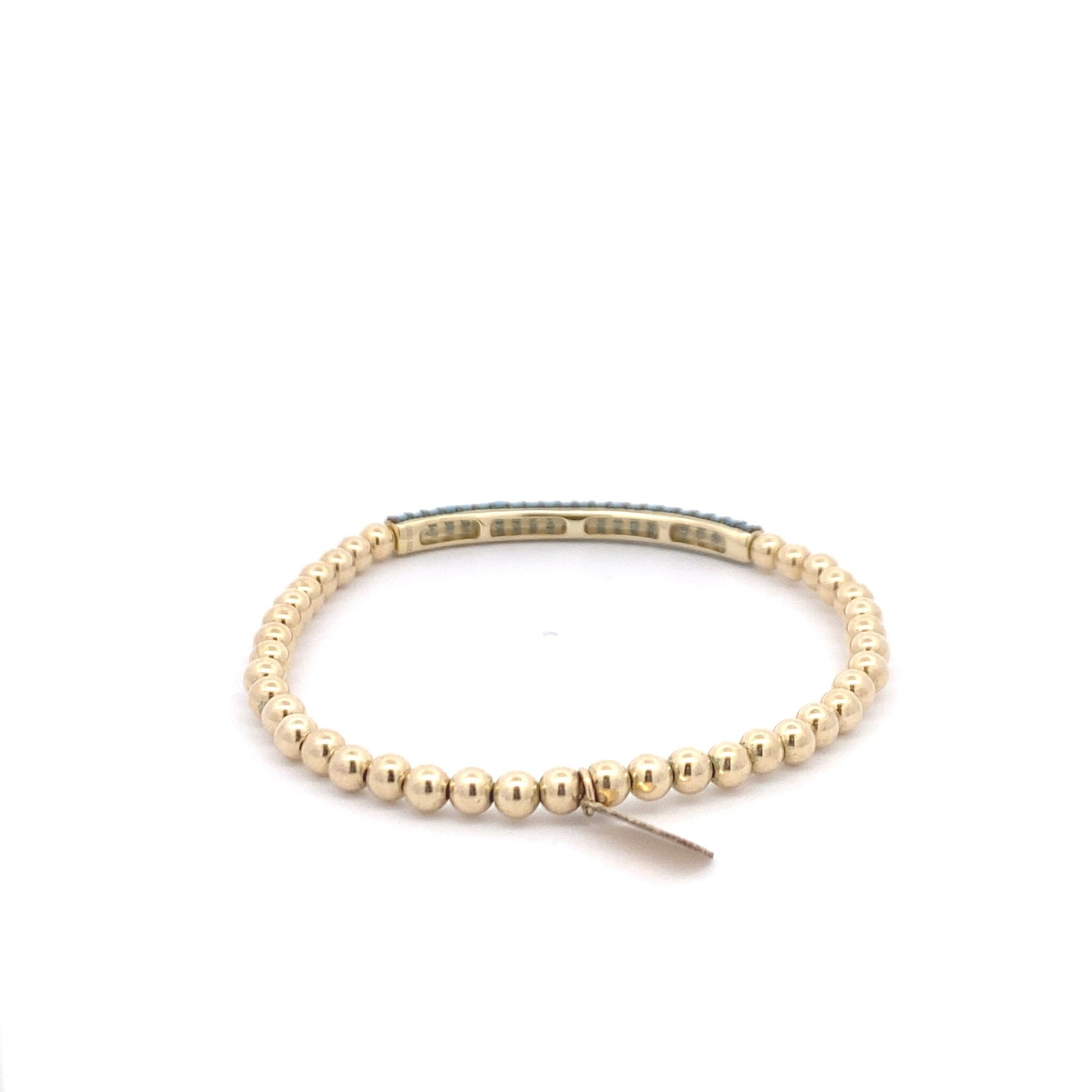 Elastische armband met goudkleurige bolletjes en gekleurd staafje.