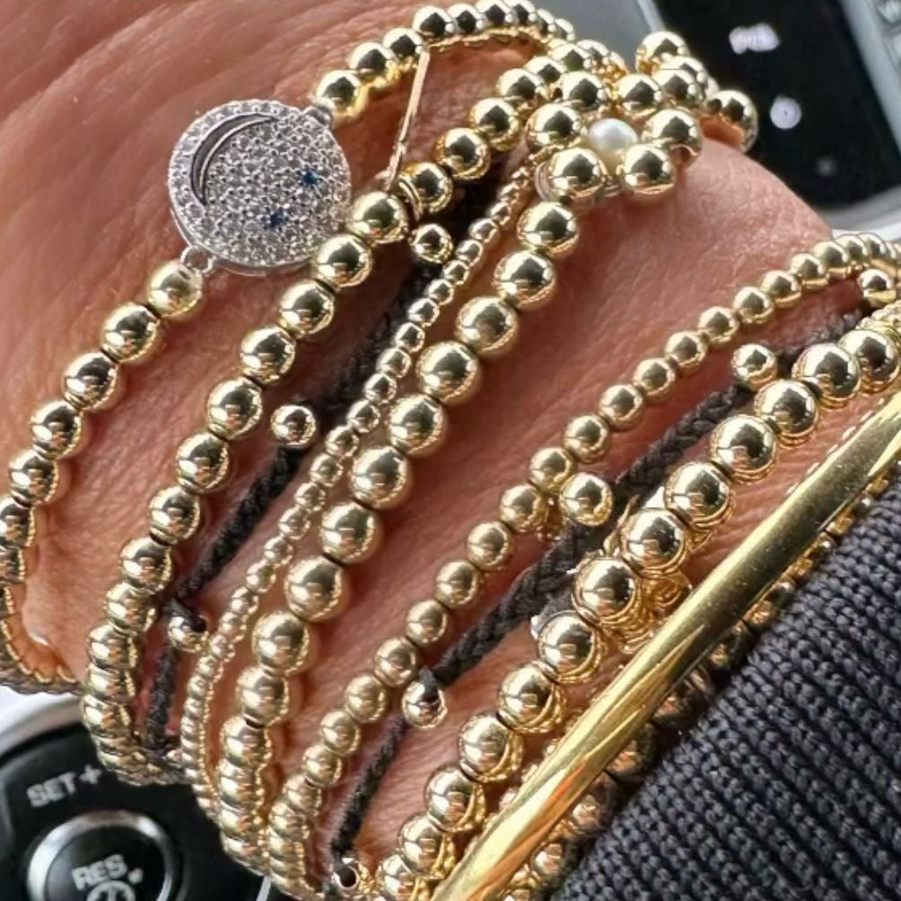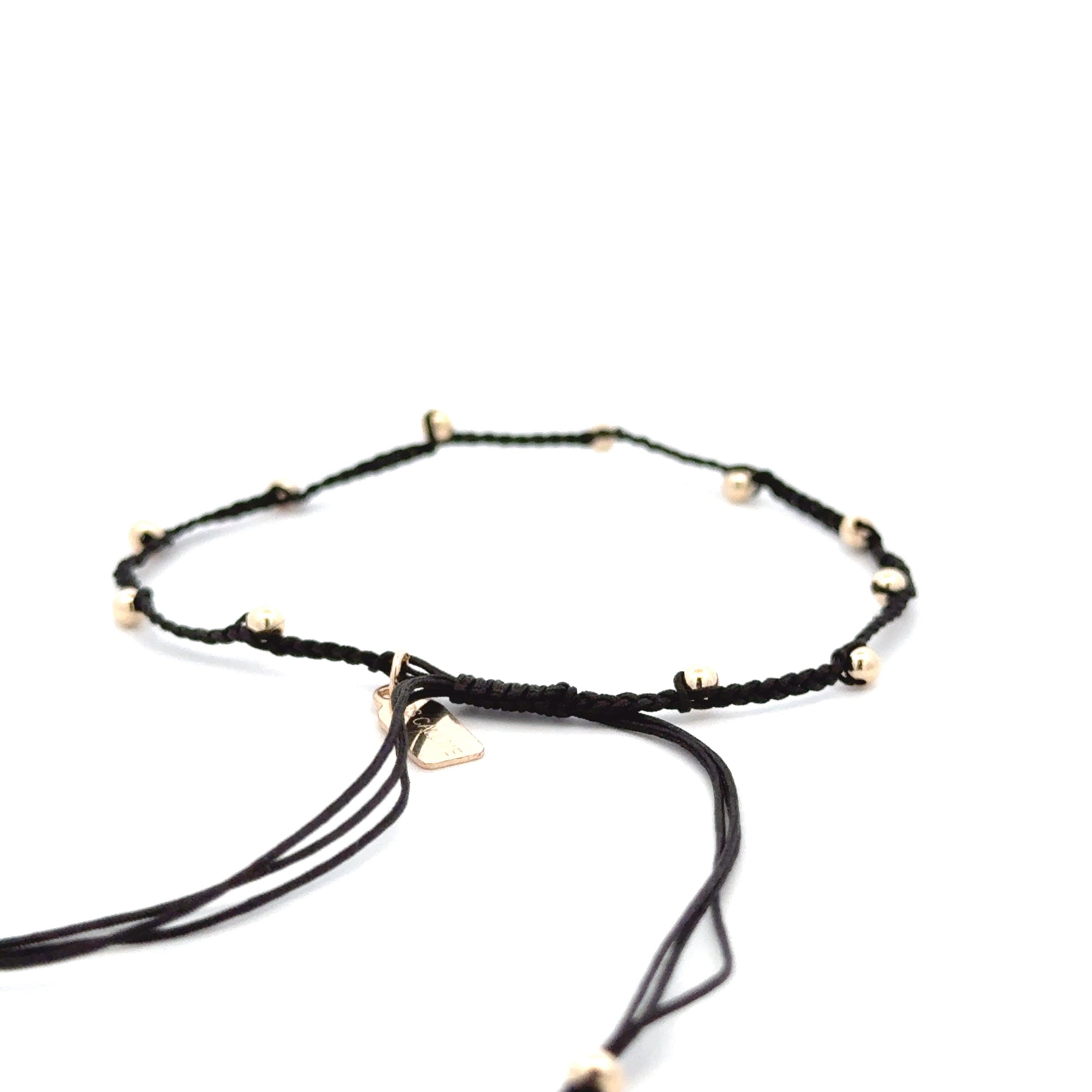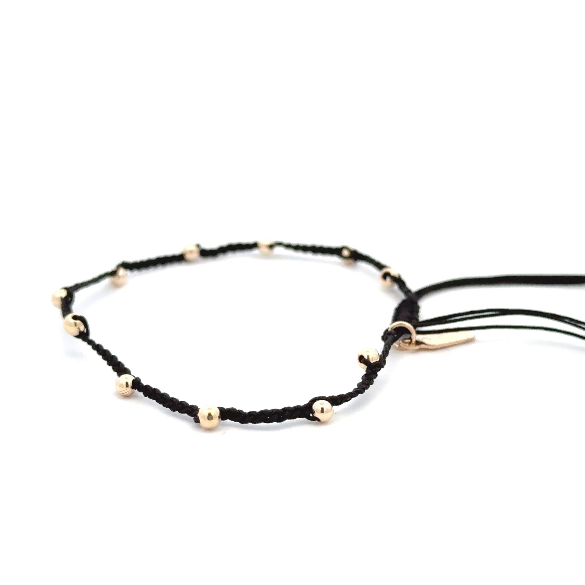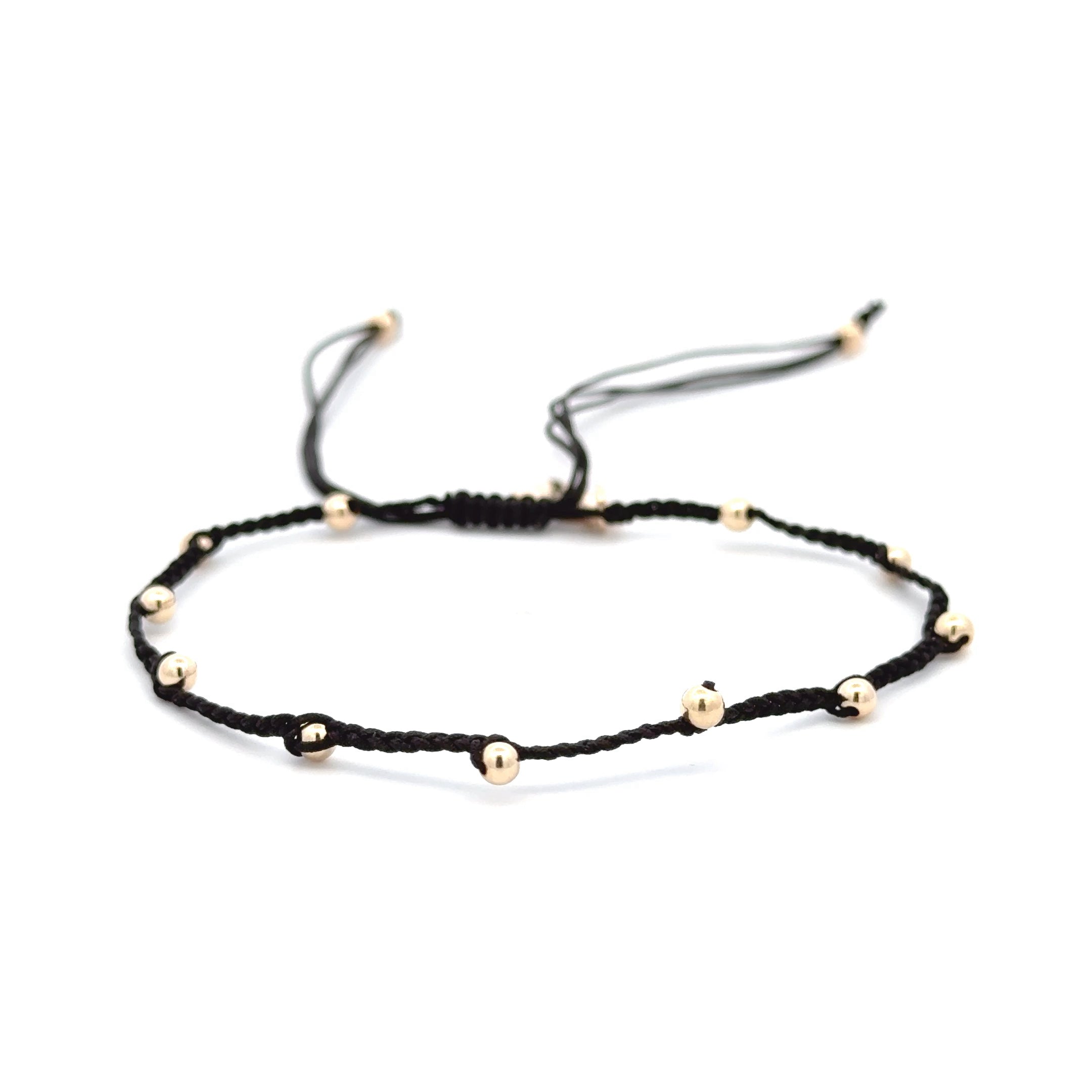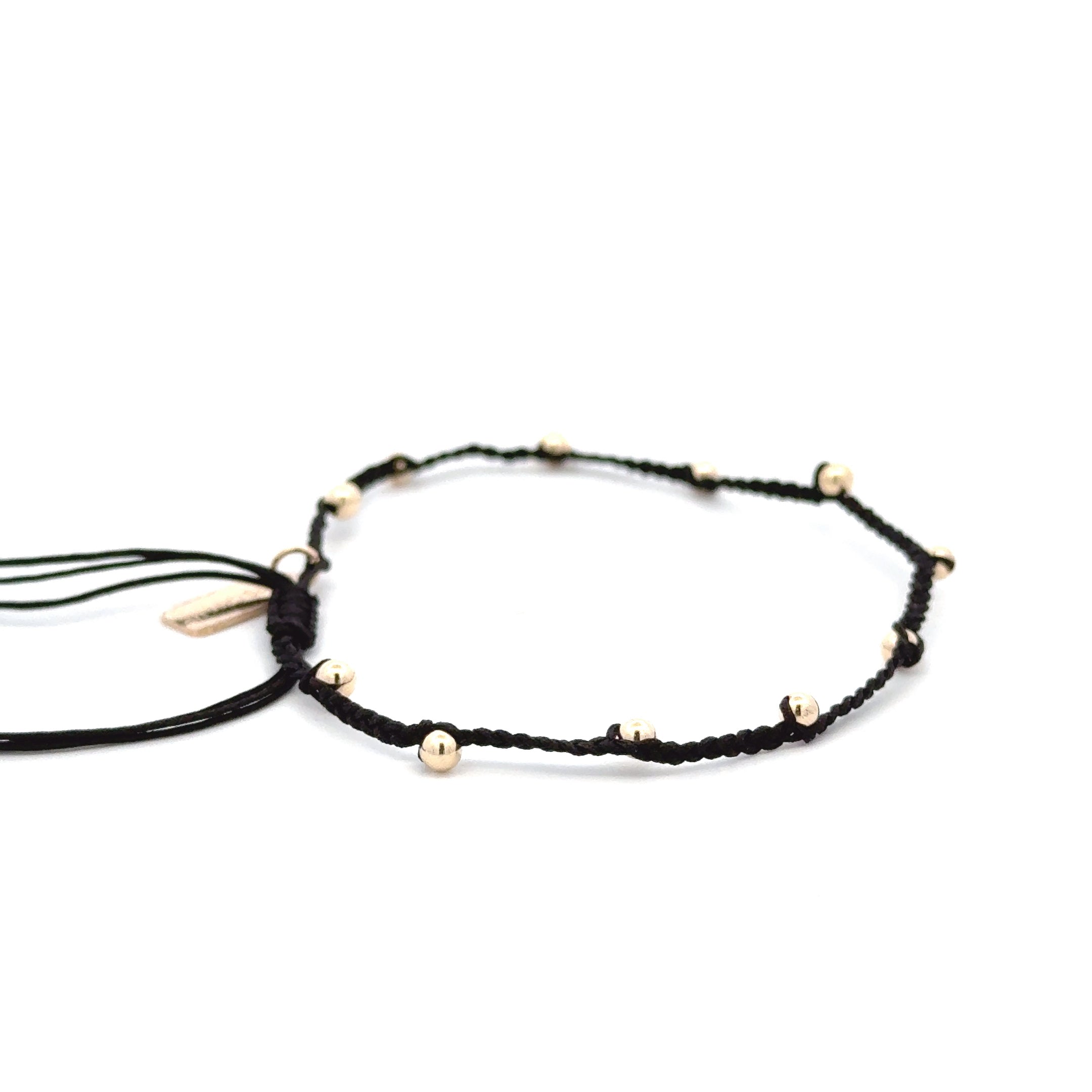 Armband gemaakt van gekleurd koord met goudkleurige bolletjes.