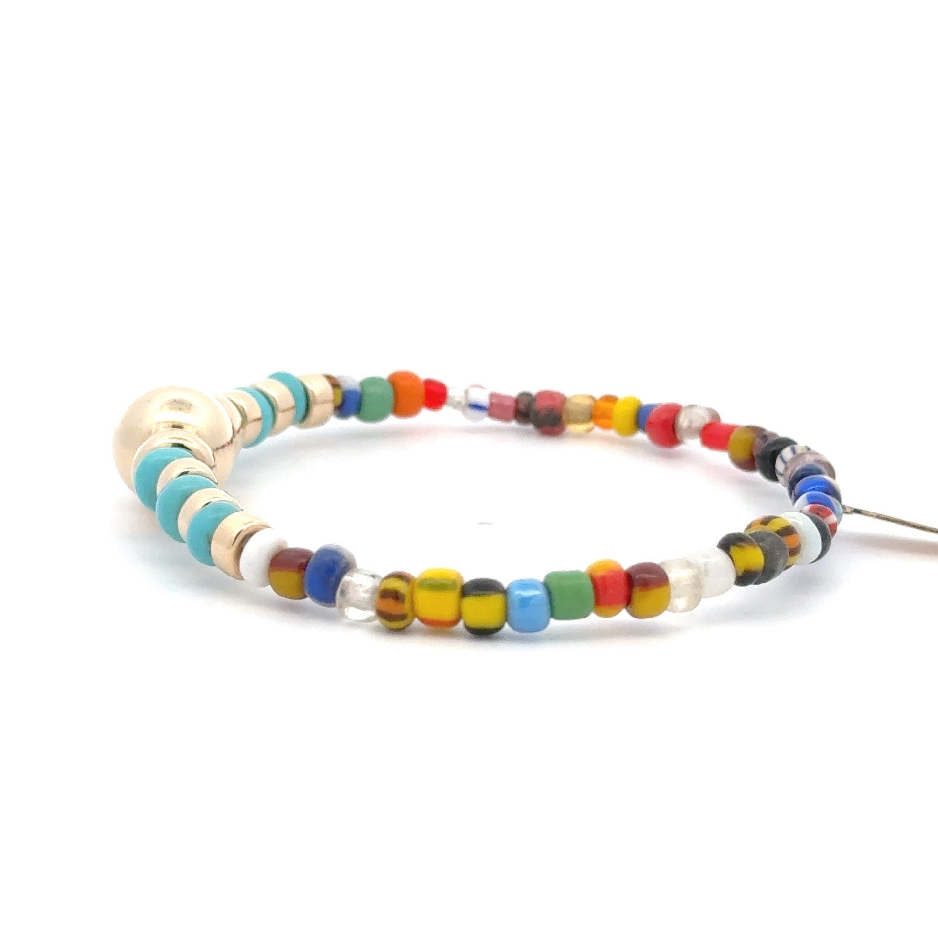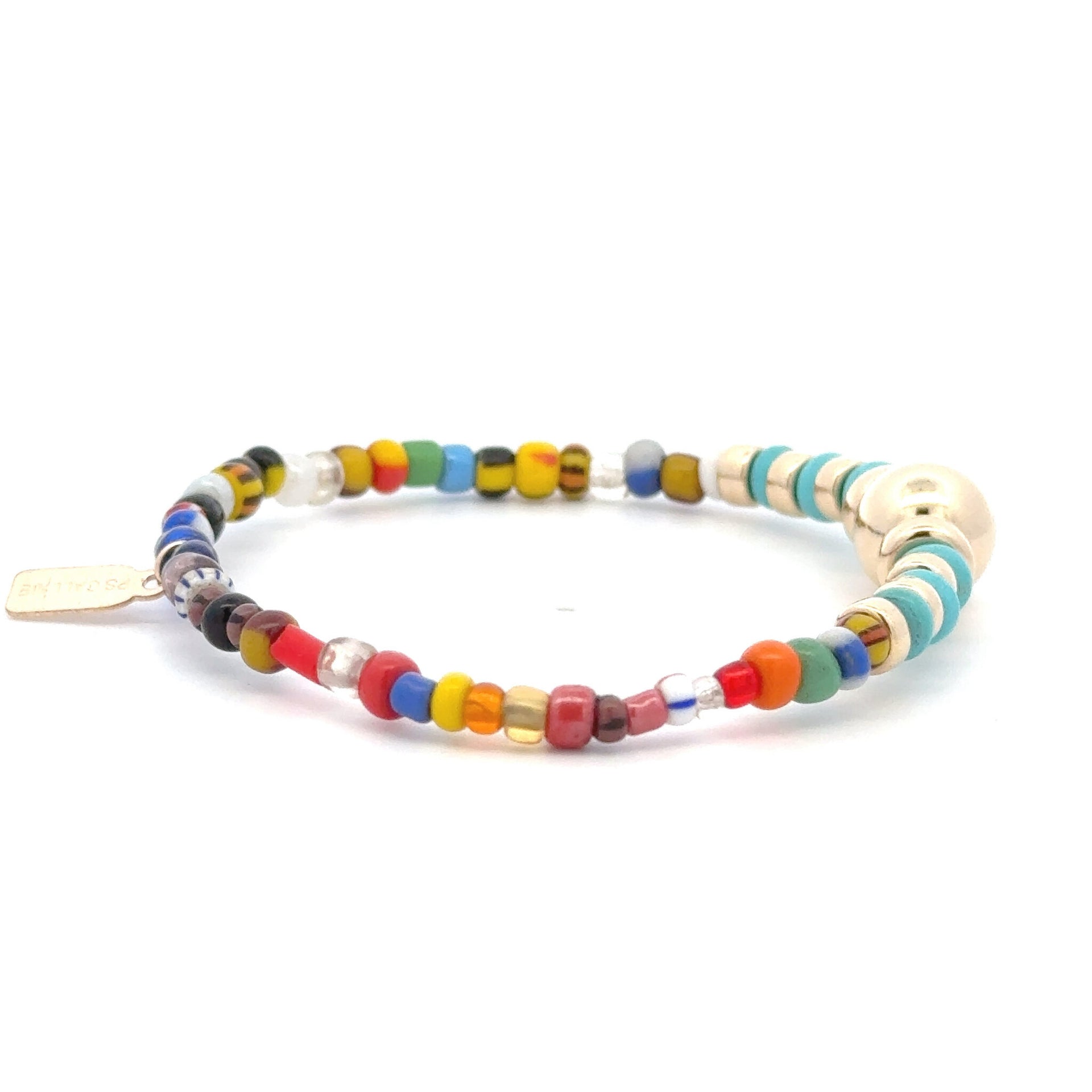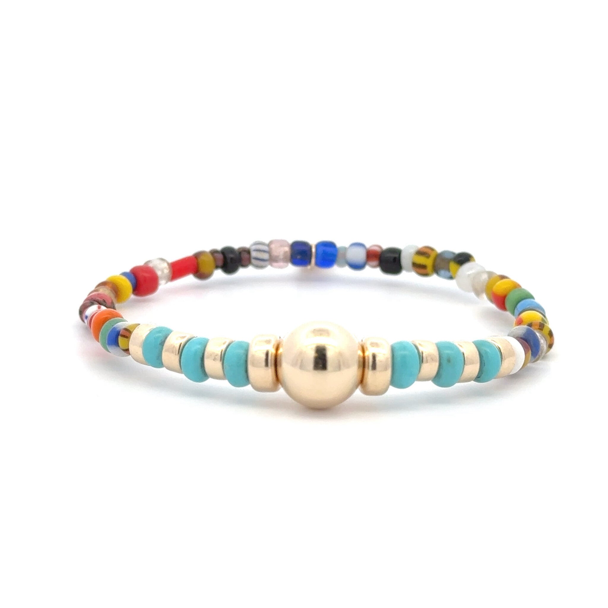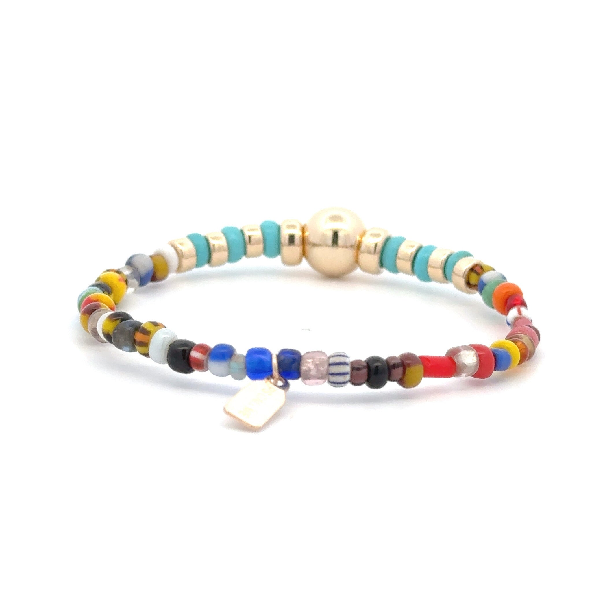 Elastische armband met gekleurde kralen, goudkleurige wieltjes en één goudkleurig balletje.