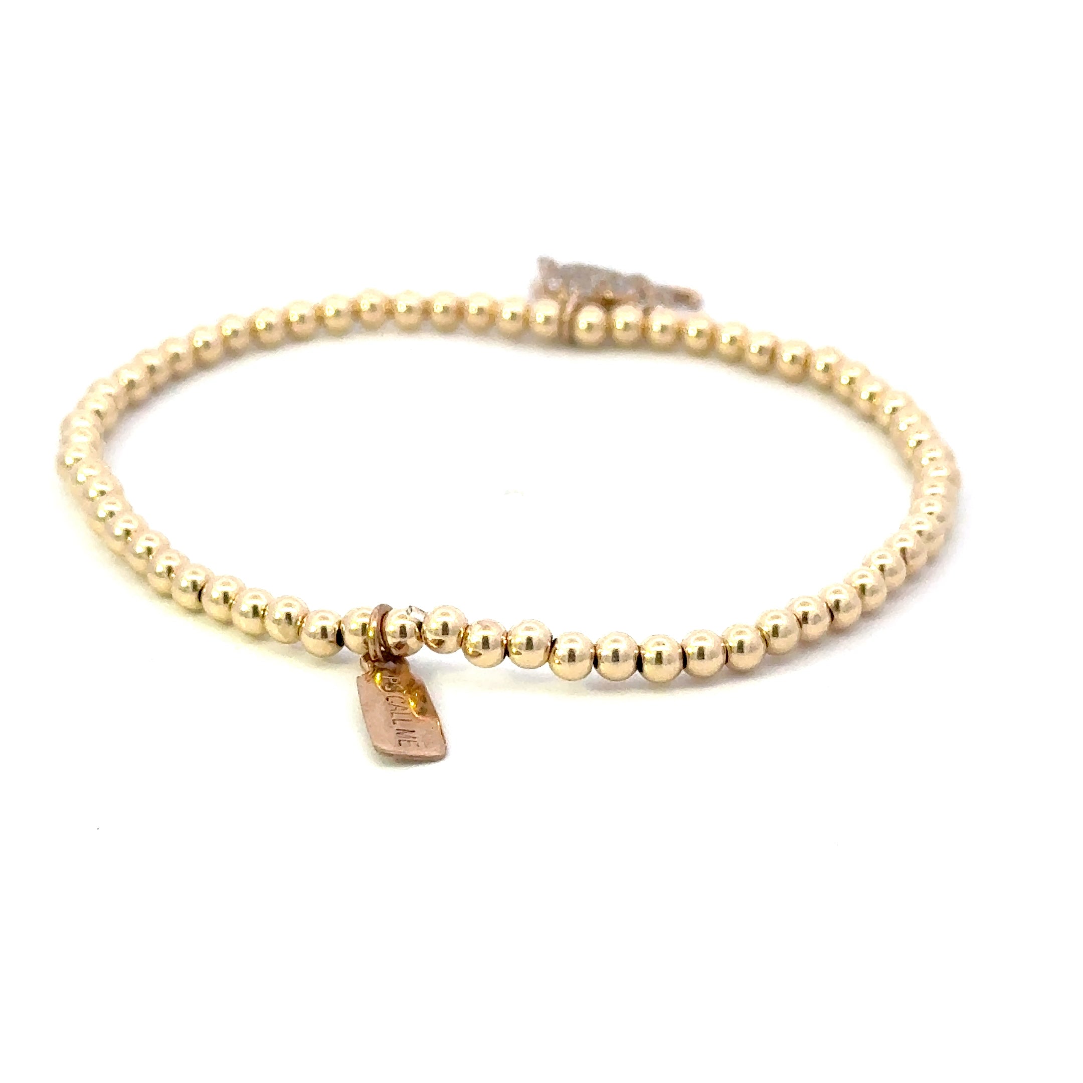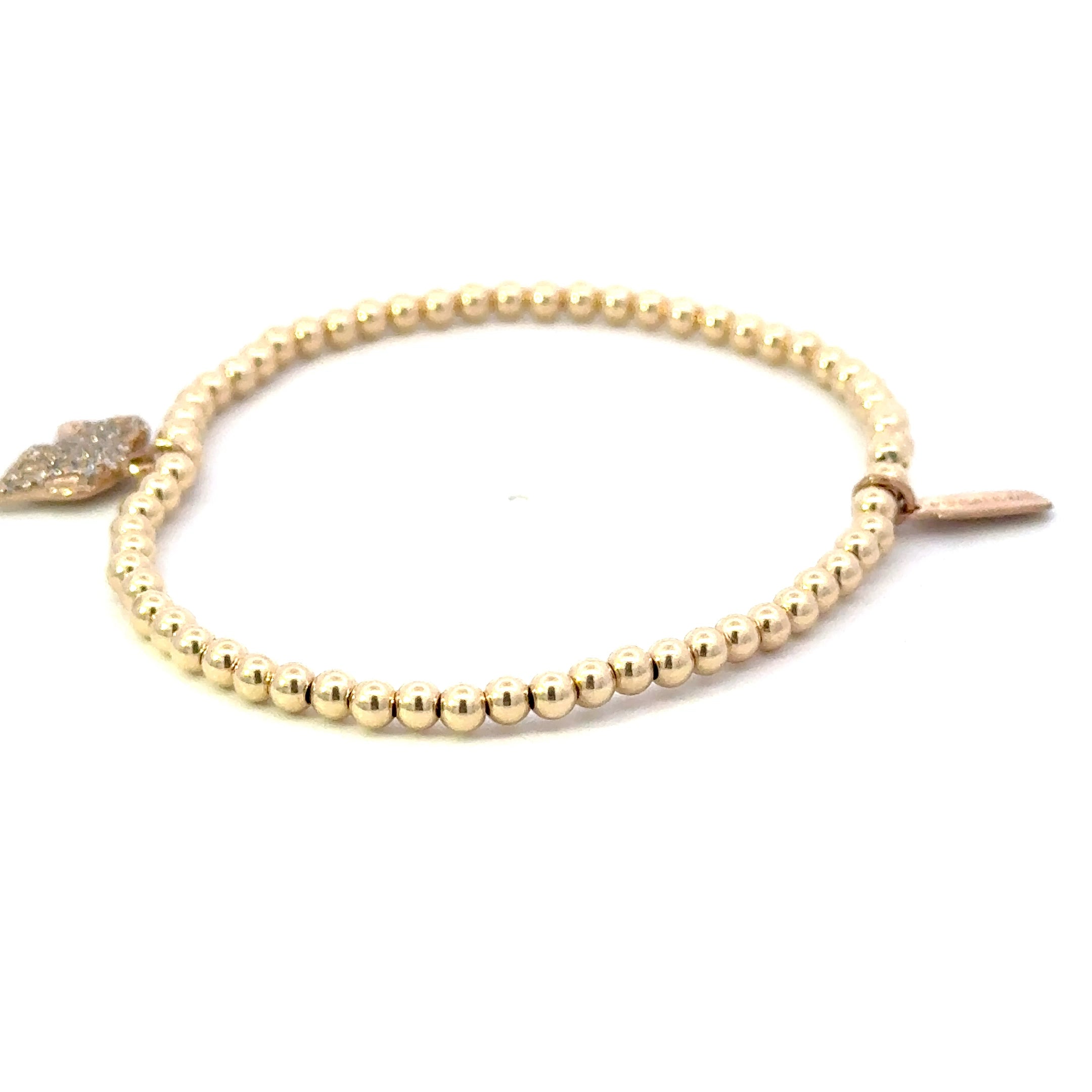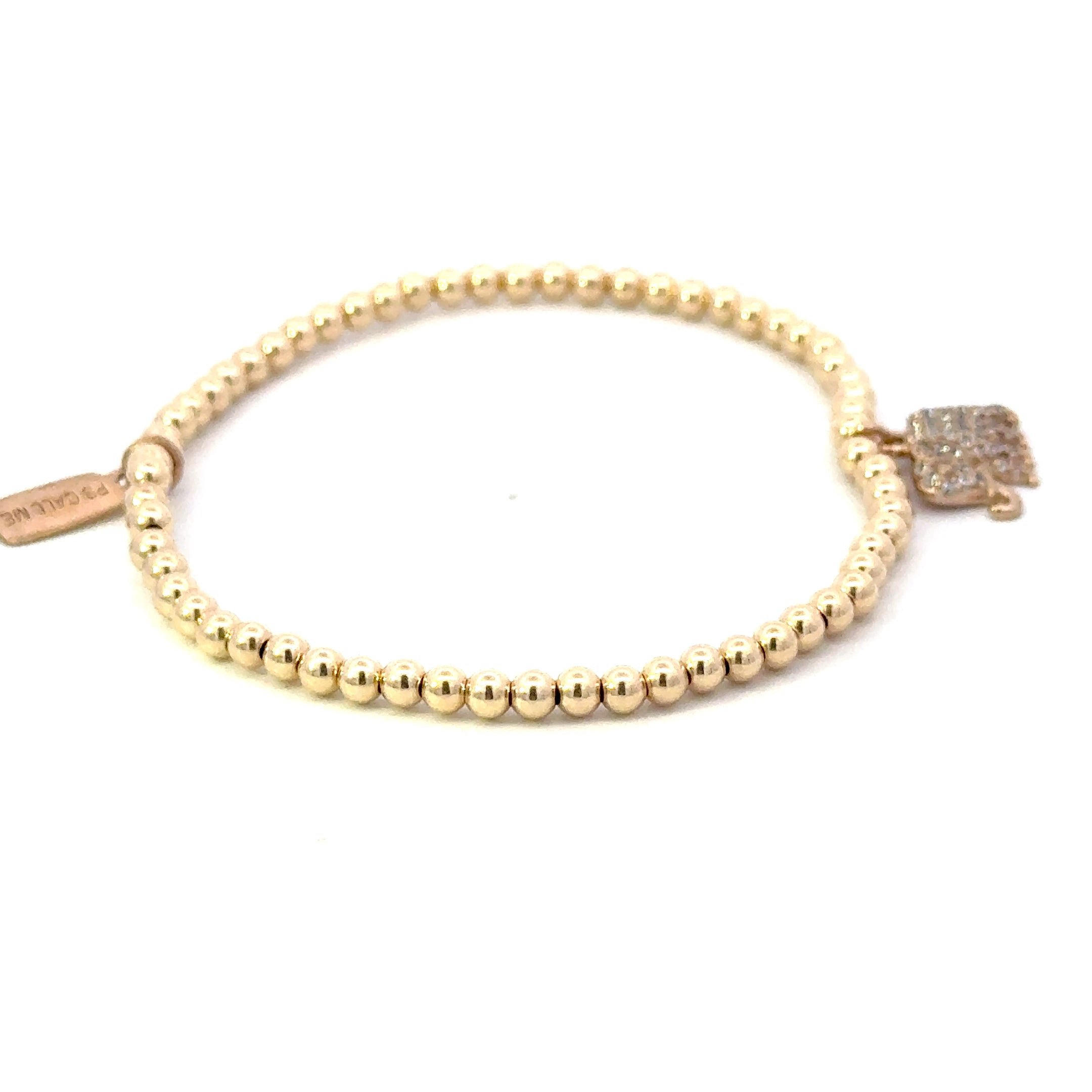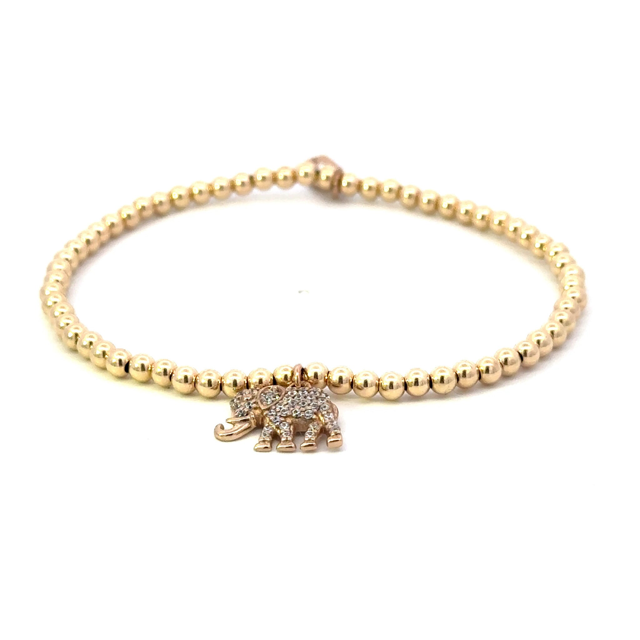 Elastische armband met goudkleurige balletjes en een olifant met strass-steentjes.
