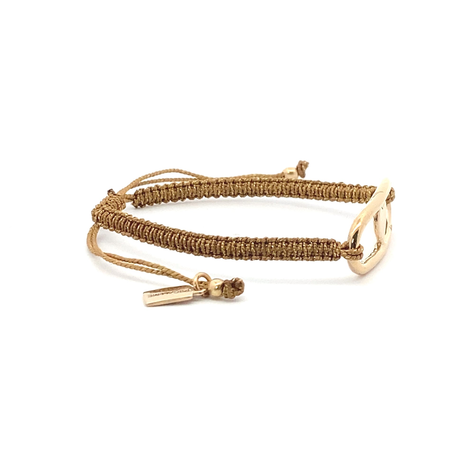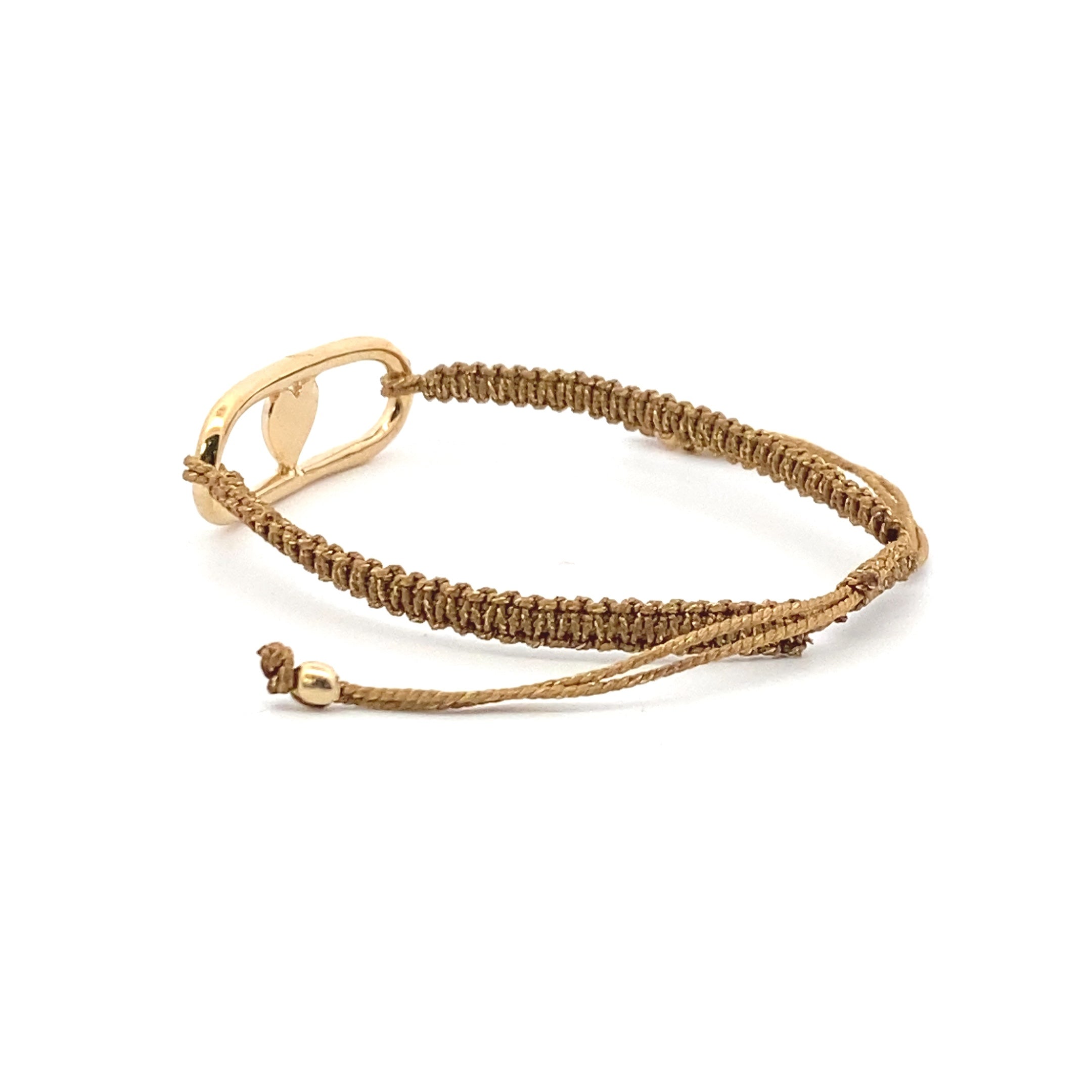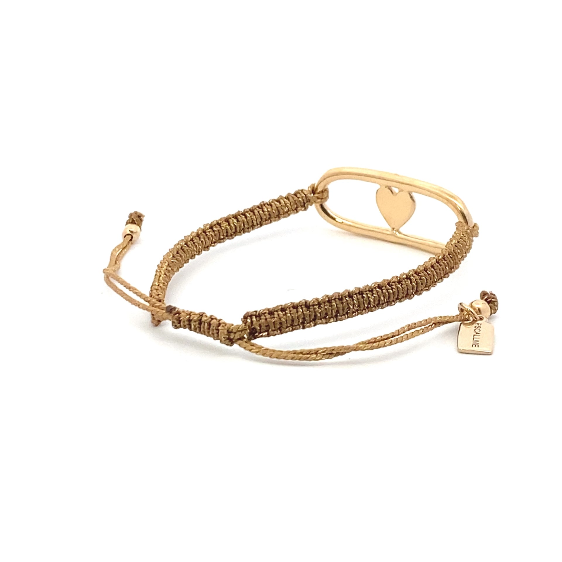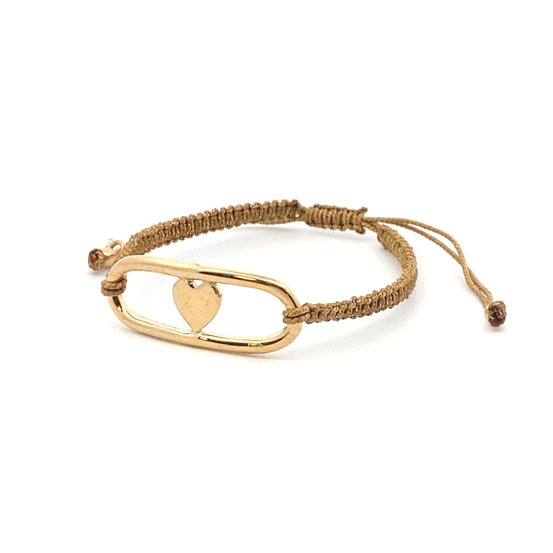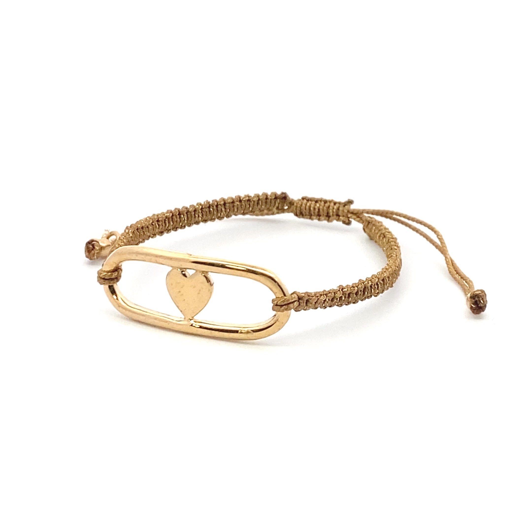 Goudkleurige armband met koord en een ovale bedel met een hart
