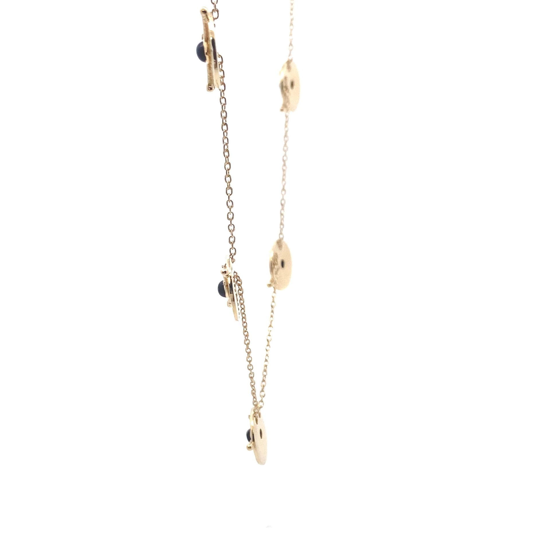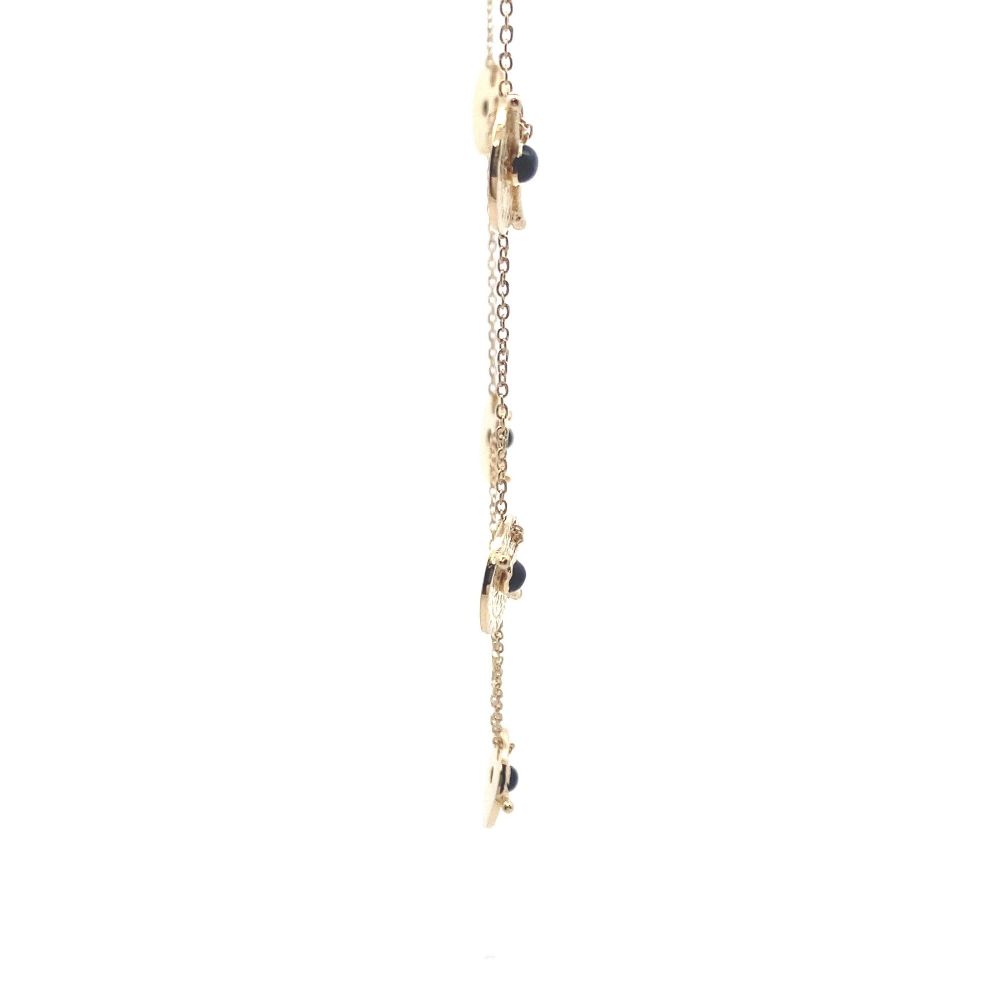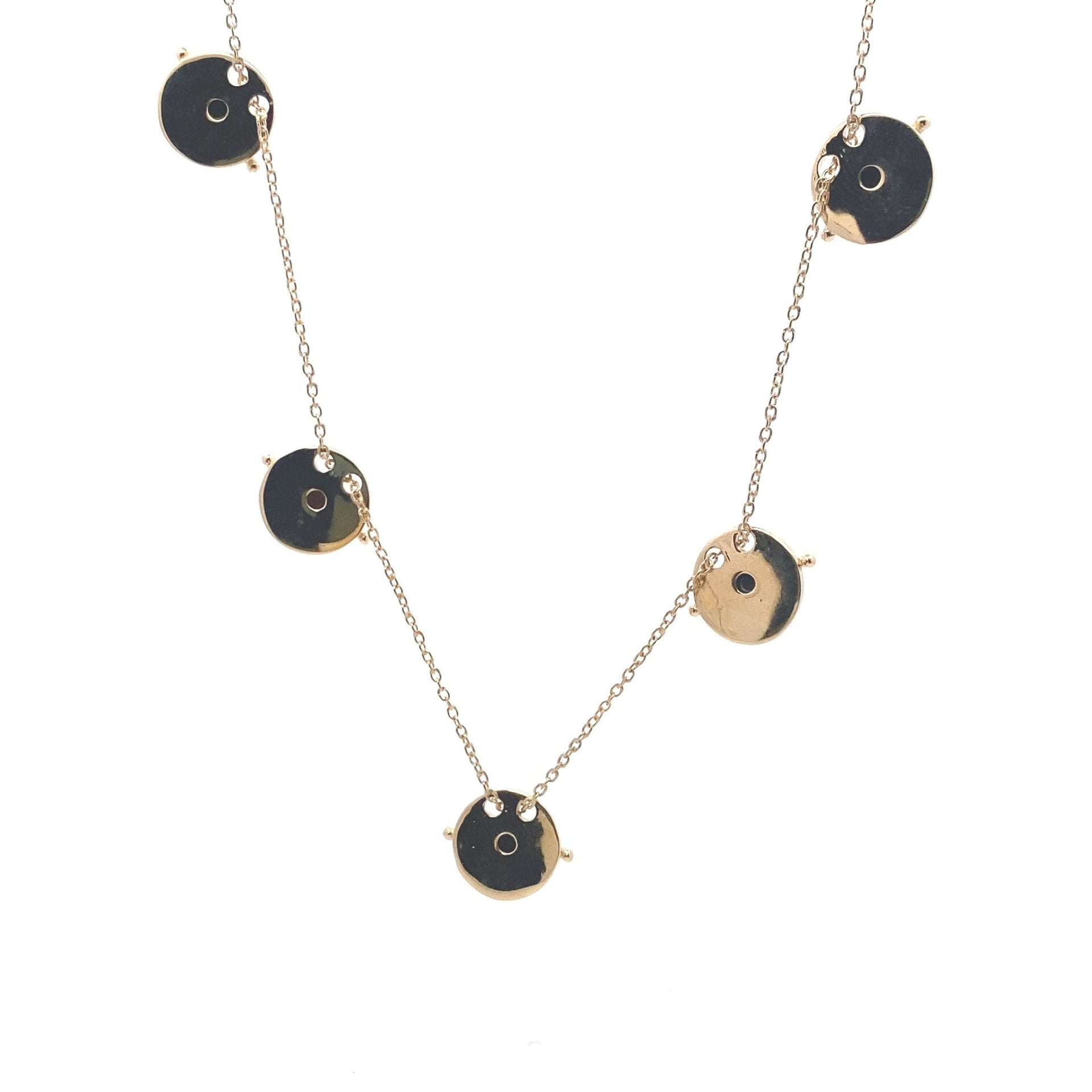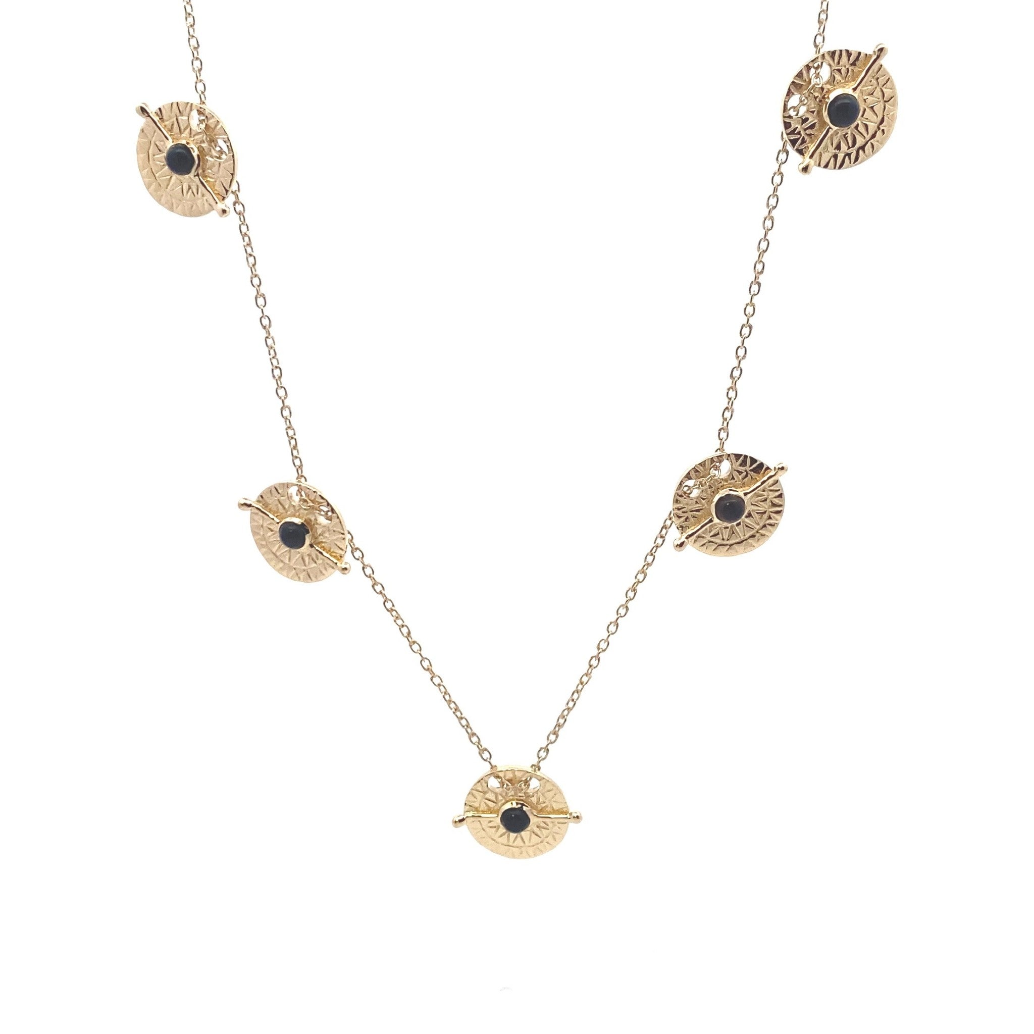 Goudkleurige ketting met 5 rondjes en een gekleurde steen erin.