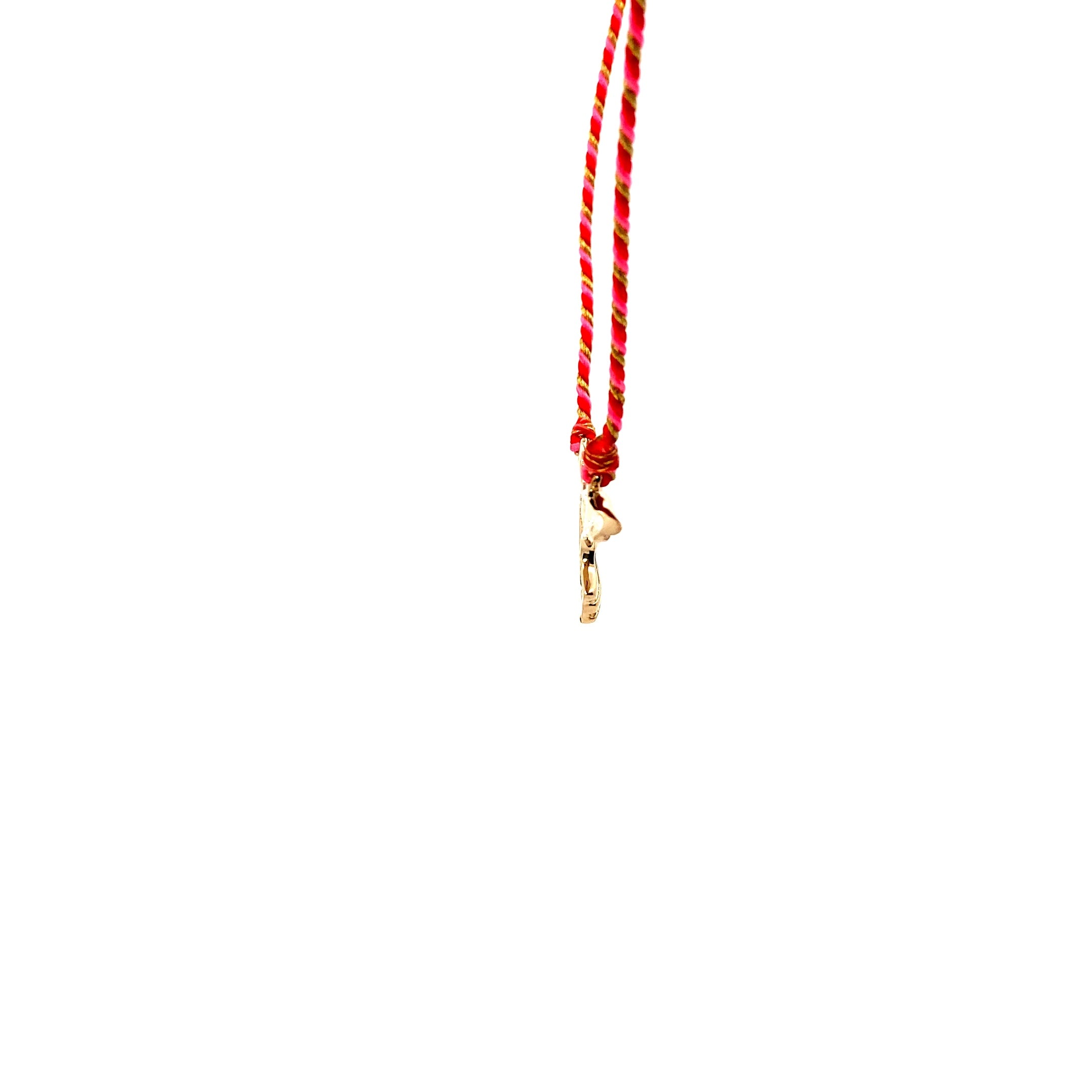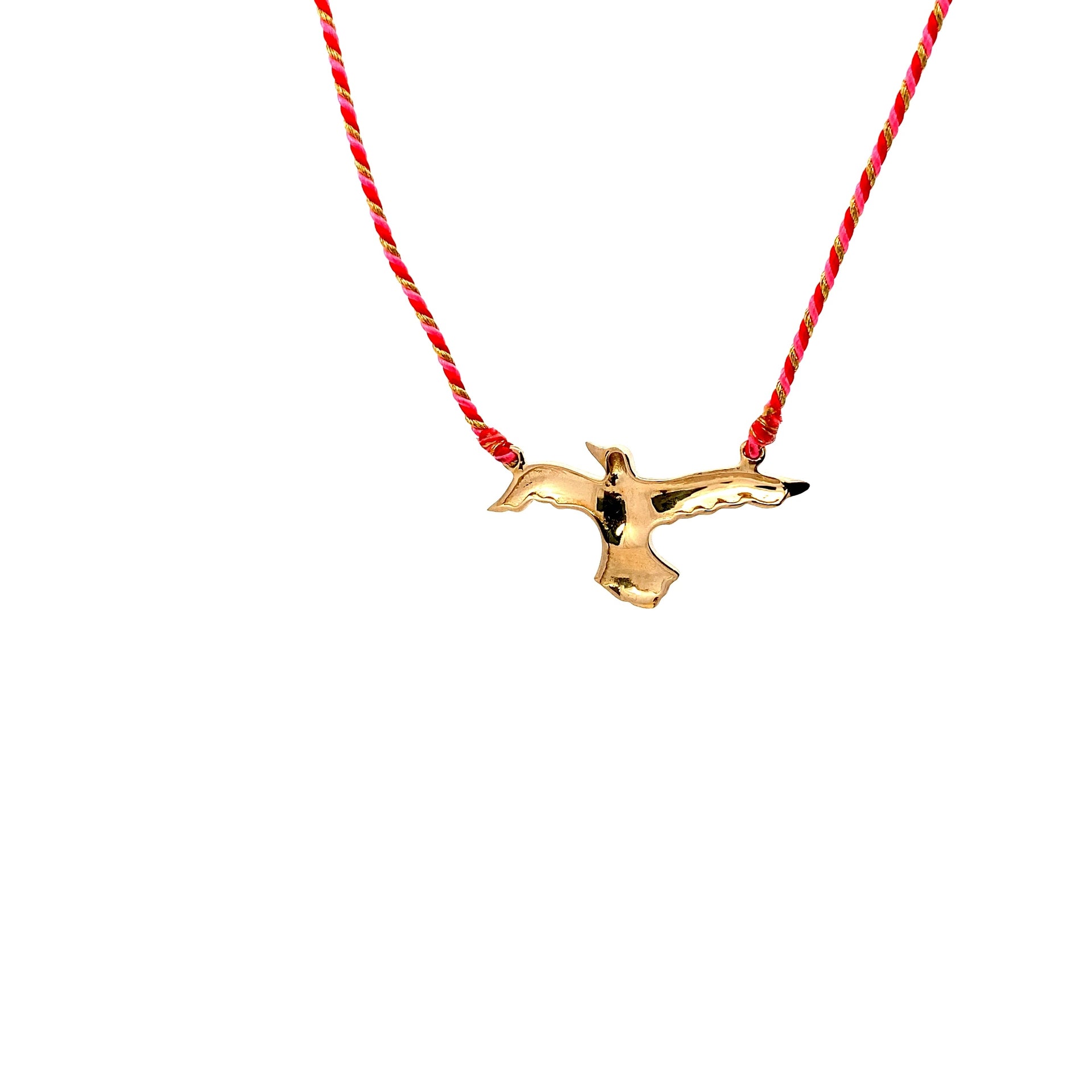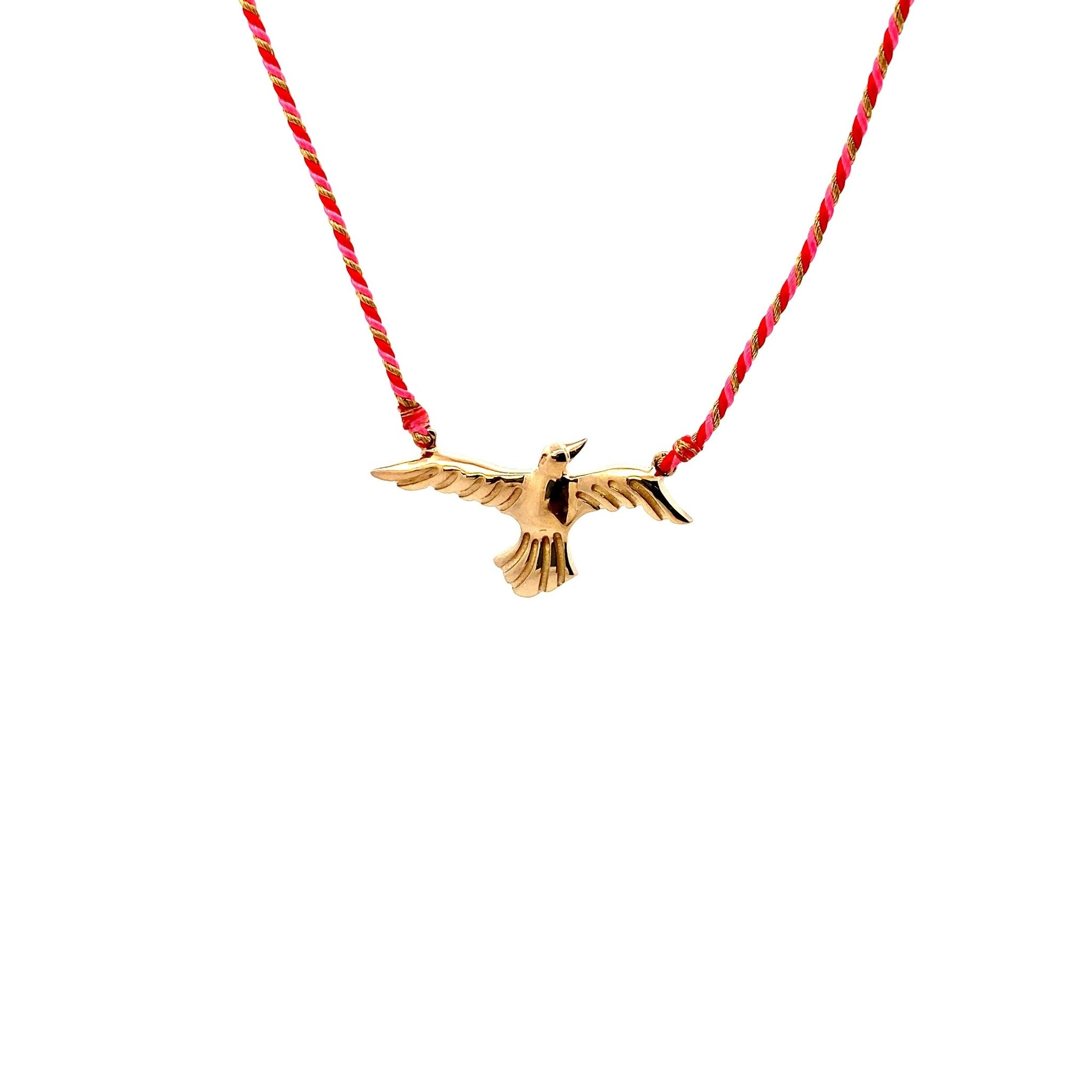Ketting met gekleurd koord en een goudkleurige bedel in de vorm van een vogel