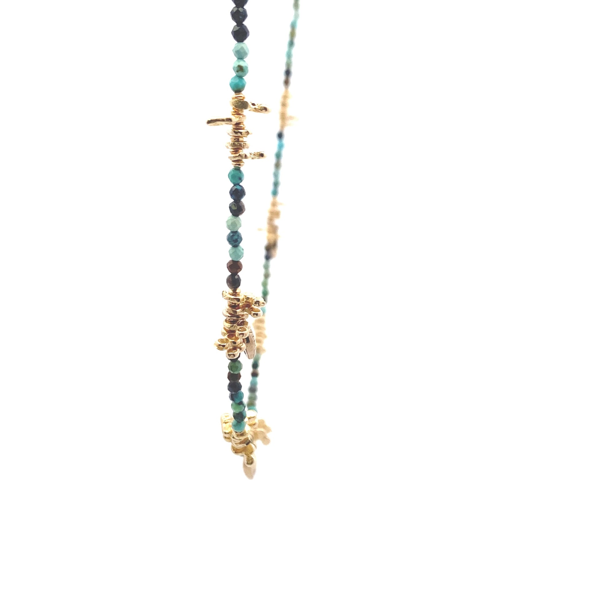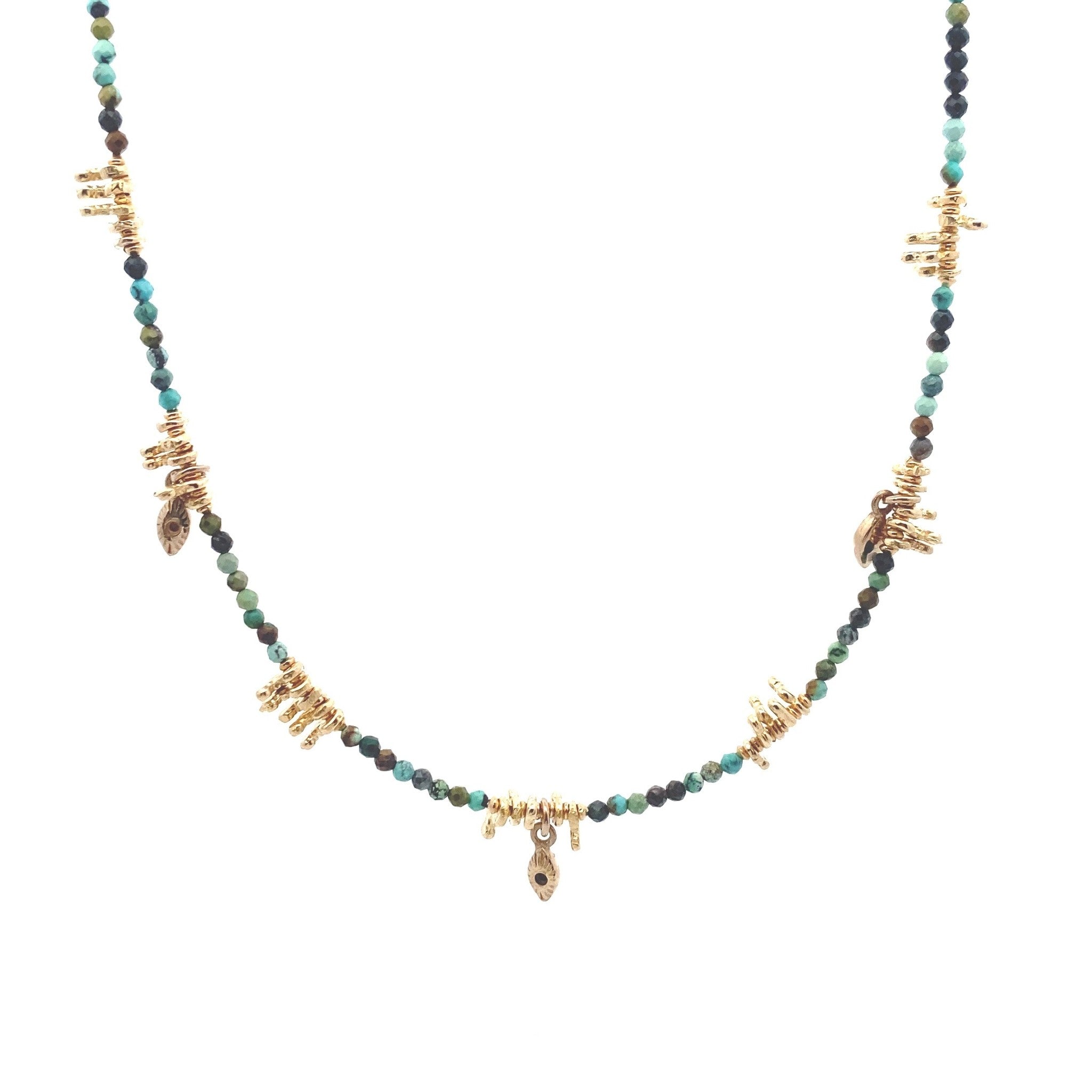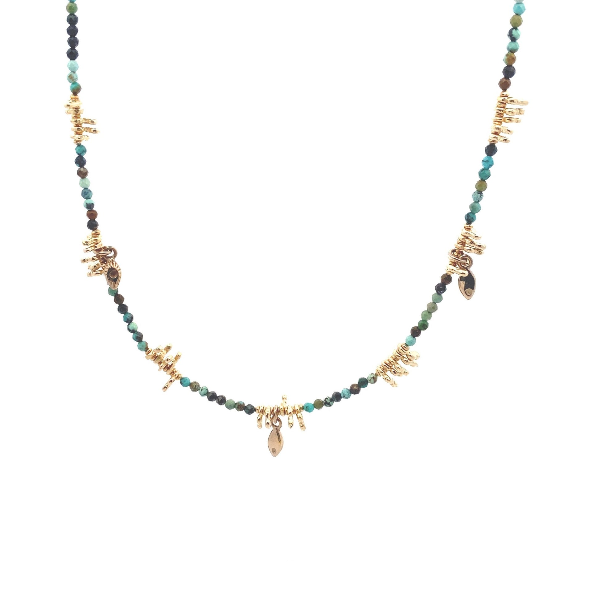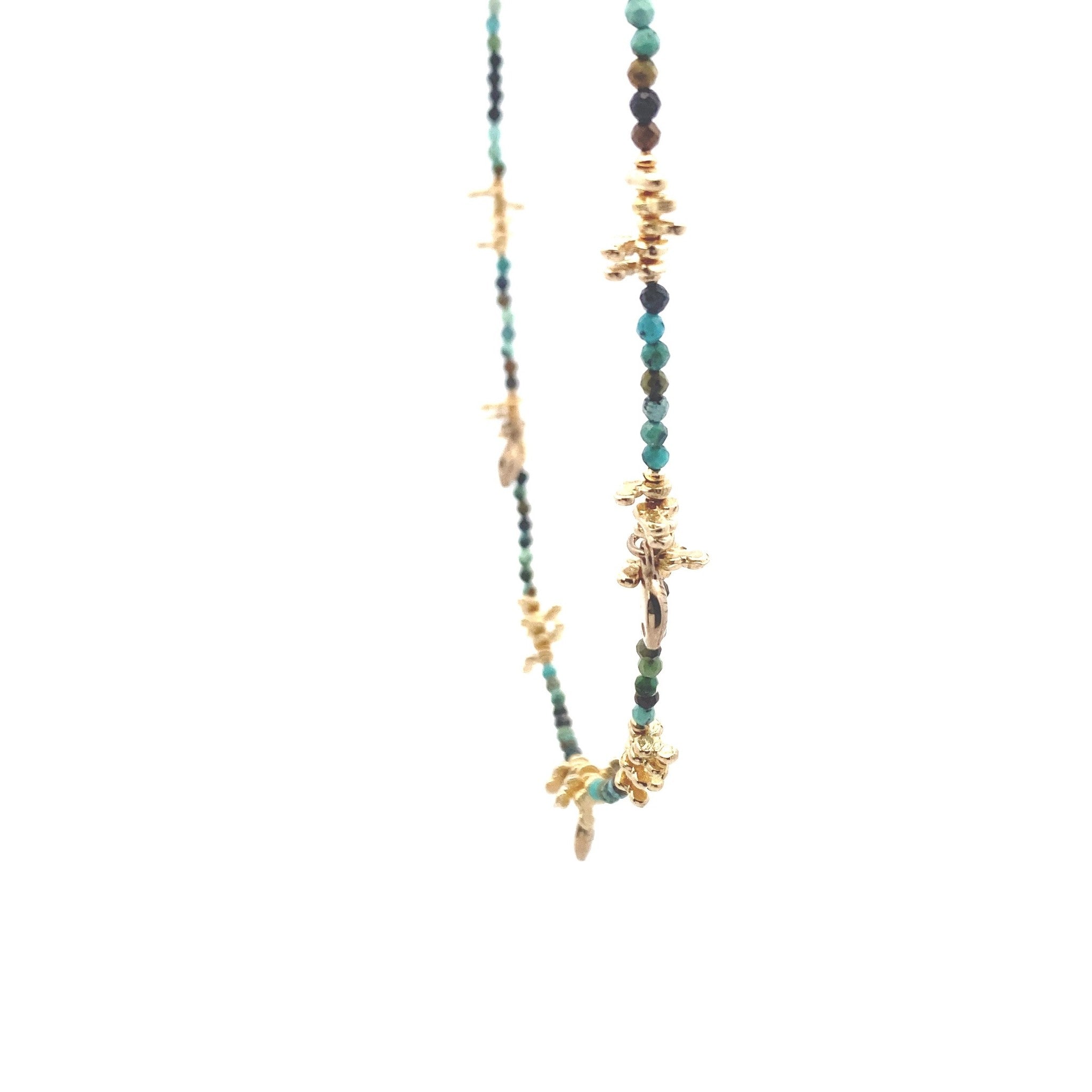 Ketting van gekleurde steentjes en kleine goudkleurige bedeltjes.